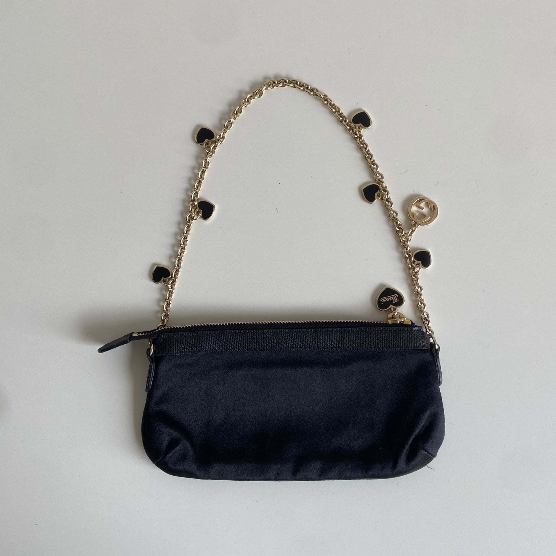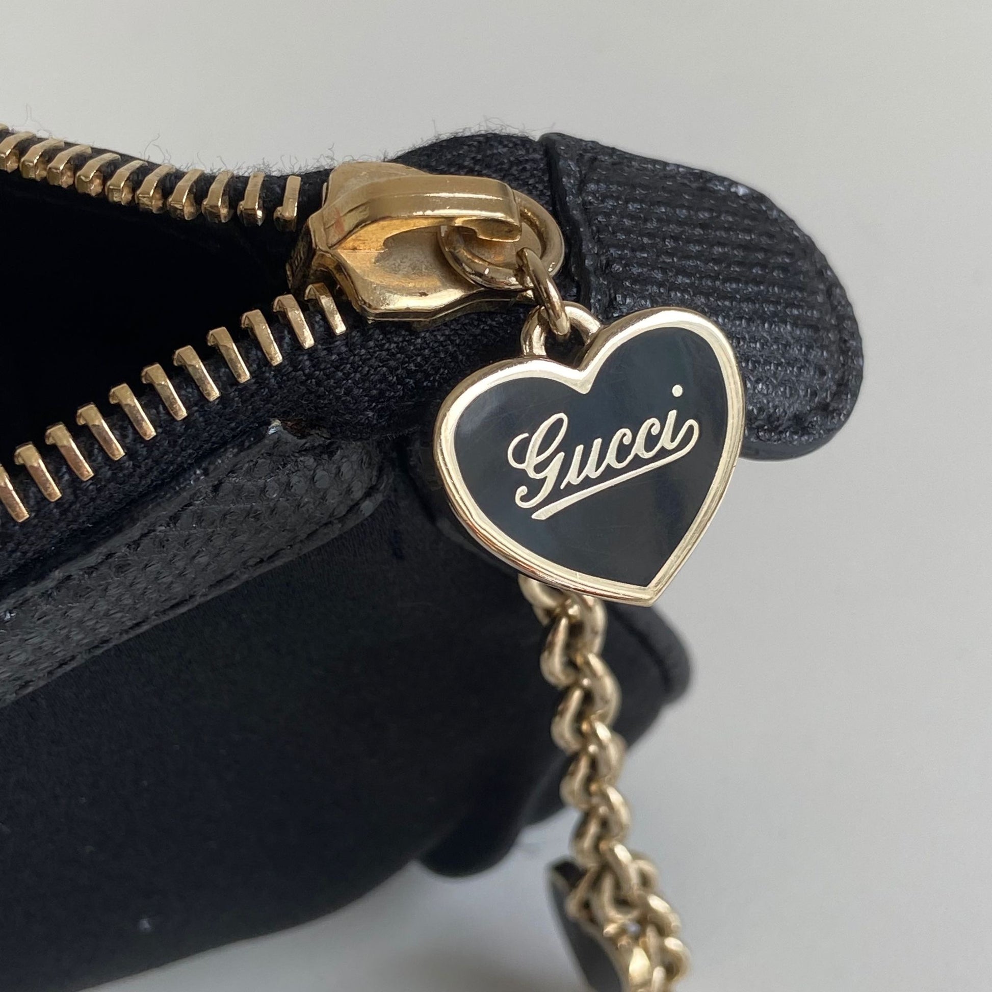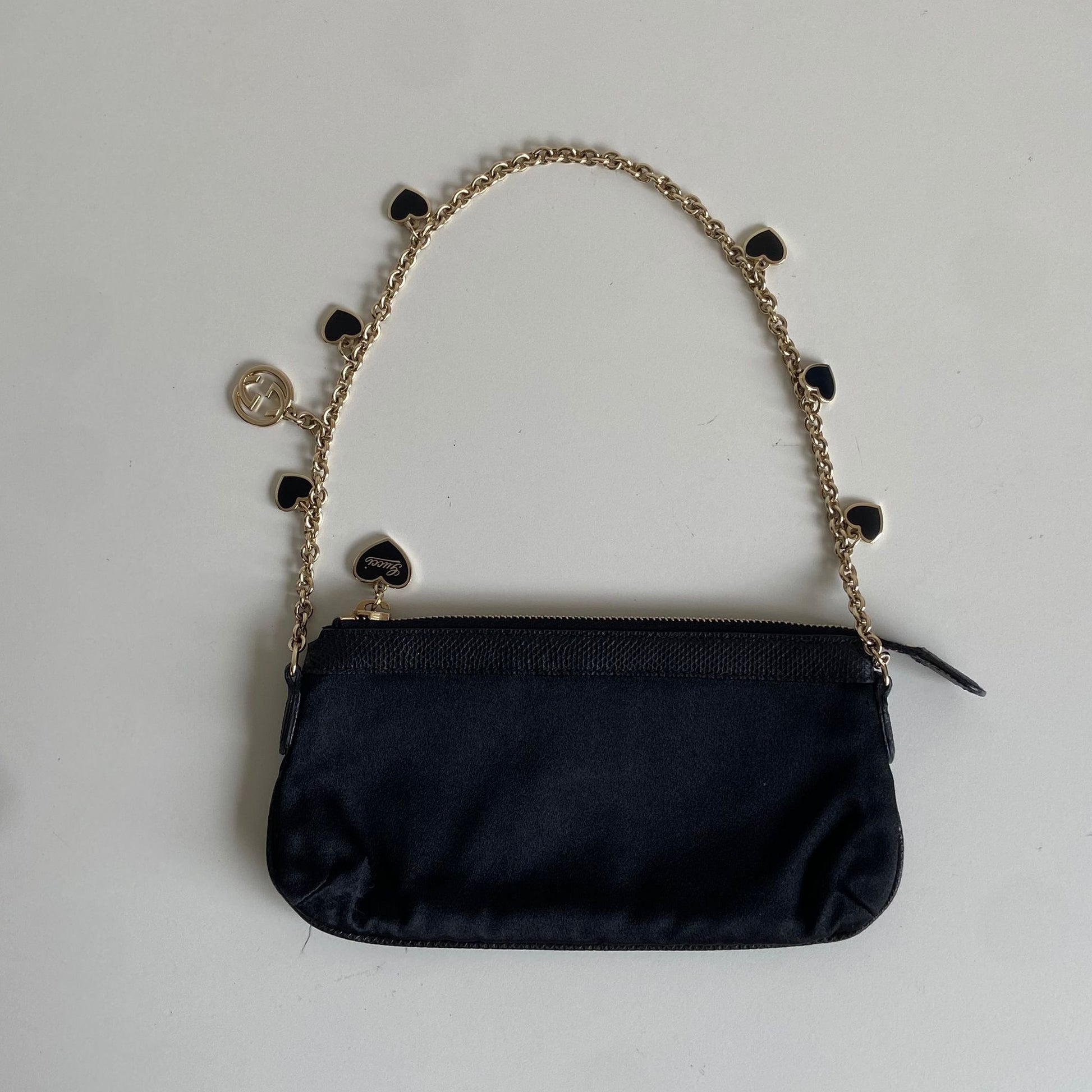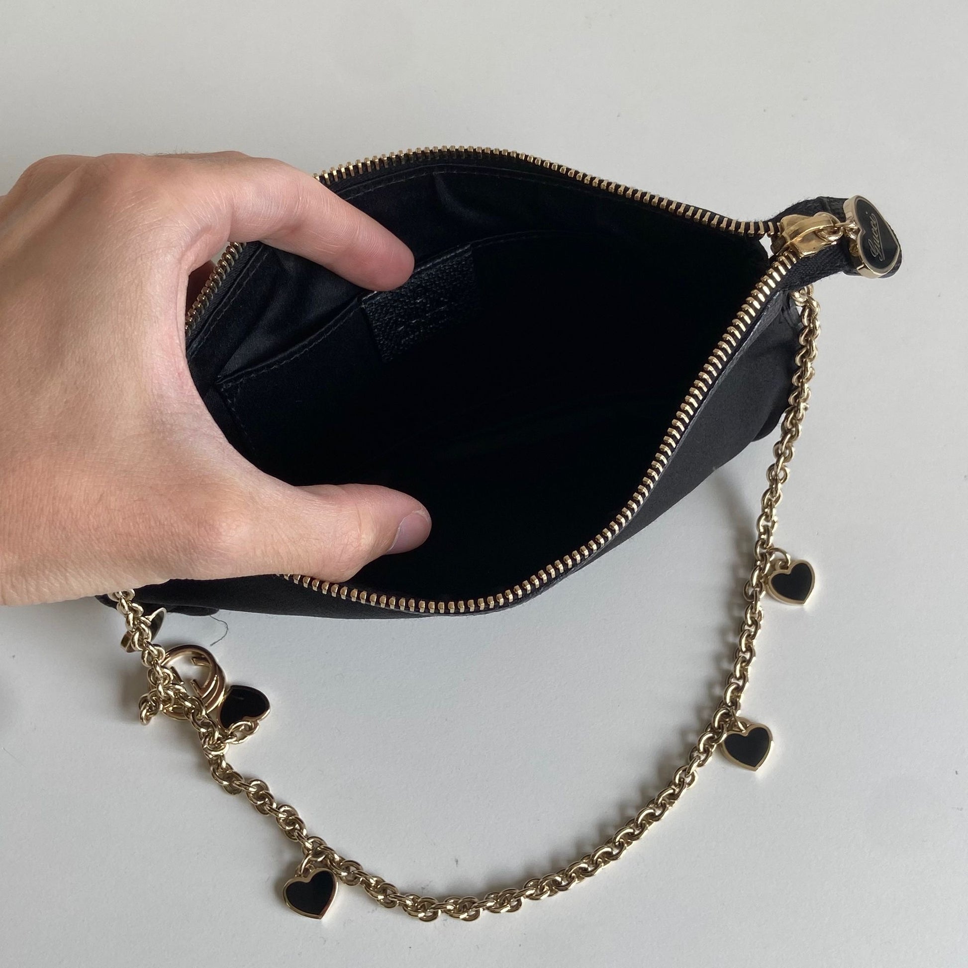 Bellissima mini pochette Charms di Gucci in satin nero con dettagli in pelle e catena oro con charms in smalto nero. Si indossa a spalla.