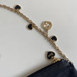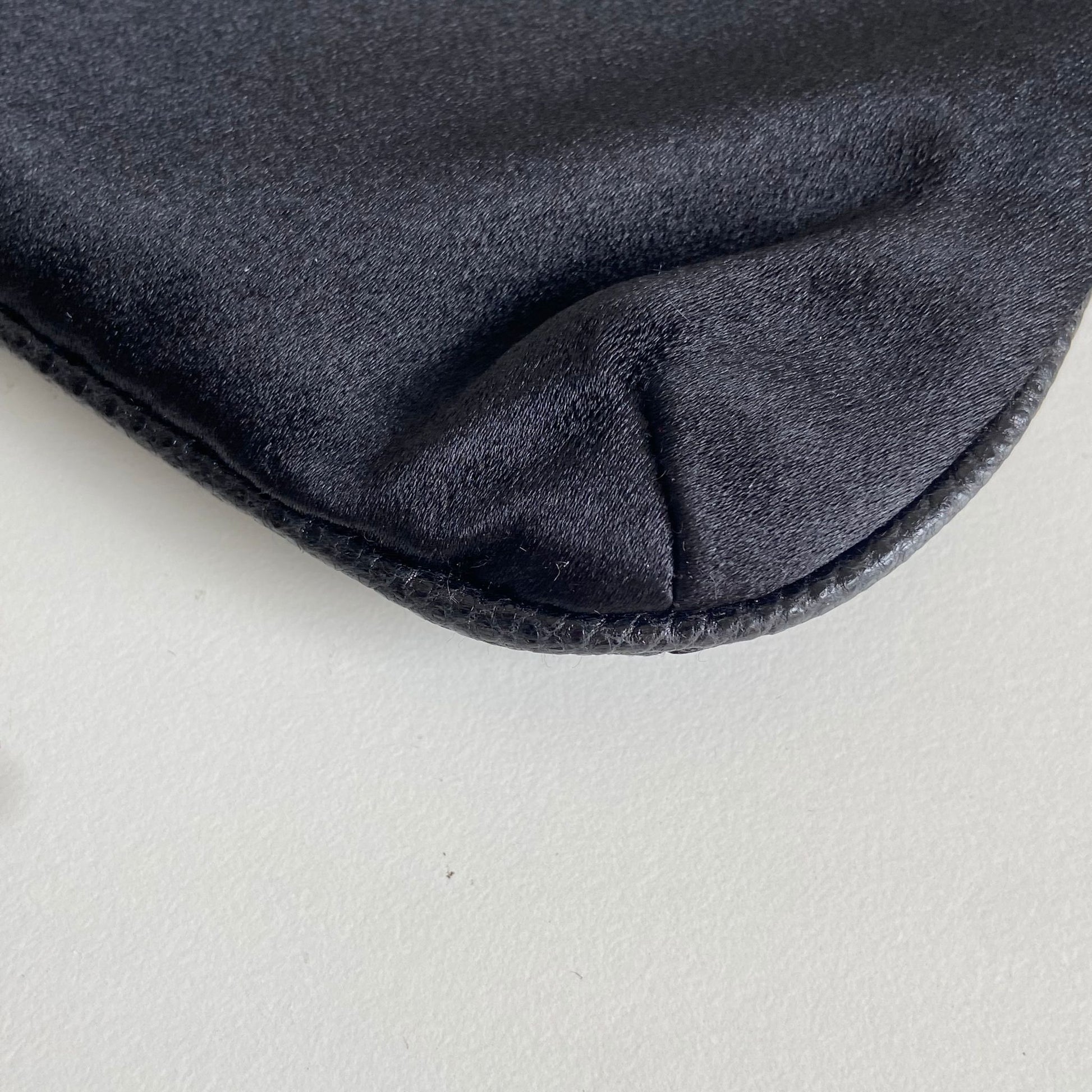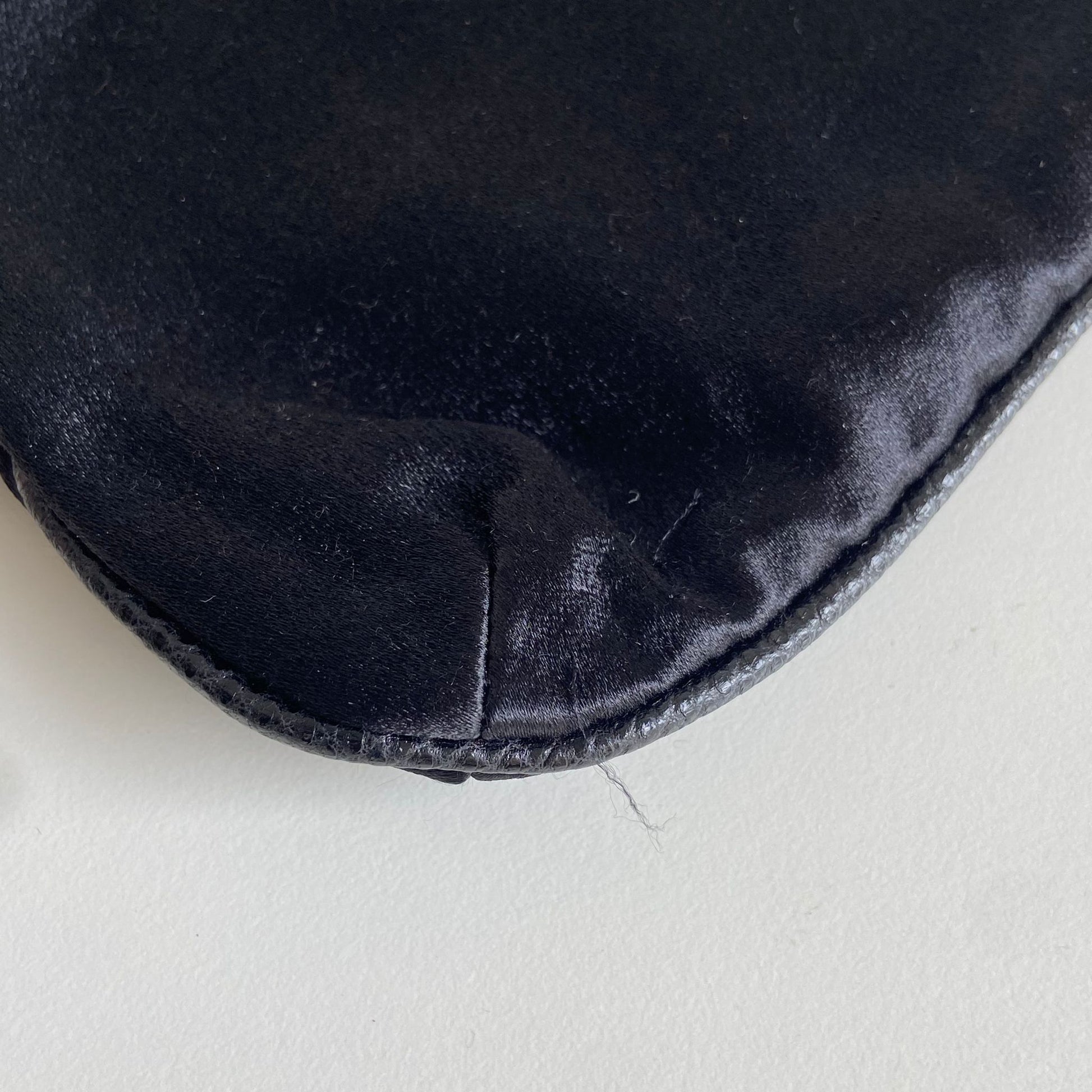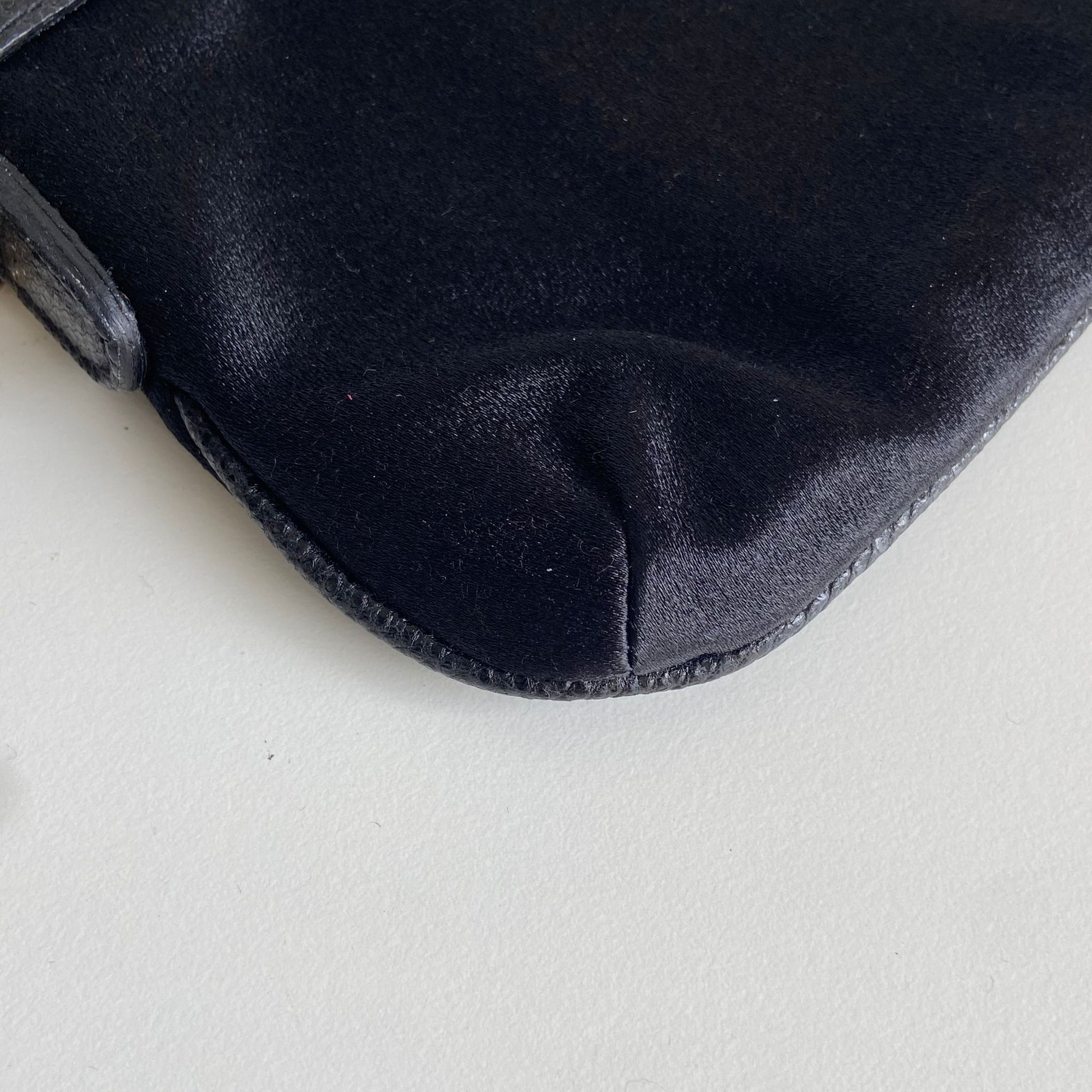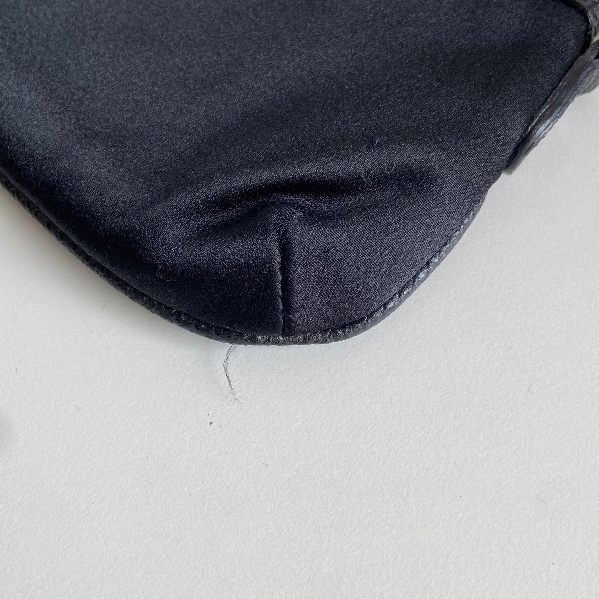 Bellissima mini pochette Charms di Gucci in satin nero con dettagli in pelle e catena oro con charms in smalto nero. Si indossa a spalla.