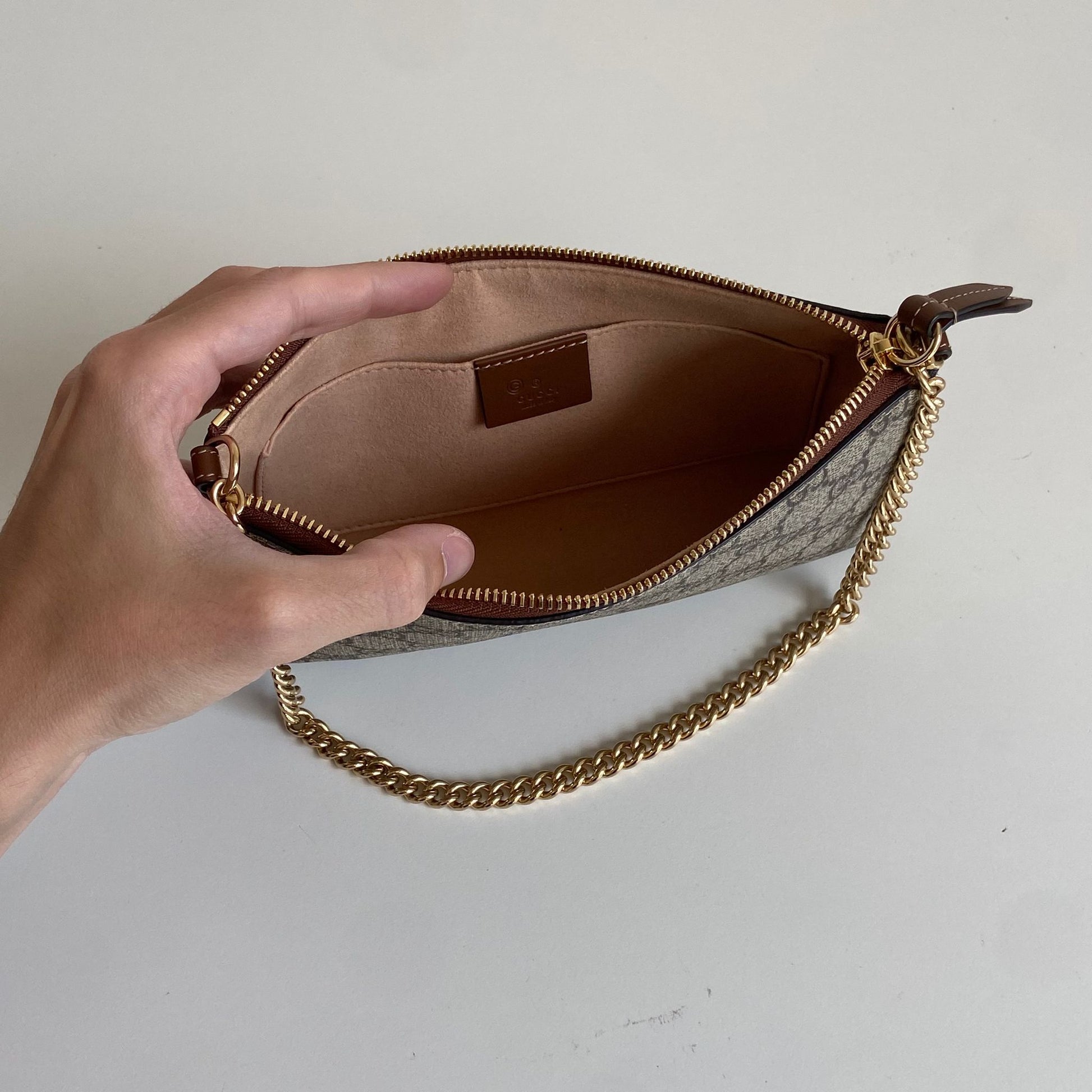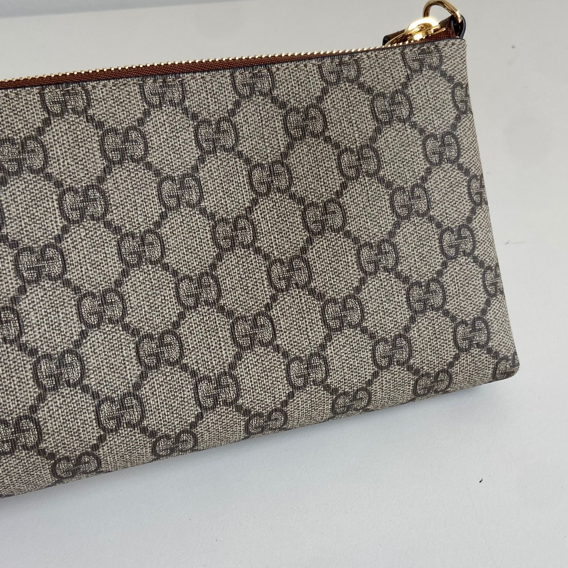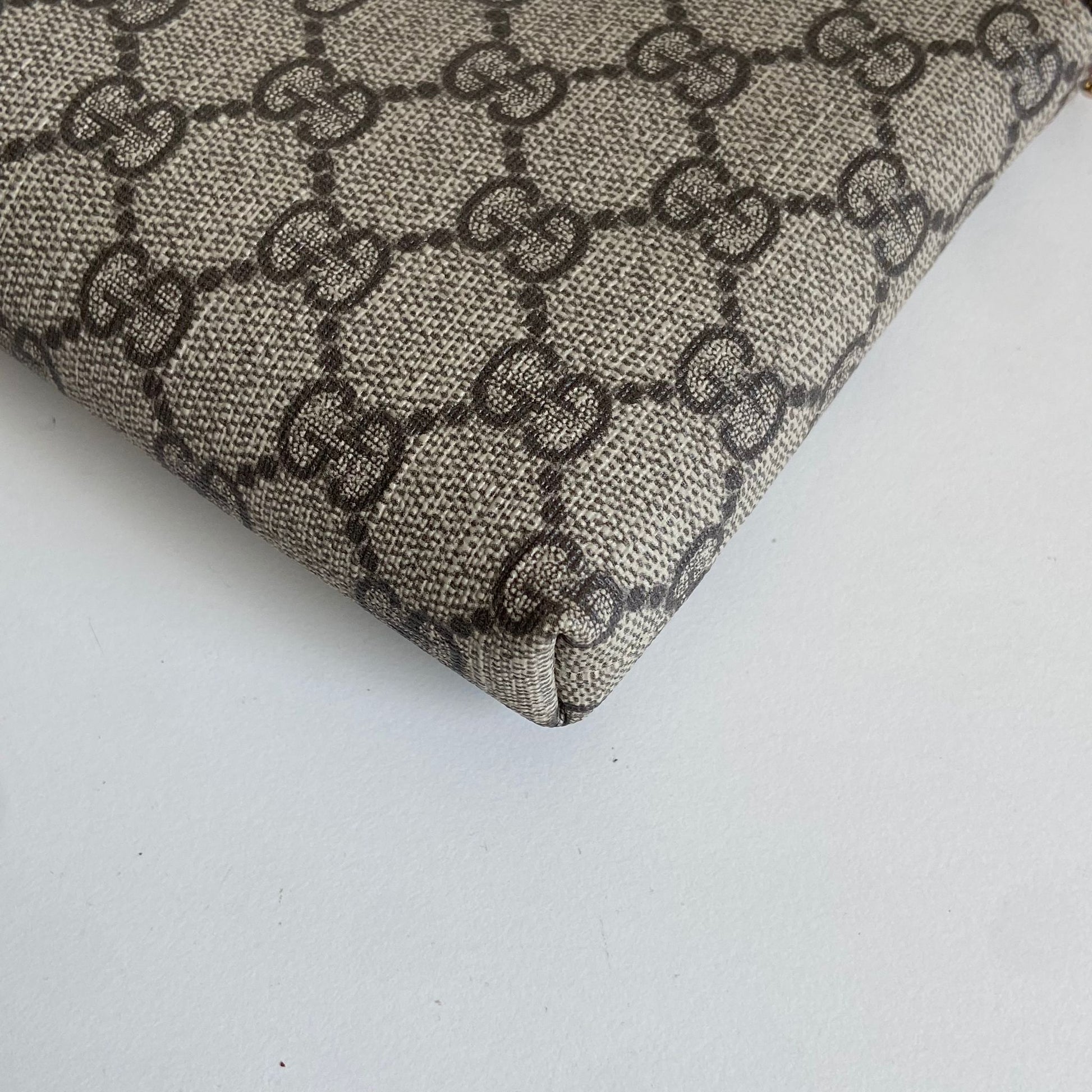 Bellissima borsa Gucci modello Pochette in tela GG beige e hardware oro. Si indossa a spalla, la tracolla non è né regolabile né rimovibile.