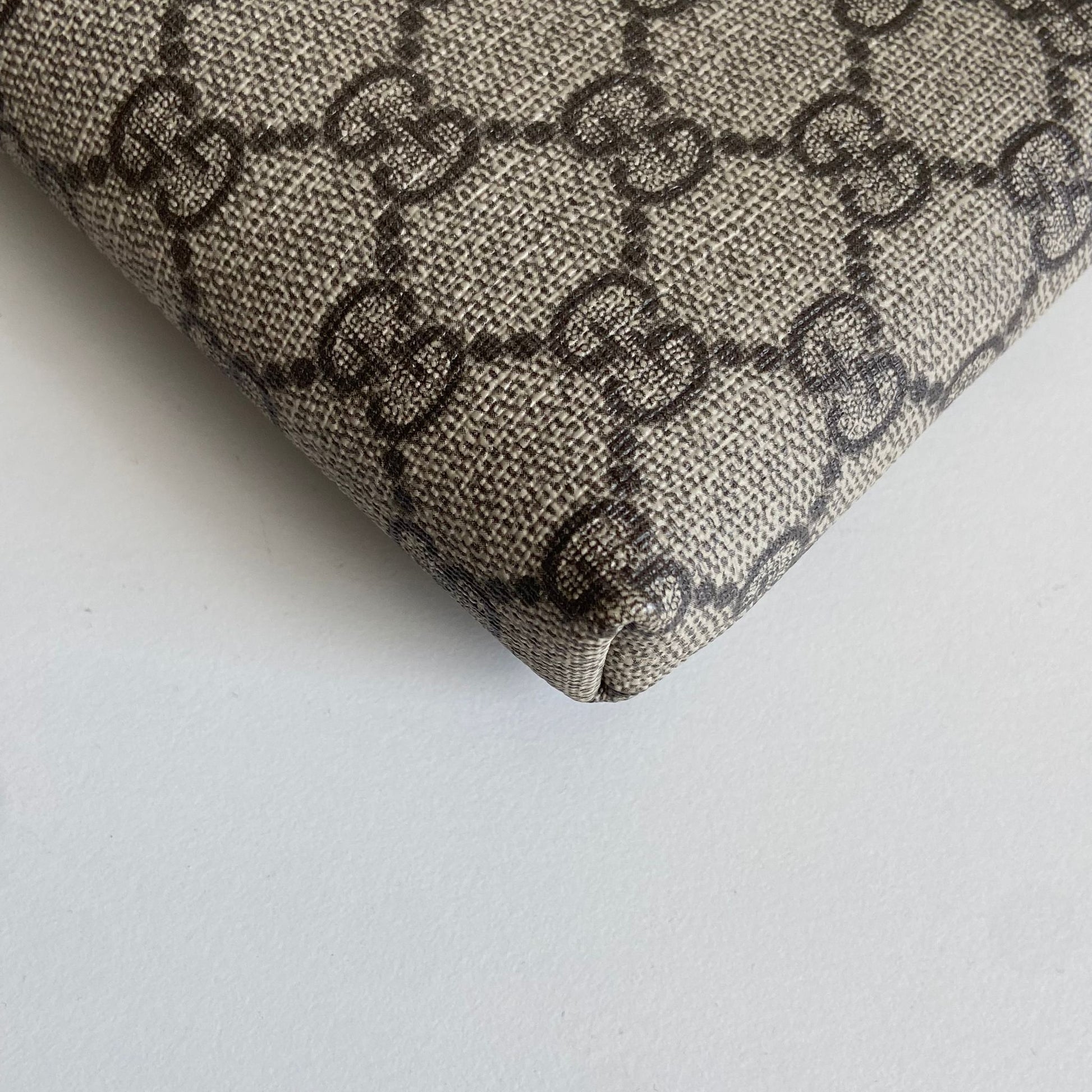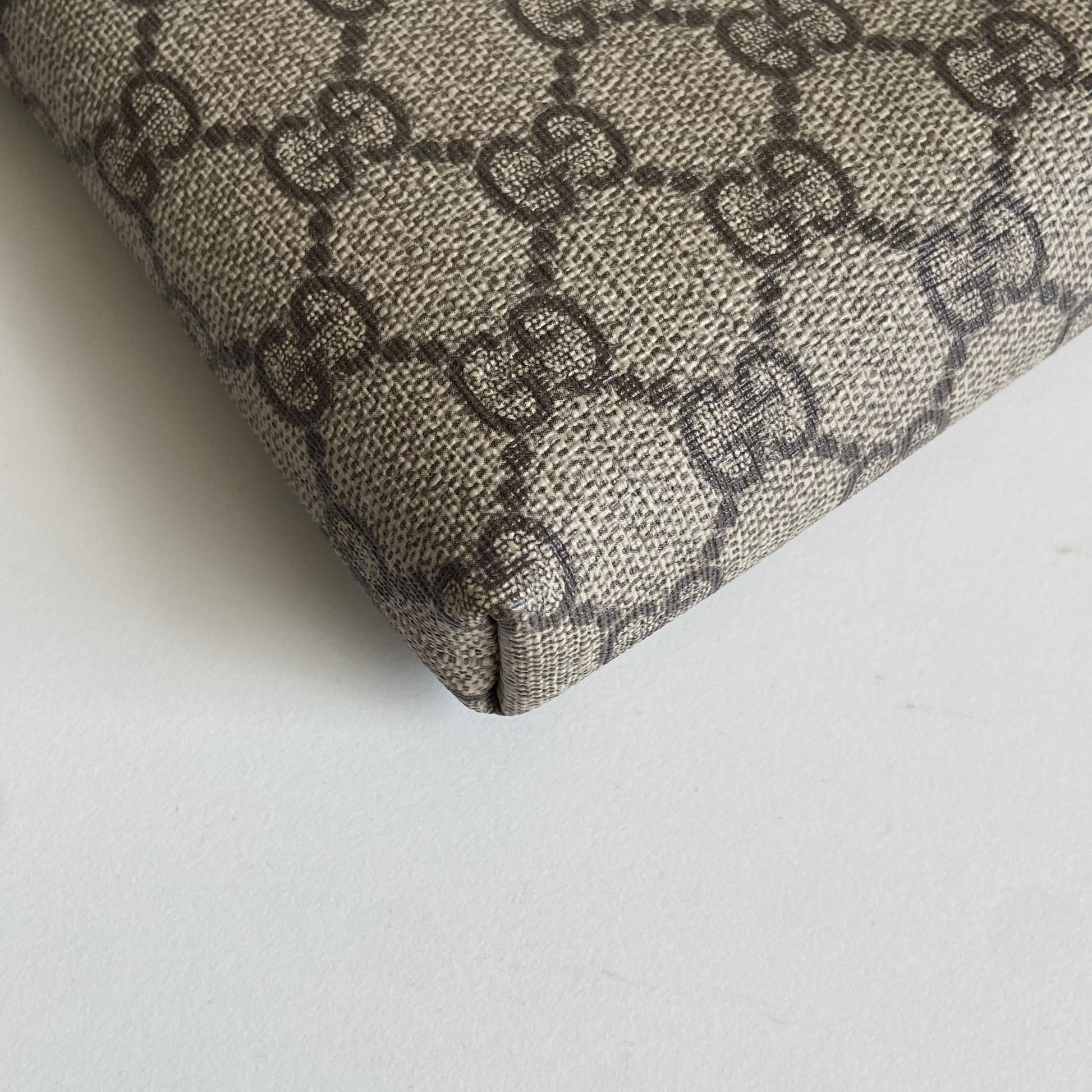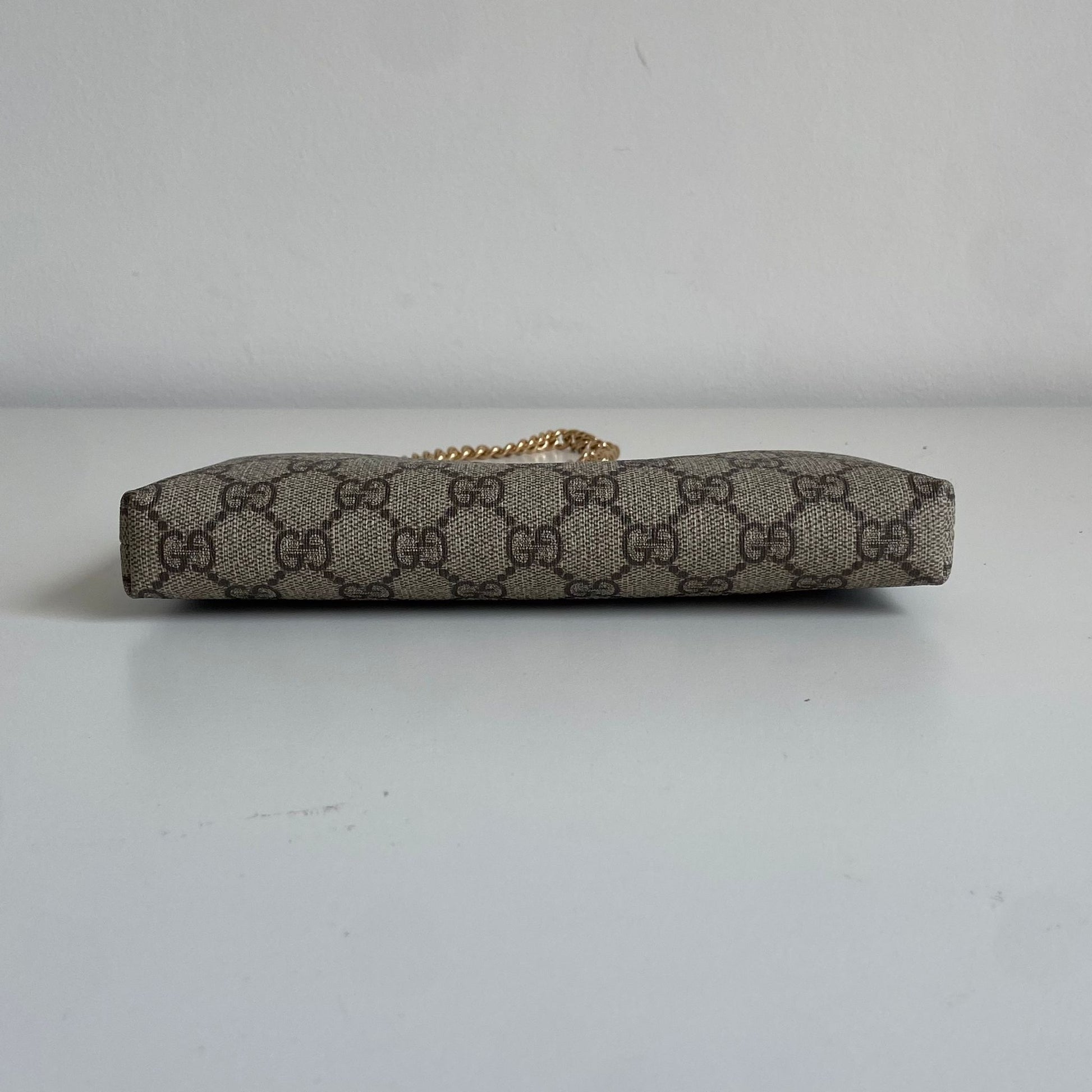 Bellissima borsa Gucci modello Pochette in tela GG beige e hardware oro. Si indossa a spalla, la tracolla non è né regolabile né rimovibile.