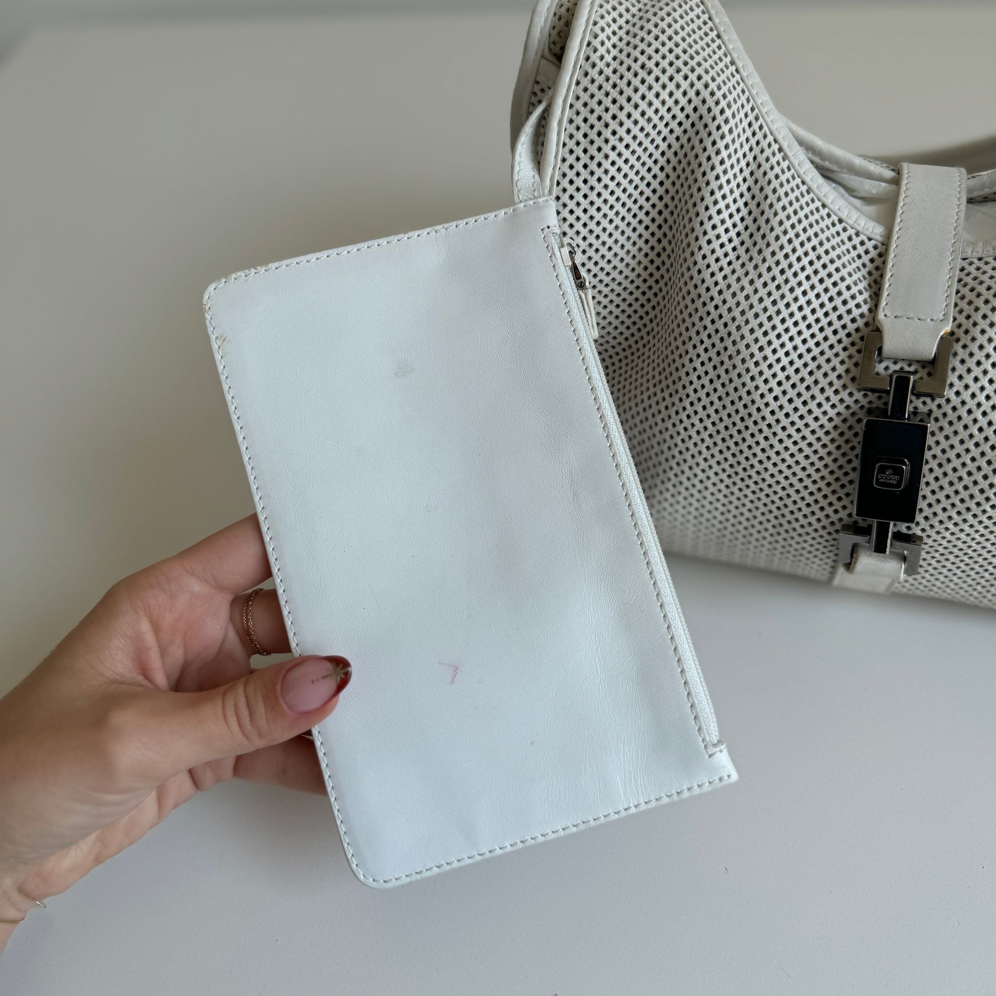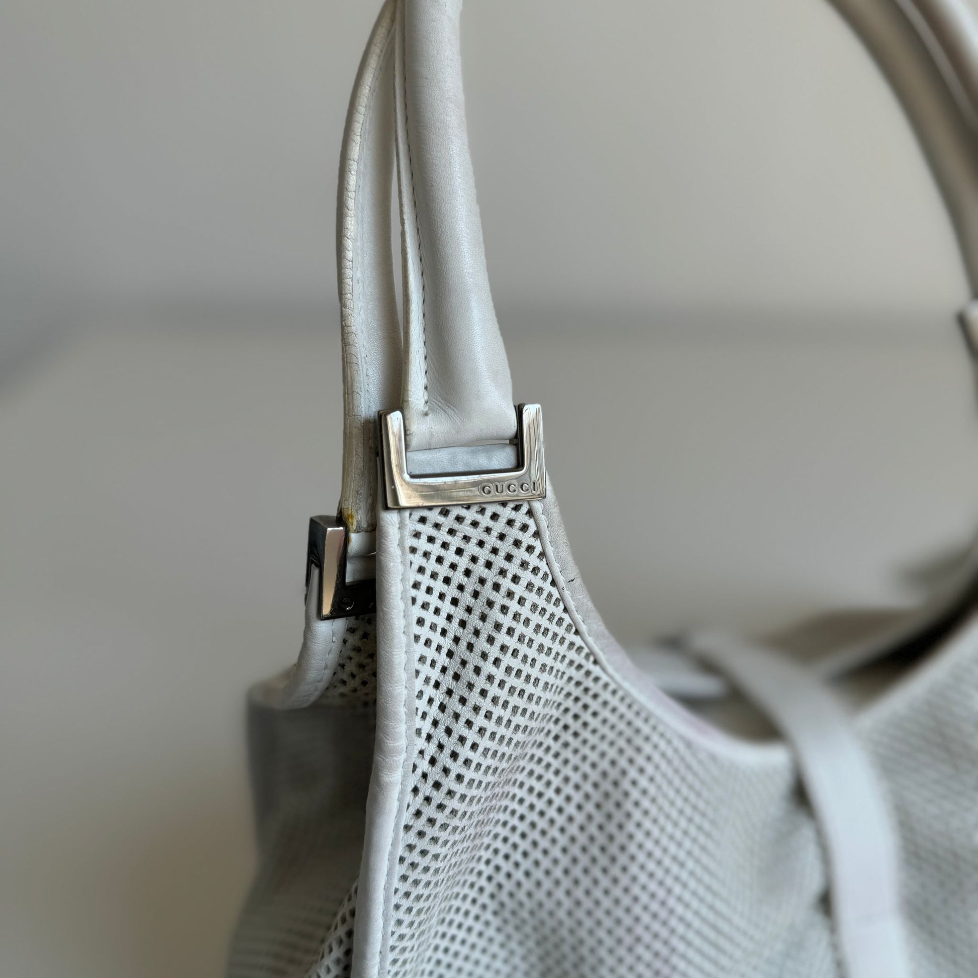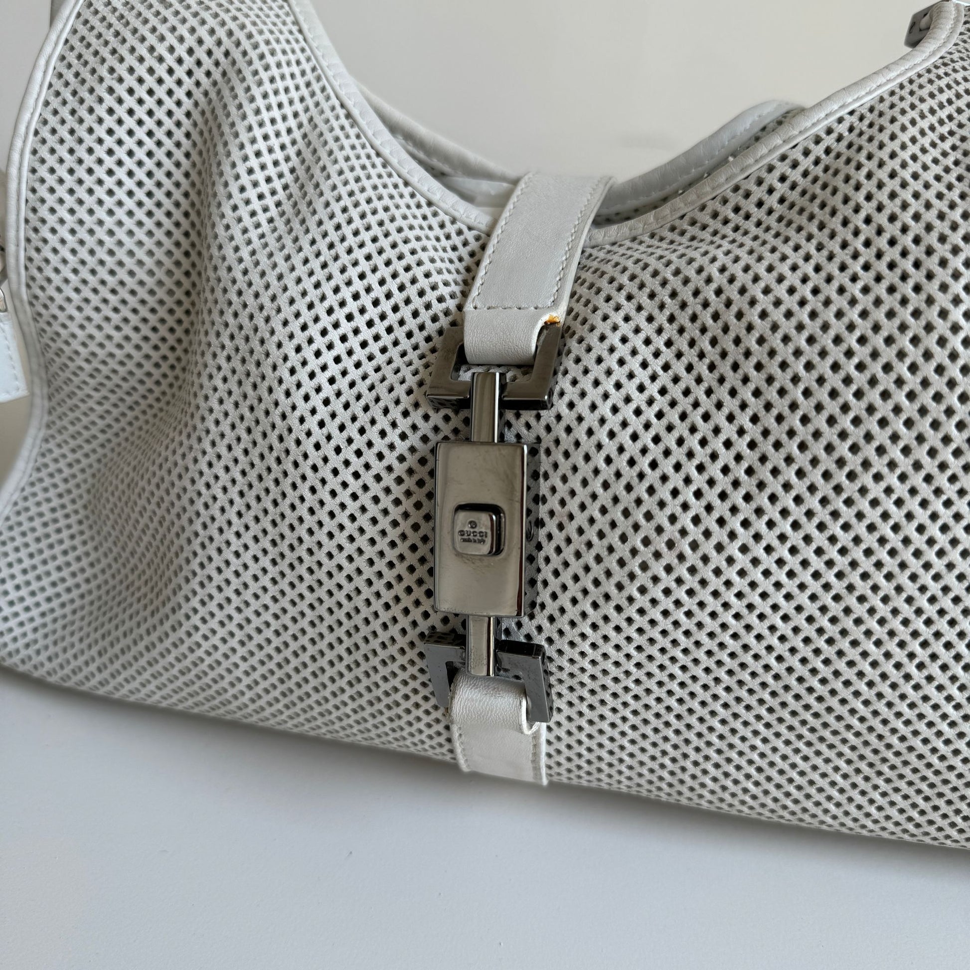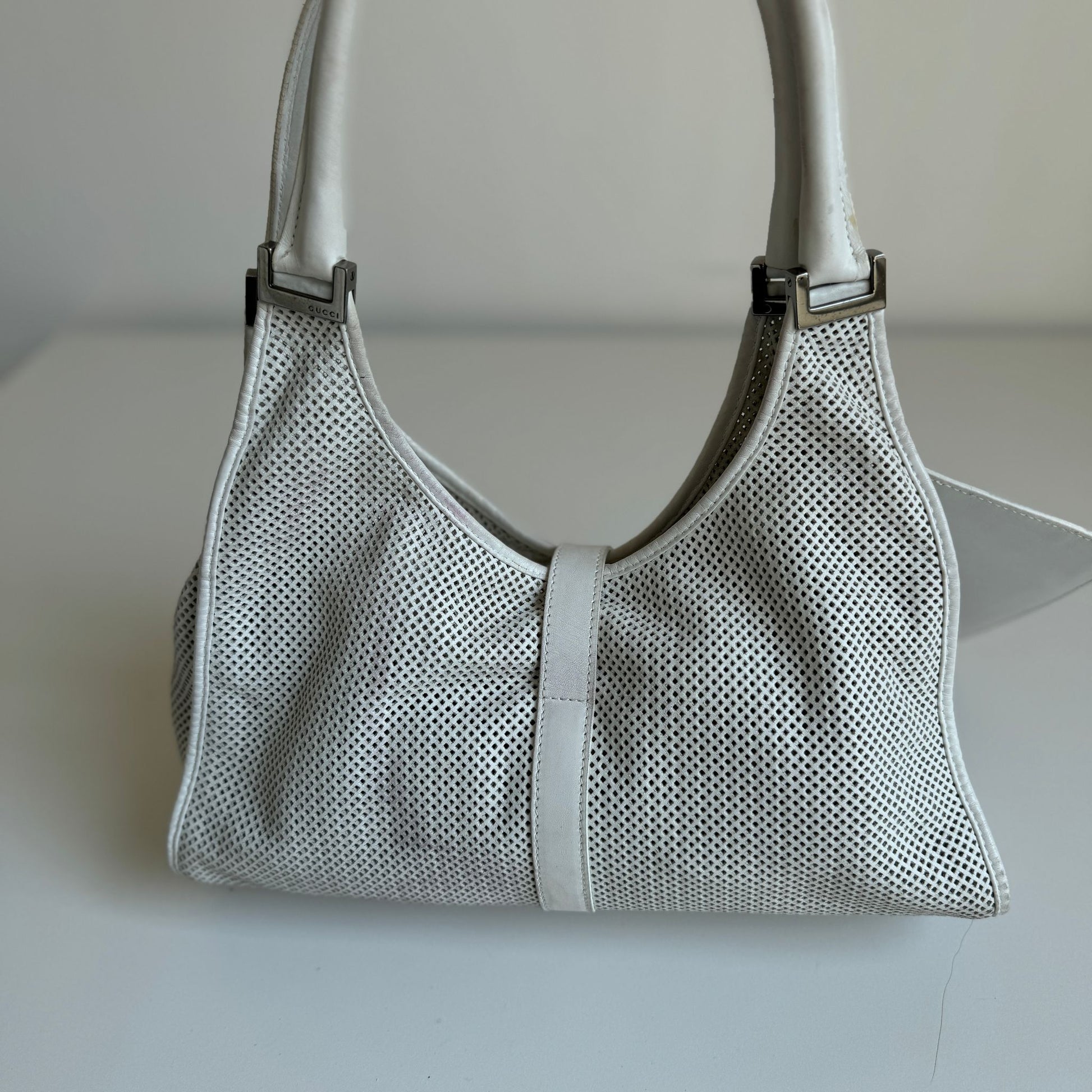 Parente della Jackie, bellissima Gucci Bardot in pelle bianca traforata e hardware argento scuro. Si indossa a mano o a spalla. Completa di pochette interna removibile.