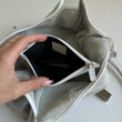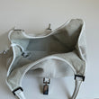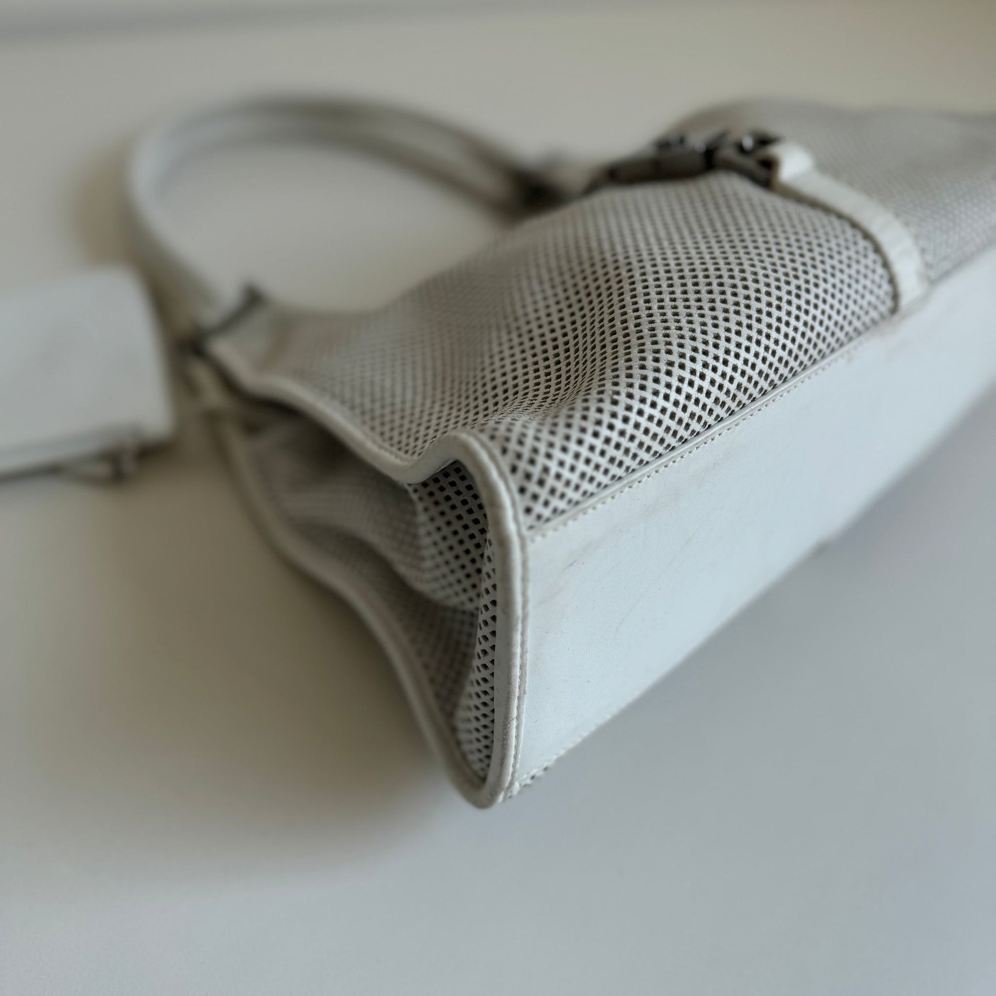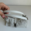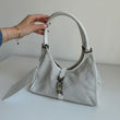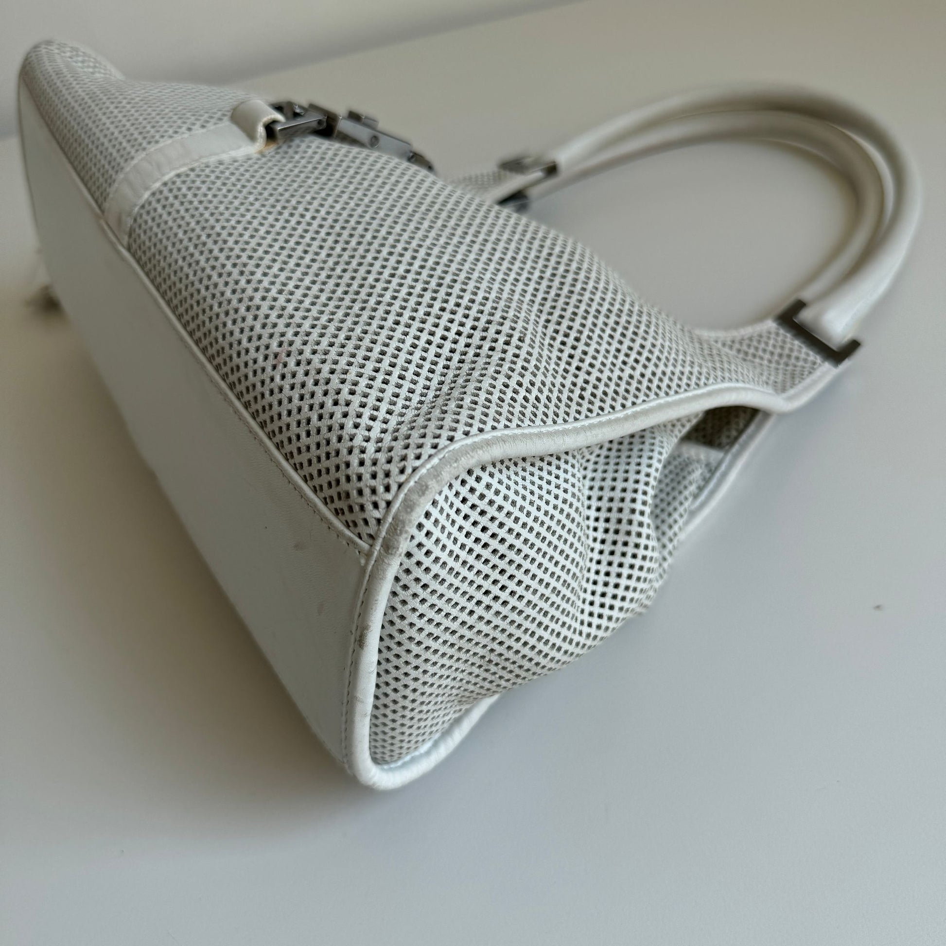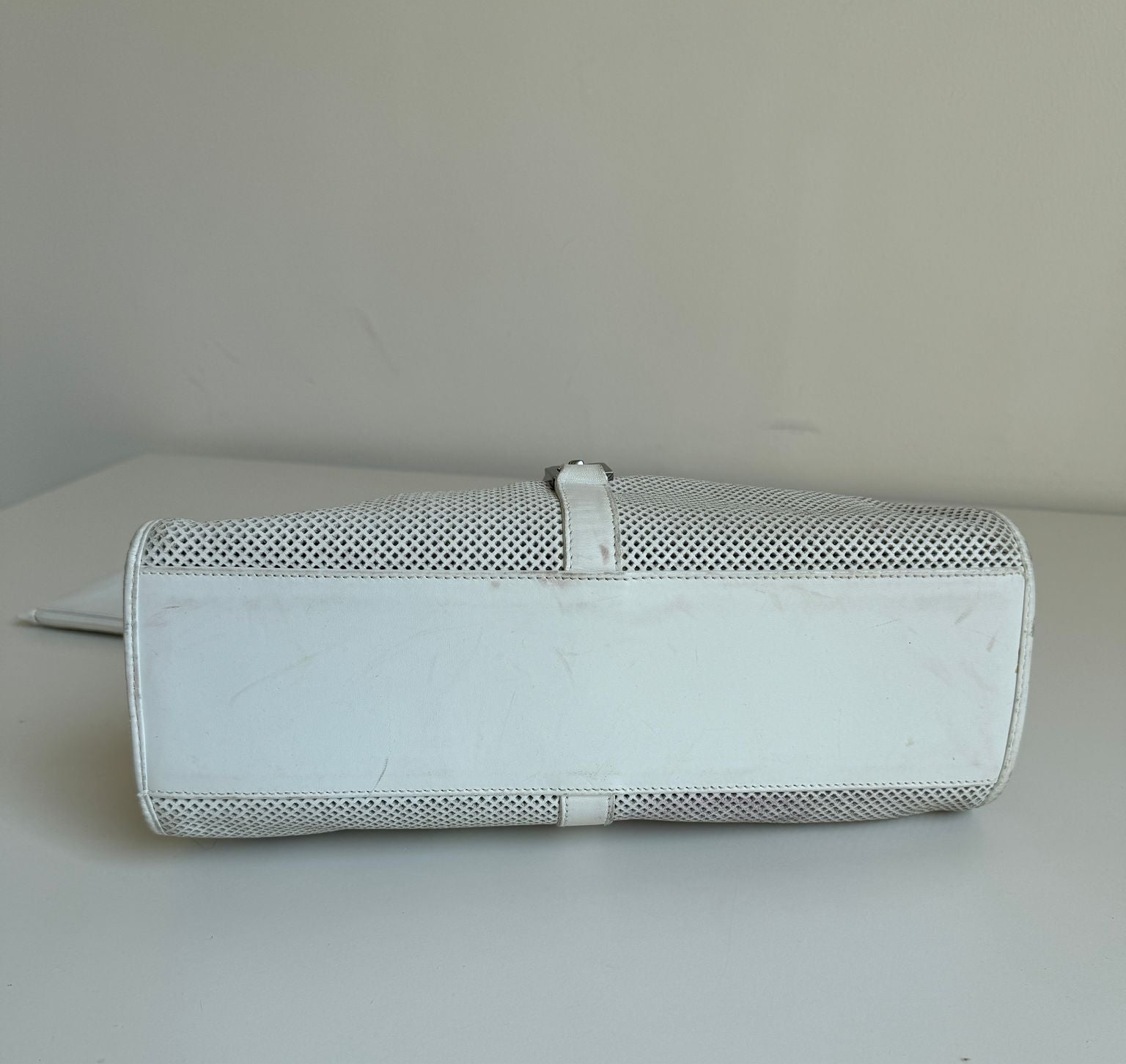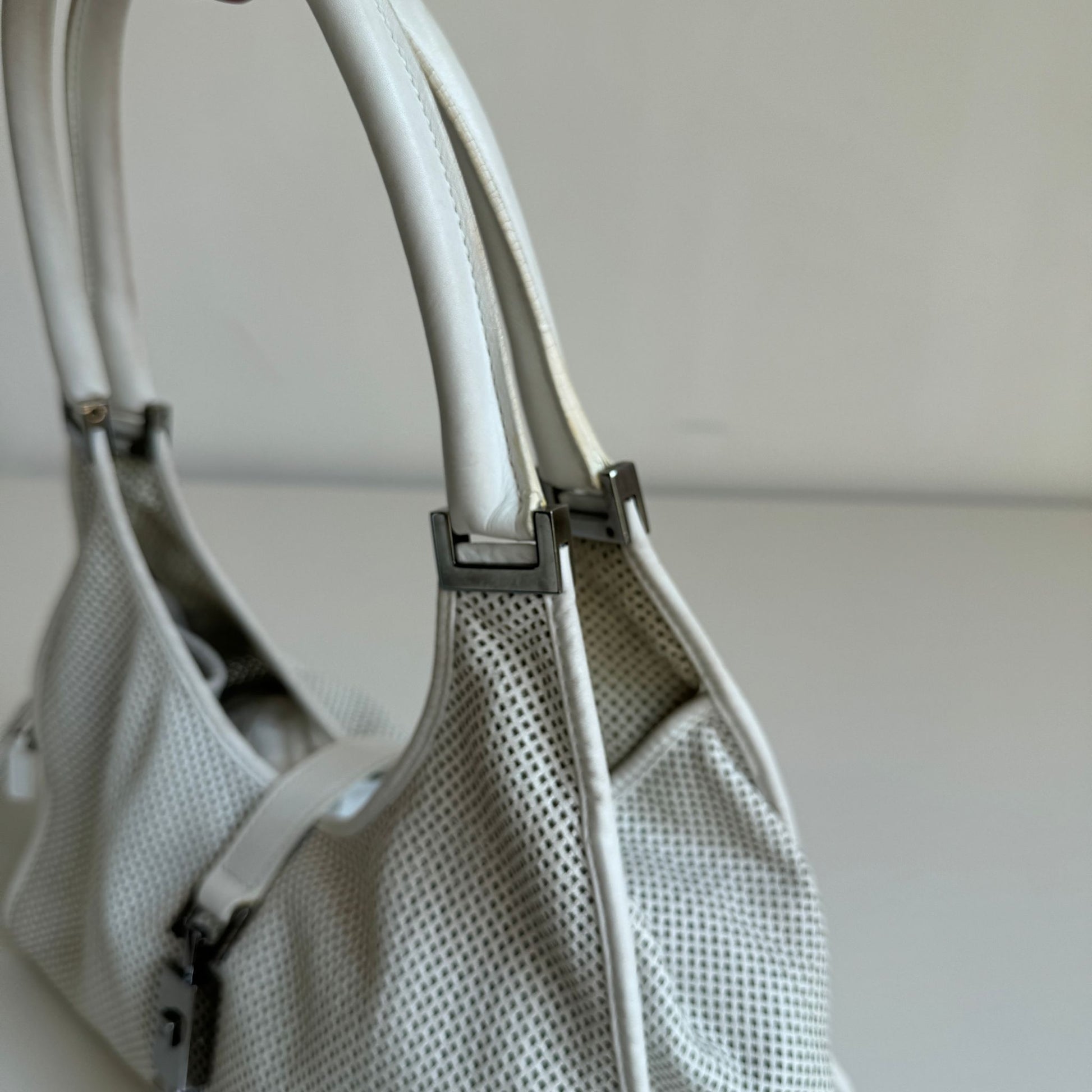 Parente della Jackie, bellissima Gucci Bardot in pelle bianca traforata e hardware argento scuro. Si indossa a mano o a spalla. Completa di pochette interna removibile.