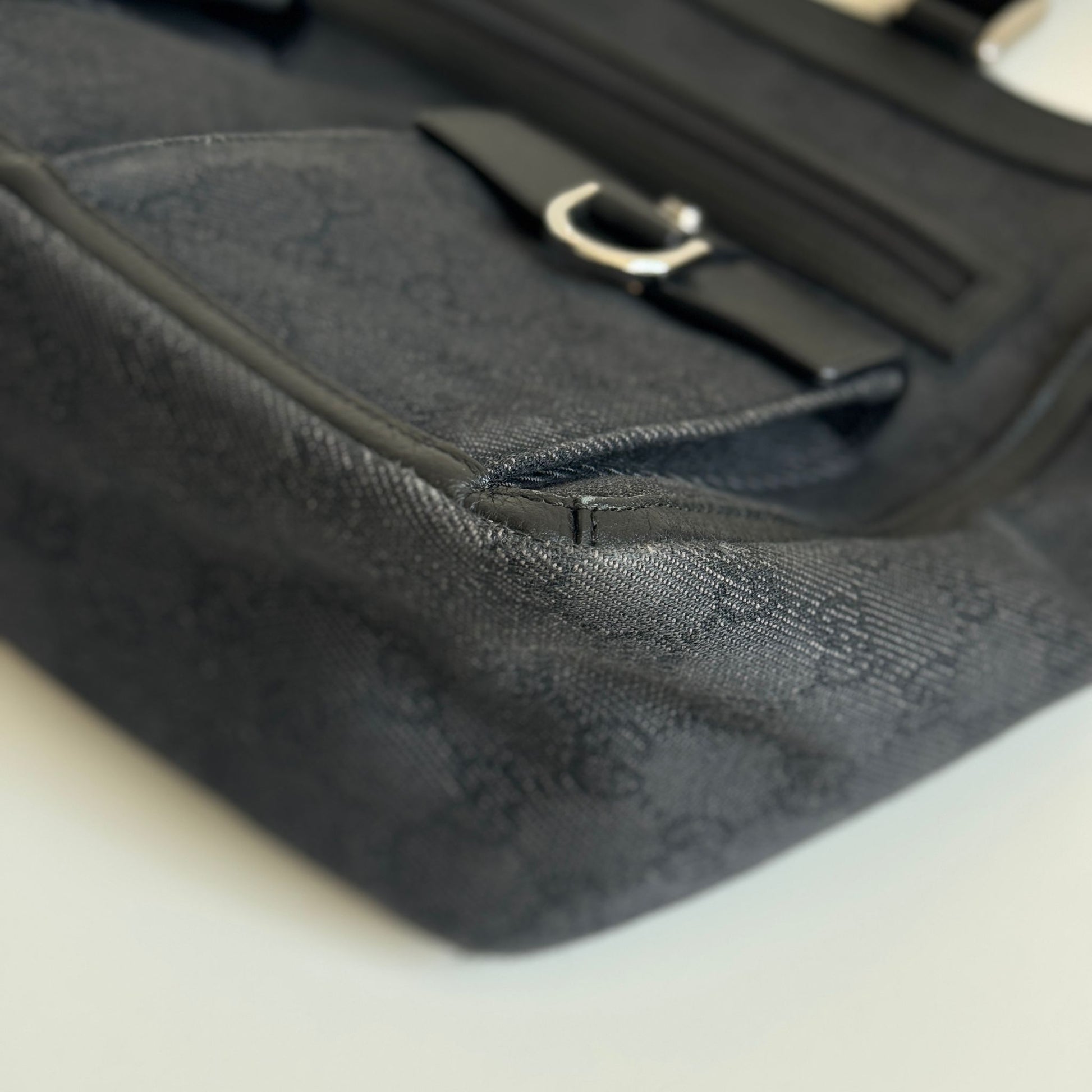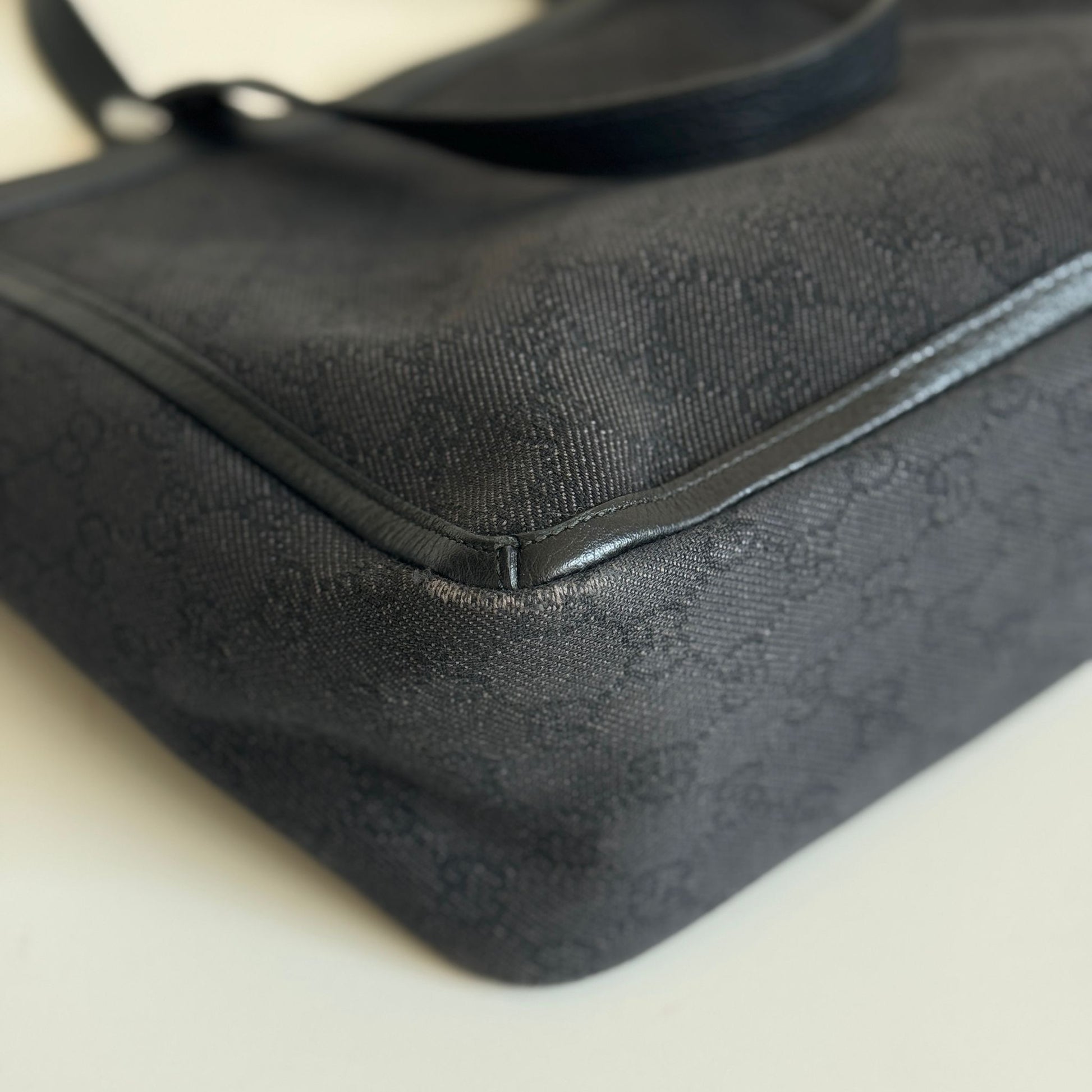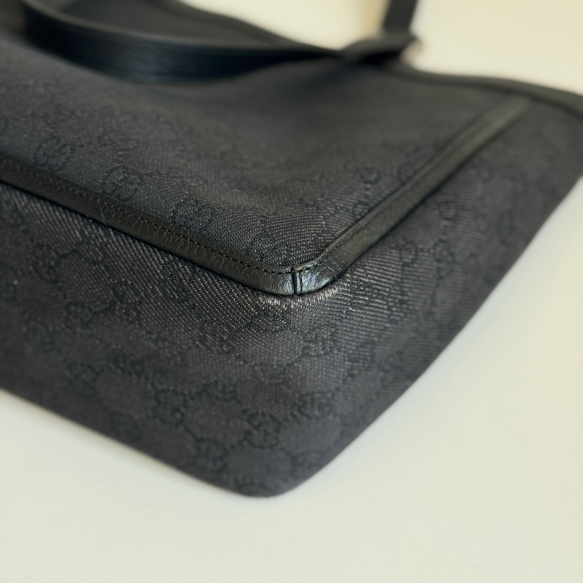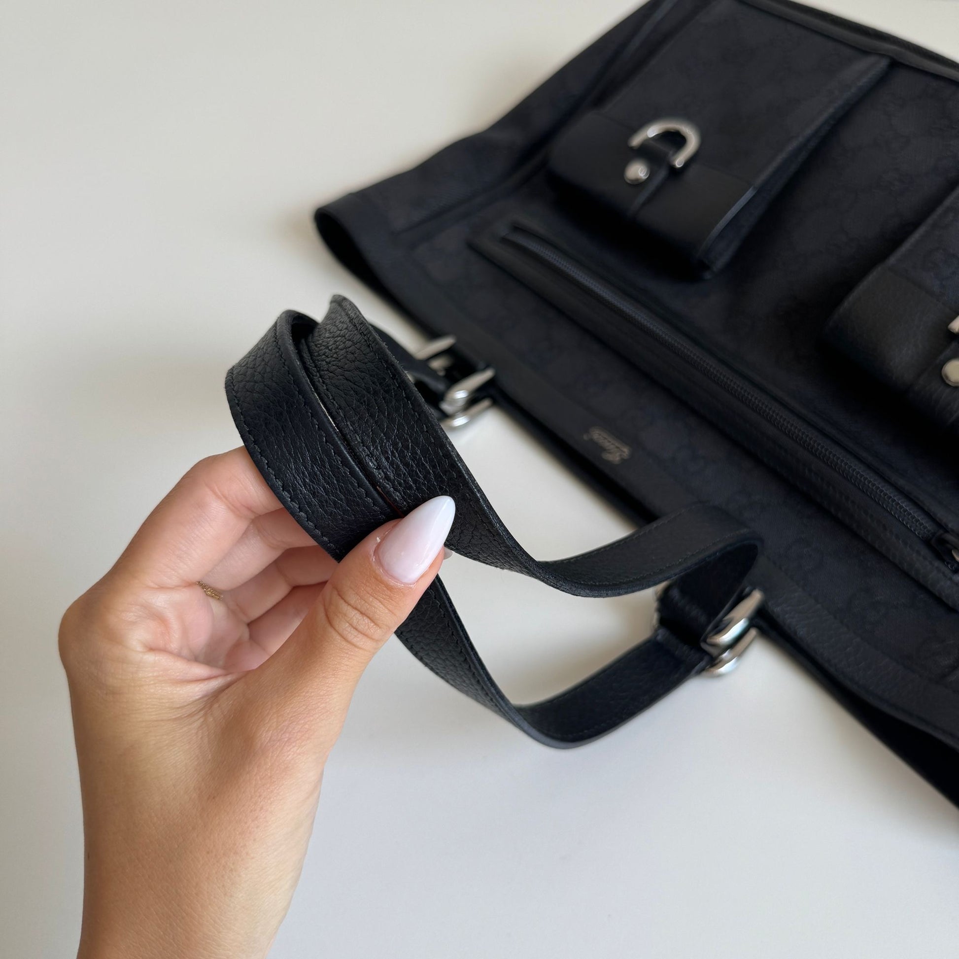 Bellissima borsa Gucci vintage in tela monogram GG nera con dettagli in pelle nera e hardware argento. Si indossa a spalla.
