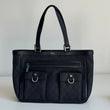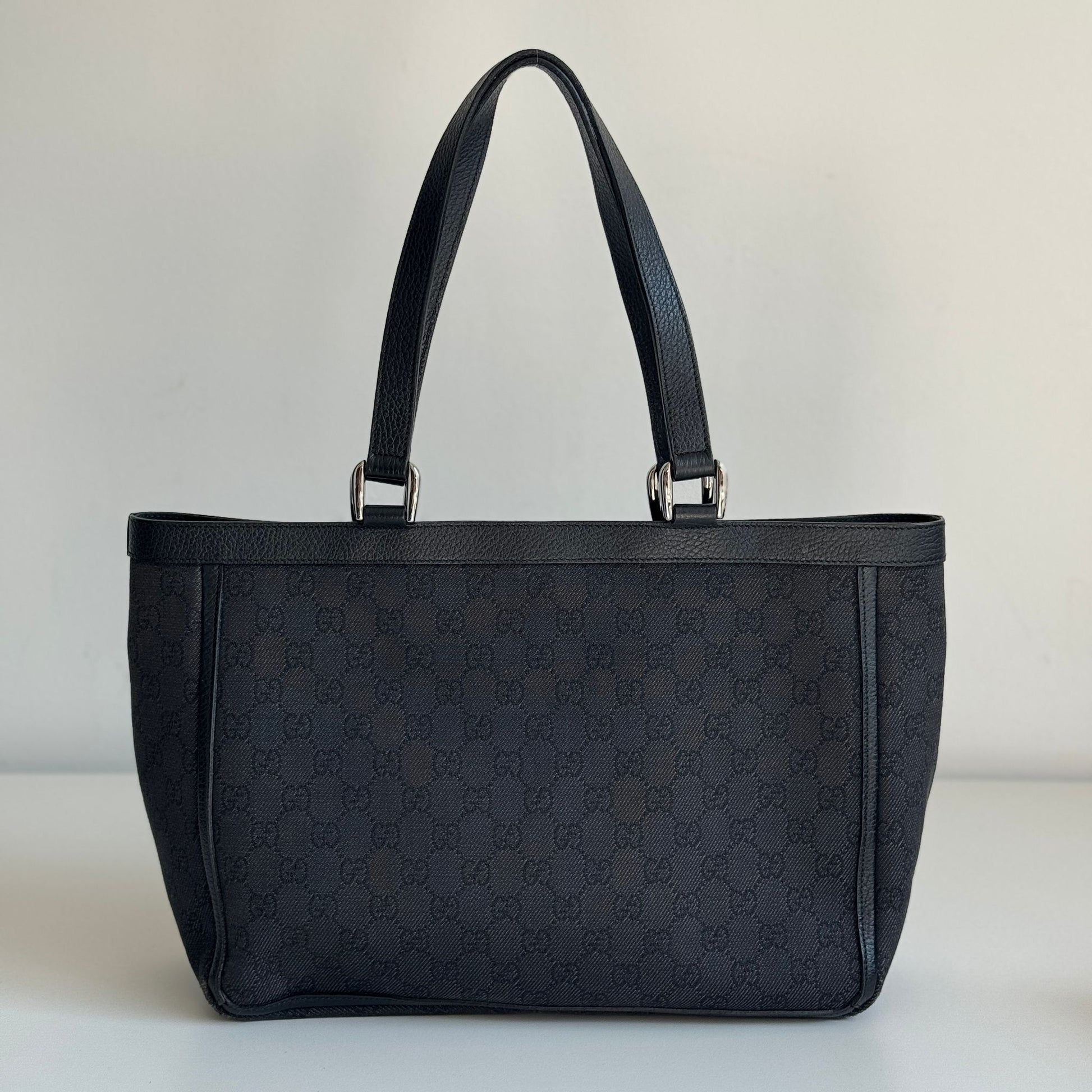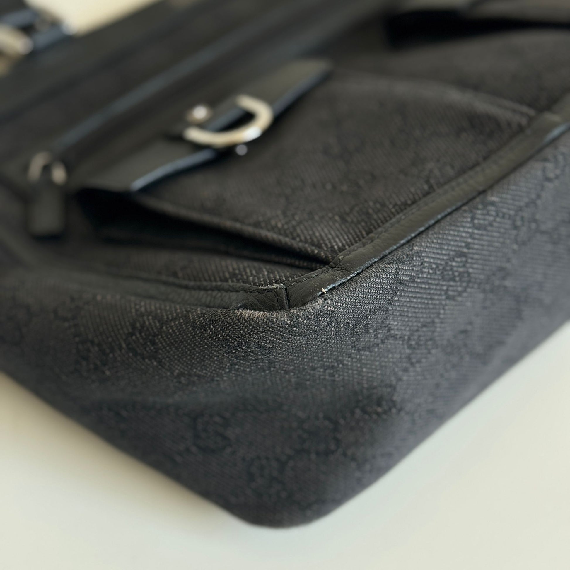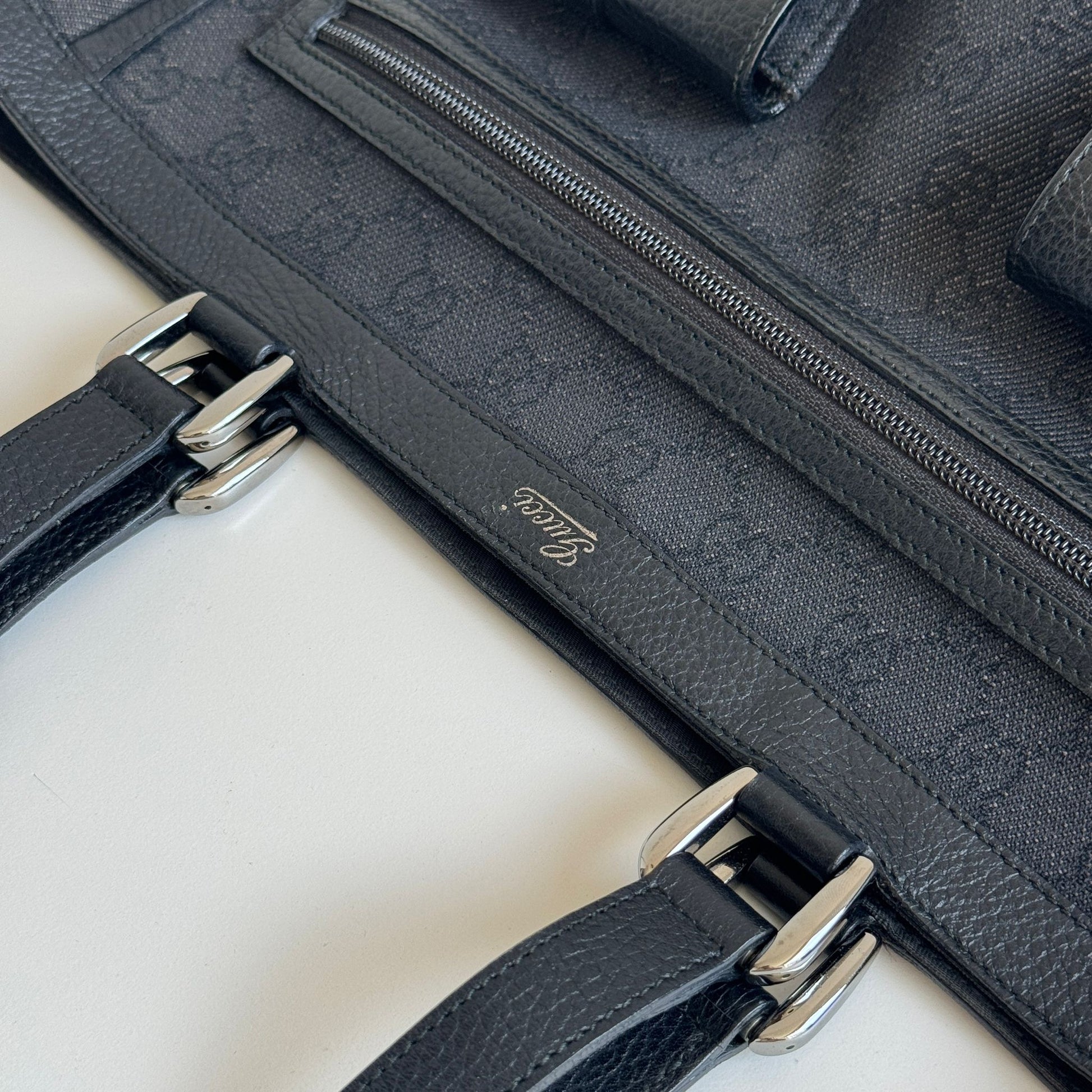 Bellissima borsa Gucci vintage in tela monogram GG nera con dettagli in pelle nera e hardware argento. Si indossa a spalla.