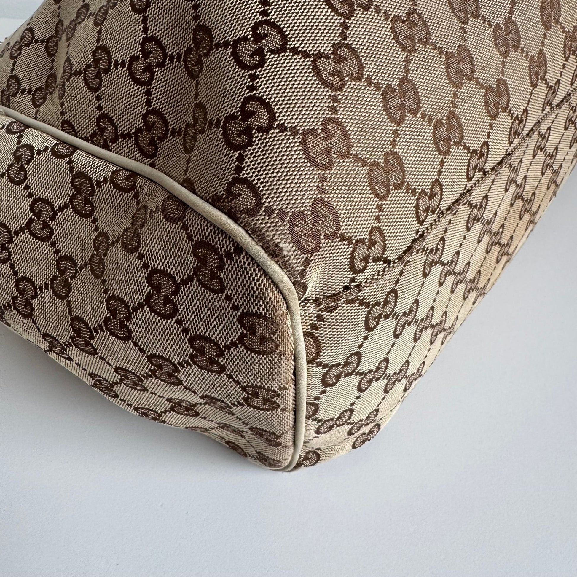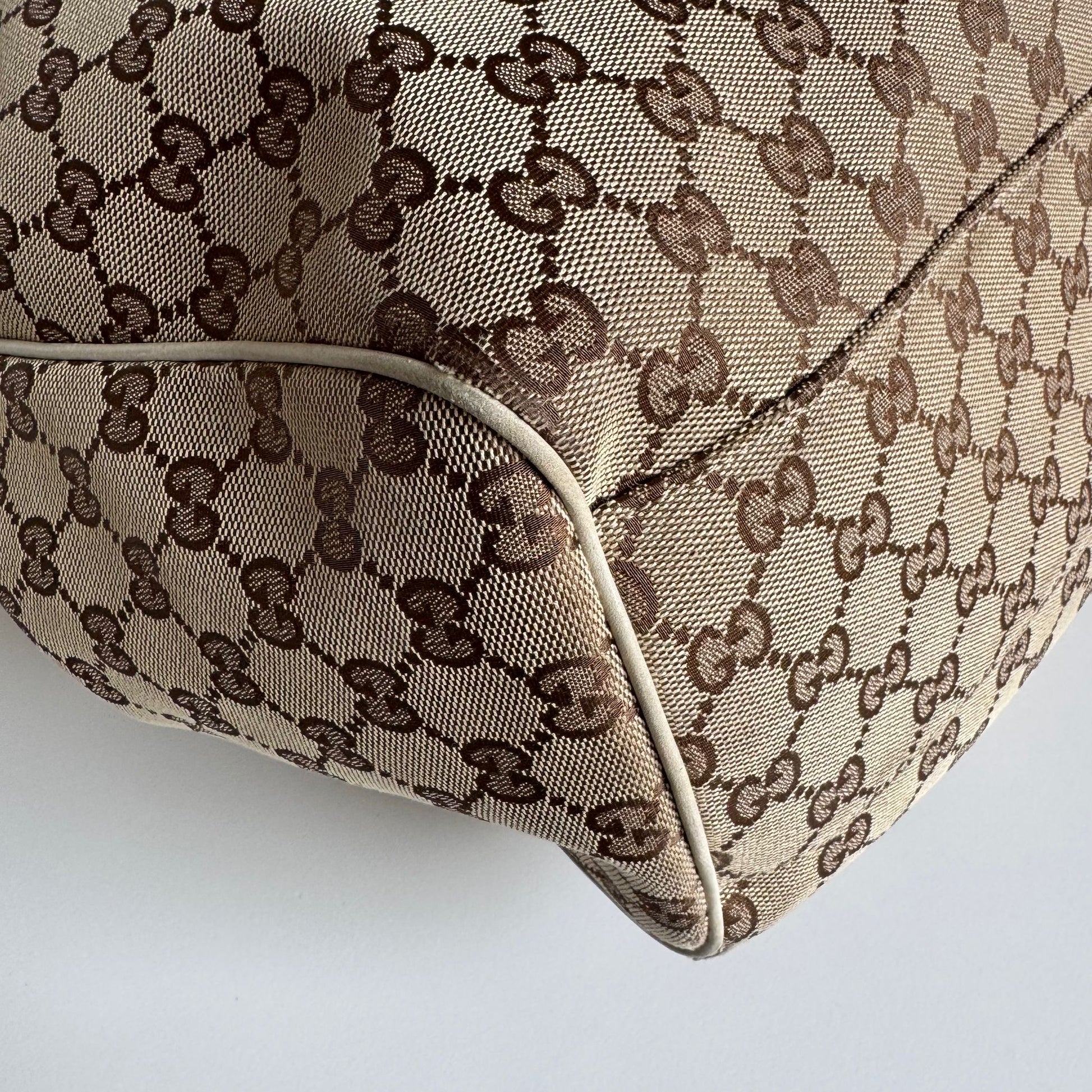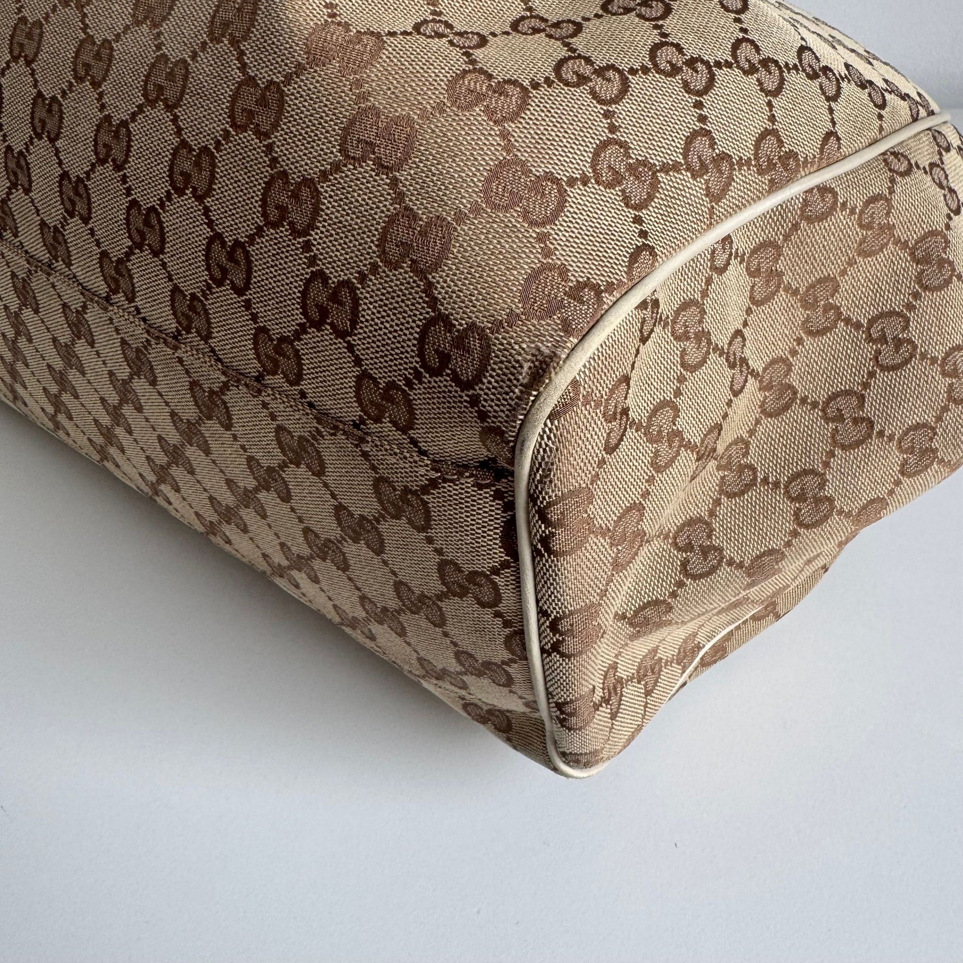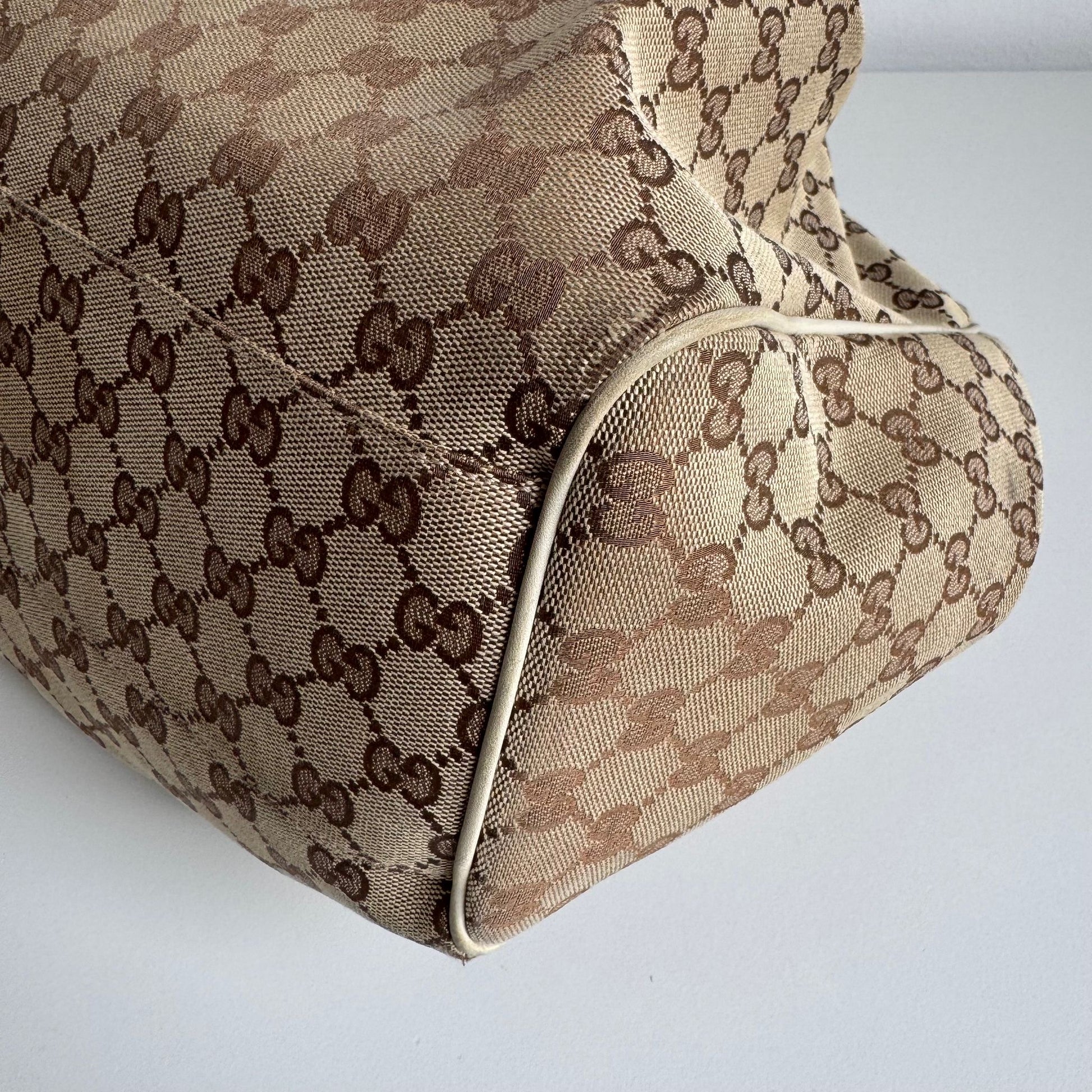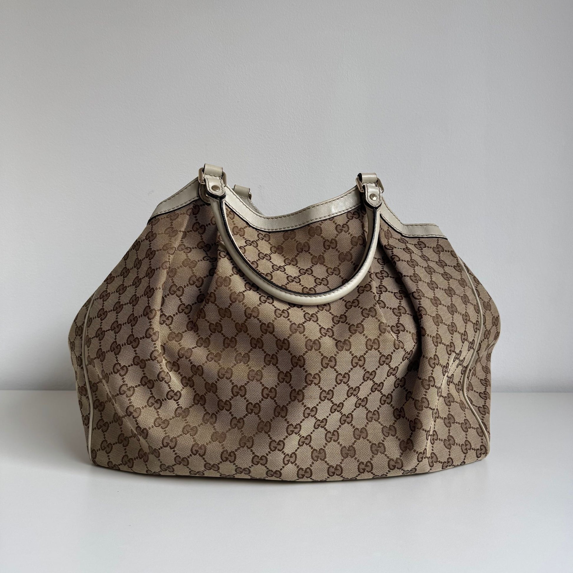 Meravigliosa maxi Shopper Gucci modello Sukey in tela monogram GG, dettagli in pelle color beige e hardware oro. Si indossa a spalla.