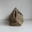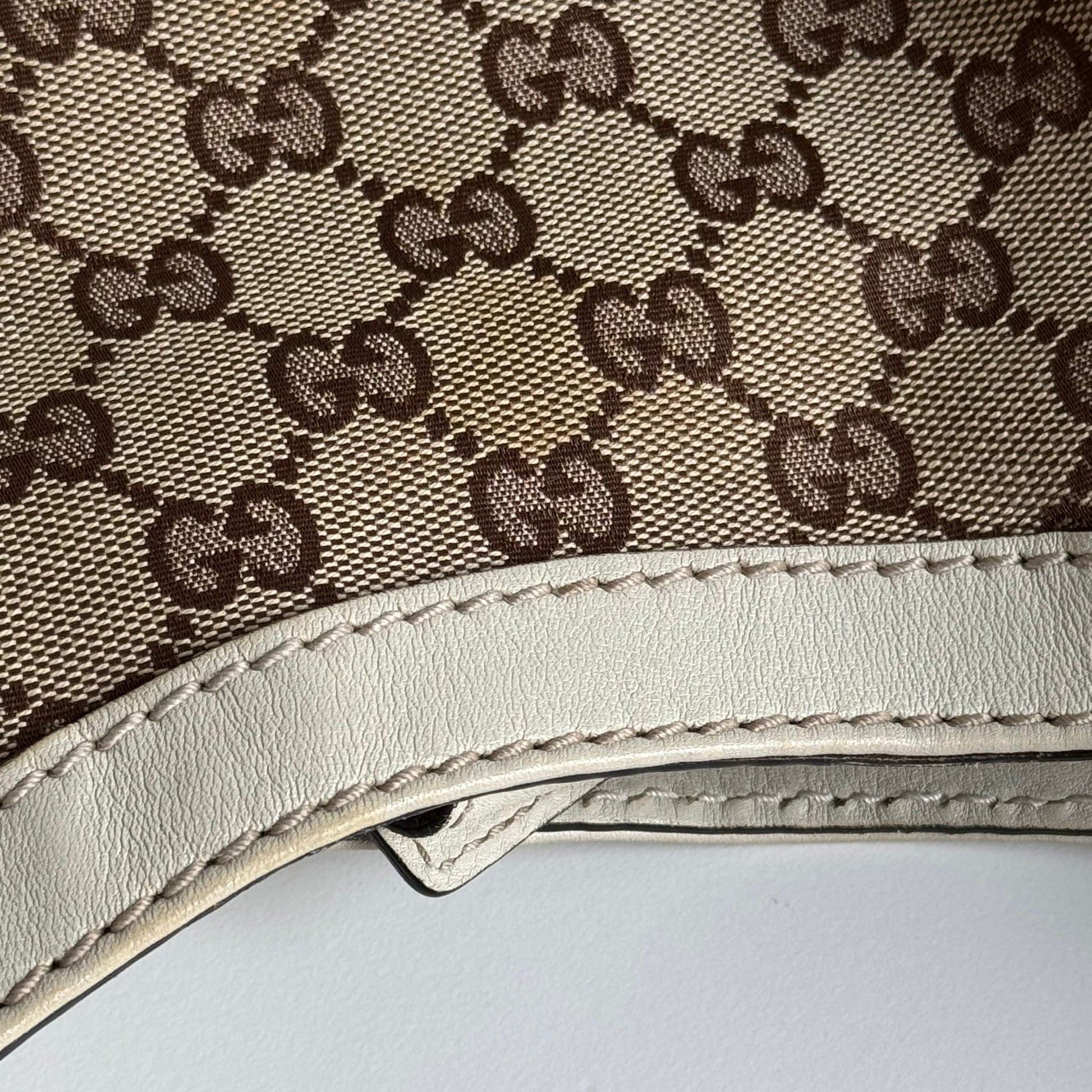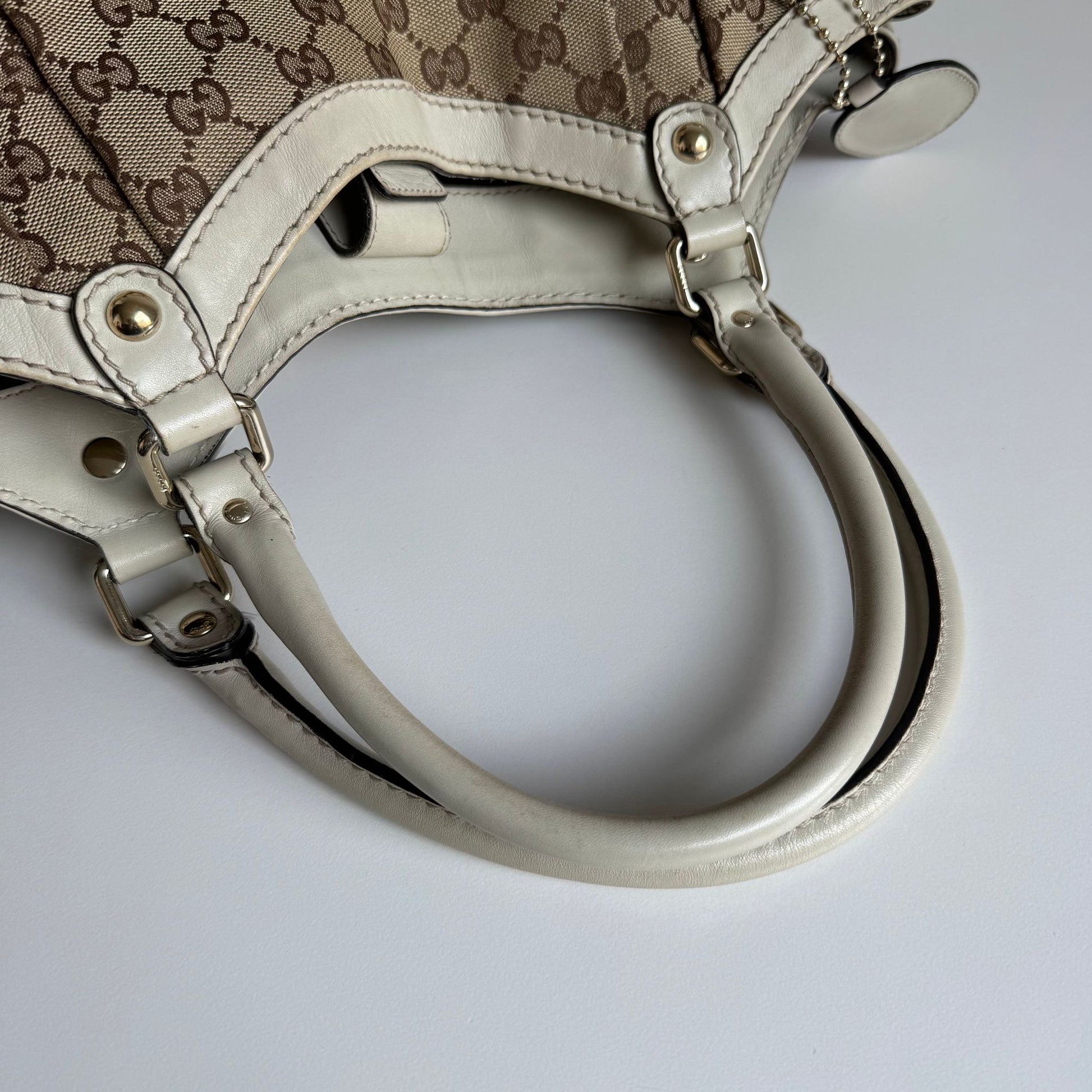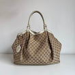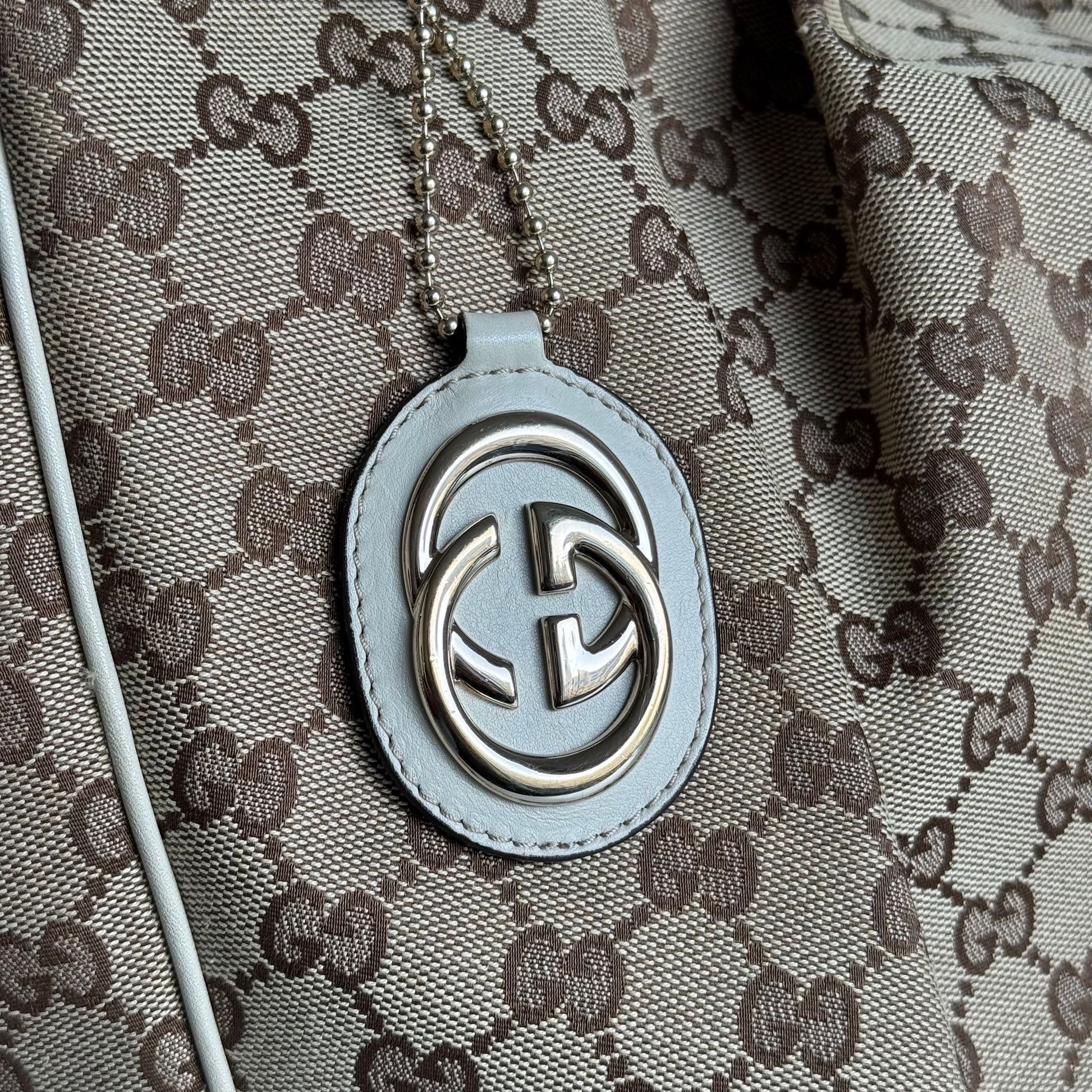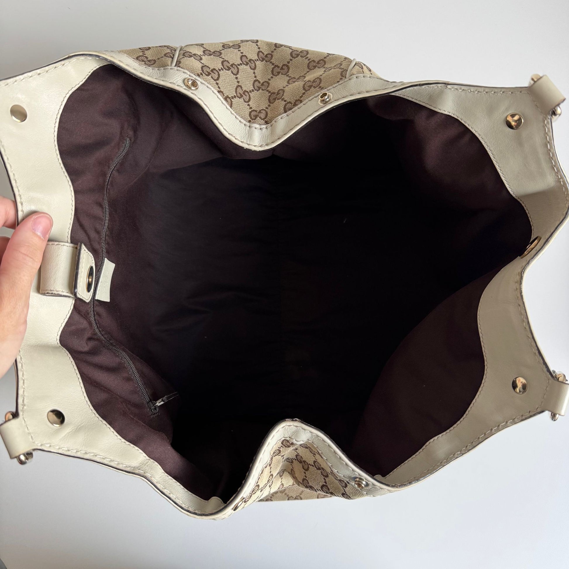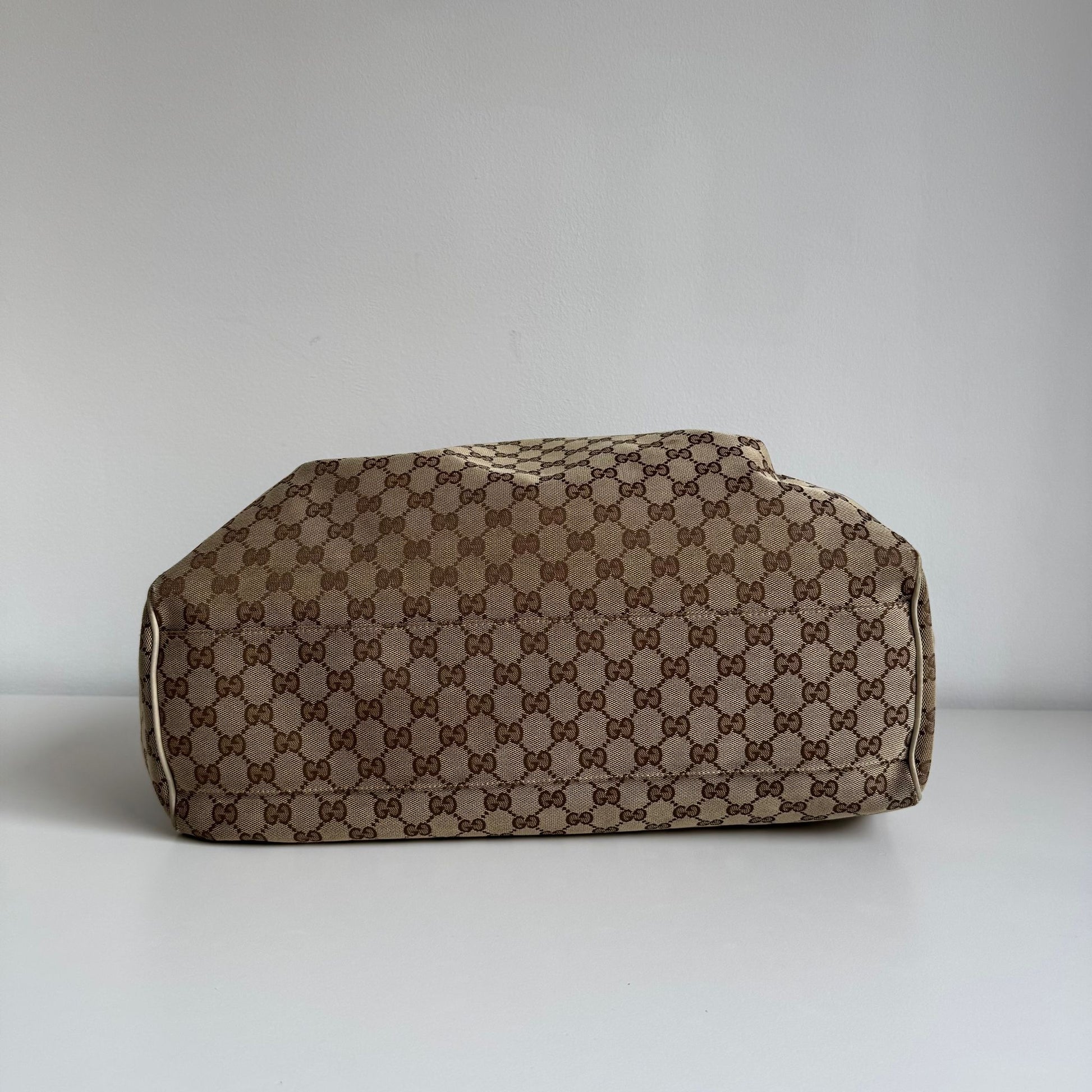 Meravigliosa maxi Shopper Gucci modello Sukey in tela monogram GG, dettagli in pelle color beige e hardware oro. Si indossa a spalla.
