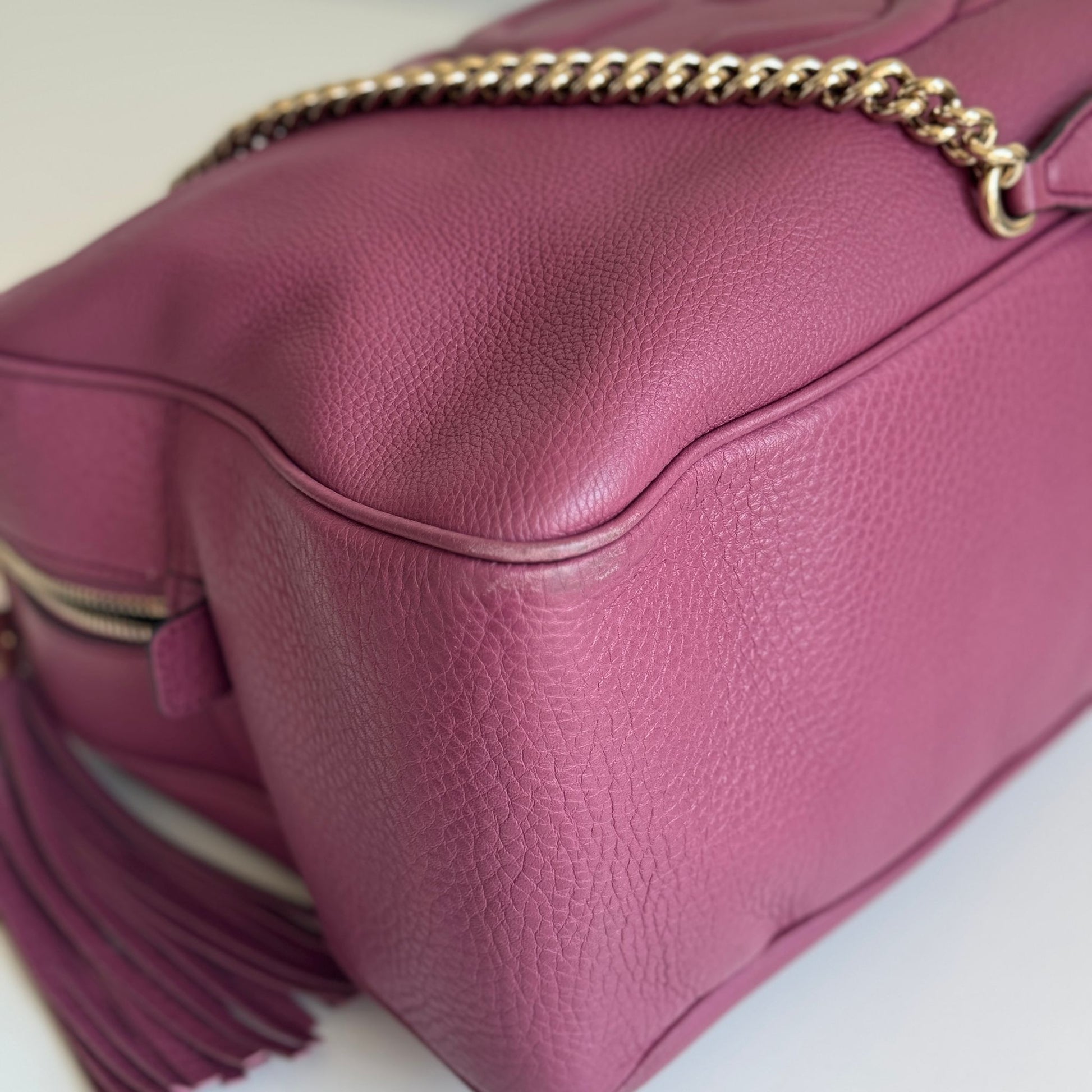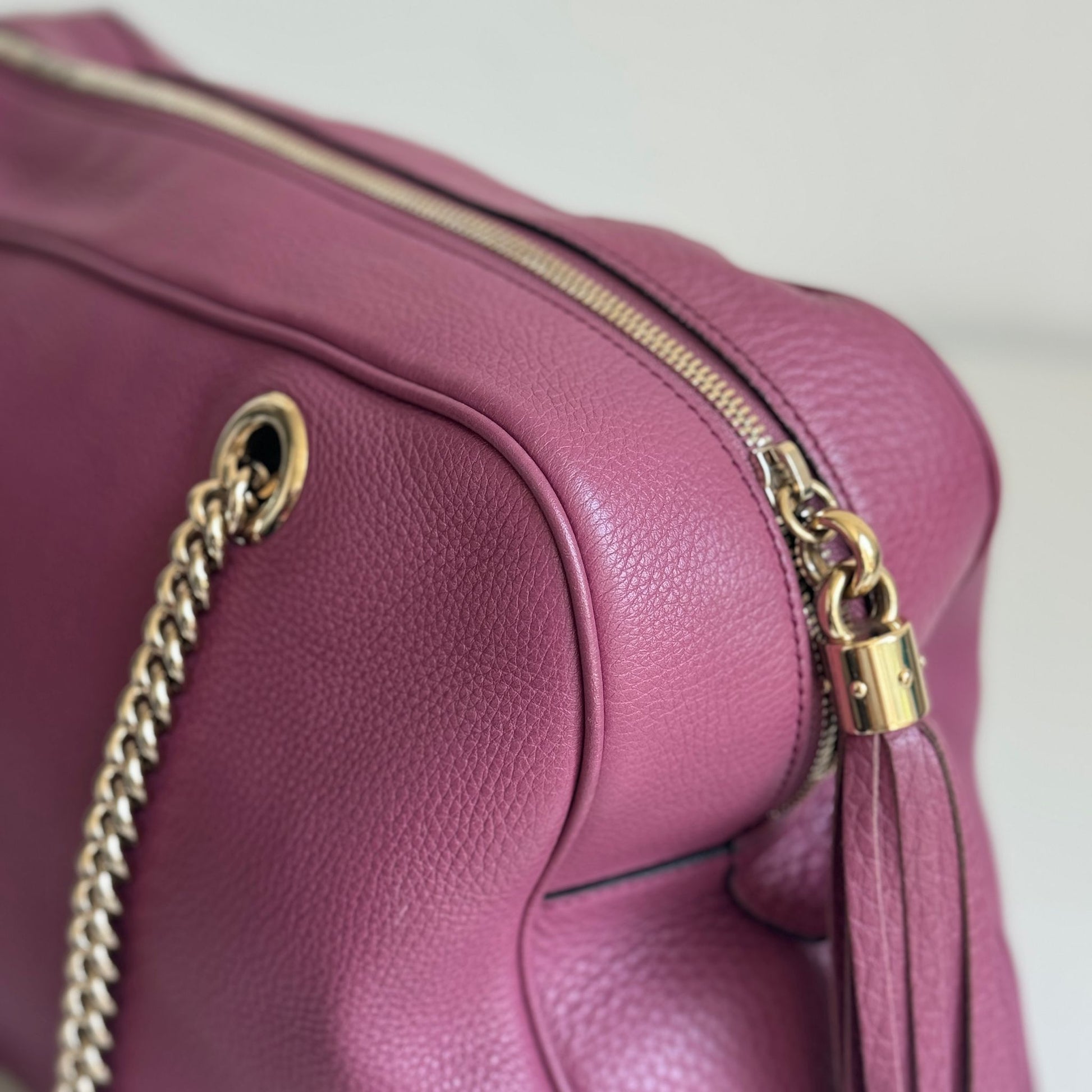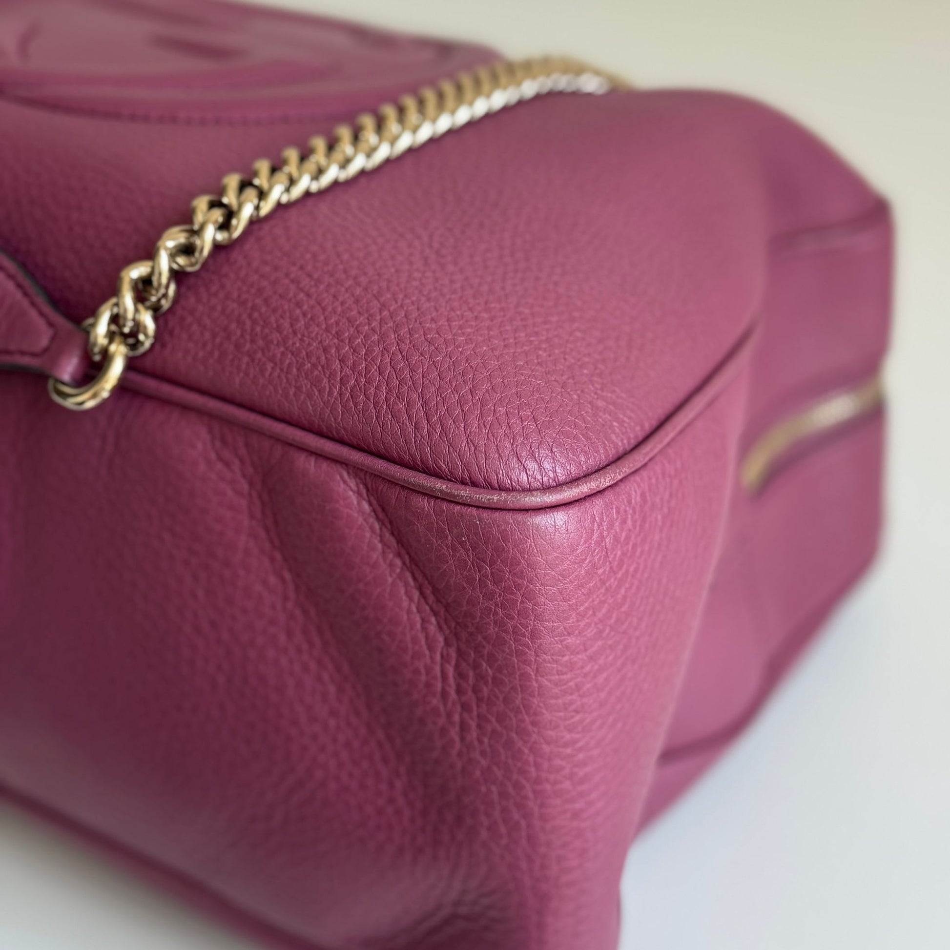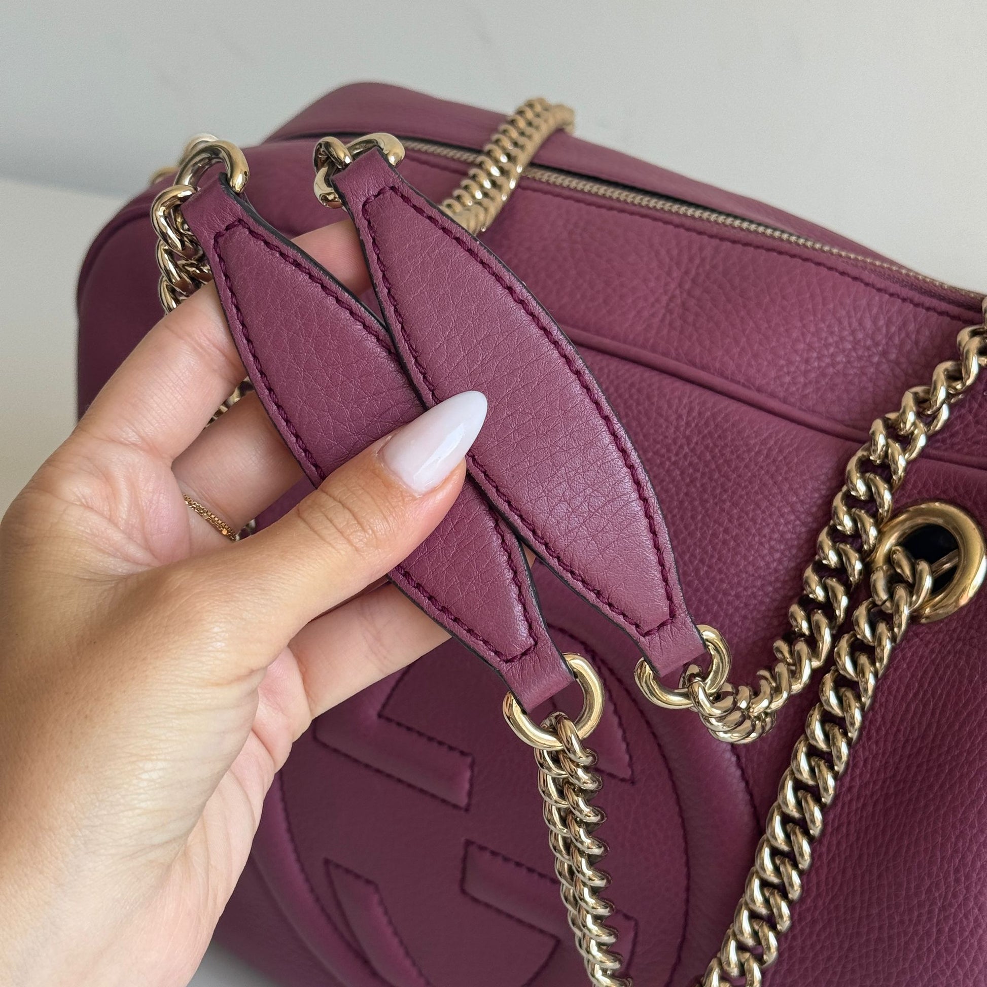 Bellissima borsa Gucci modello Soho in pelle color mAlba e hardware oro. Si indossa a spalla.