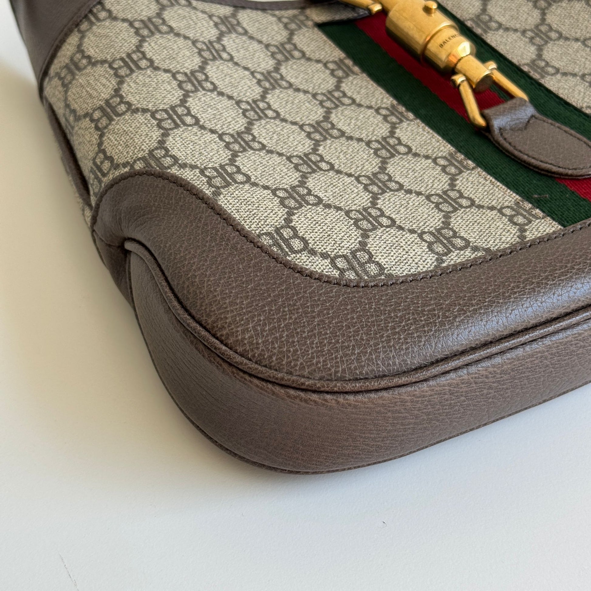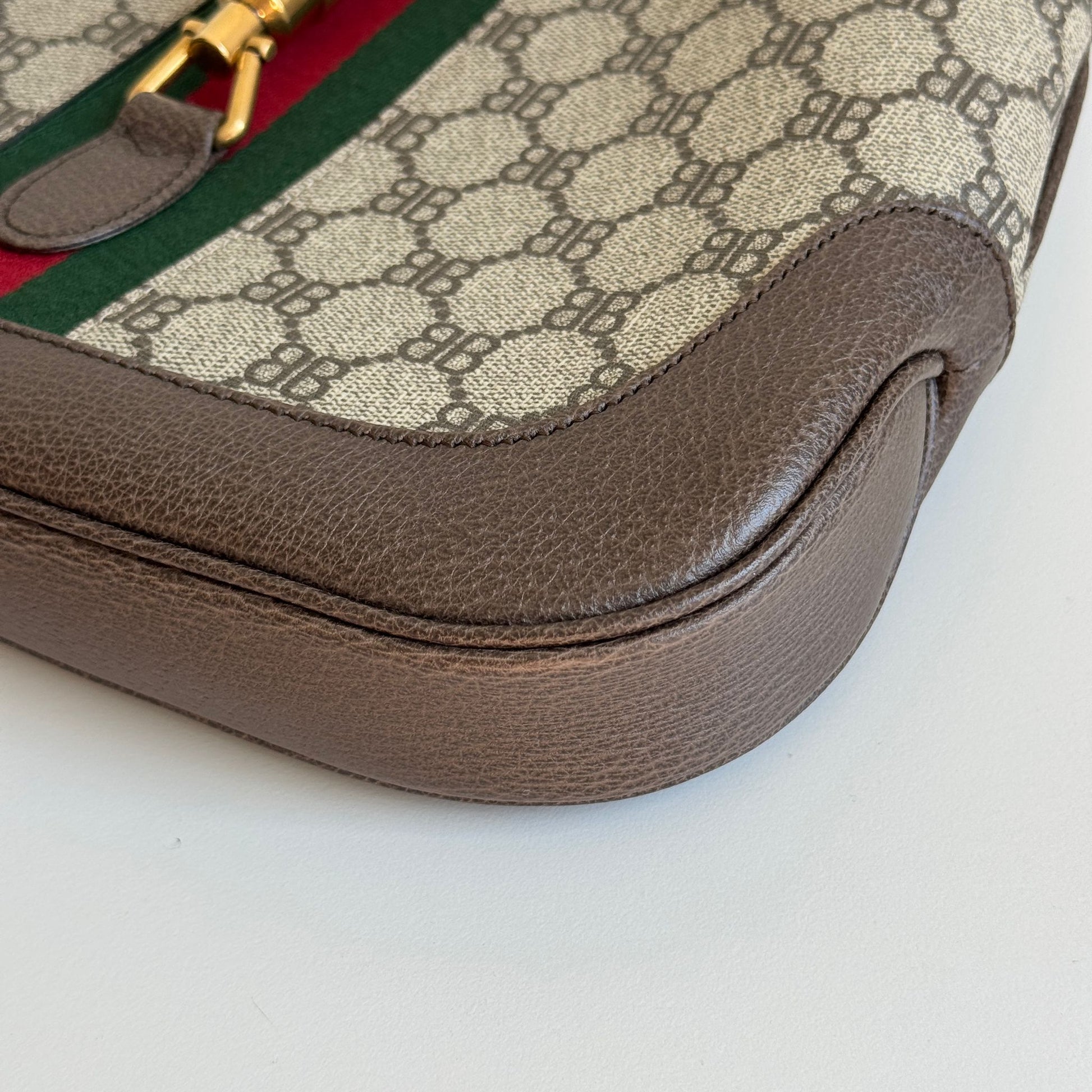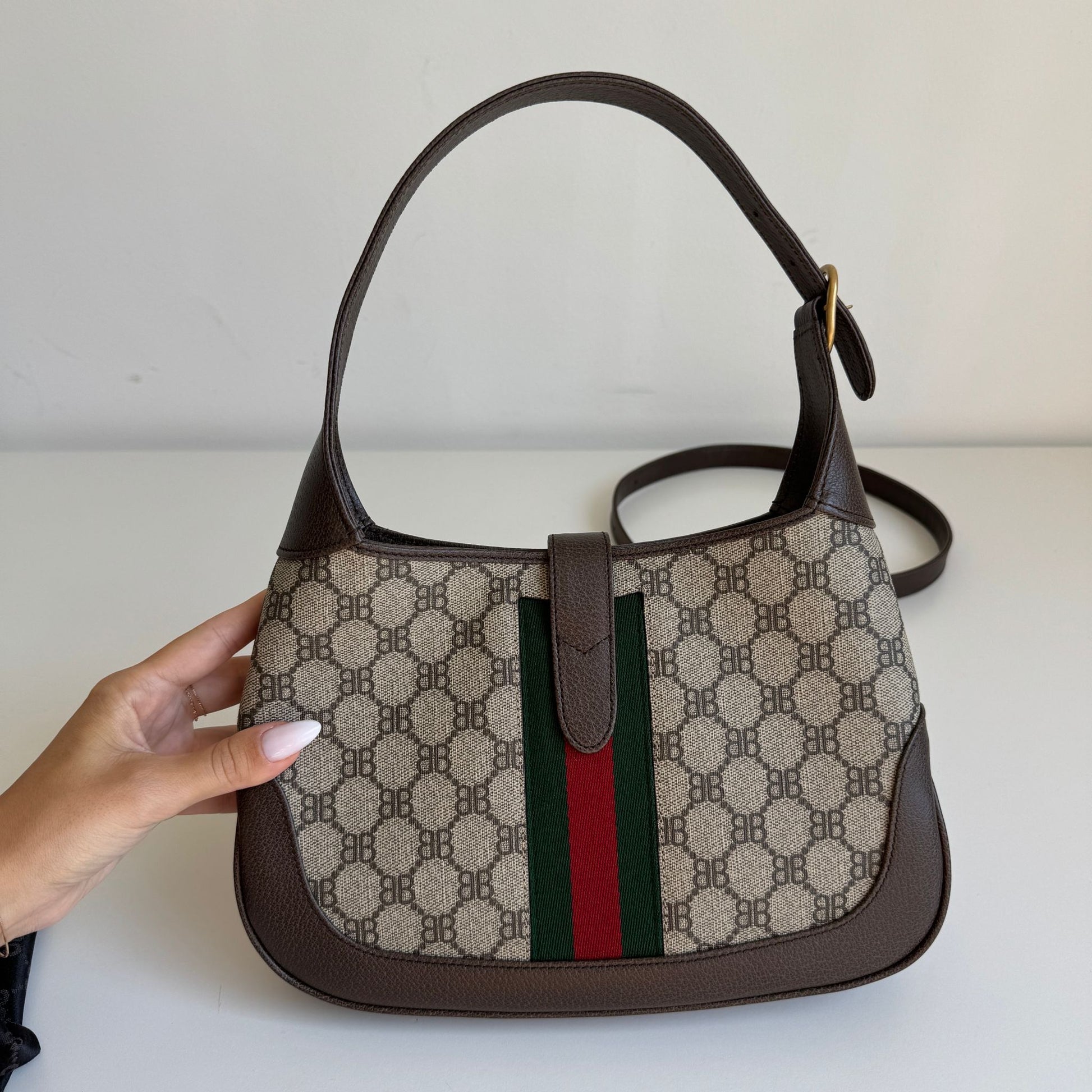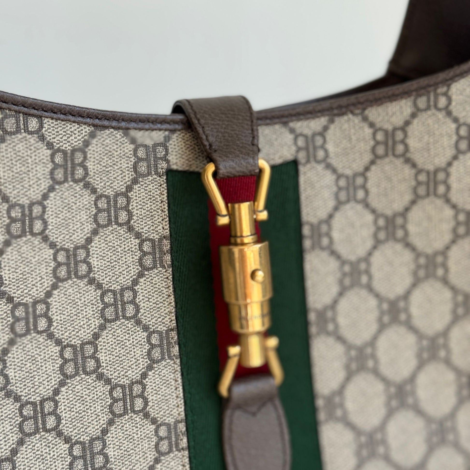 Iconica borsa Gucci in collaborazione con Balenciaga modello Jackie in tela GG Supreme e dettagli in pelle martellata marrone, con hardware oro. Si indossa a spalla e a tracolla, la tracolla rimovibile e regolabile.
