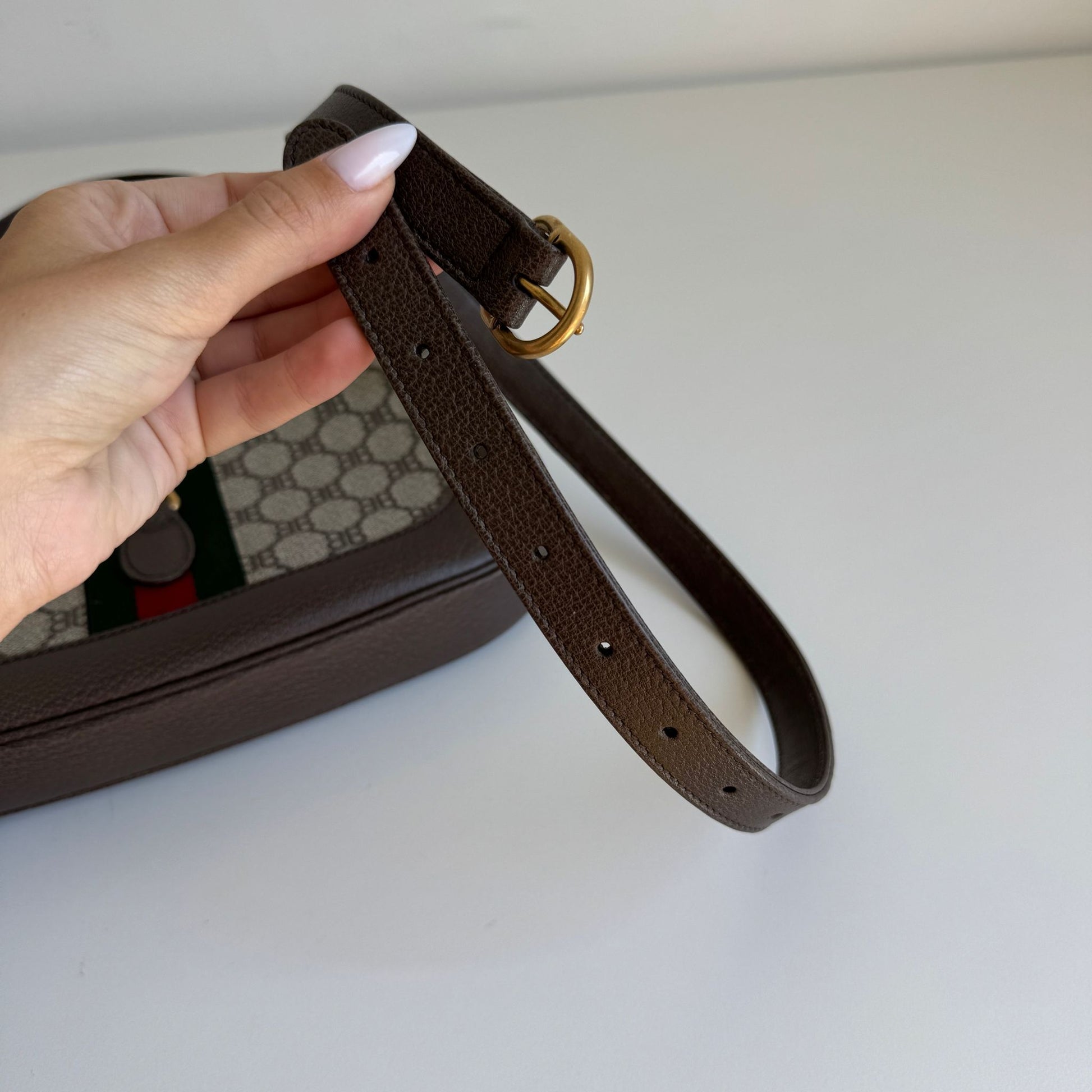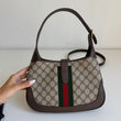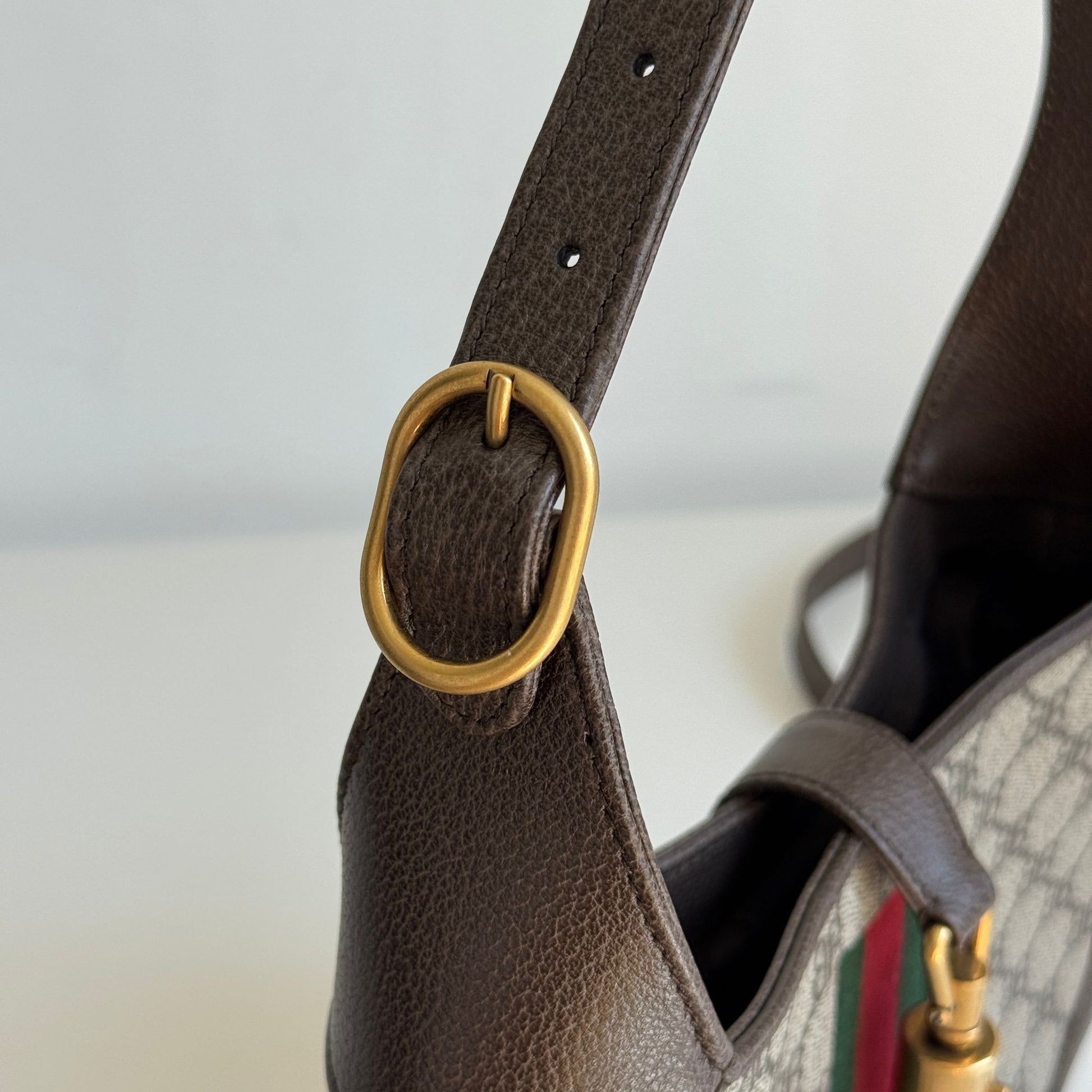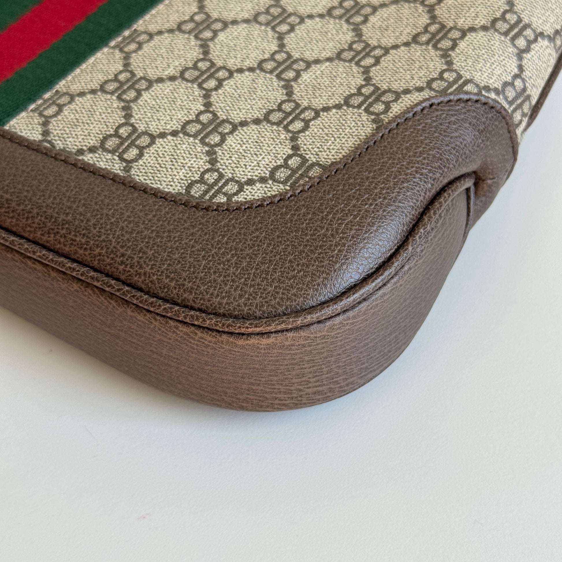 Iconica borsa Gucci in collaborazione con Balenciaga modello Jackie in tela GG Supreme e dettagli in pelle martellata marrone, con hardware oro. Si indossa a spalla e a tracolla, la tracolla rimovibile e regolabile.