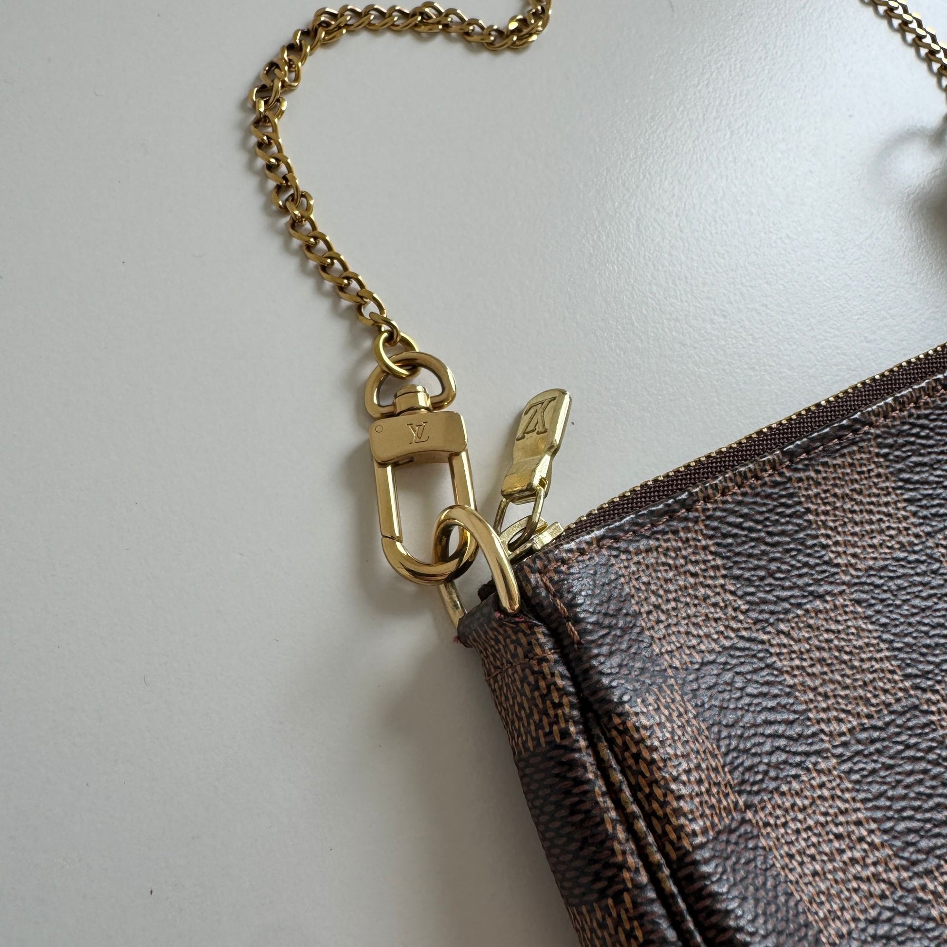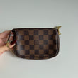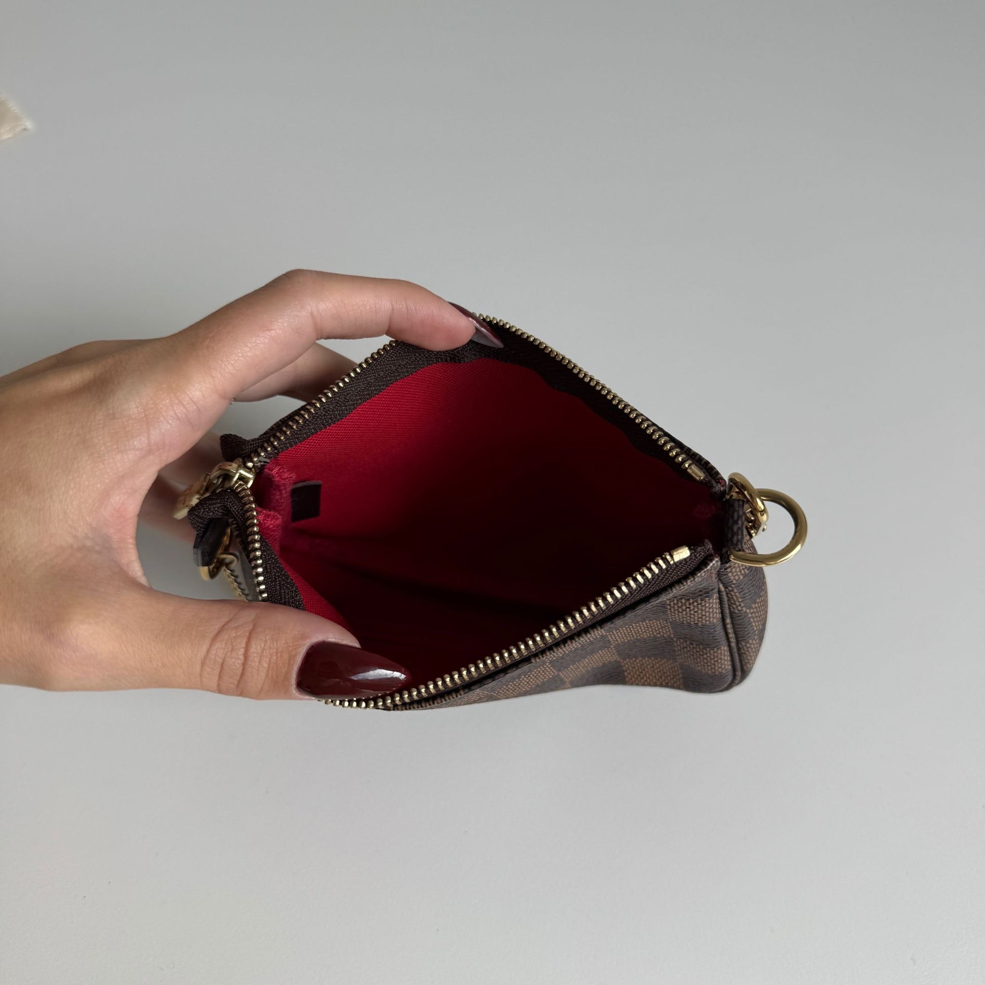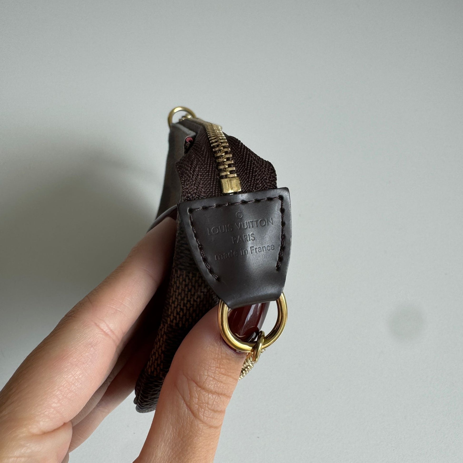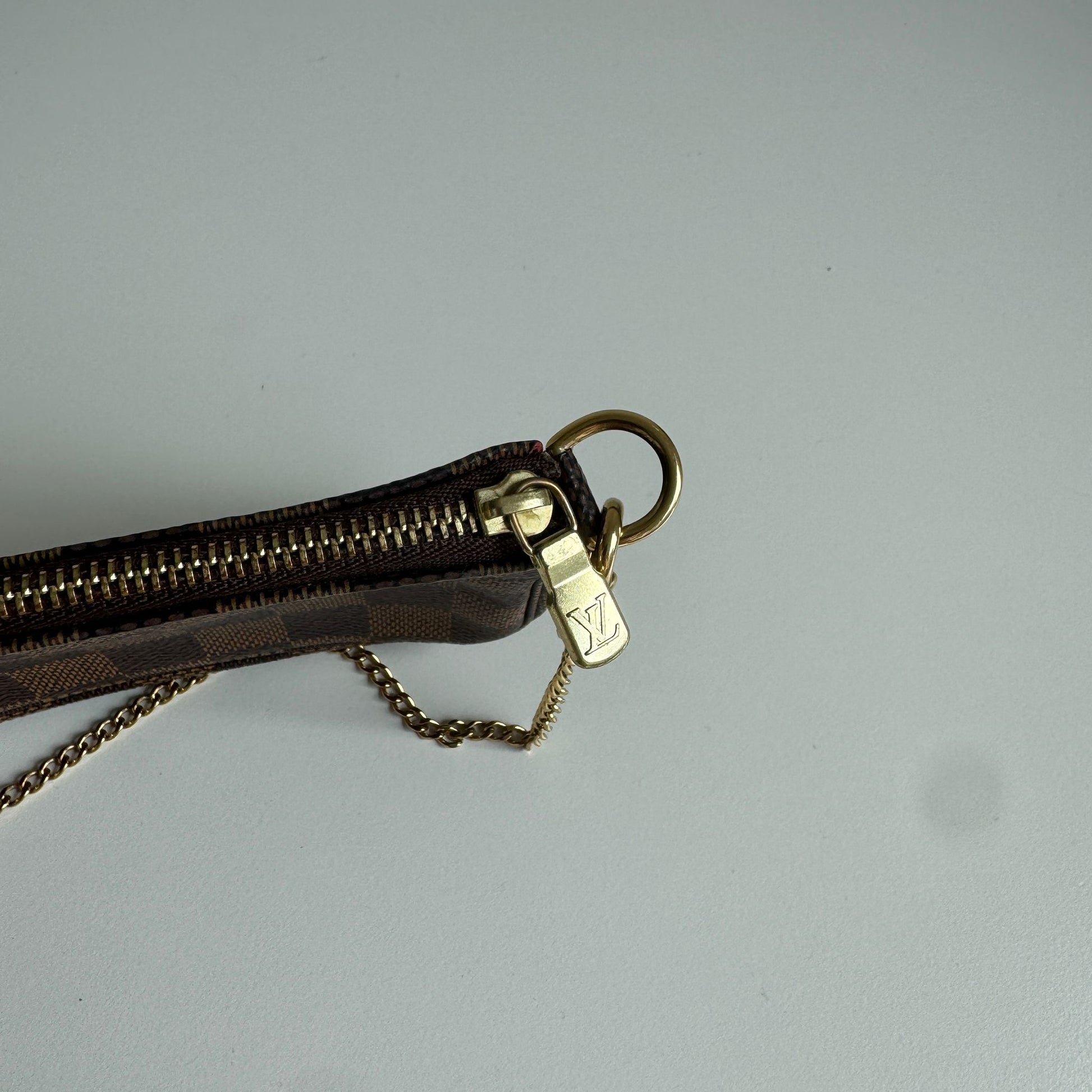 Iconica borsa Louis Vuitton modello Mini Accessories in stampa Damier Ebèn, con hardware oro. Si indossa a mano.