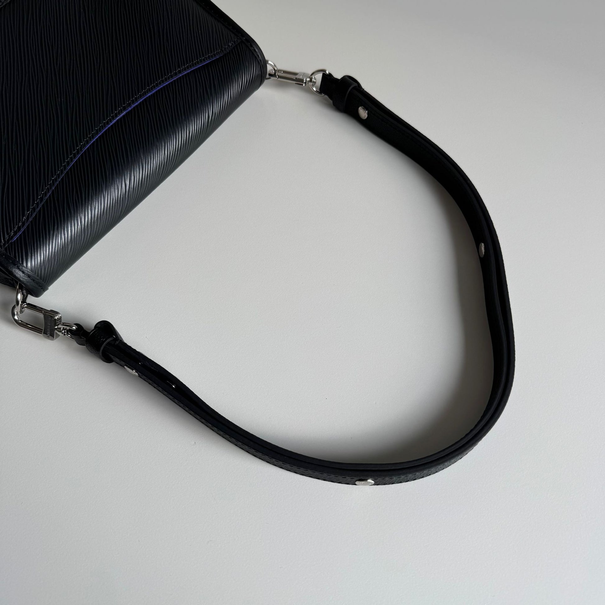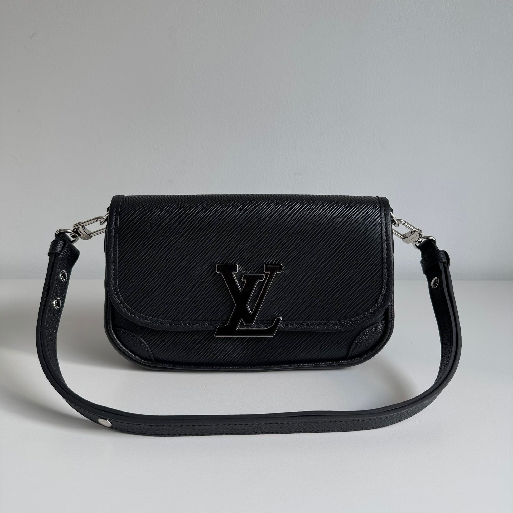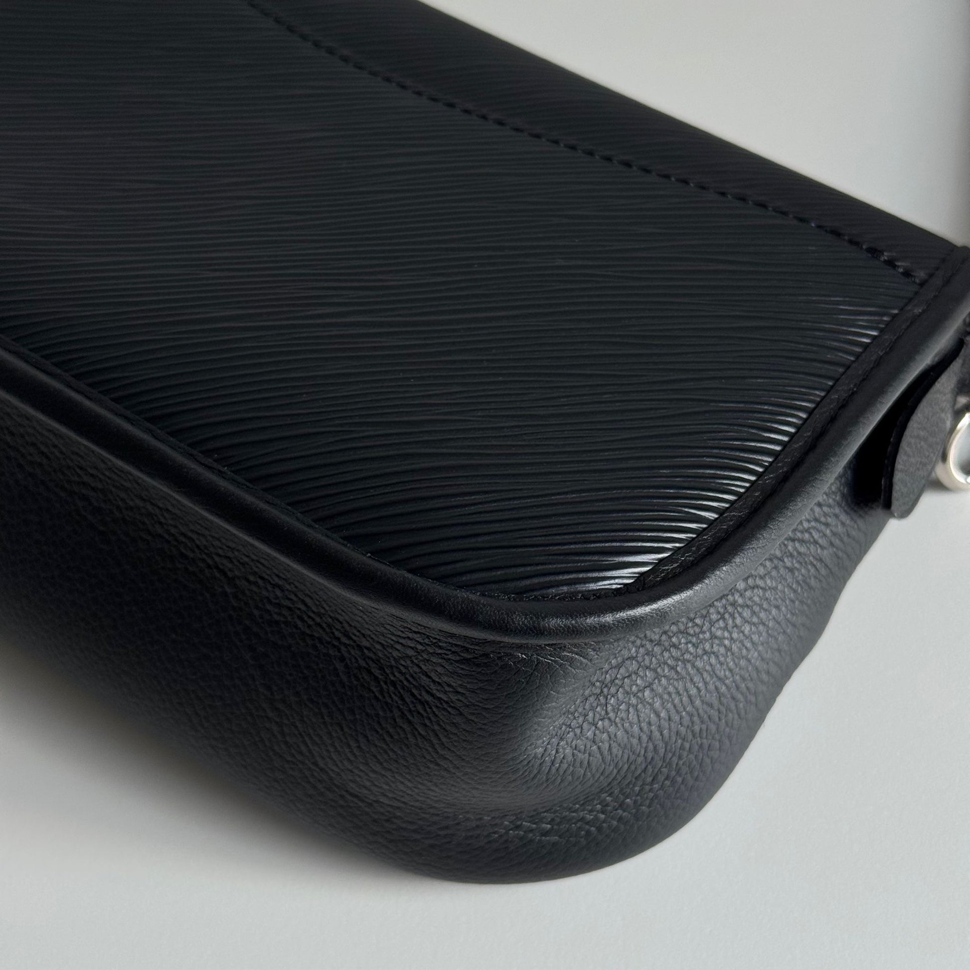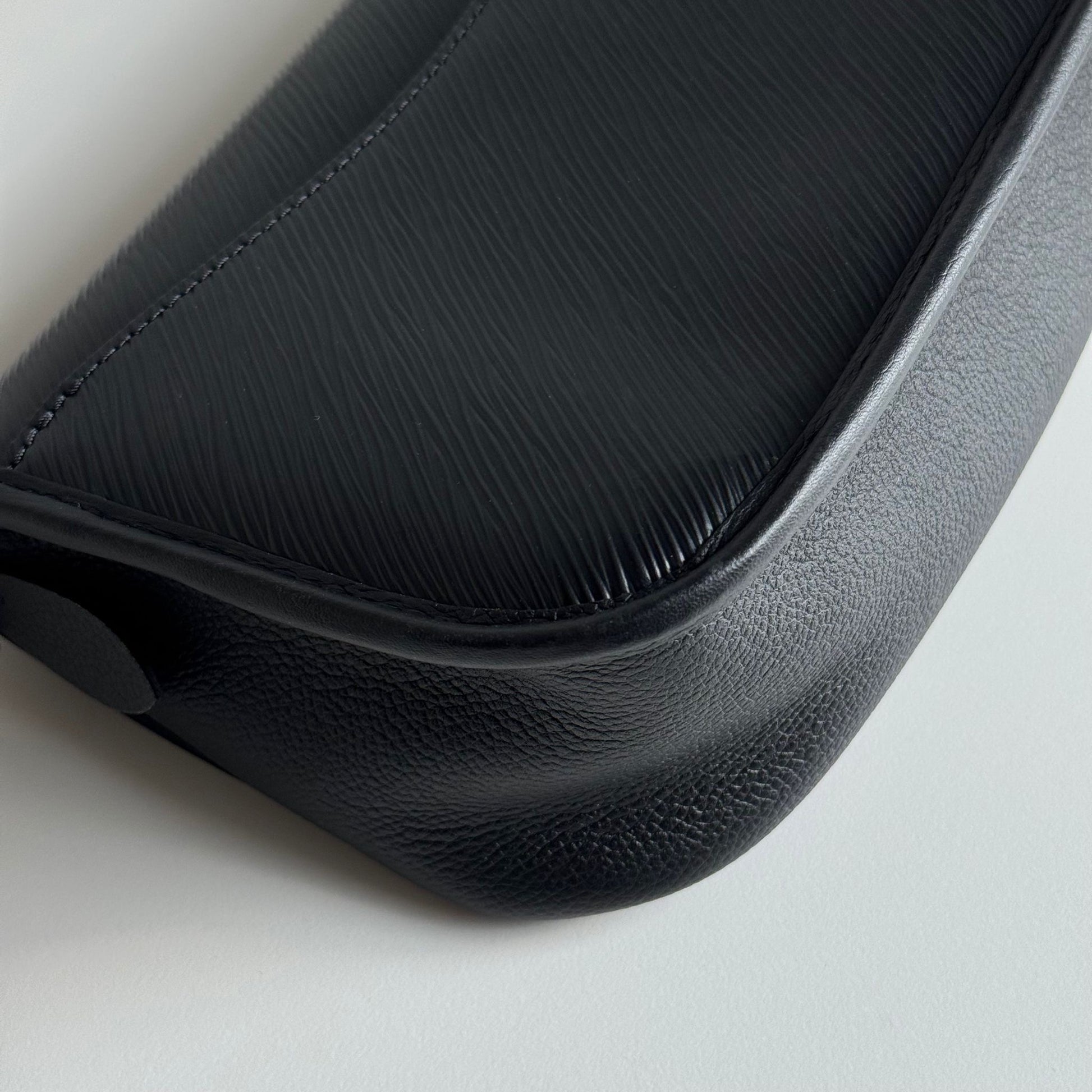 Meravigliosa borsa Louis Vuitton modello Buci in pelle Epi nera con hardware argento e logo smaltato nero. Si indossa a spalla e a tracolla, la tracolla è rimovibile e regolabile.