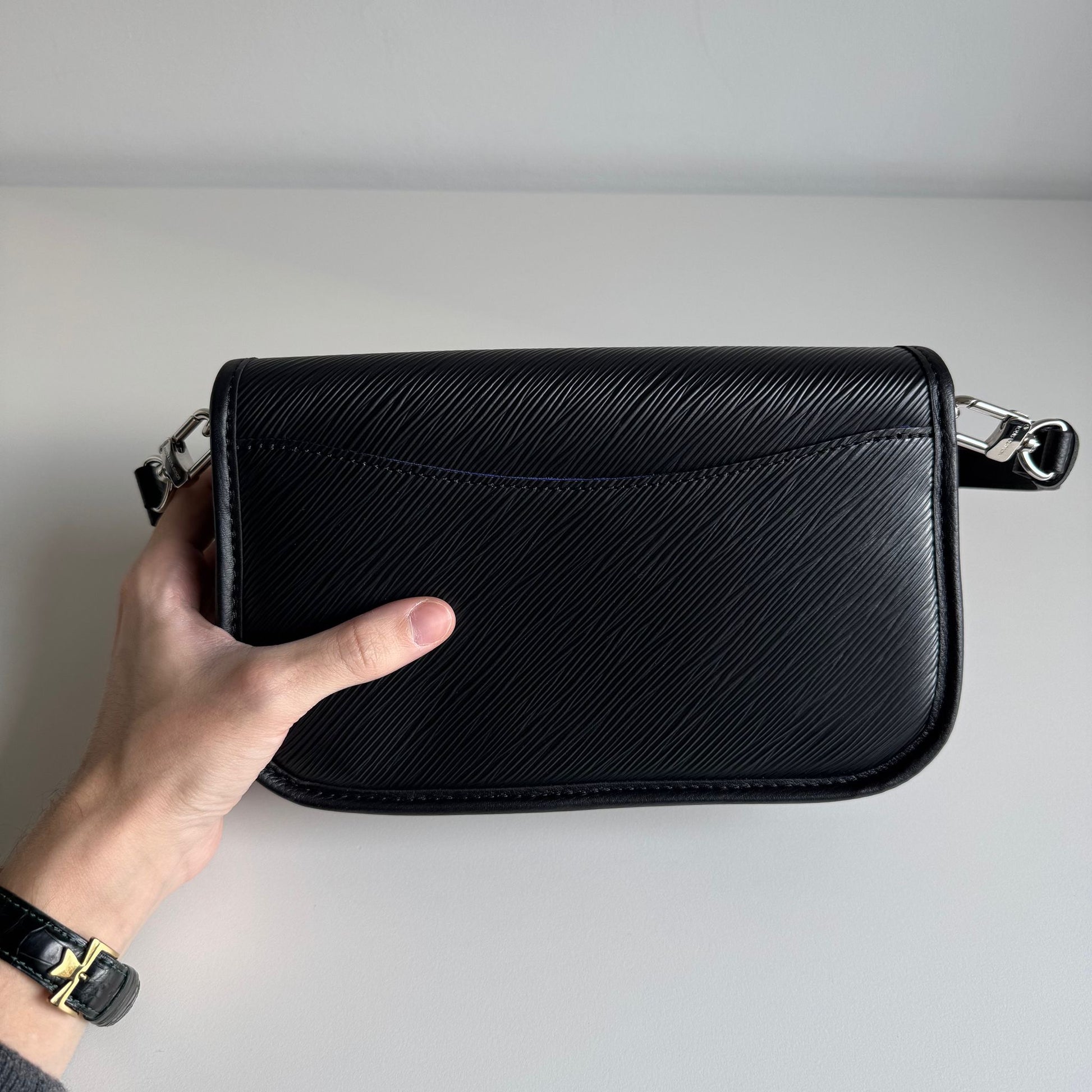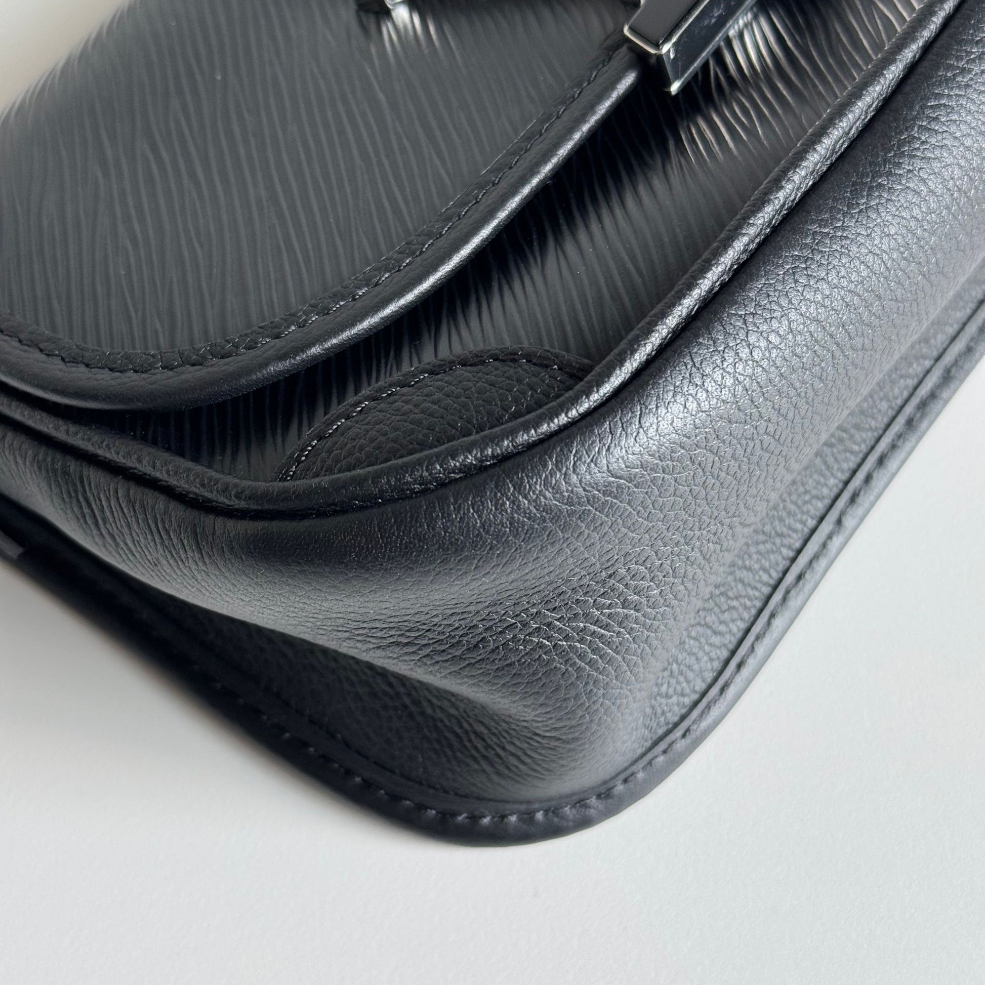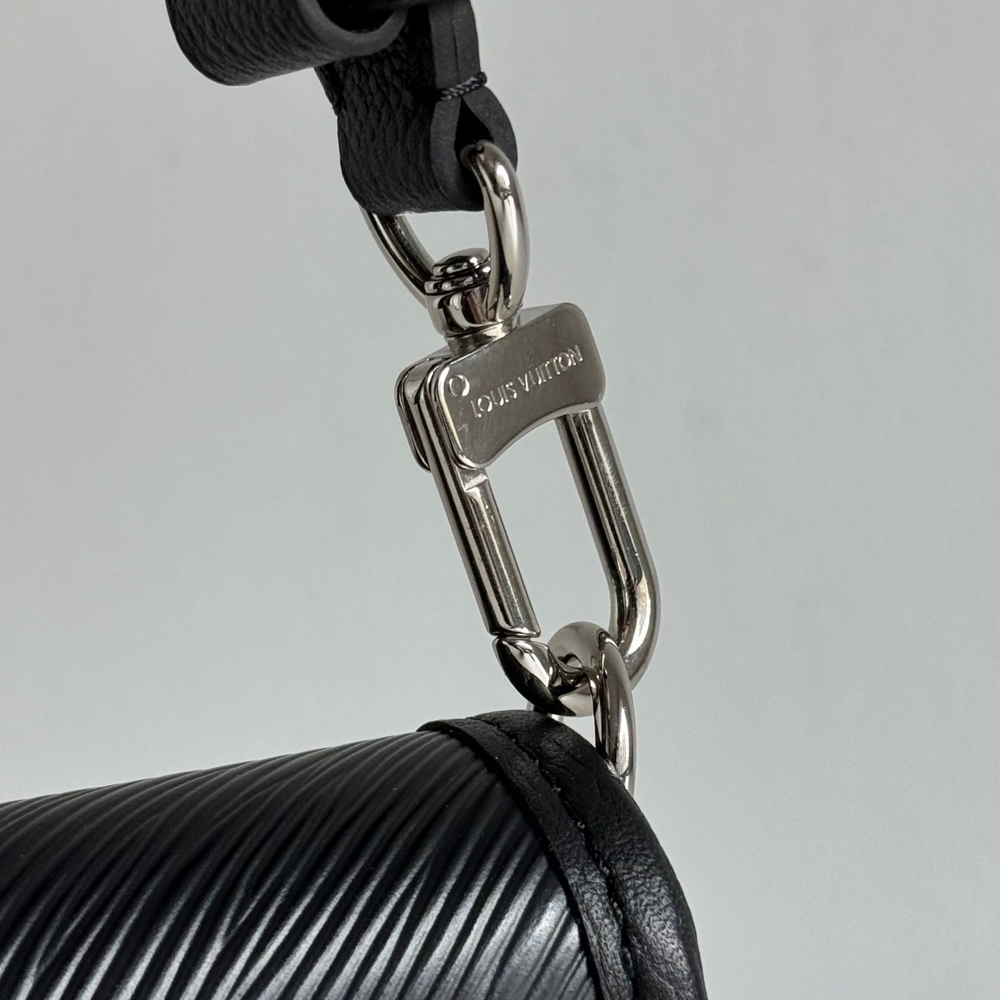 Meravigliosa borsa Louis Vuitton modello Buci in pelle Epi nera con hardware argento e logo smaltato nero. Si indossa a spalla e a tracolla, la tracolla è rimovibile e regolabile.
