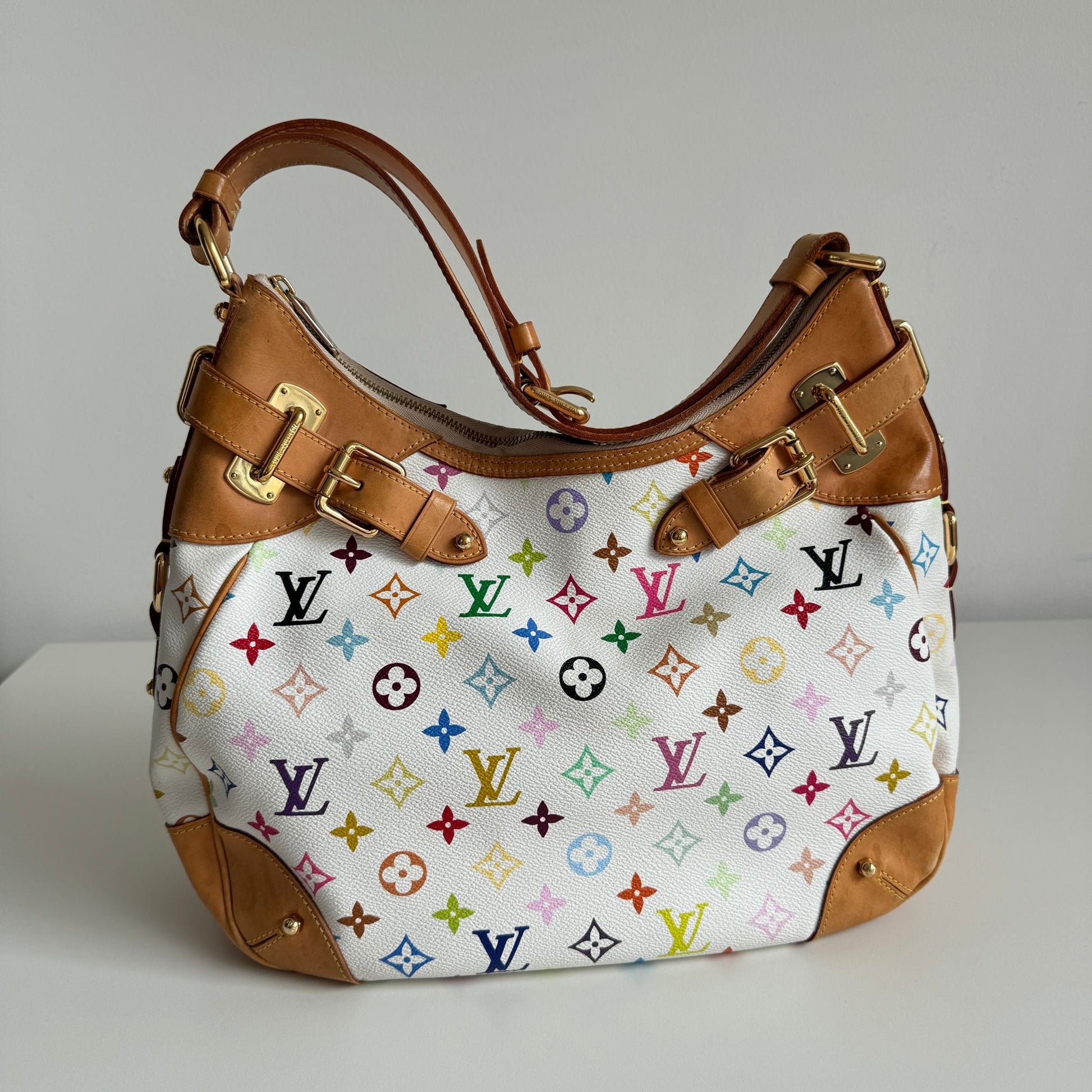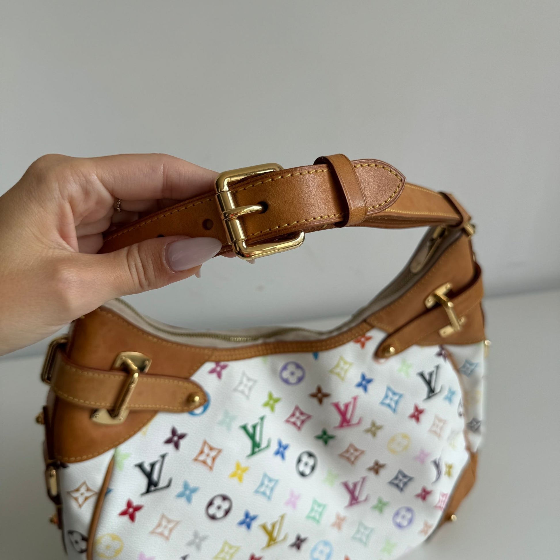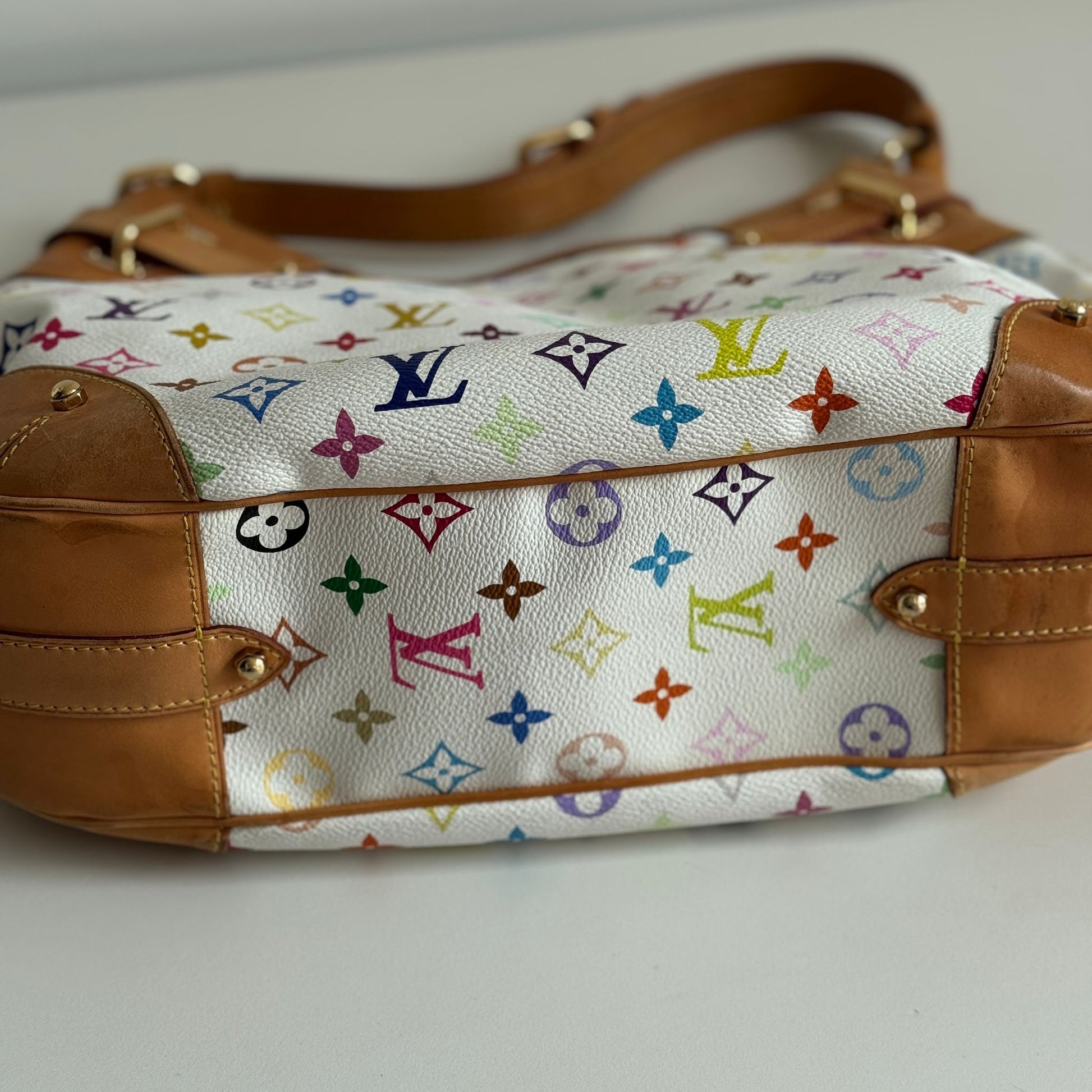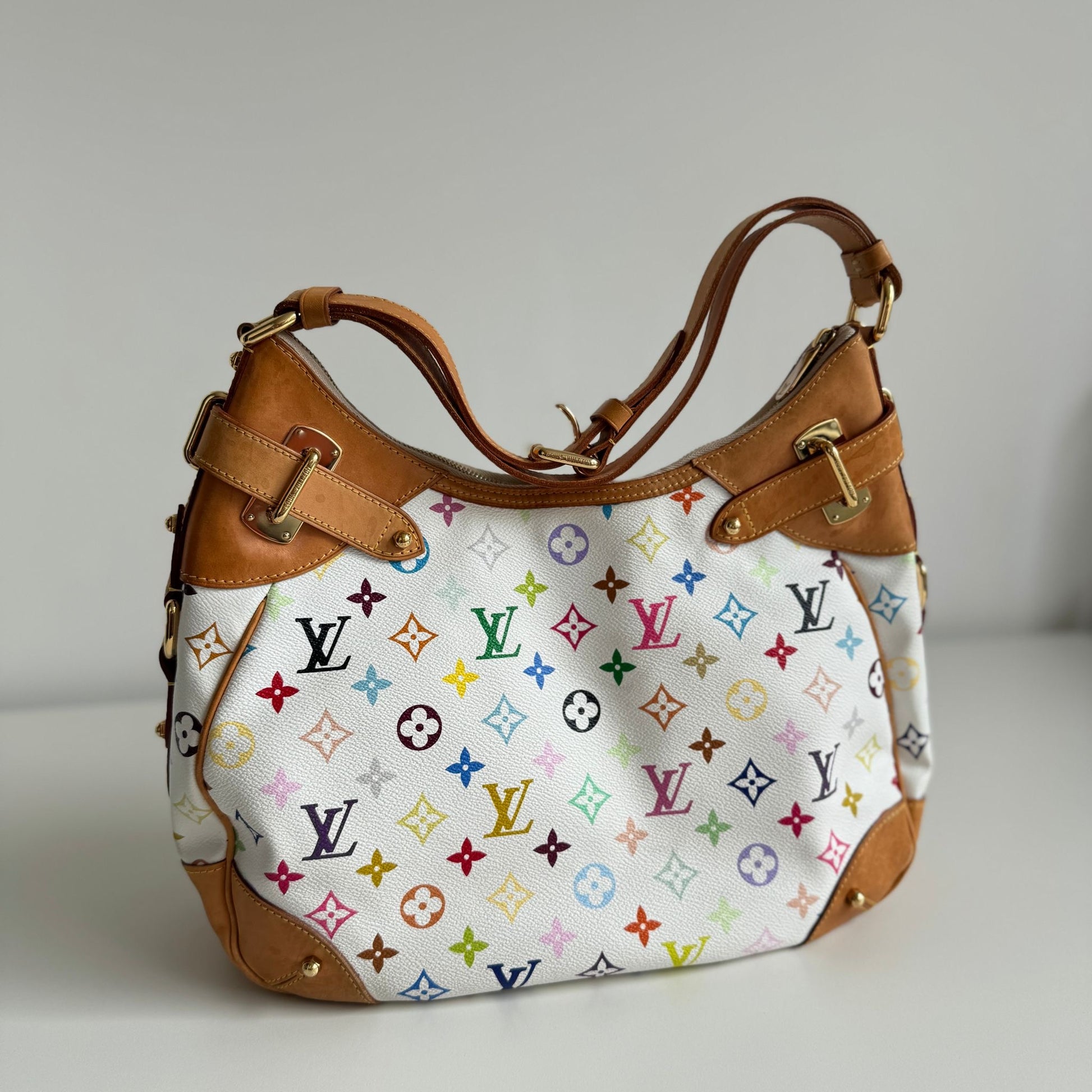 Bellissima borsa Louis Vuitton modello Greta dell’iconica collezione del 2003 con Takashi Murakami in tela monogram bianca e multicolor, dettagli in vacchetta e hardware oro. Si indossa a spalla e la tracolla è regolabile.