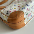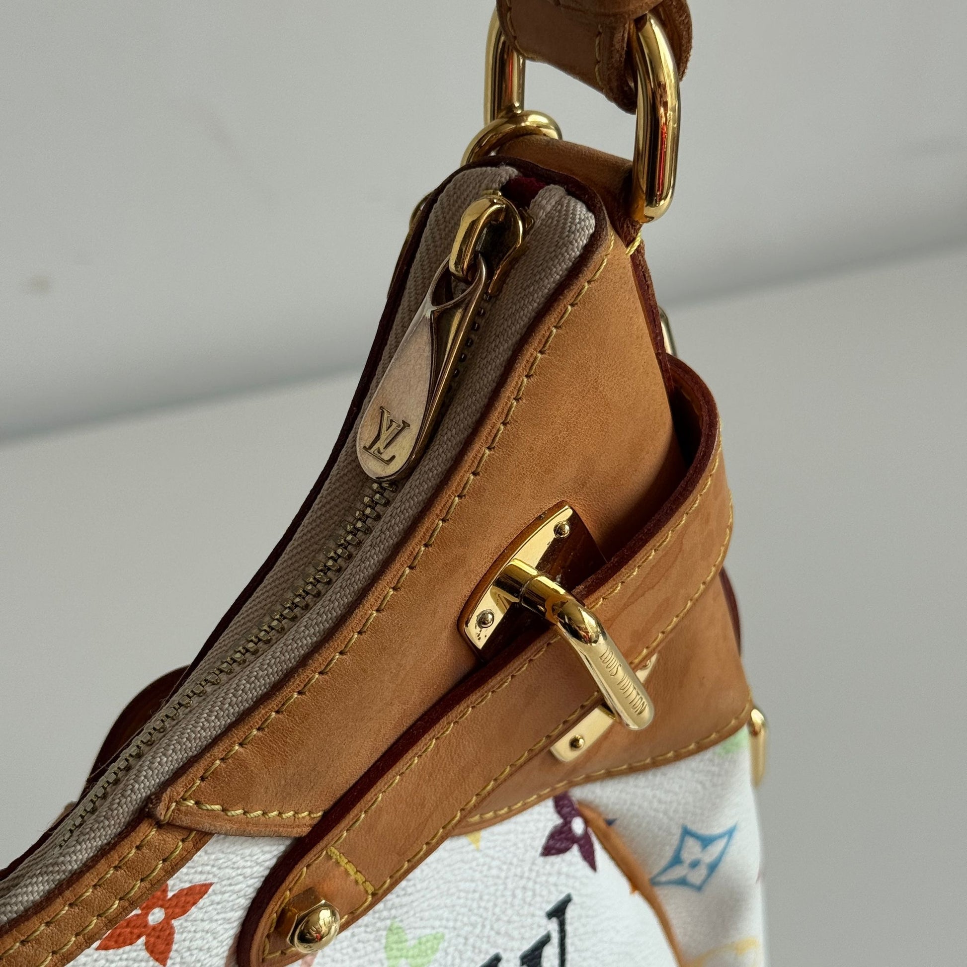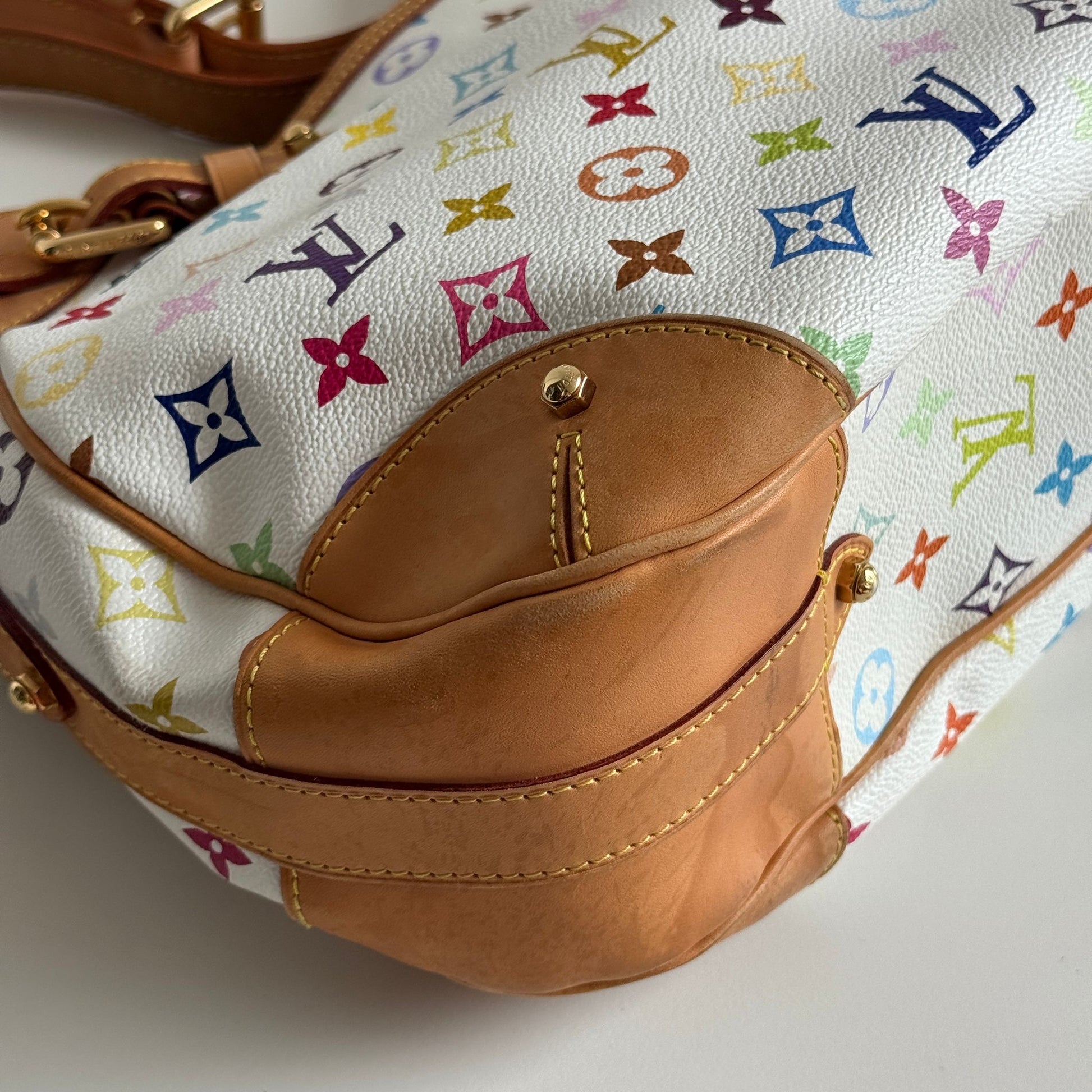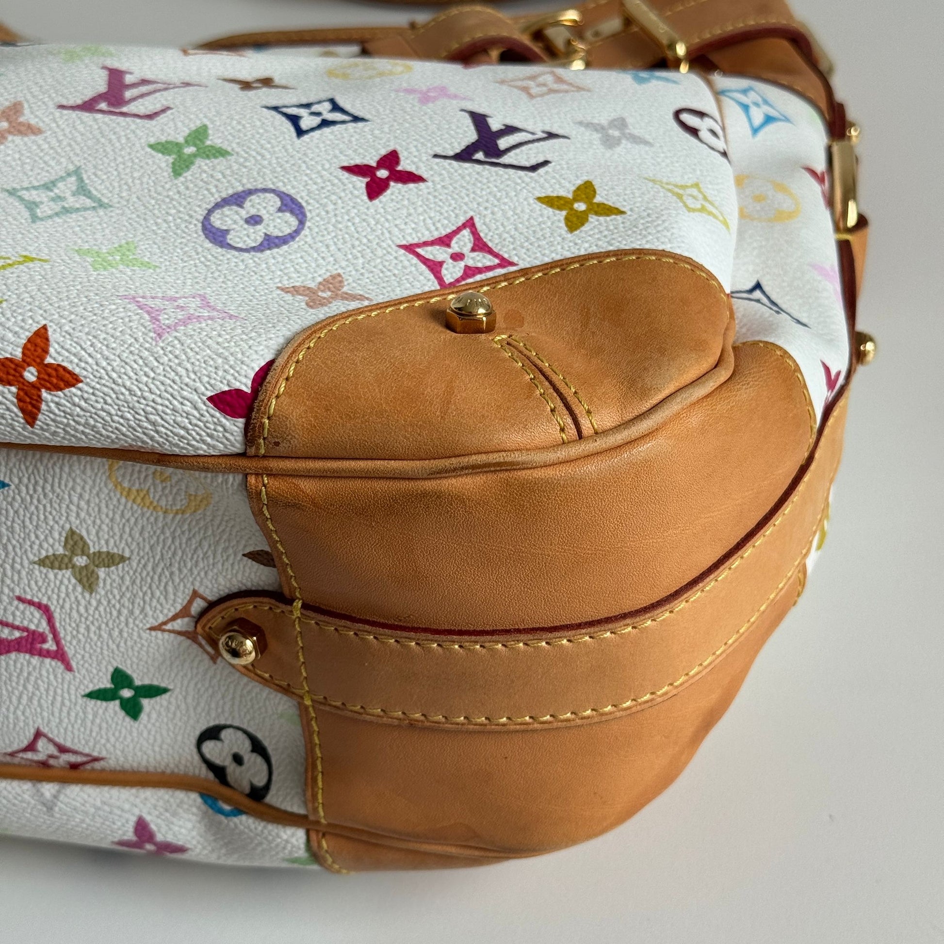 Bellissima borsa Louis Vuitton modello Greta dell’iconica collezione del 2003 con Takashi Murakami in tela monogram bianca e multicolor, dettagli in vacchetta e hardware oro. Si indossa a spalla e la tracolla è regolabile.
