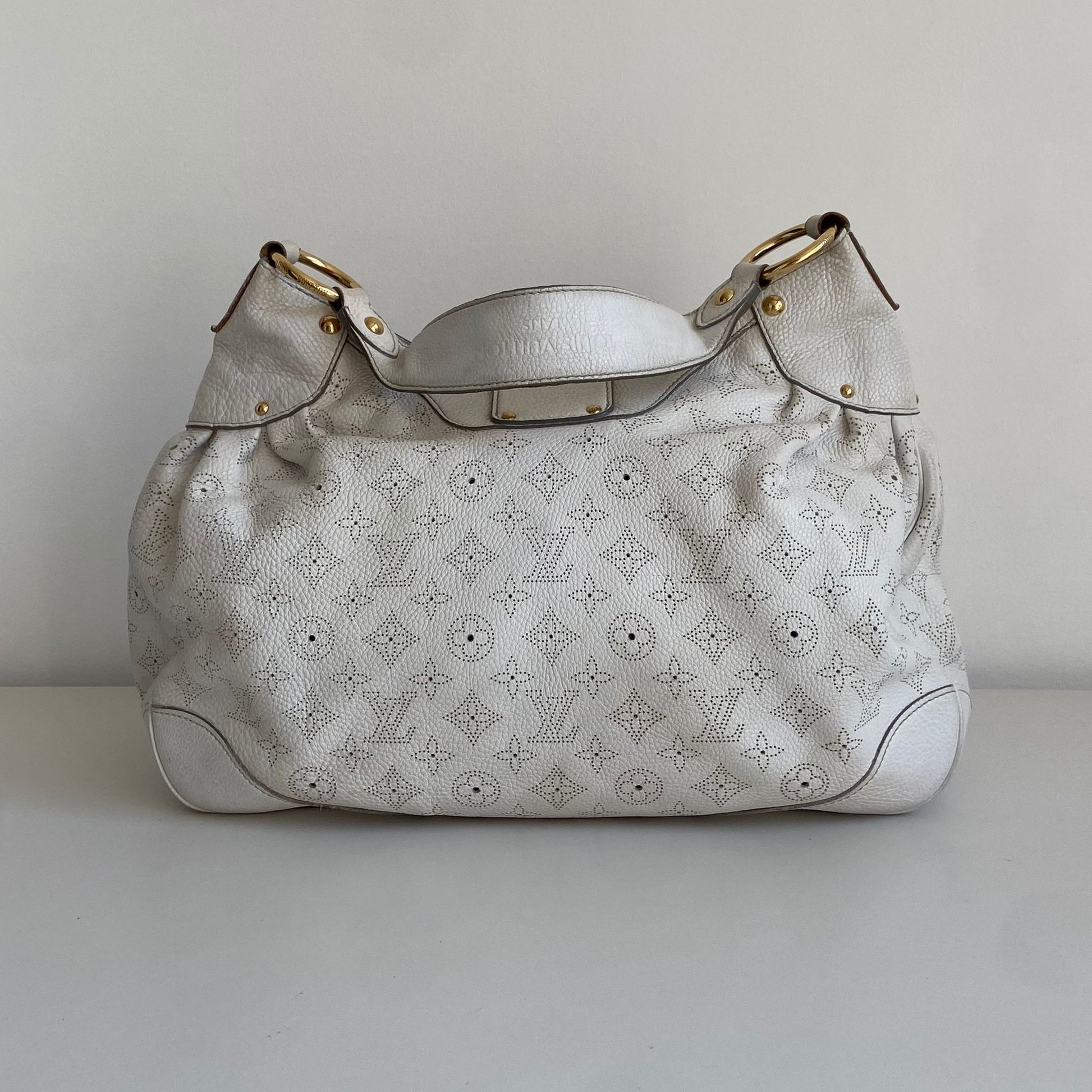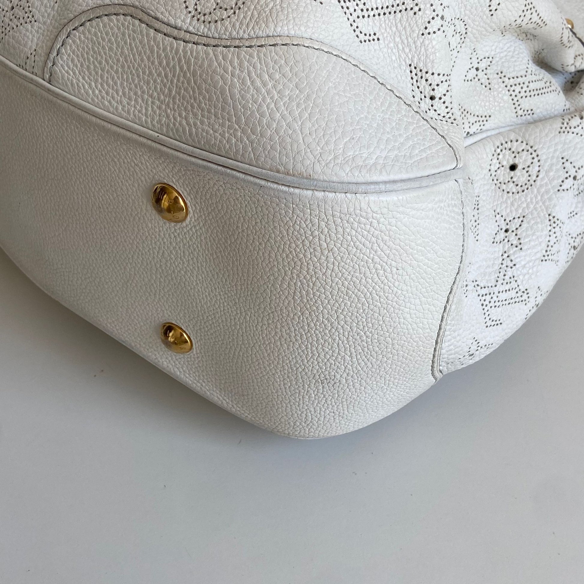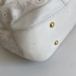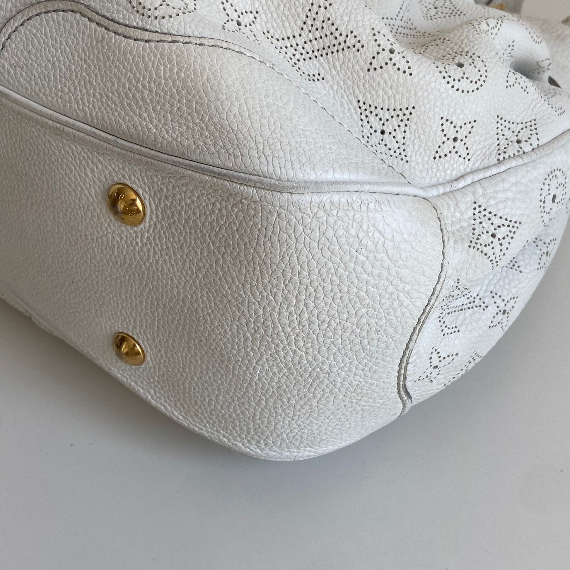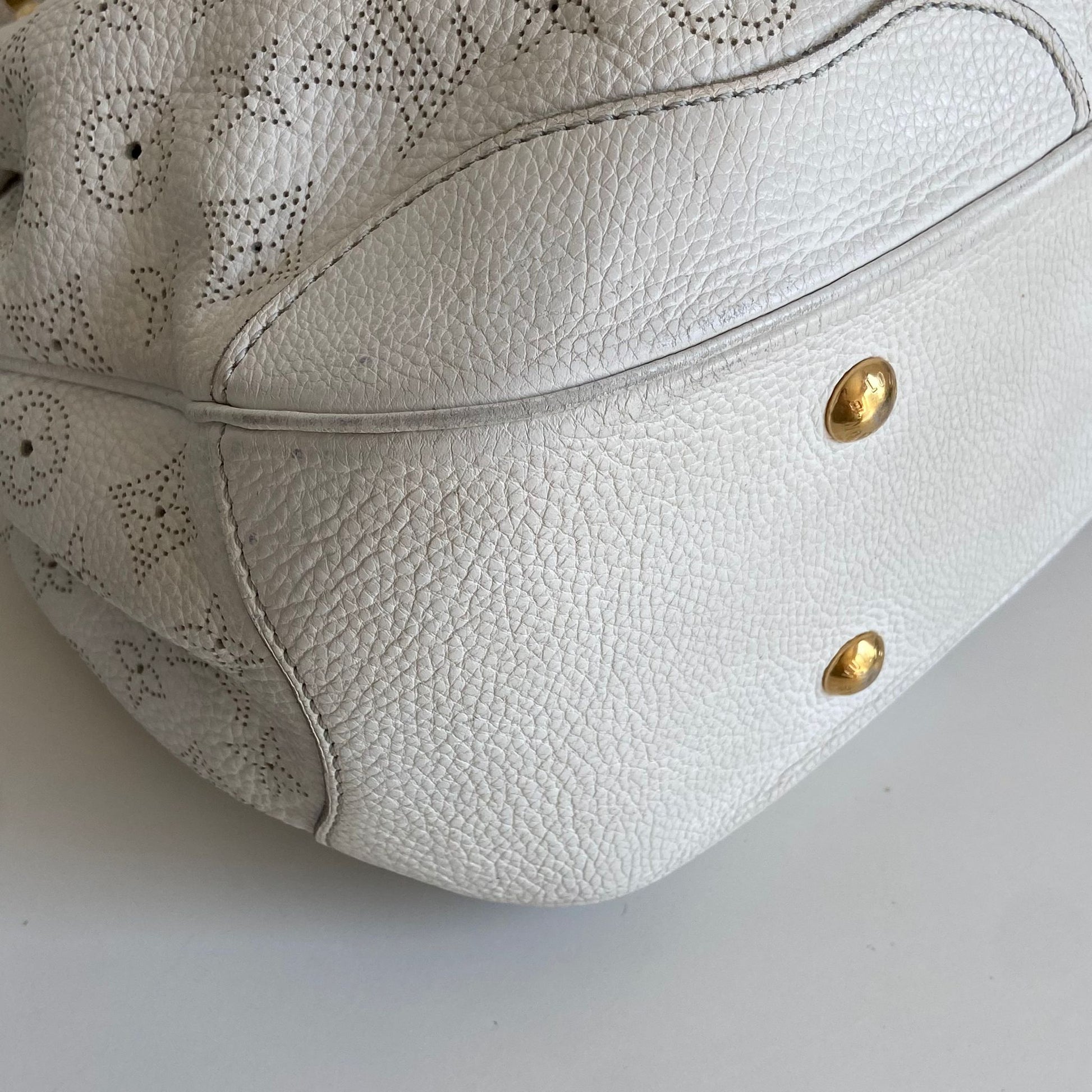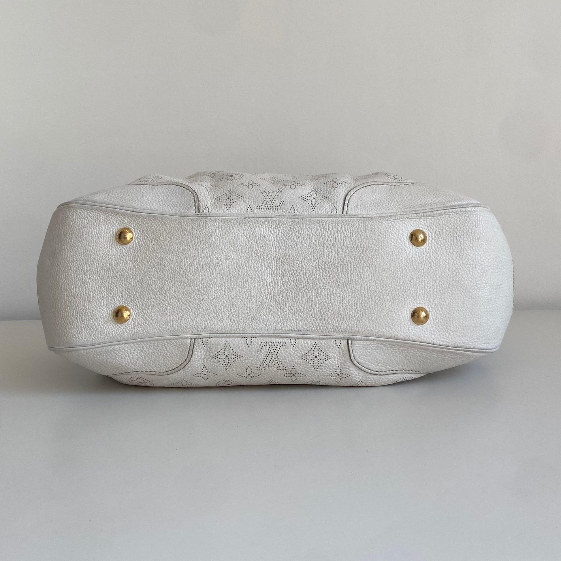 Meravigliosa borsa Louis Vuitton modello Mahina Solar GM in pelle bianca martellata con monogram LV impunturato e hardware oro. Si indossa a spalla.