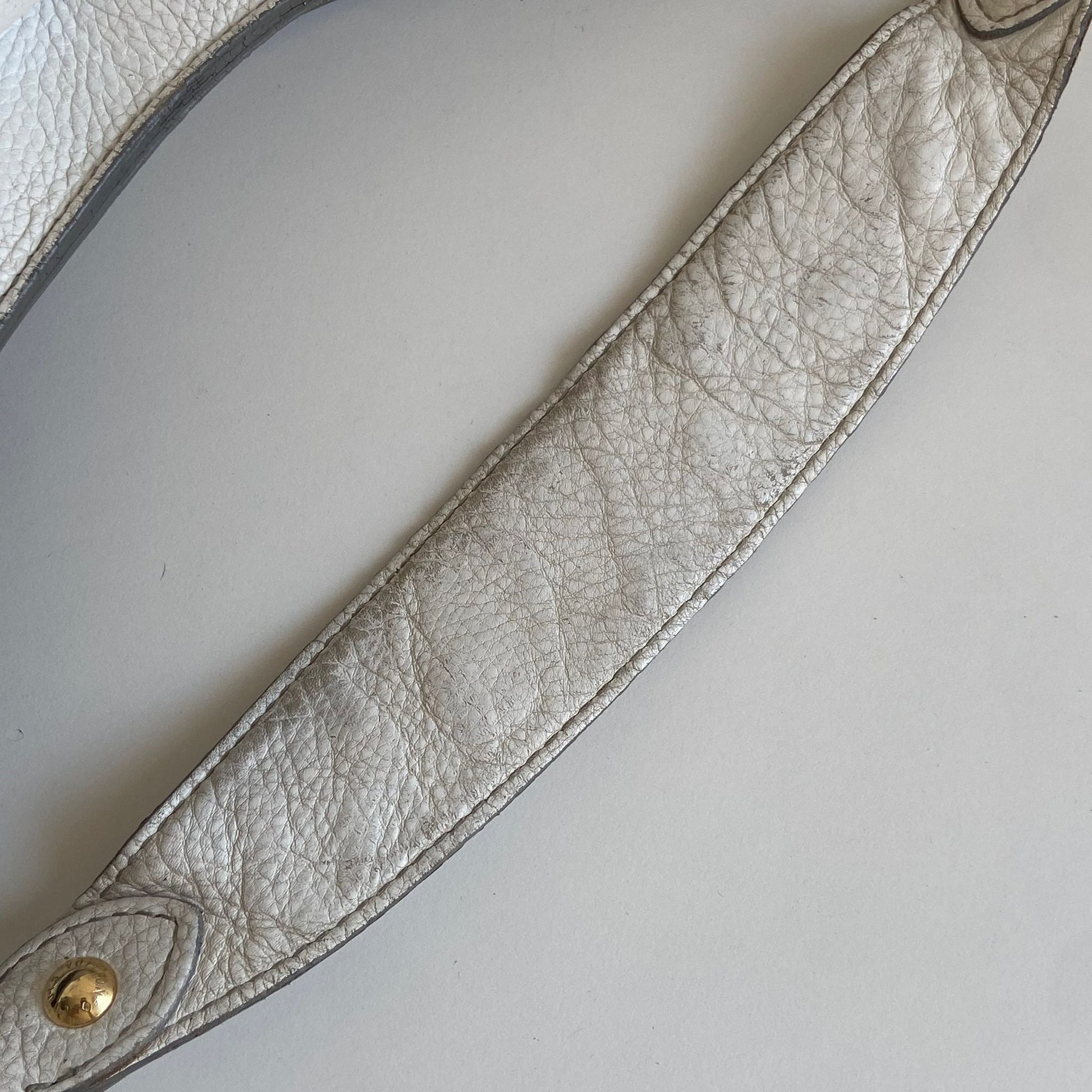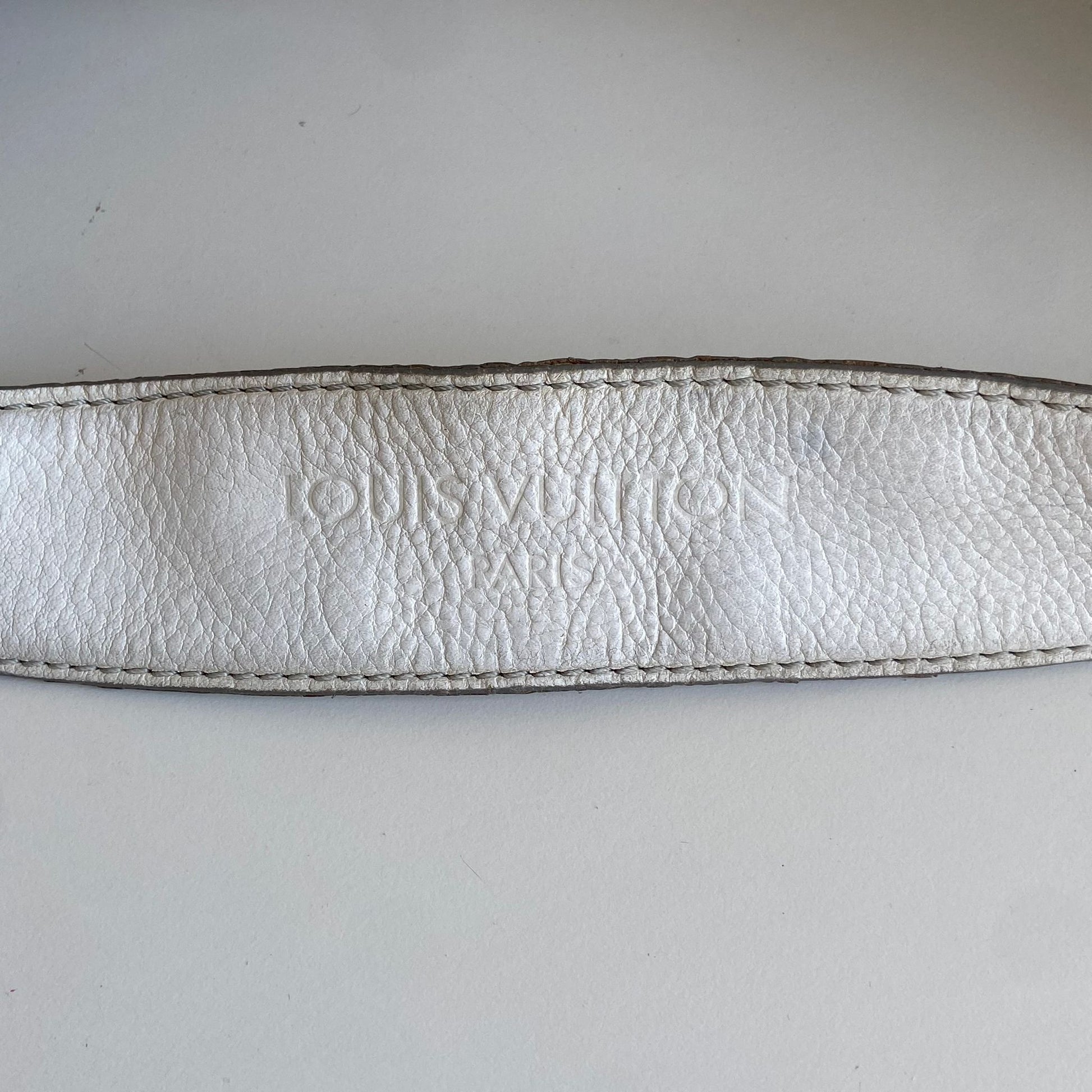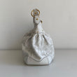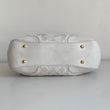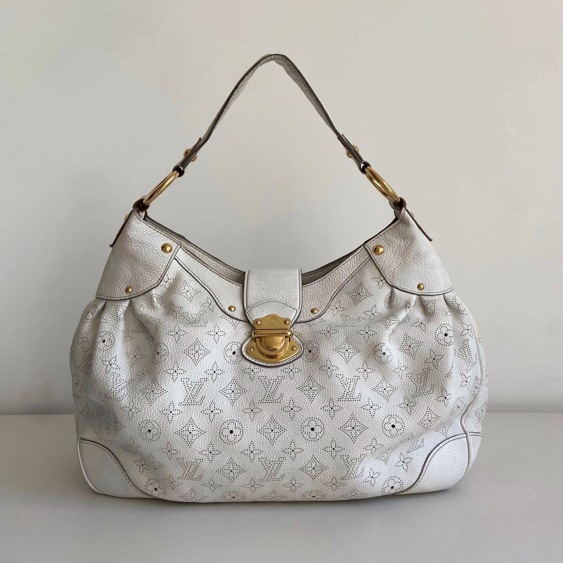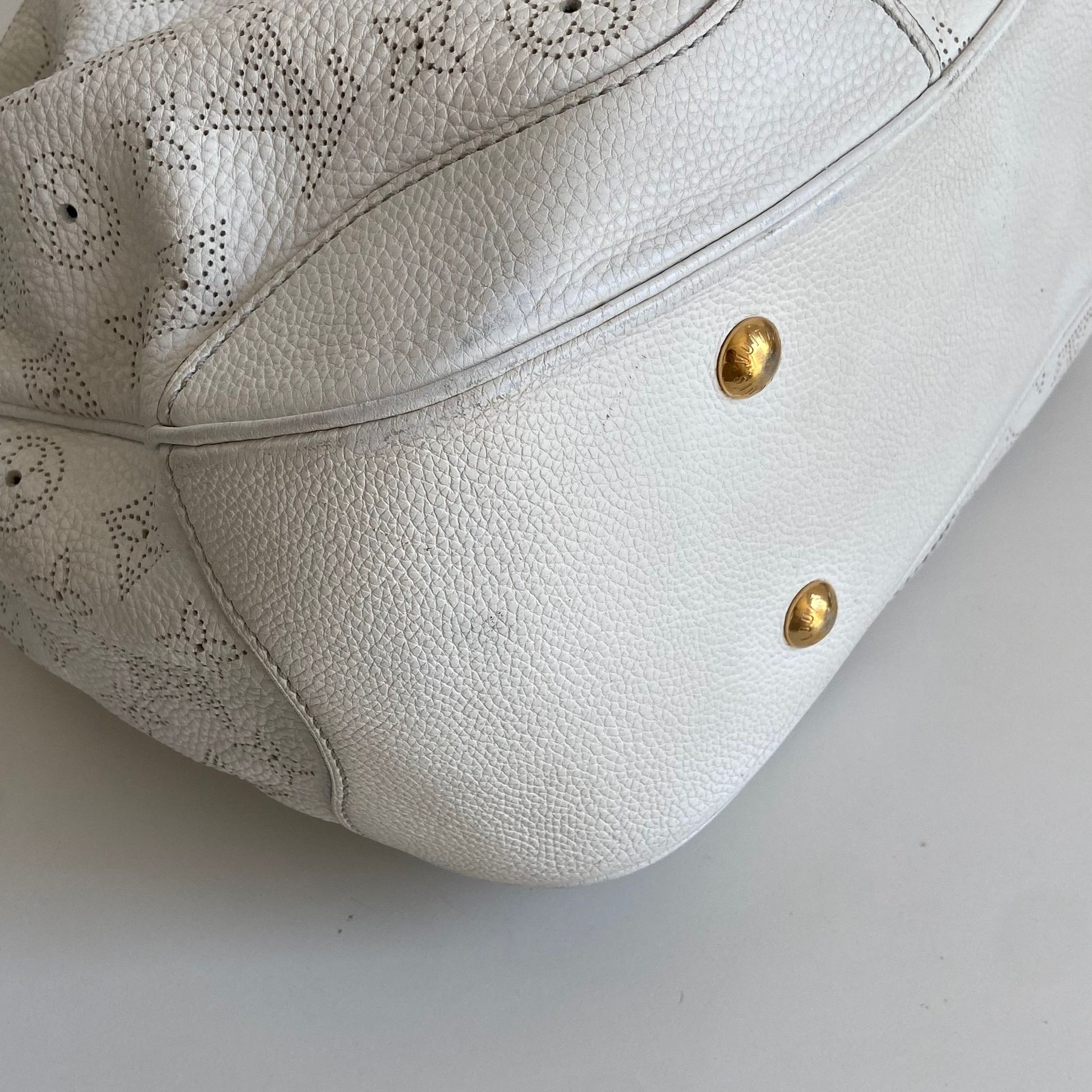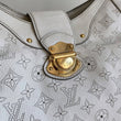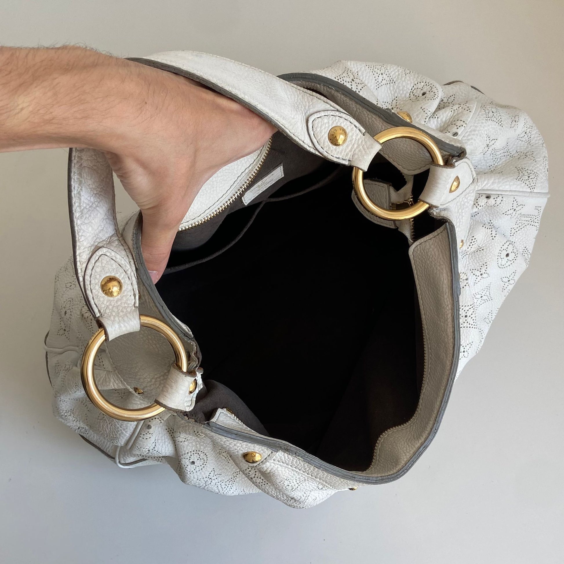 Meravigliosa borsa Louis Vuitton modello Mahina Solar GM in pelle bianca martellata con monogram LV impunturato e hardware oro. Si indossa a spalla.