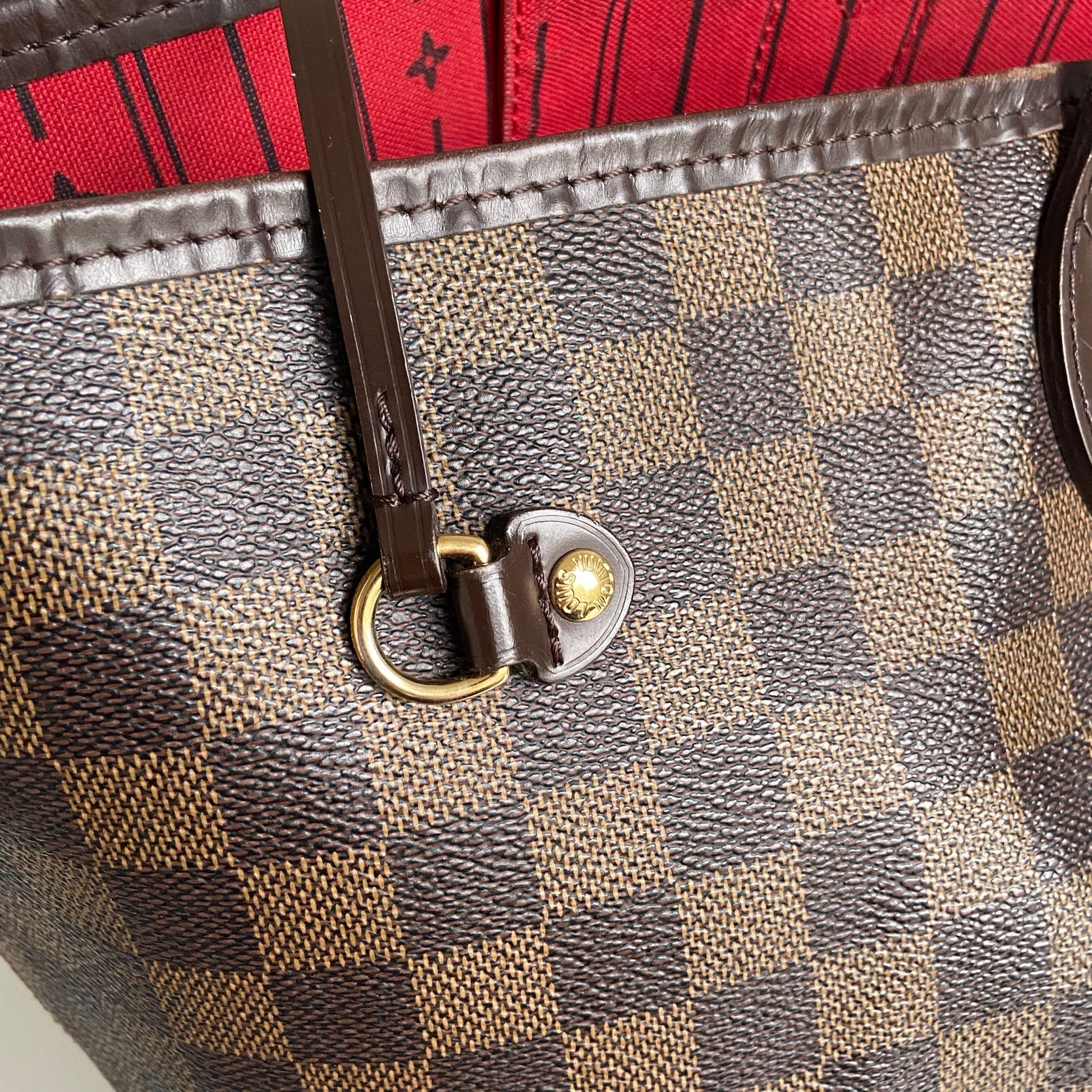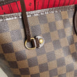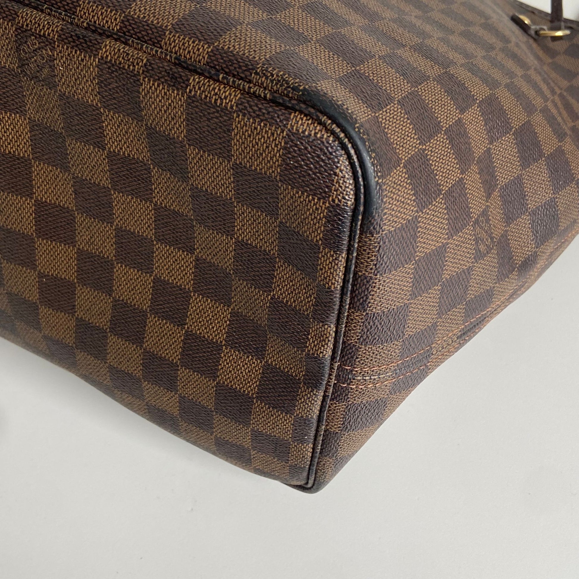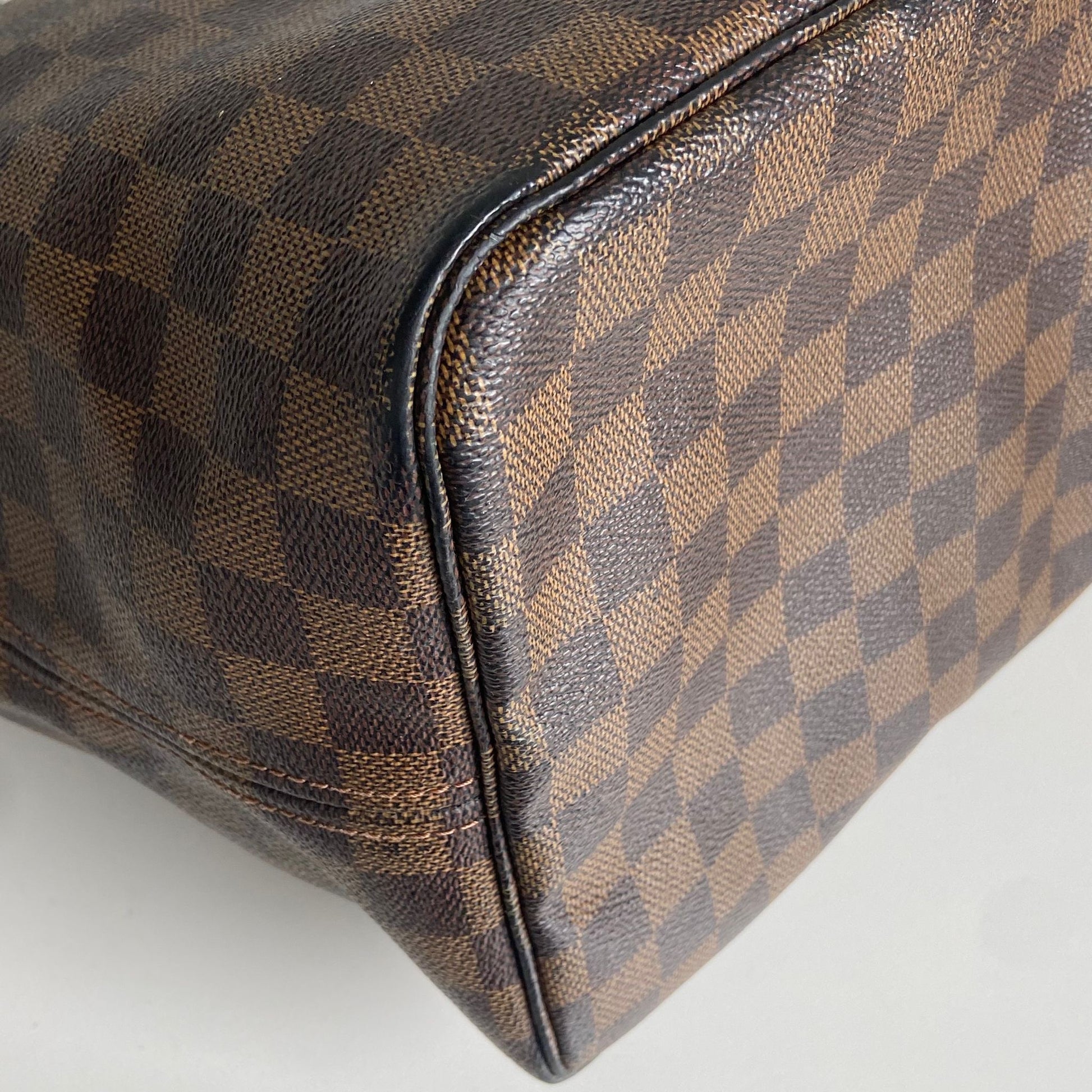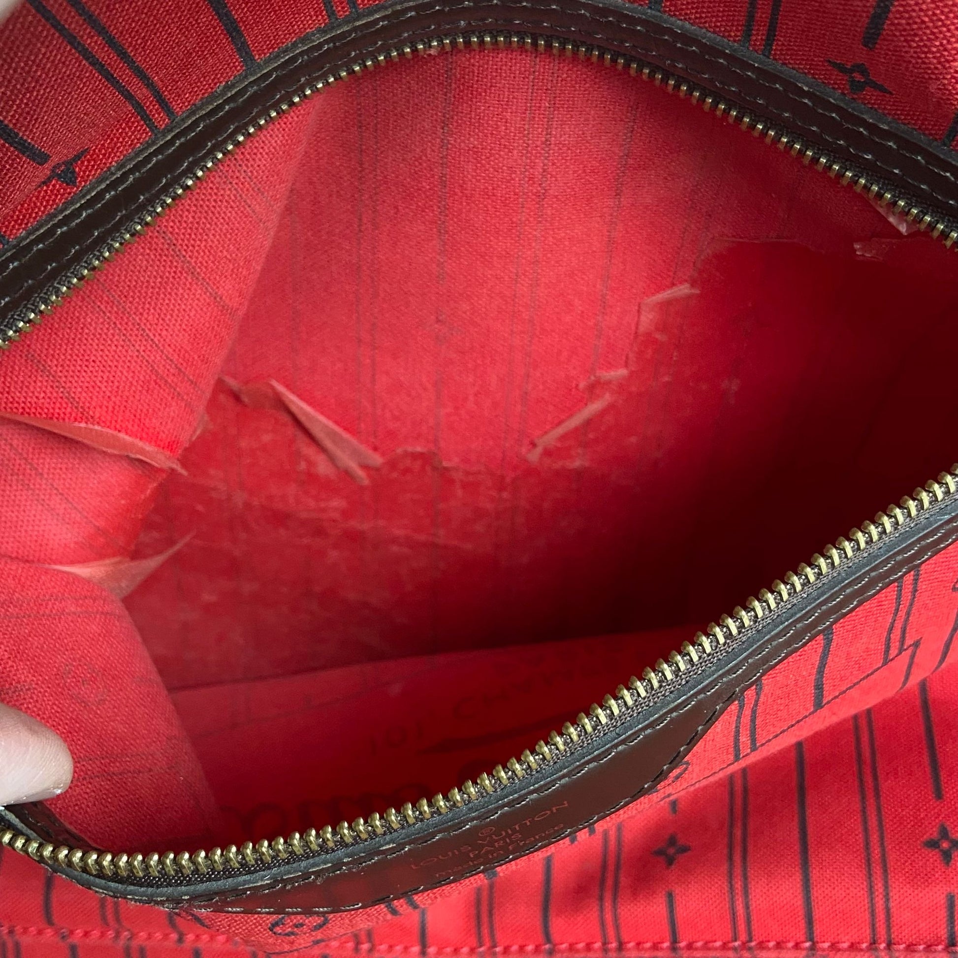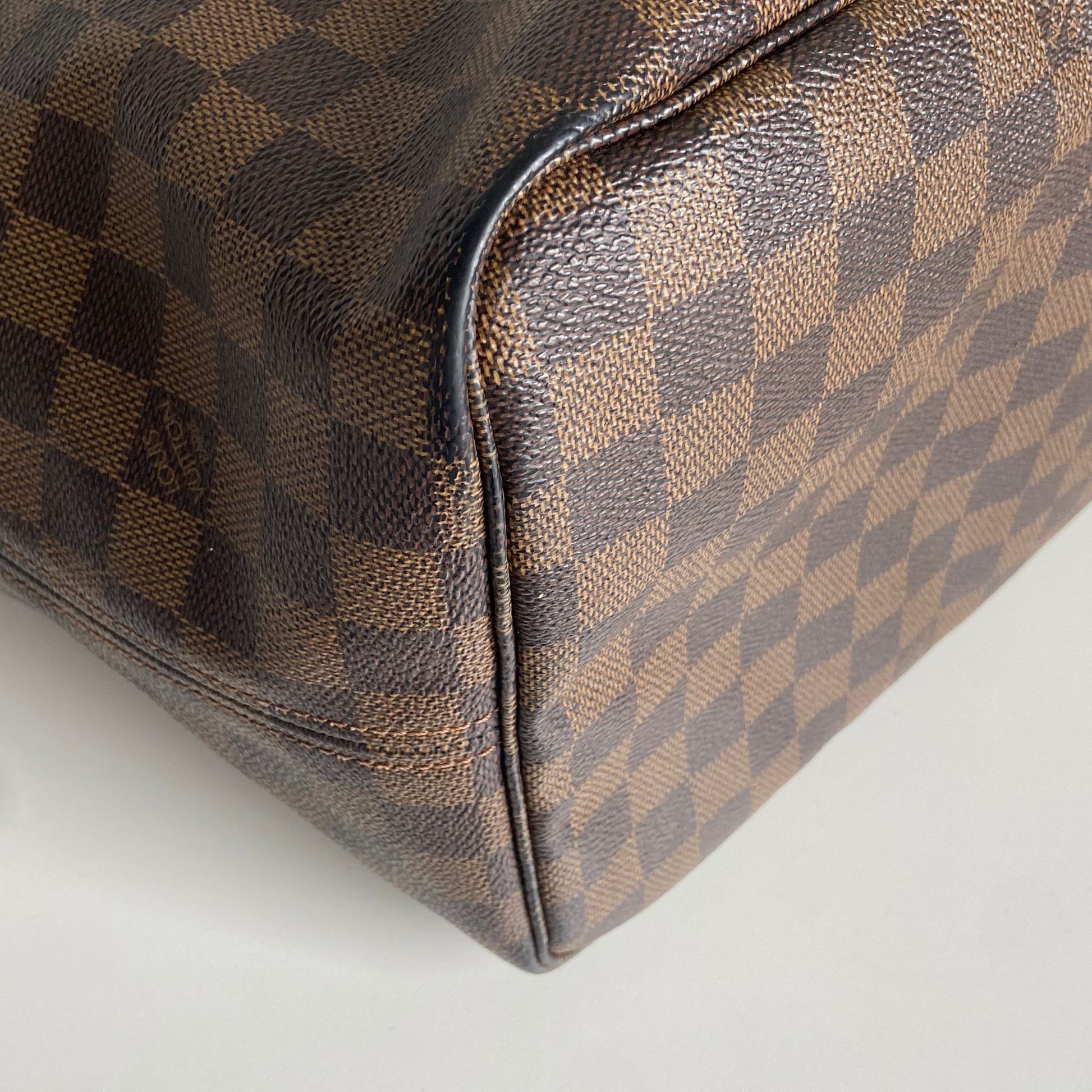 Iconica borsa Louis Vuitton modello Neverfull GM in tela Damier Ebene, dettagli in pelle marrone e interno rosso. Si indossa a spalla. Questa edizione non prevede la pochette.