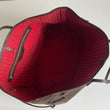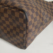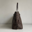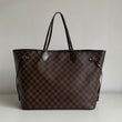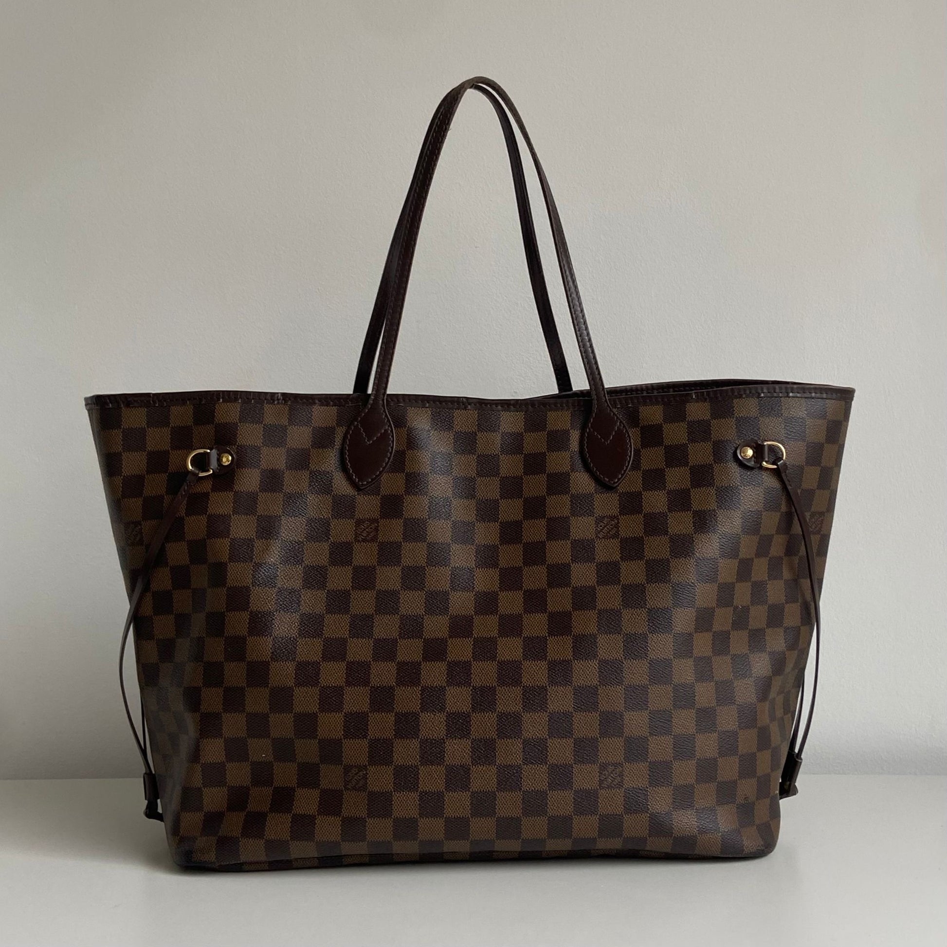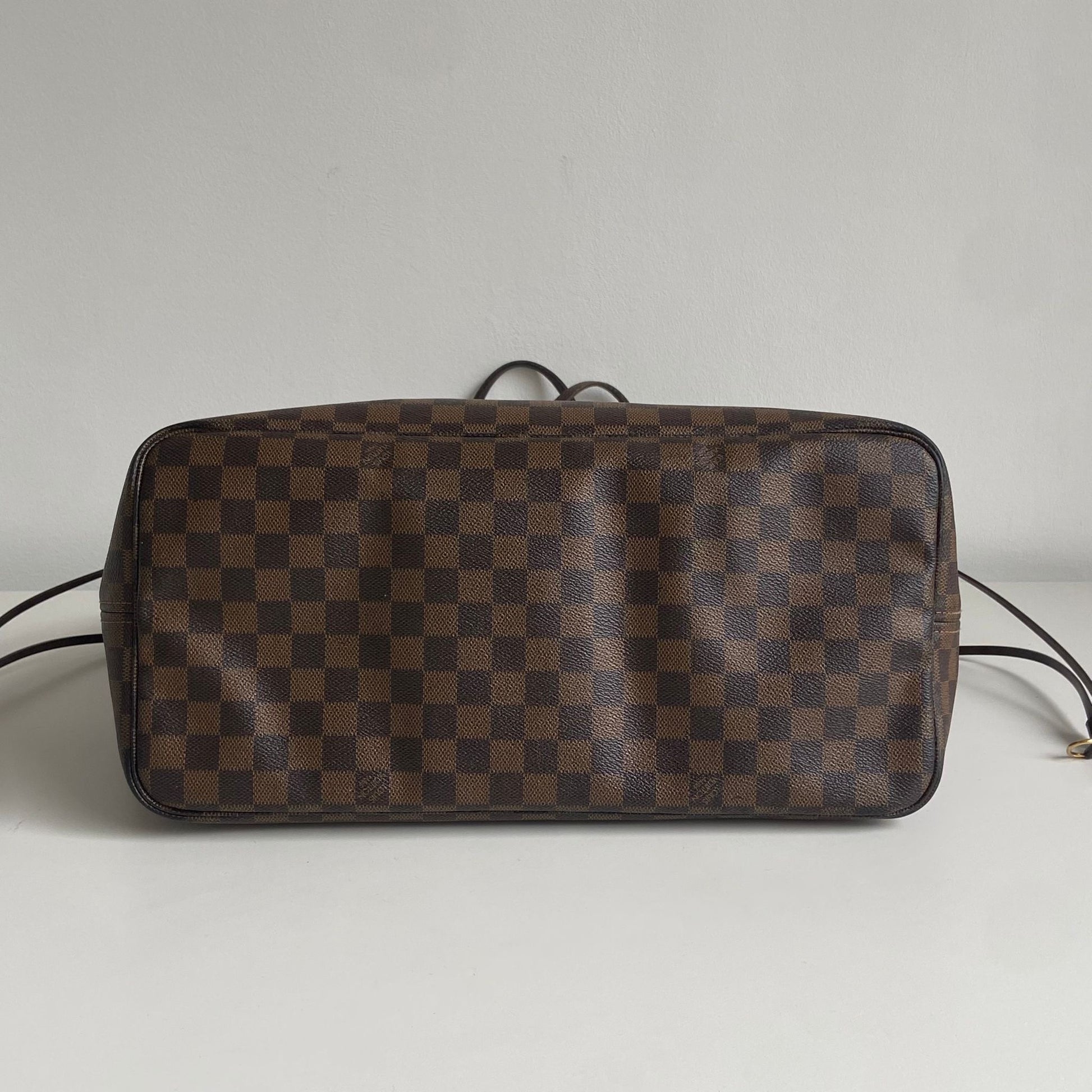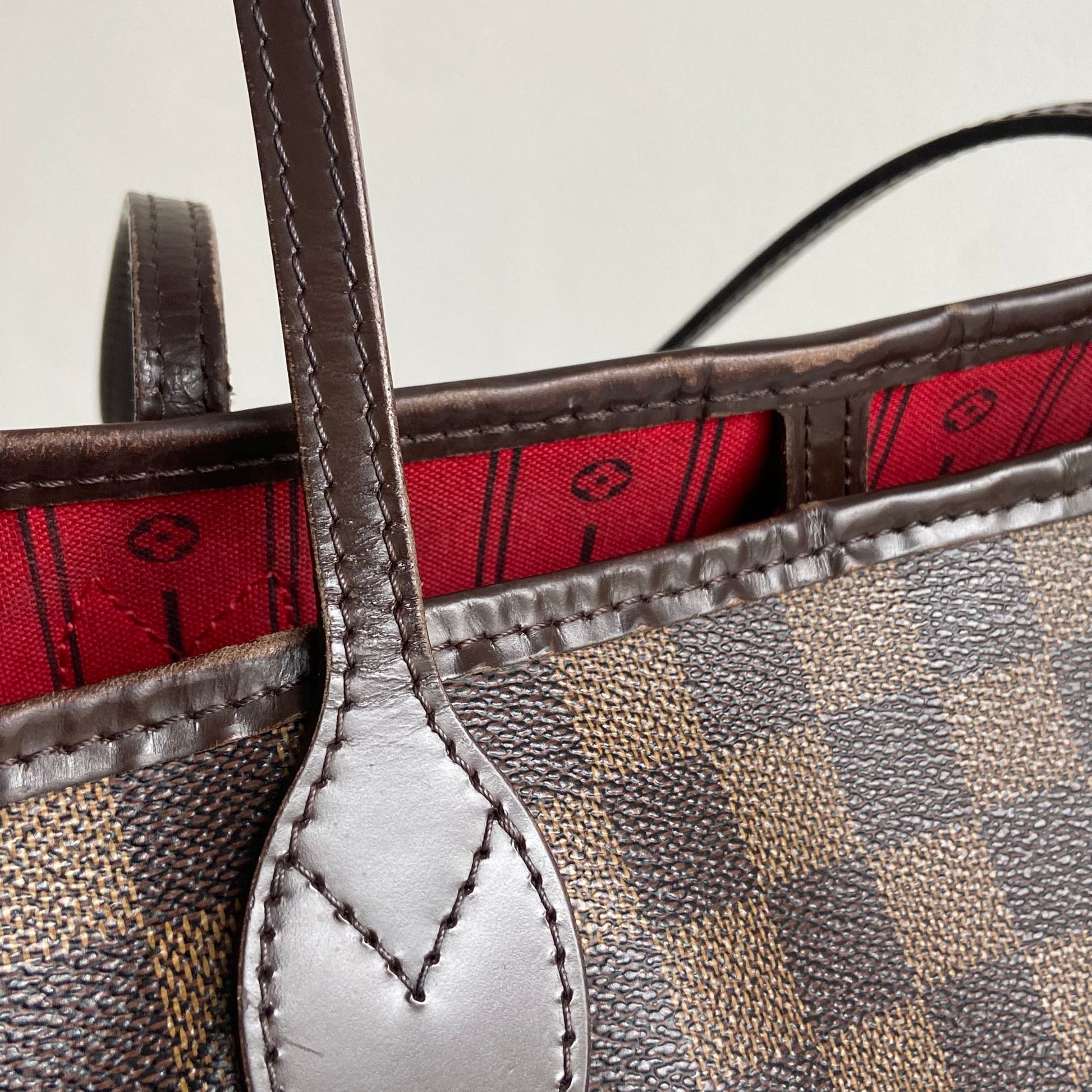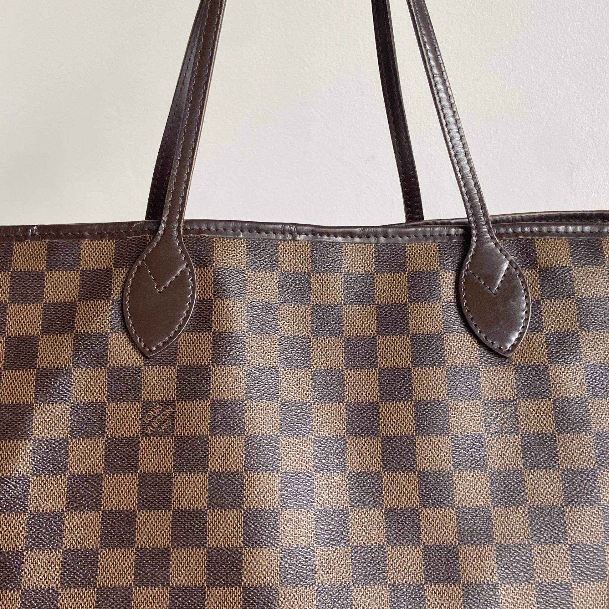 Iconica borsa Louis Vuitton modello Neverfull GM in tela Damier Ebene, dettagli in pelle marrone e interno rosso. Si indossa a spalla. Questa edizione non prevede la pochette.