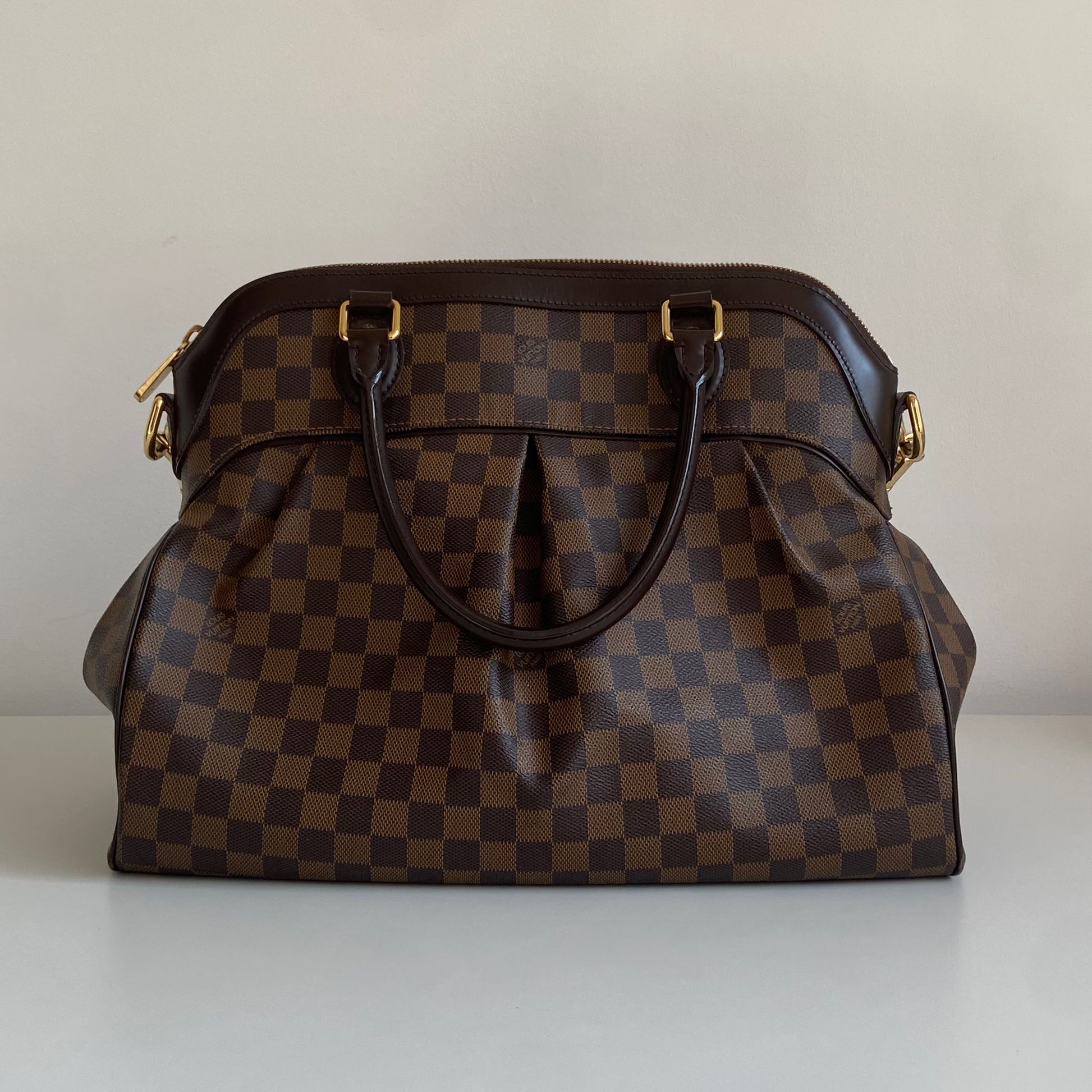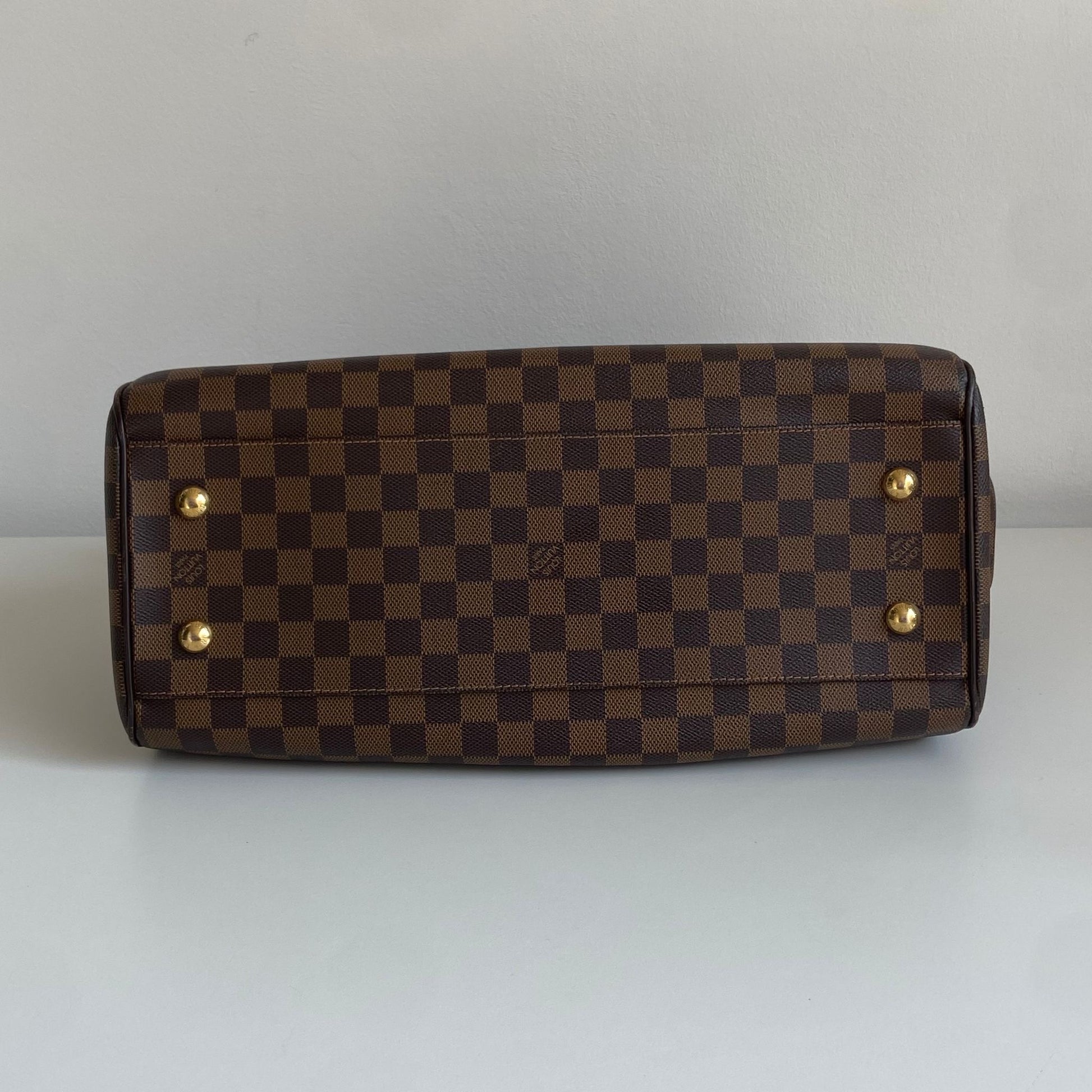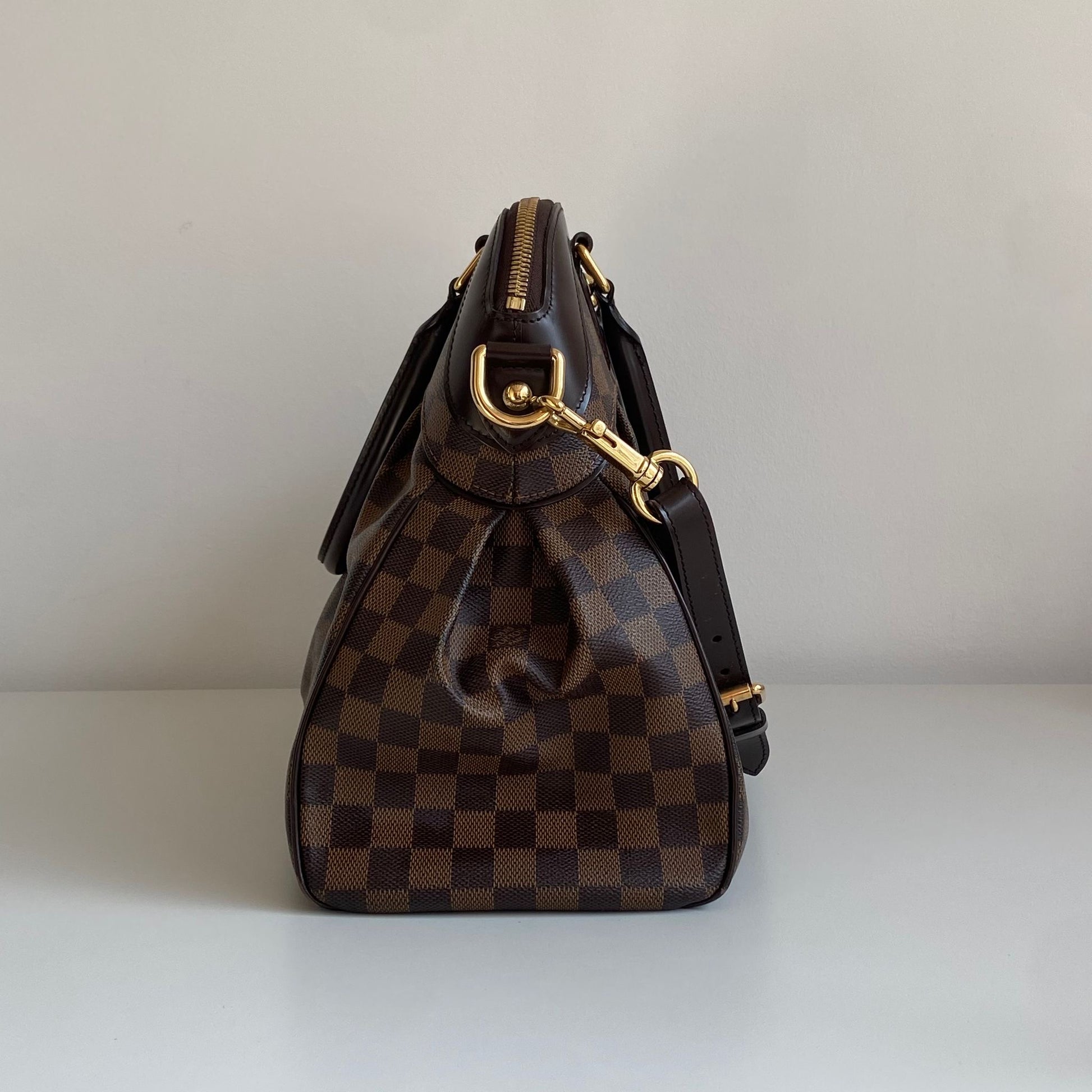 Meravigliosa borsa Louis Vuitton modello Trevi GM in tela damier Ébène, dettagli in pelle marrone e hardware oro. Si indossa a mano e a spalla, la tracolla è rimovibile e regolabile.