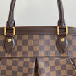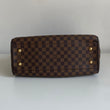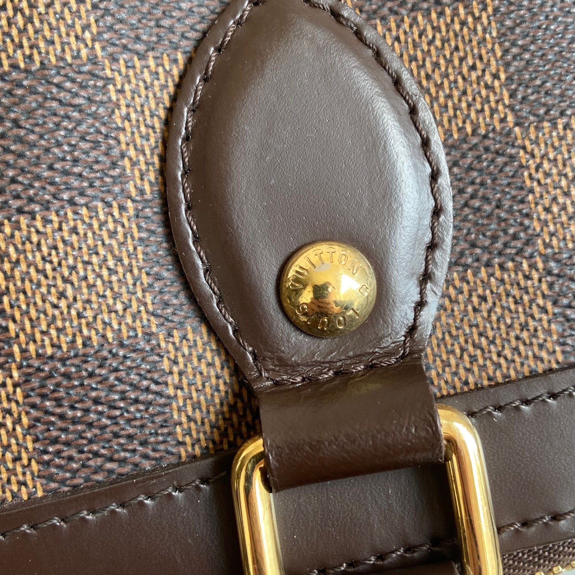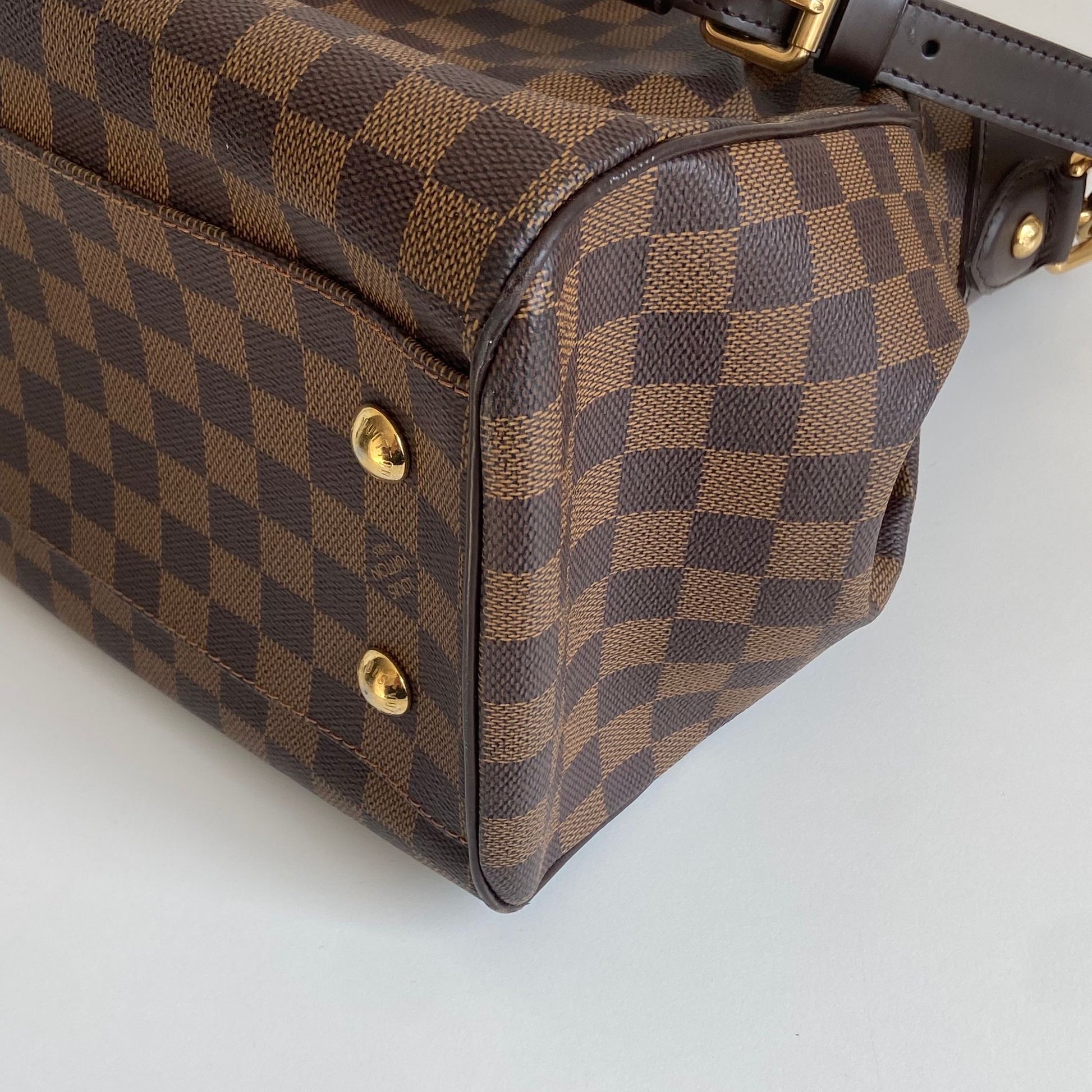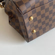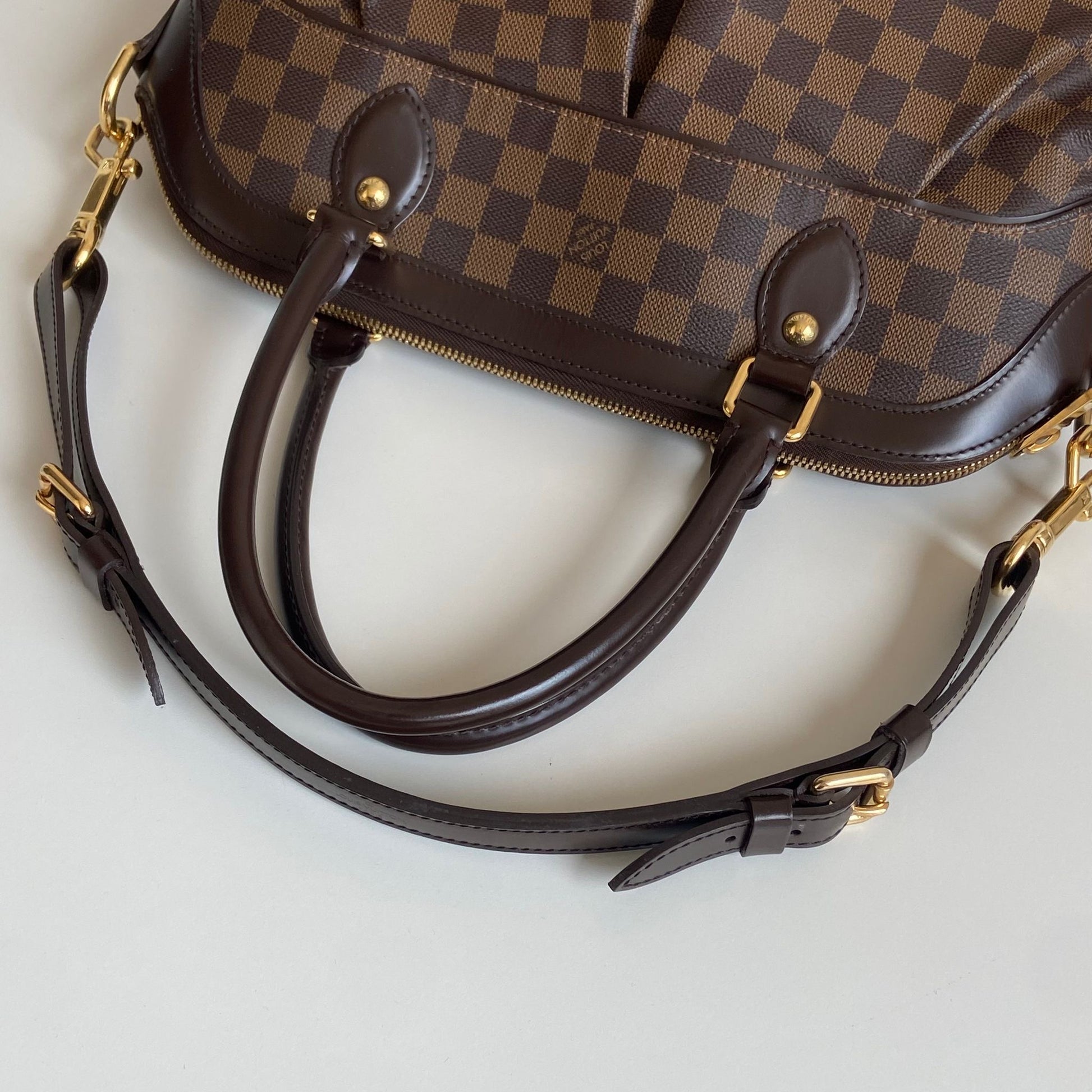Meravigliosa borsa Louis Vuitton modello Trevi GM in tela damier Ébène, dettagli in pelle marrone e hardware oro. Si indossa a mano e a spalla, la tracolla è rimovibile e regolabile.