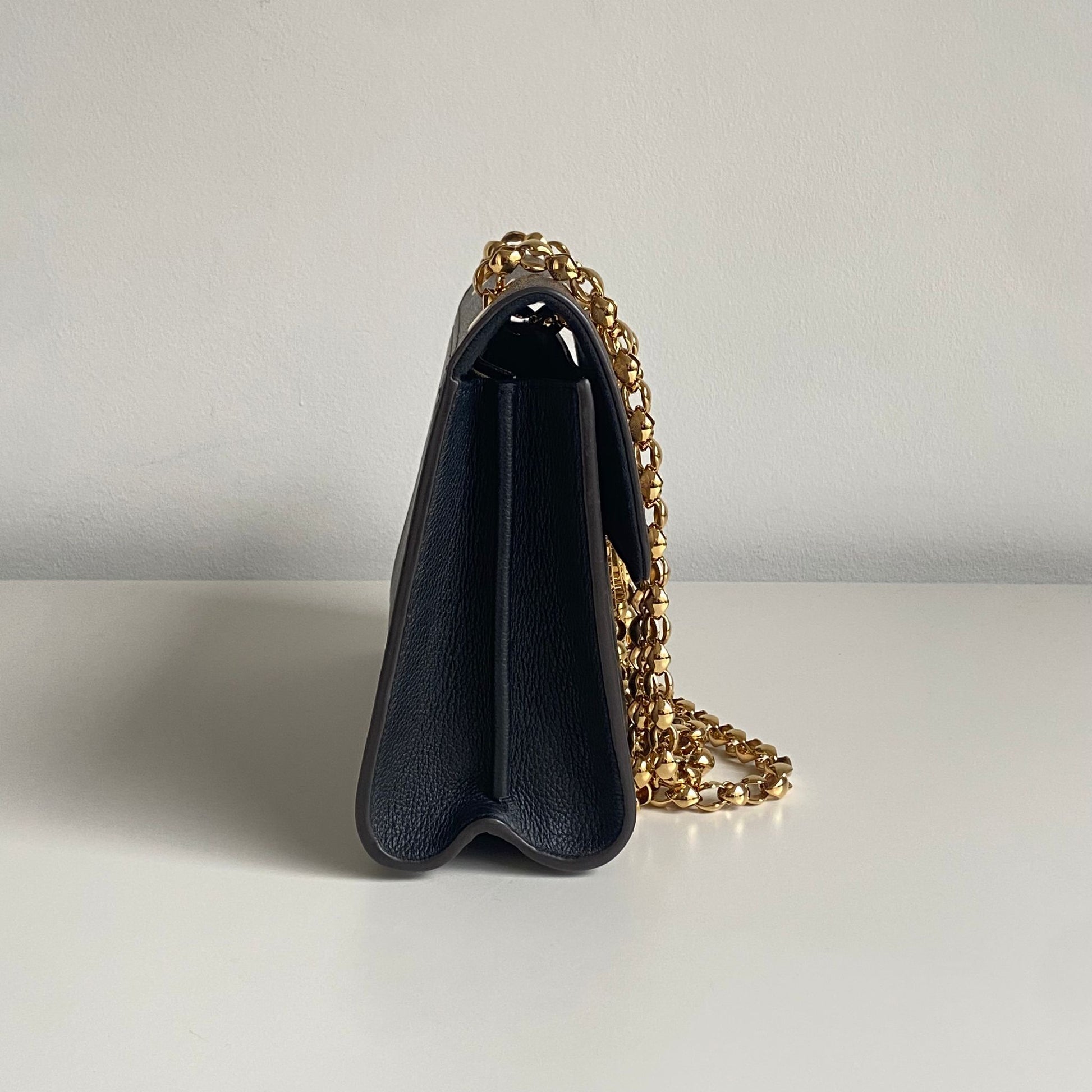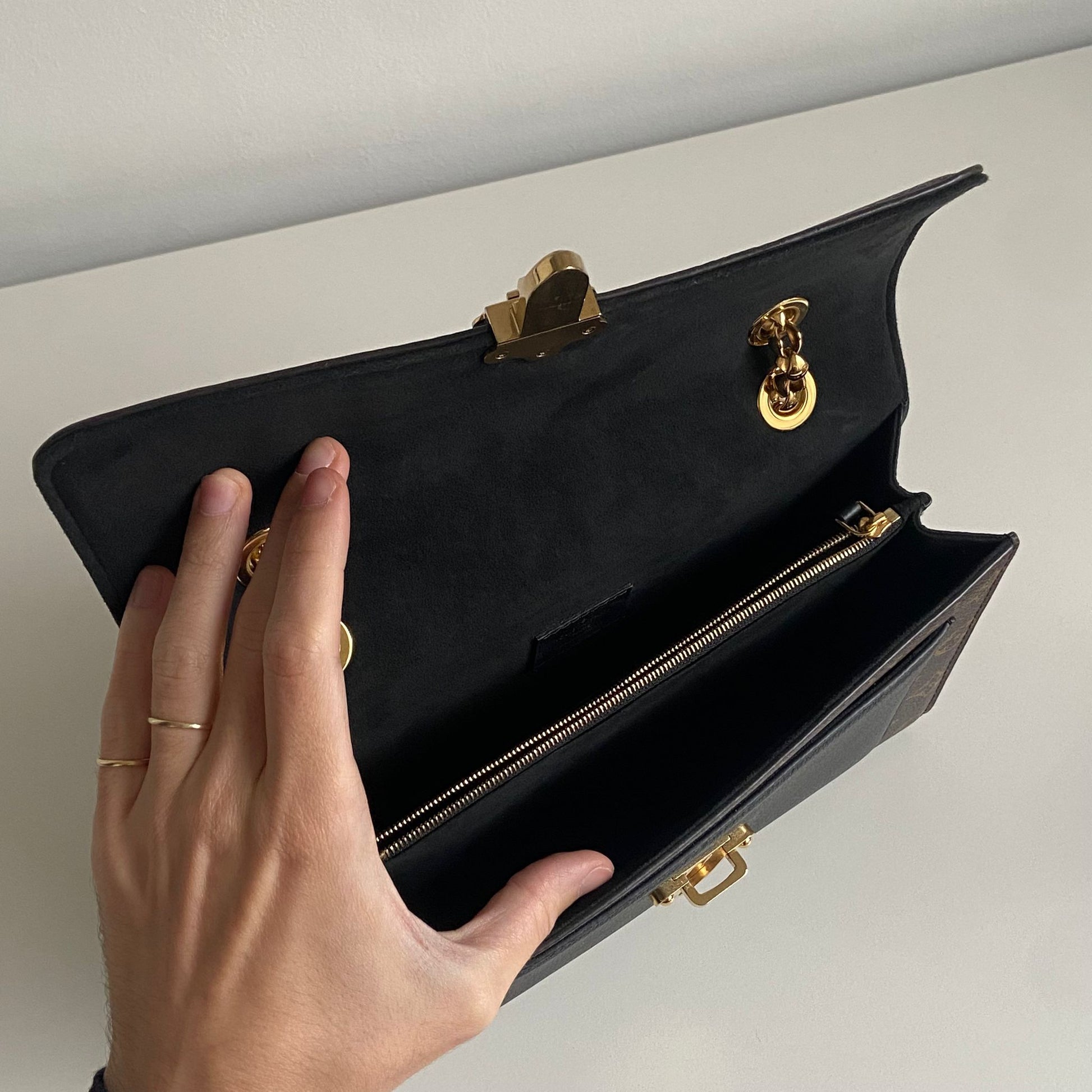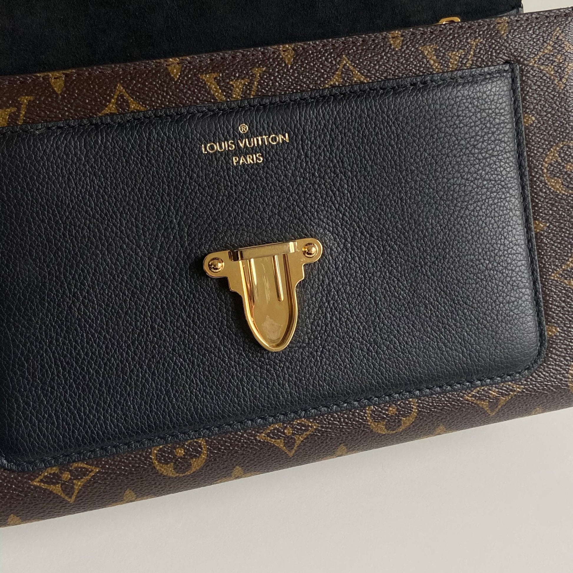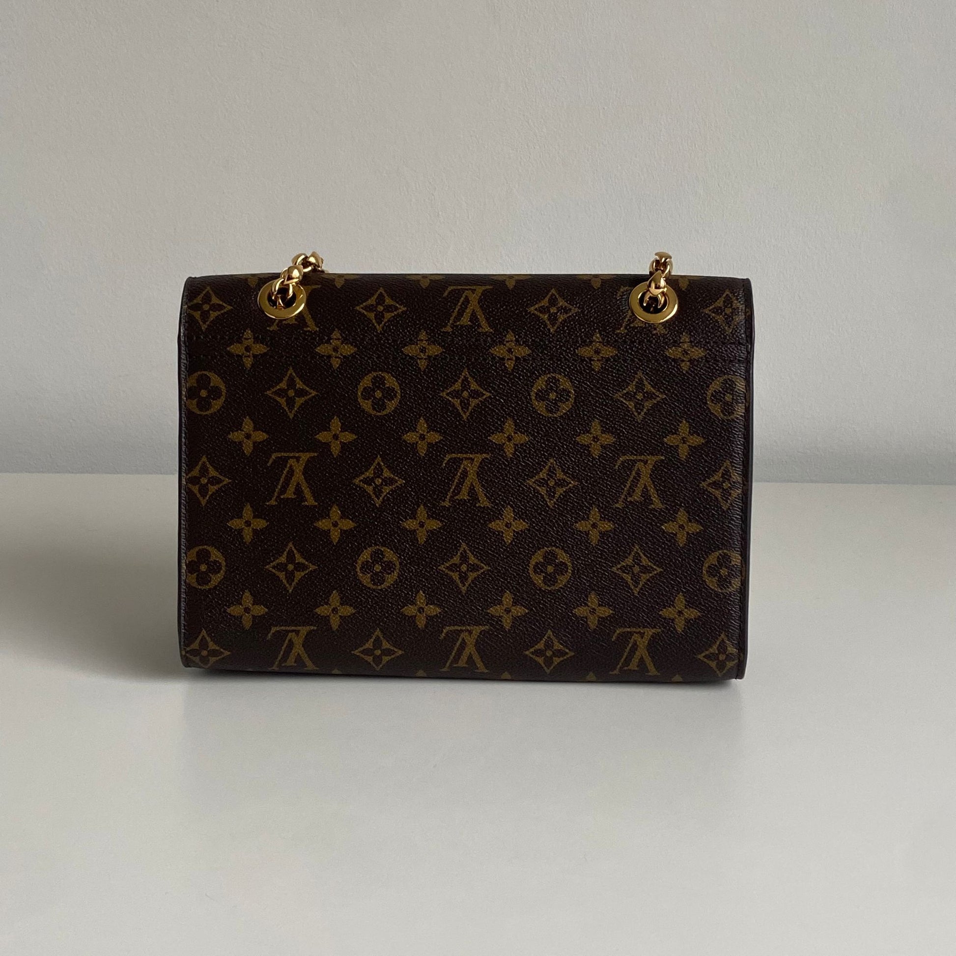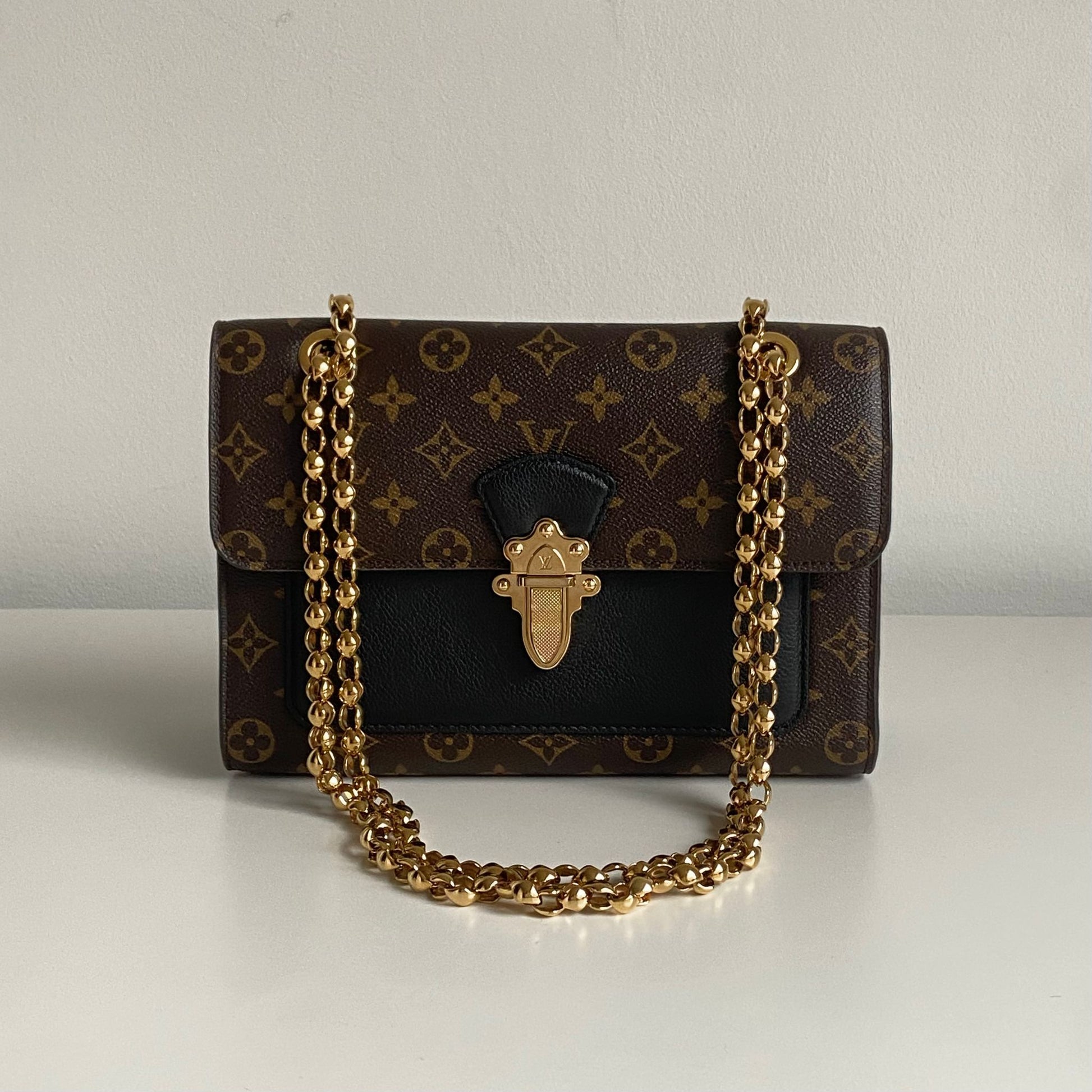 Meravigliosa borsa Louis Vuitton modello Victoire in tela Monogram LV, dettagli in pelle nera con hardware oro. Si indossa a spalla e a tracolla, la catena non è rimovibile ma è regolabile facendola scorrere.