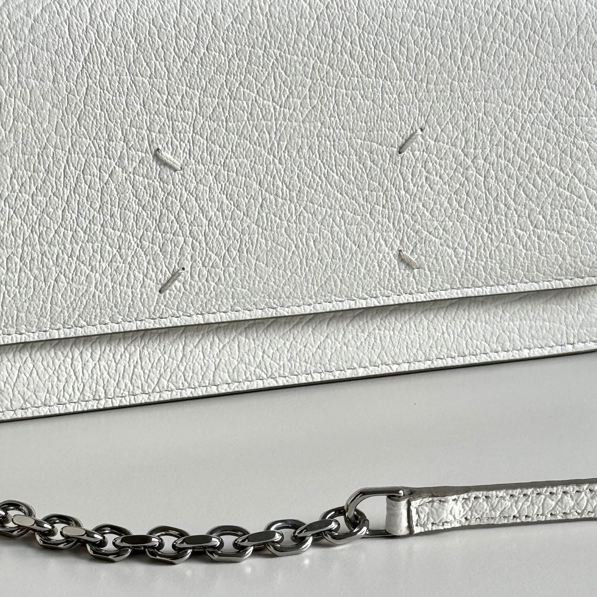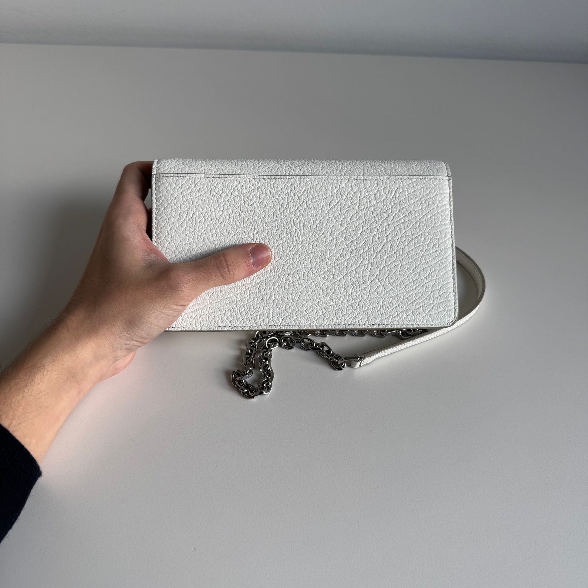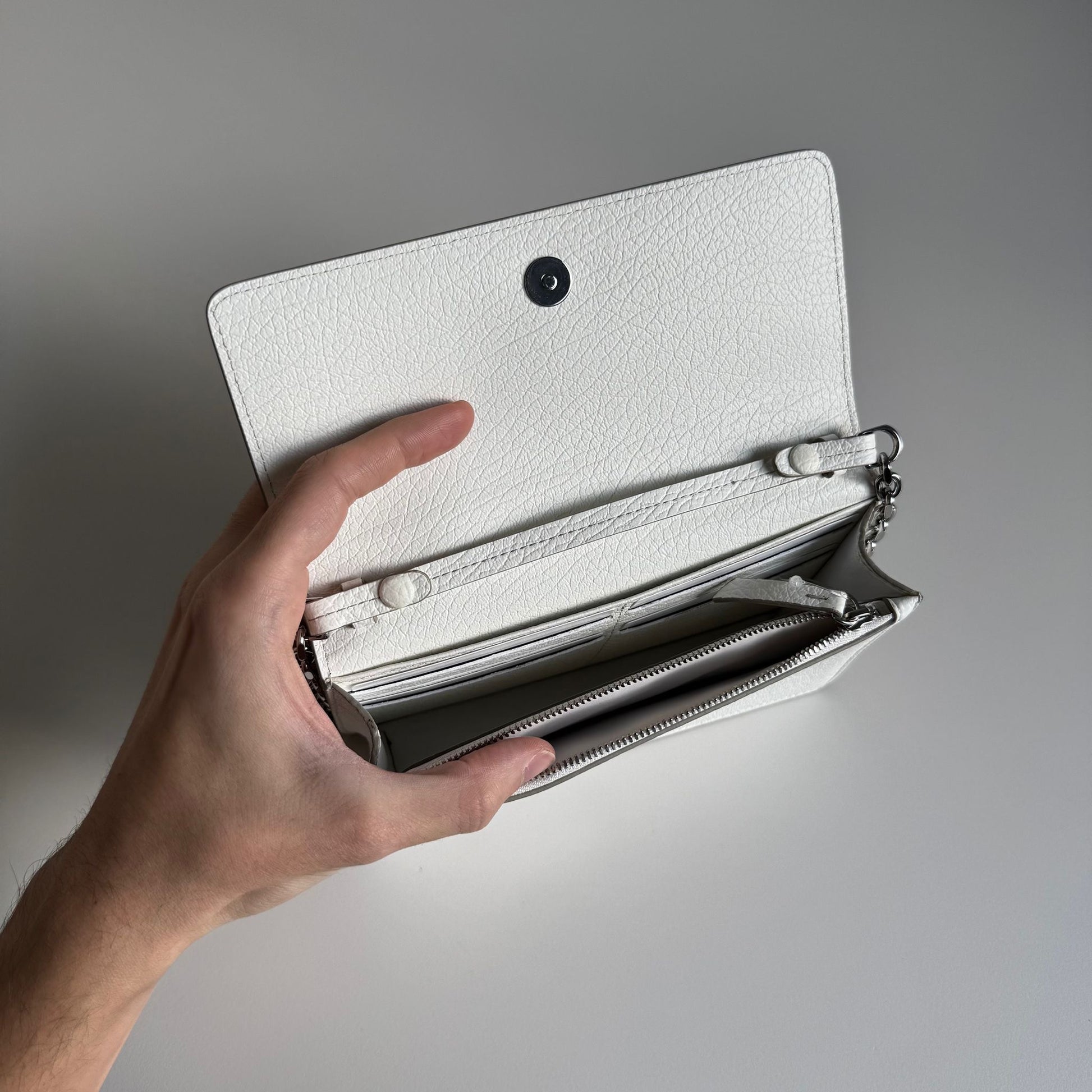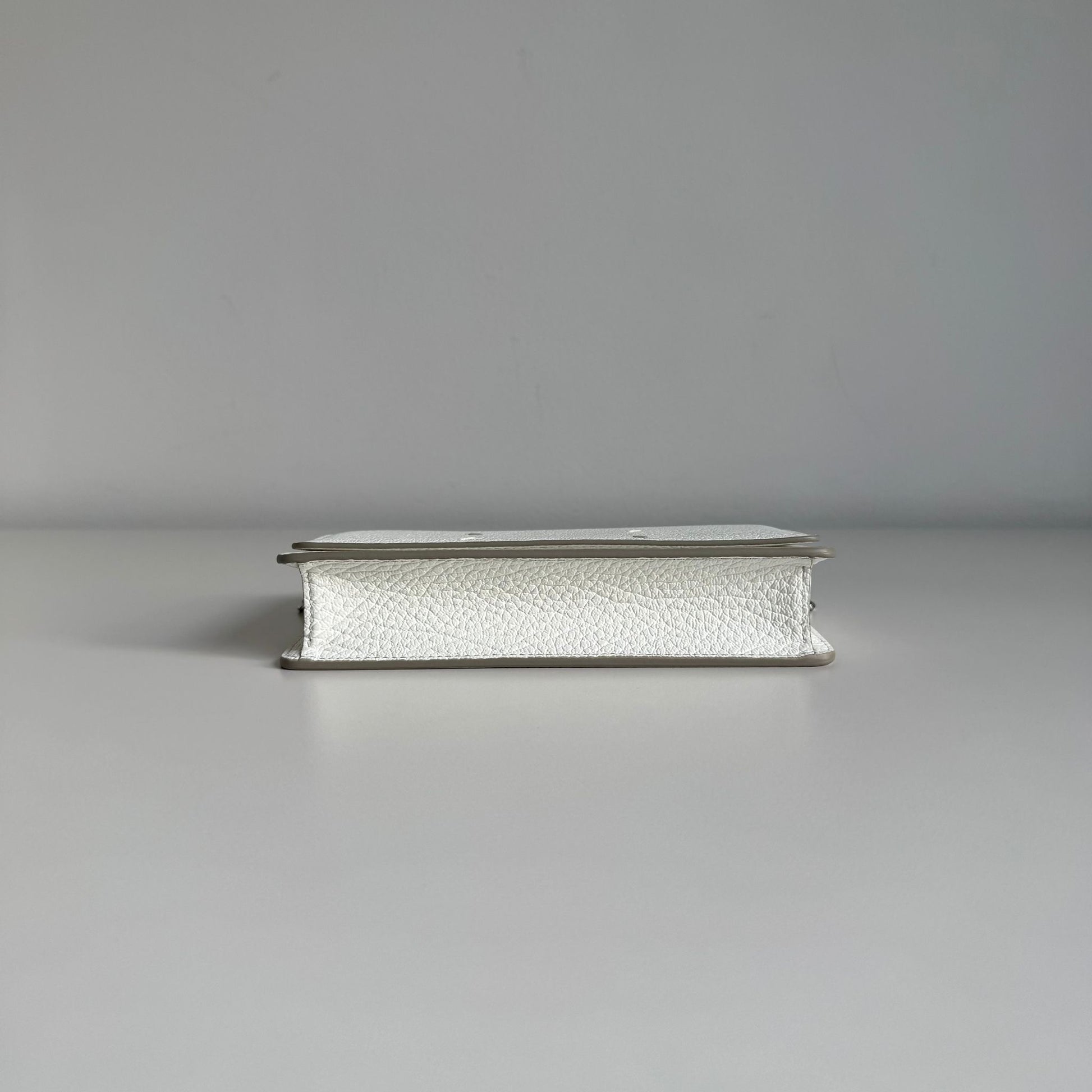 Nuovissima borsa Masion Margiela a portafoglio in pelle bianca, con hardware argento. Si indossa a tracolla e a mano grazie alla tracolla rimovibile. Ha lo spazio per tessere e monete.
