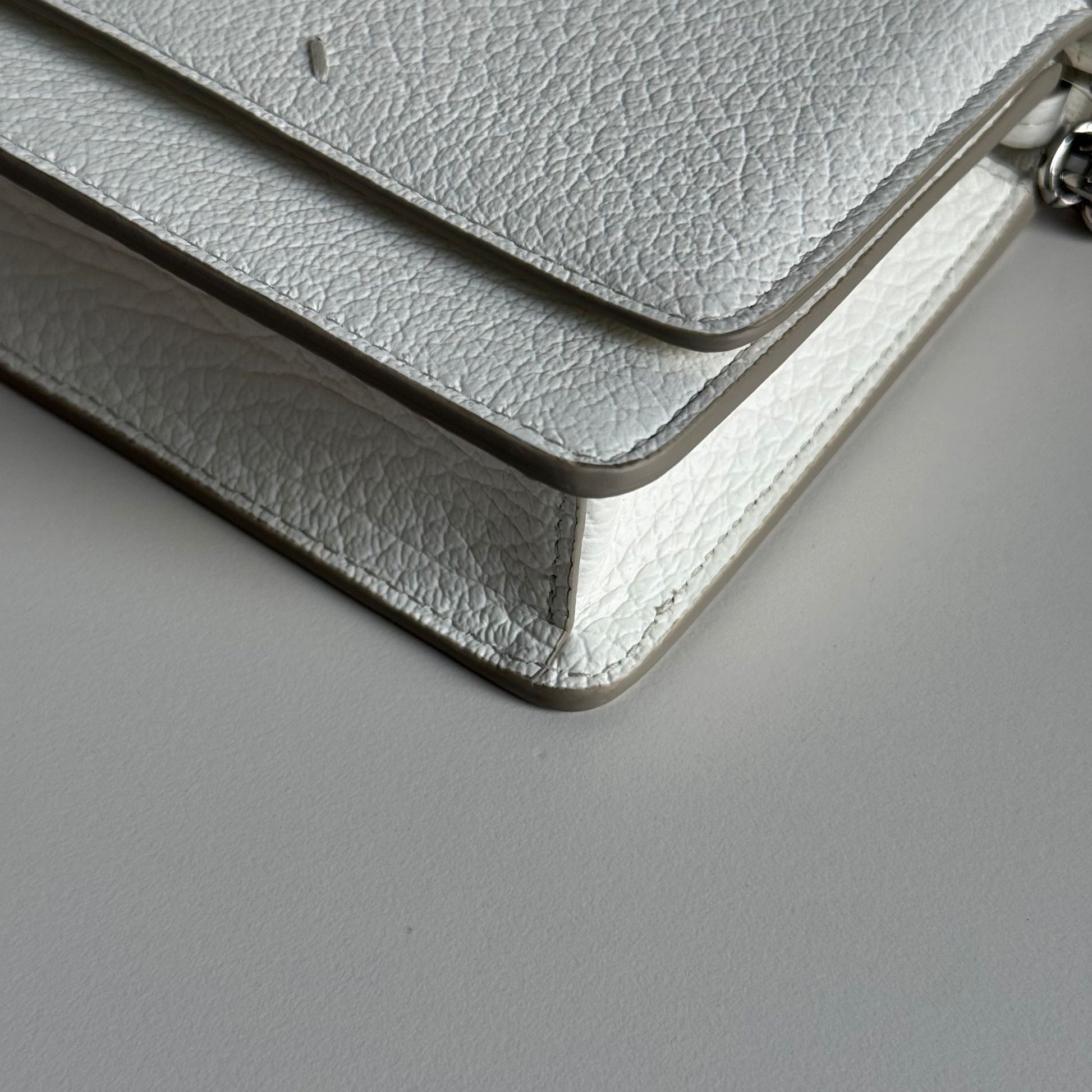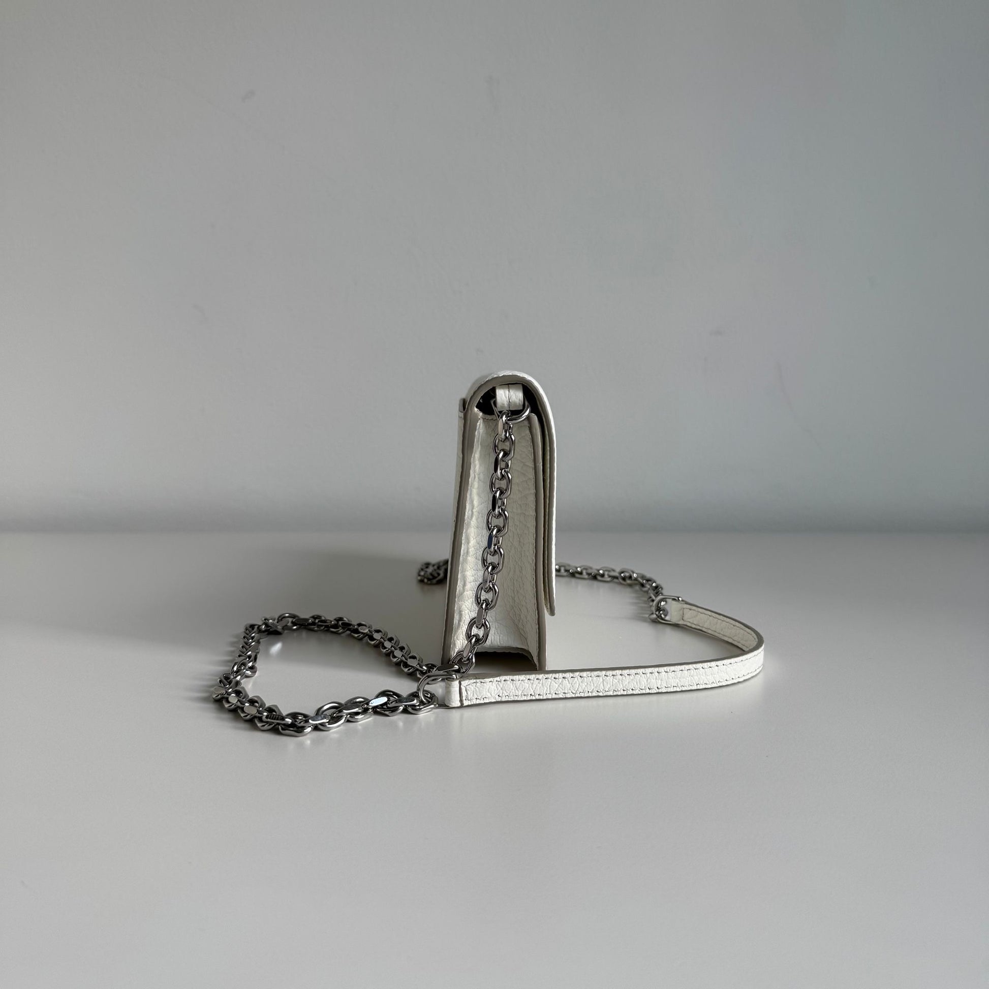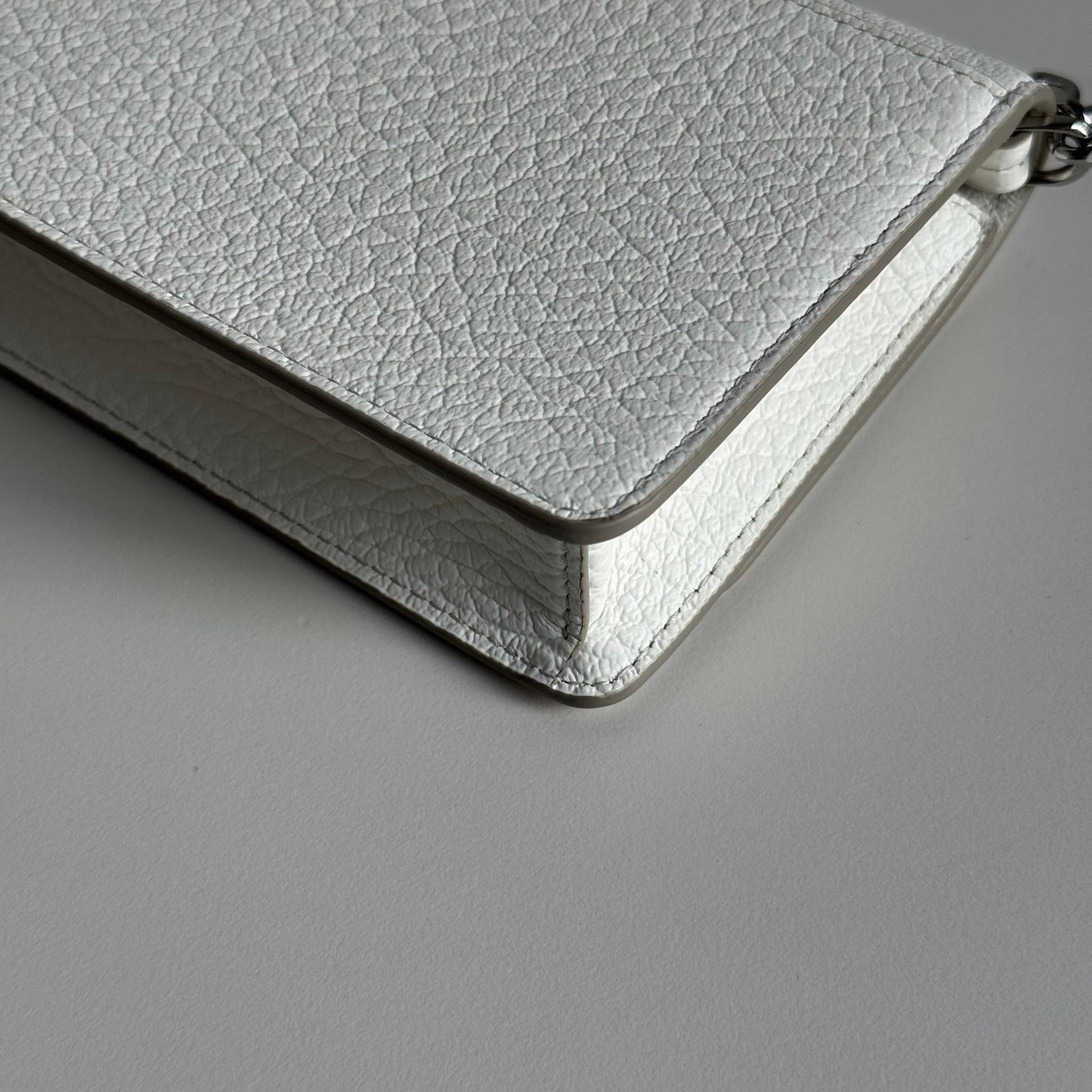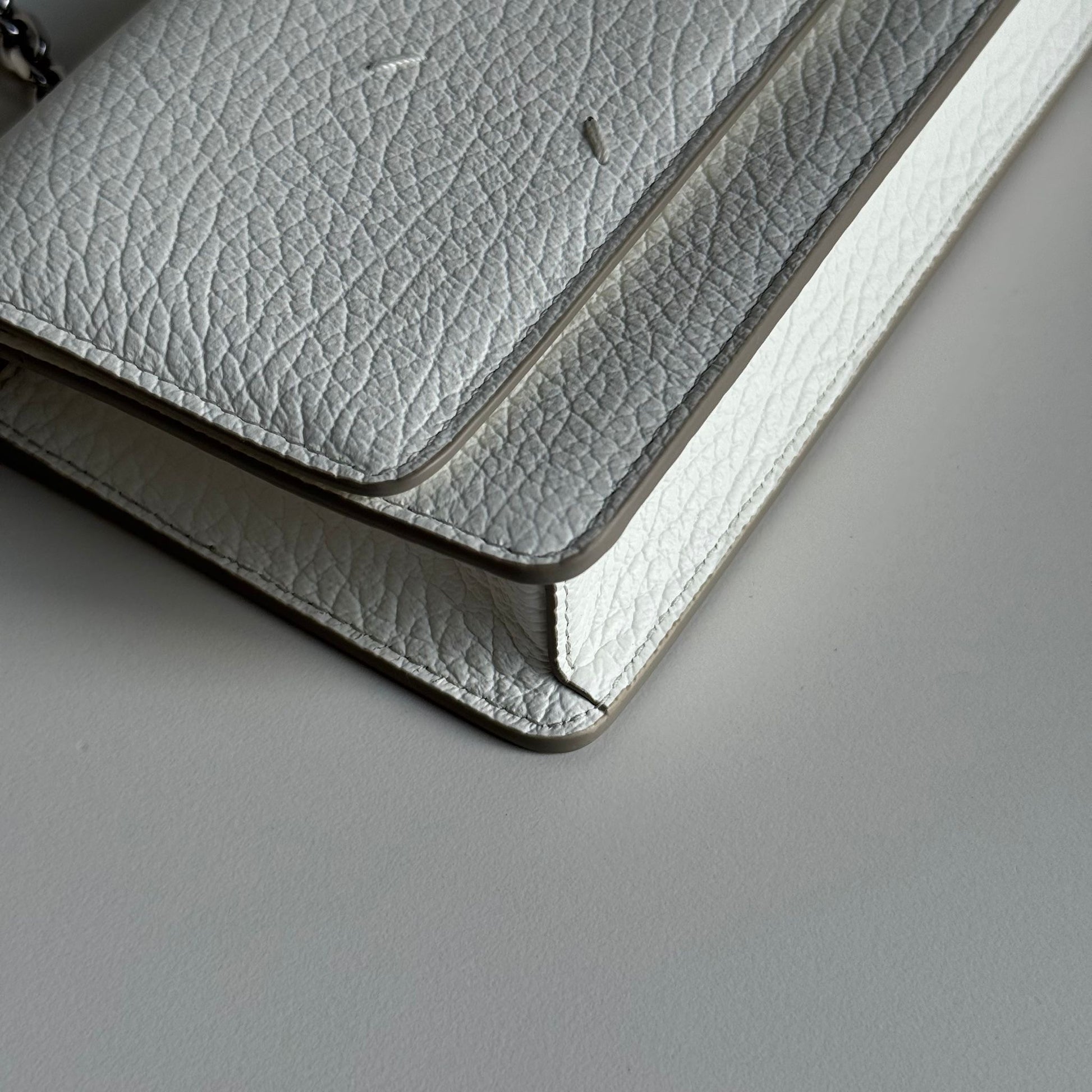 Nuovissima borsa Masion Margiela a portafoglio in pelle bianca, con hardware argento. Si indossa a tracolla e a mano grazie alla tracolla rimovibile. Ha lo spazio per tessere e monete.