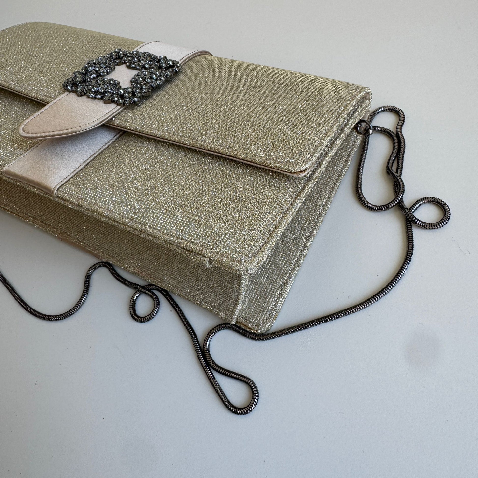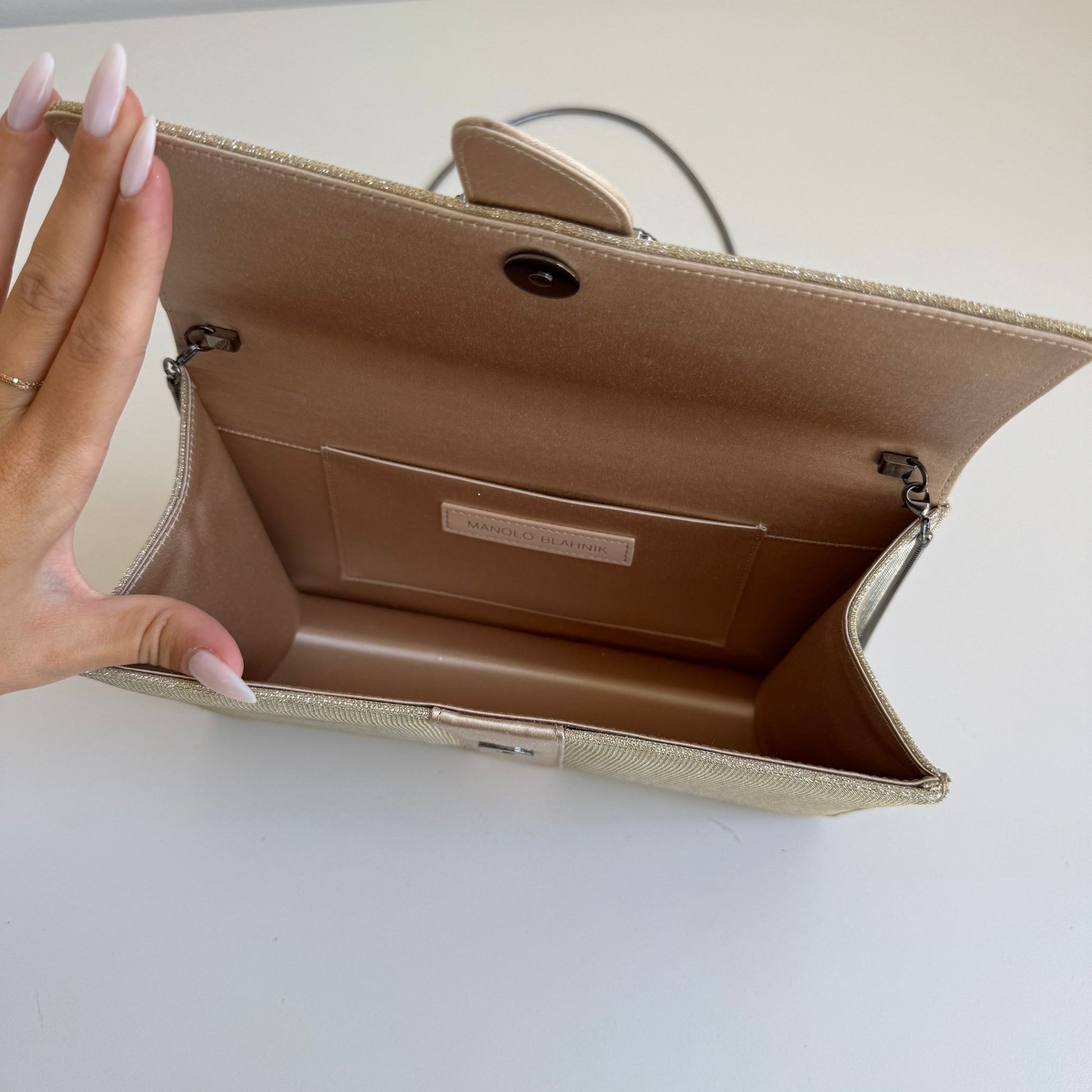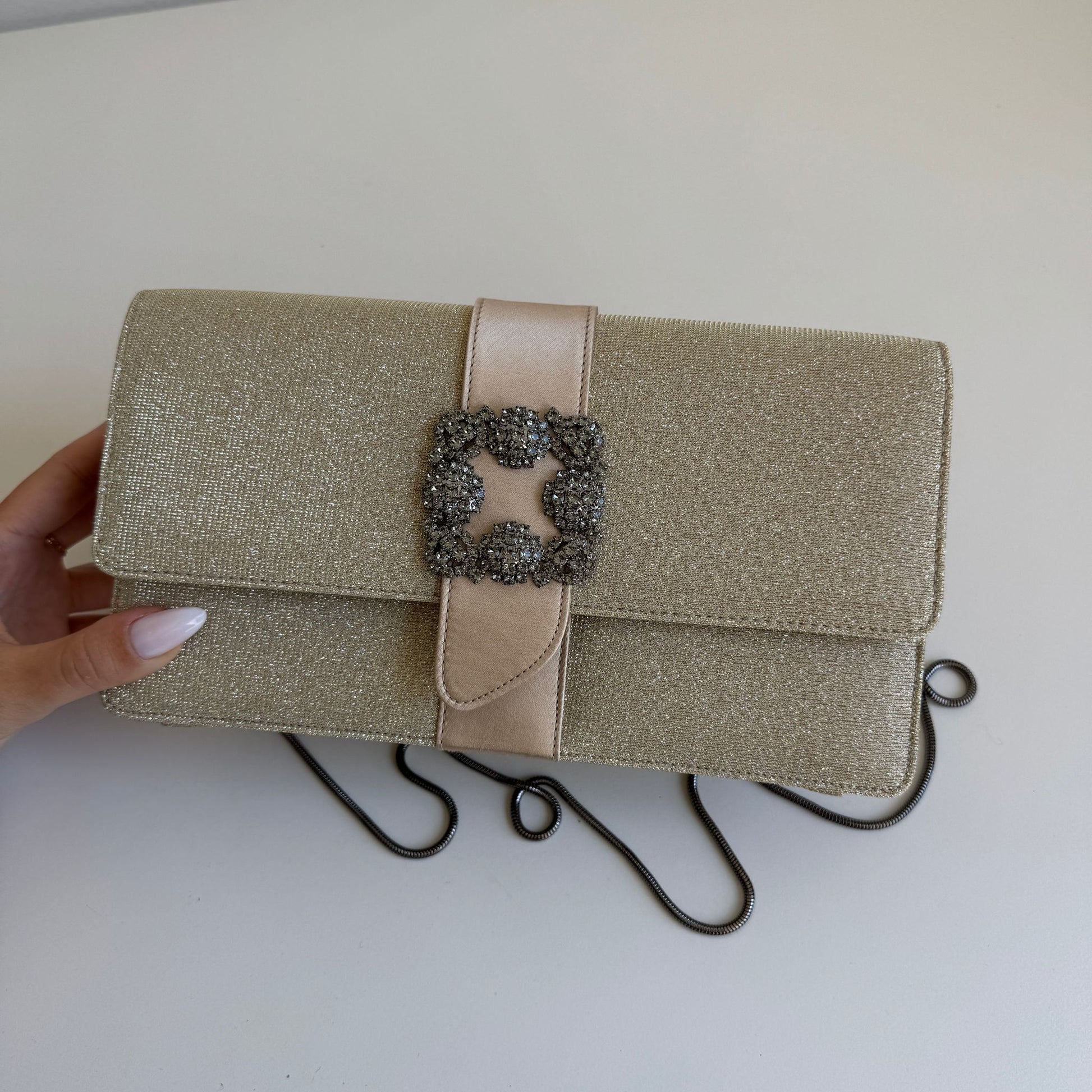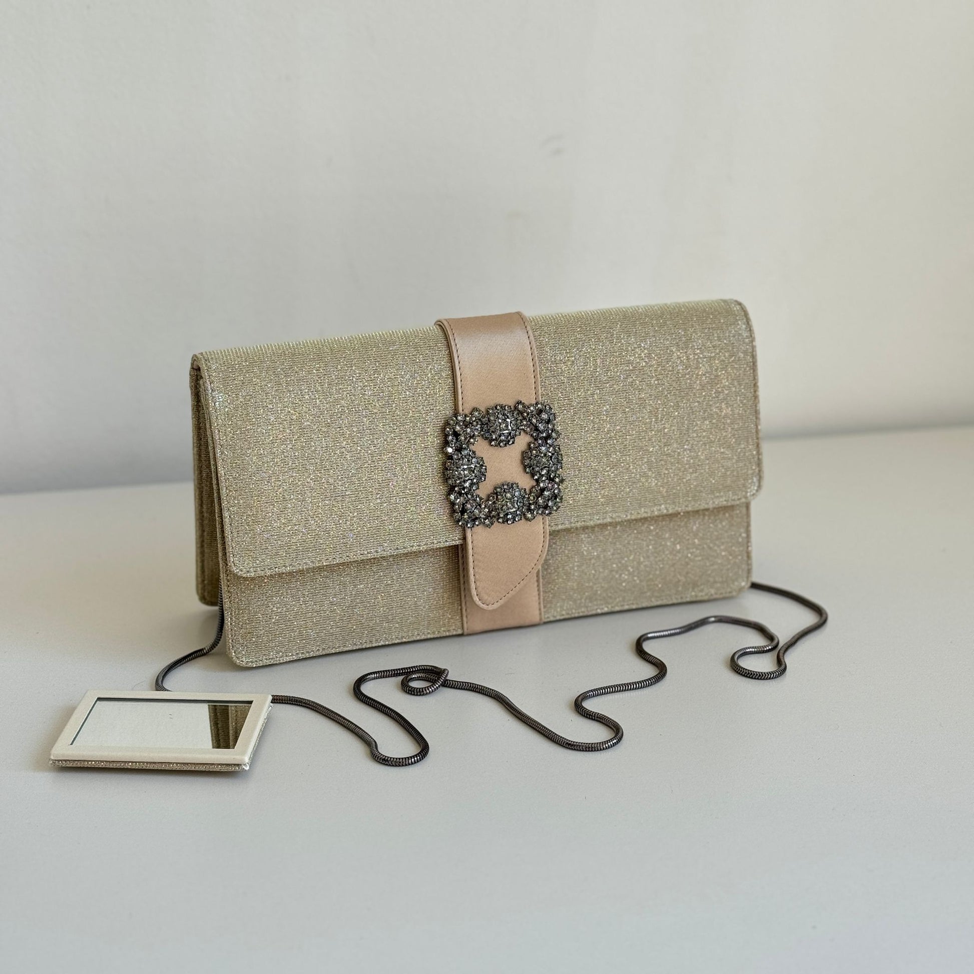 Iconica borsa Manolo Blahnik modello Capri Glitter in lurex oro con dettagli in raso e la classica fibbia Buckle. Si indossa a mano, a spalla e a tracolla. La tracolla è rimovibile e non regolabile. È presente un piccolo specchietto e una seconda tracolla più corta