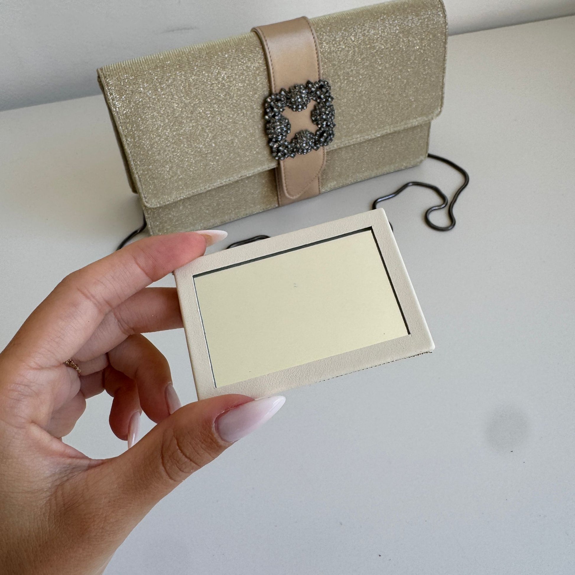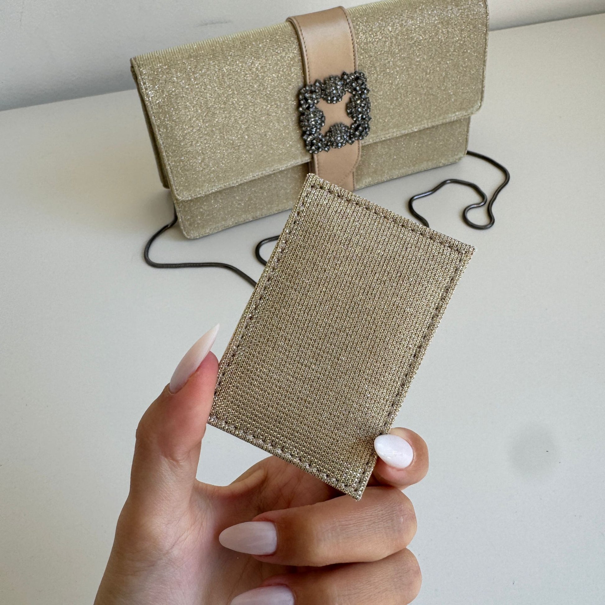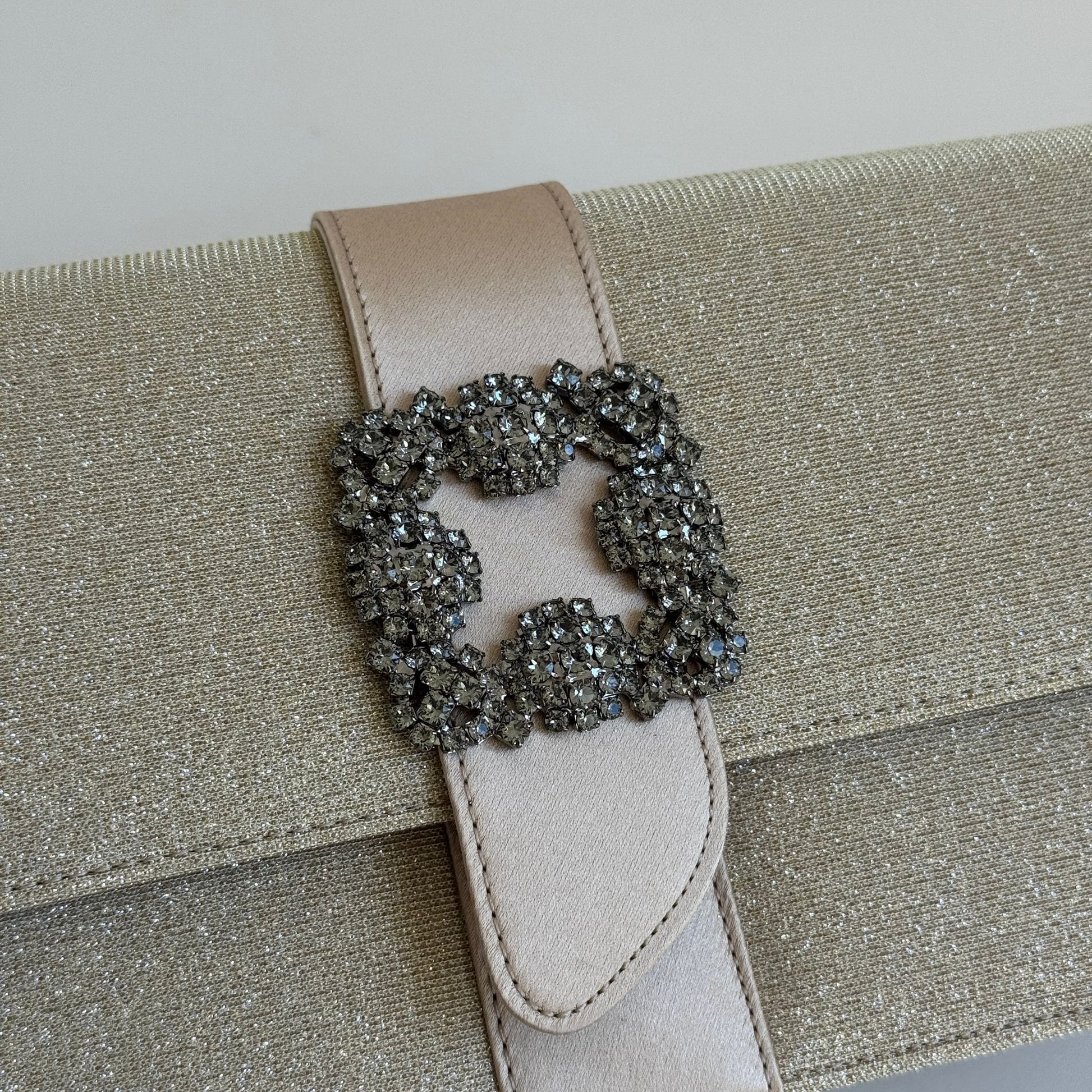 Iconica borsa Manolo Blahnik modello Capri Glitter in lurex oro con dettagli in raso e la classica fibbia Buckle. Si indossa a mano, a spalla e a tracolla. La tracolla è rimovibile e non regolabile. È presente un piccolo specchietto e una seconda tracolla più corta