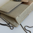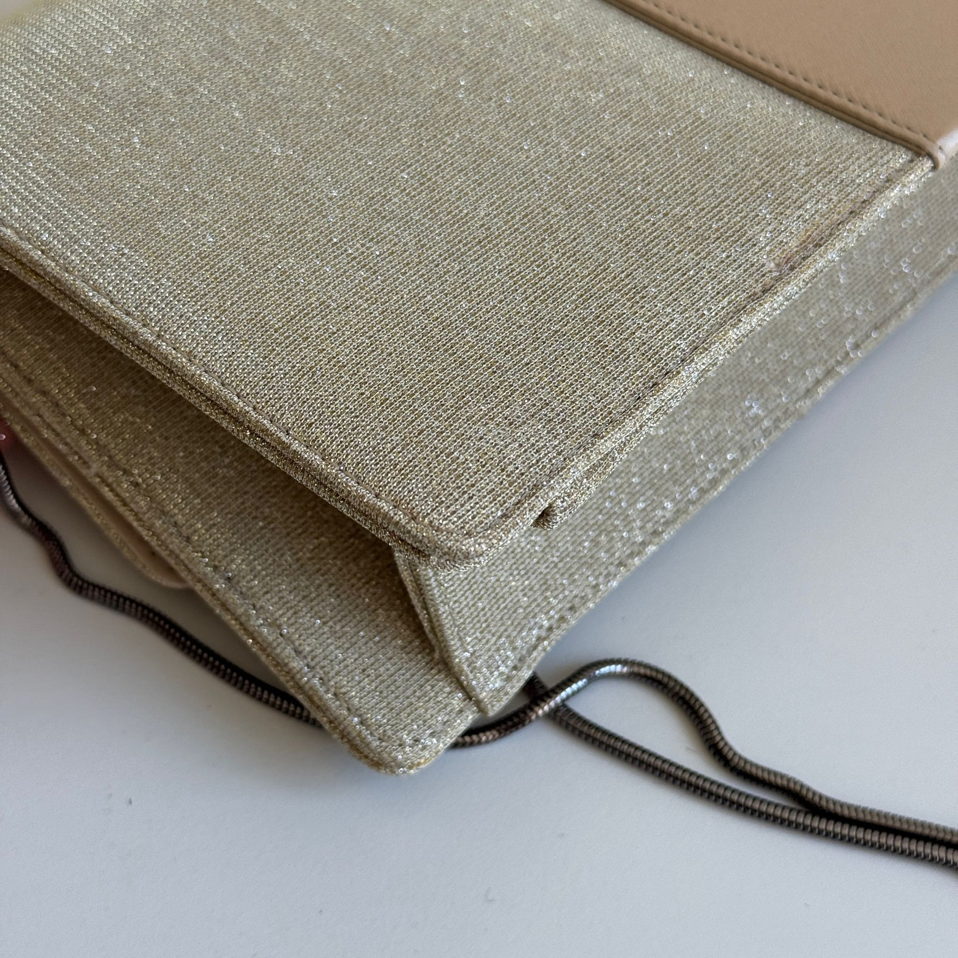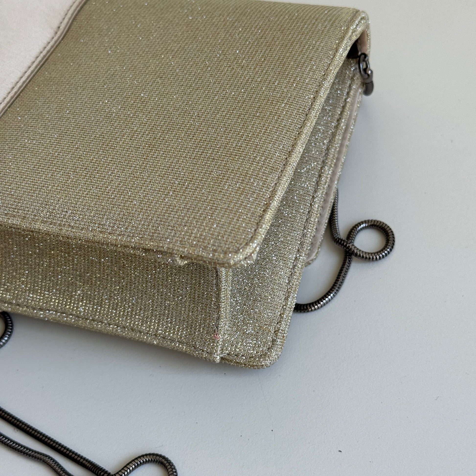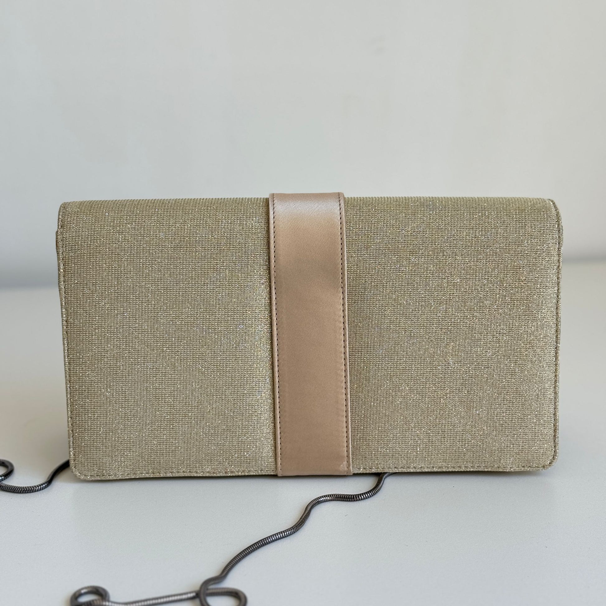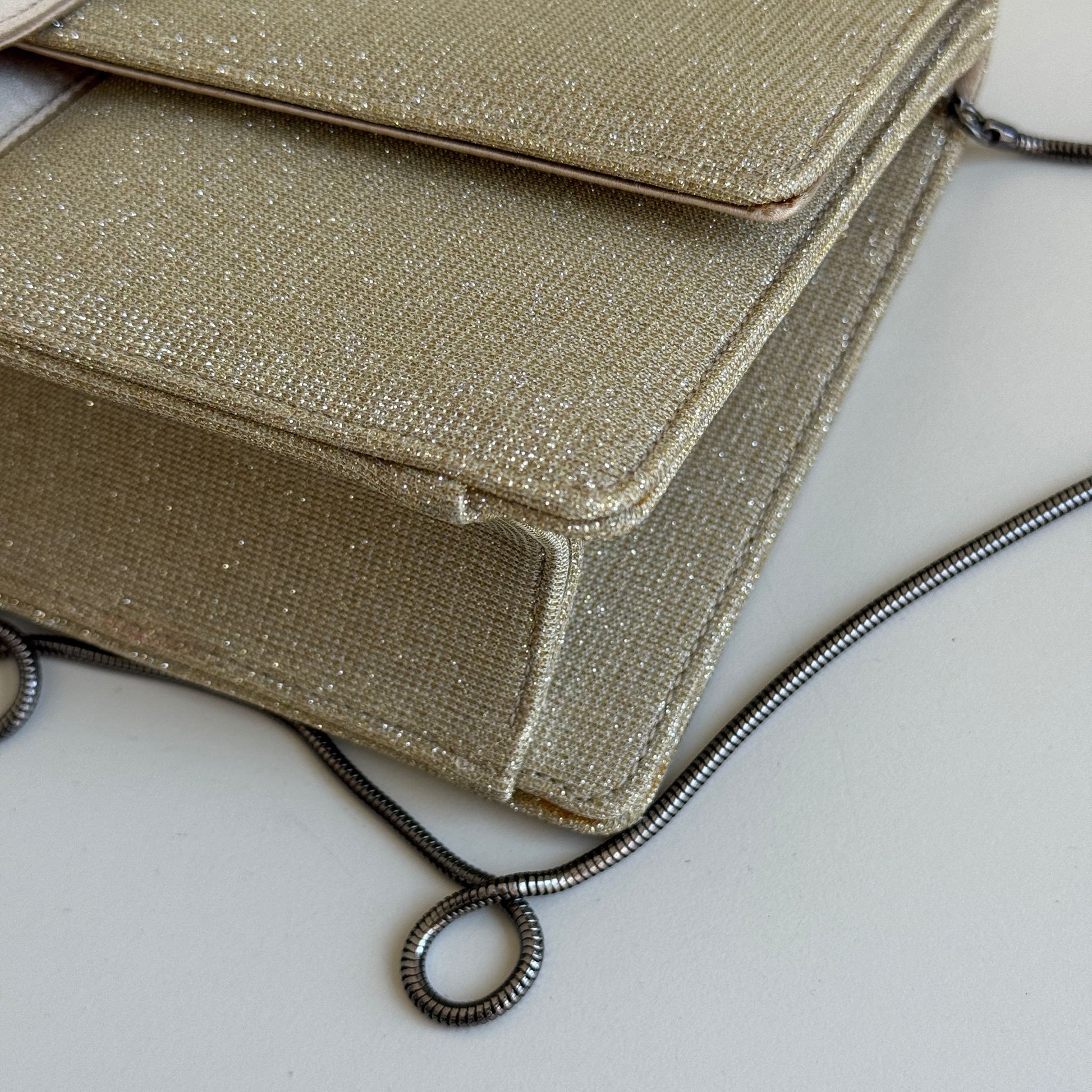 Iconica borsa Manolo Blahnik modello Capri Glitter in lurex oro con dettagli in raso e la classica fibbia Buckle. Si indossa a mano, a spalla e a tracolla. La tracolla è rimovibile e non regolabile. È presente un piccolo specchietto e una seconda tracolla più corta