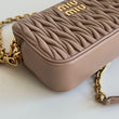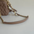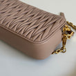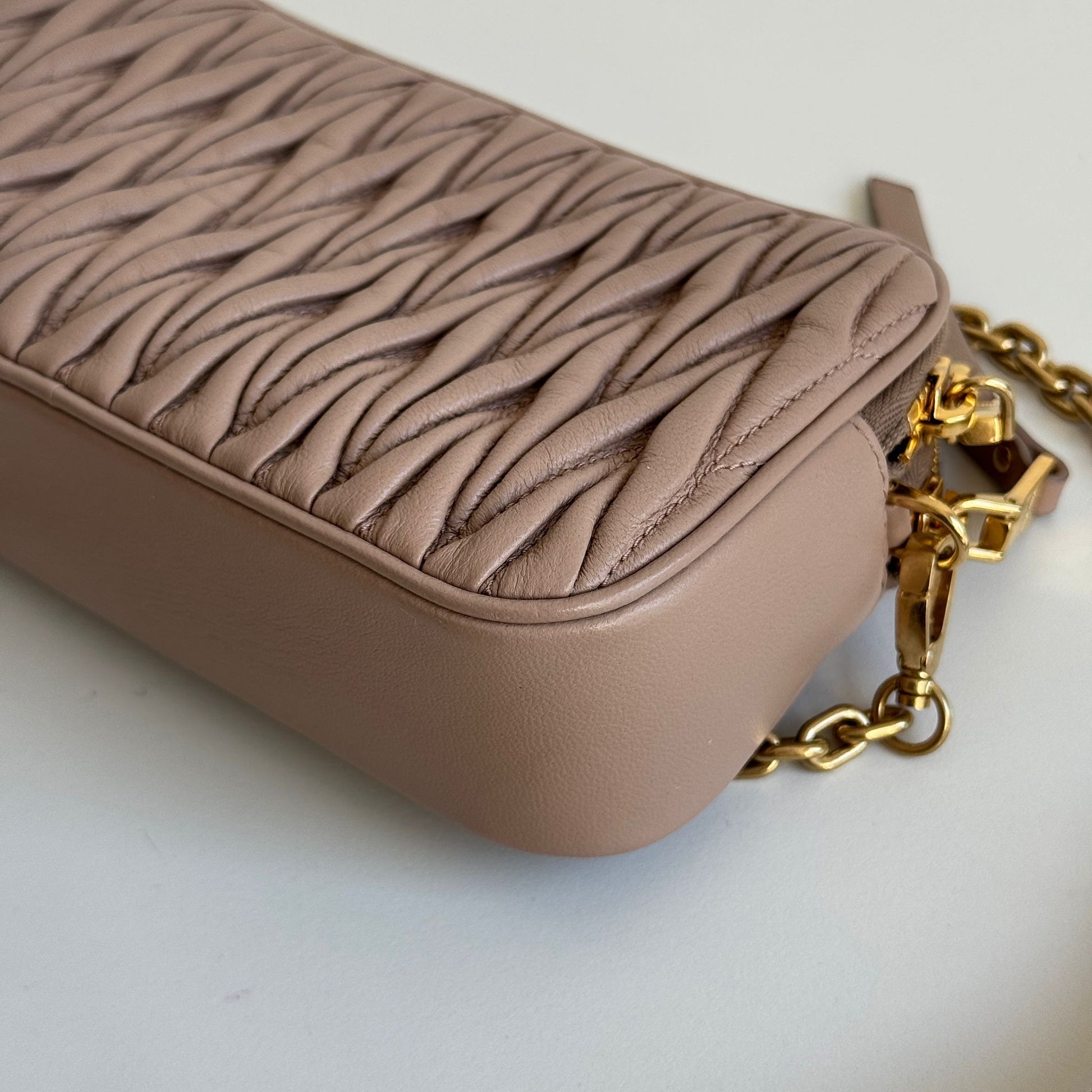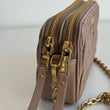 Stupenda borsa Miu Miu modello Camera Bag in pelle matelassé Cameo con hardware oro. Si indossa a mano e a tracolla, la tracolla non è regolabile ma è rimovibile. Sono presenti degli scomparti per carte e tessere all’interno.