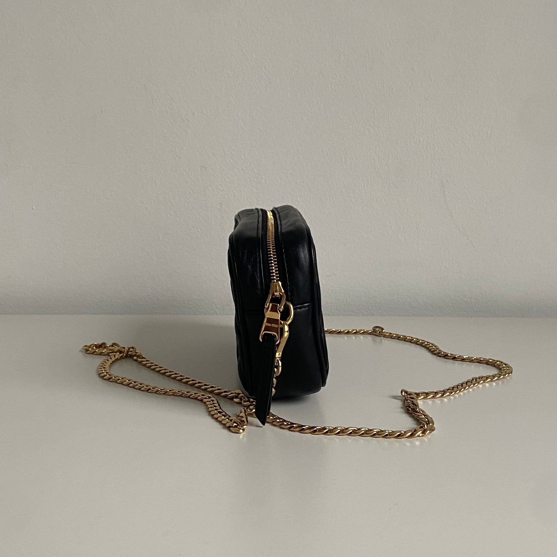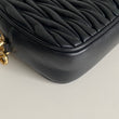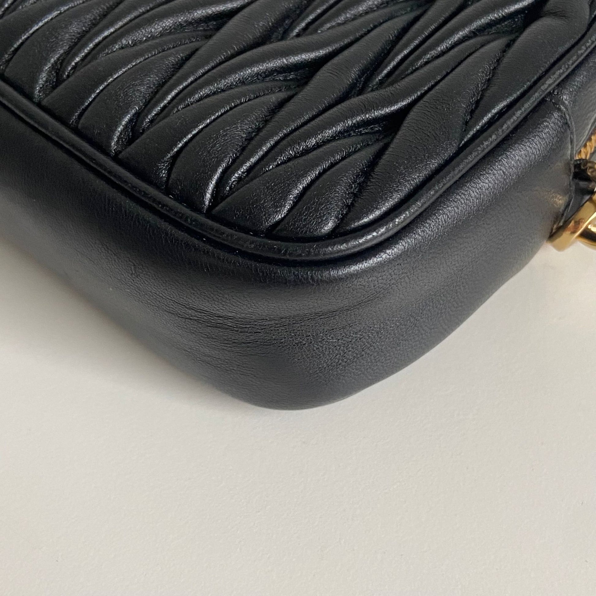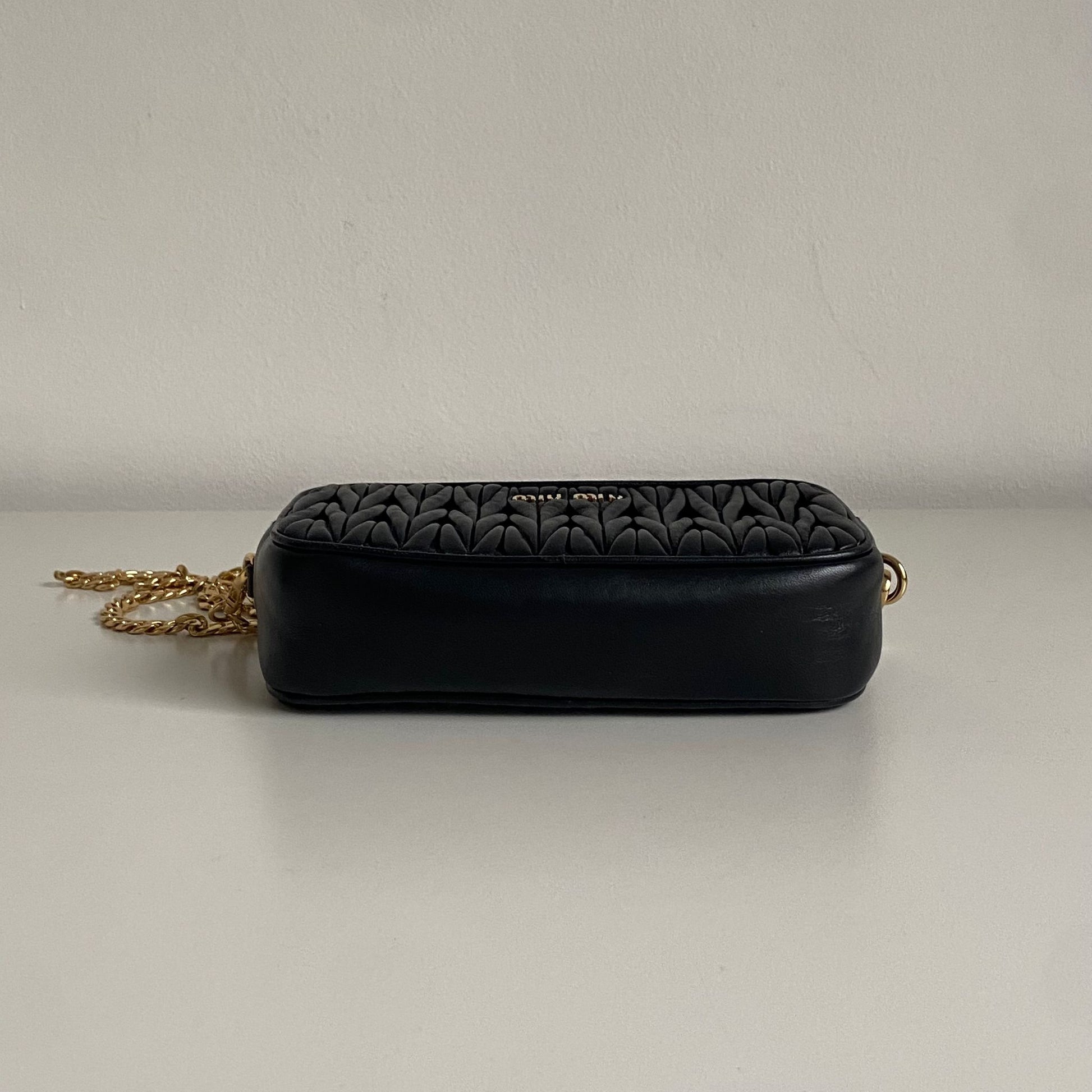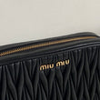 Bellissima pochette Miu Miu in pelle matelassé nera e hardware giro. Si indossa a mano, a tracolla ed eventualmente con una cintura in vita. La catena è rimovibile ma non regolabile.