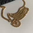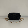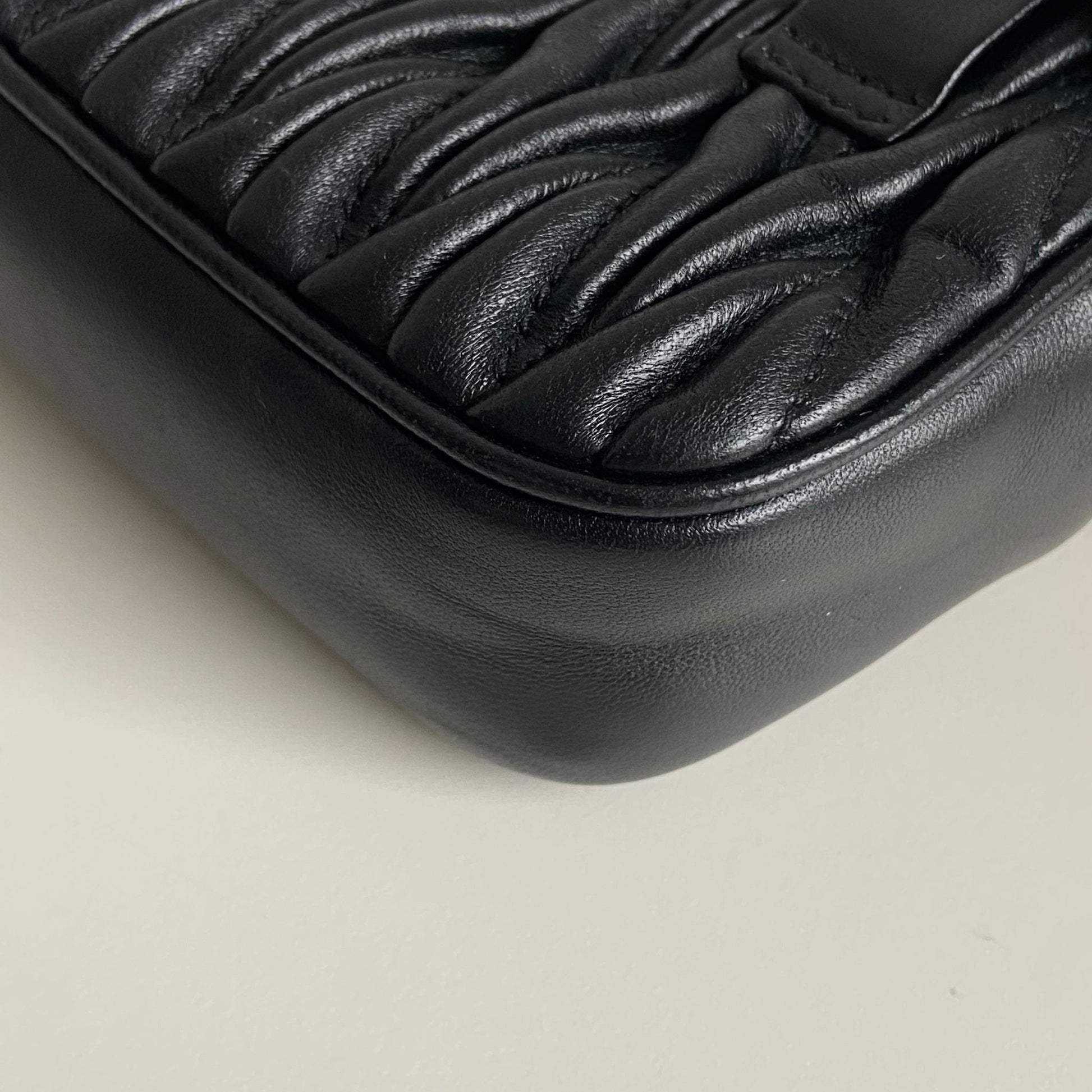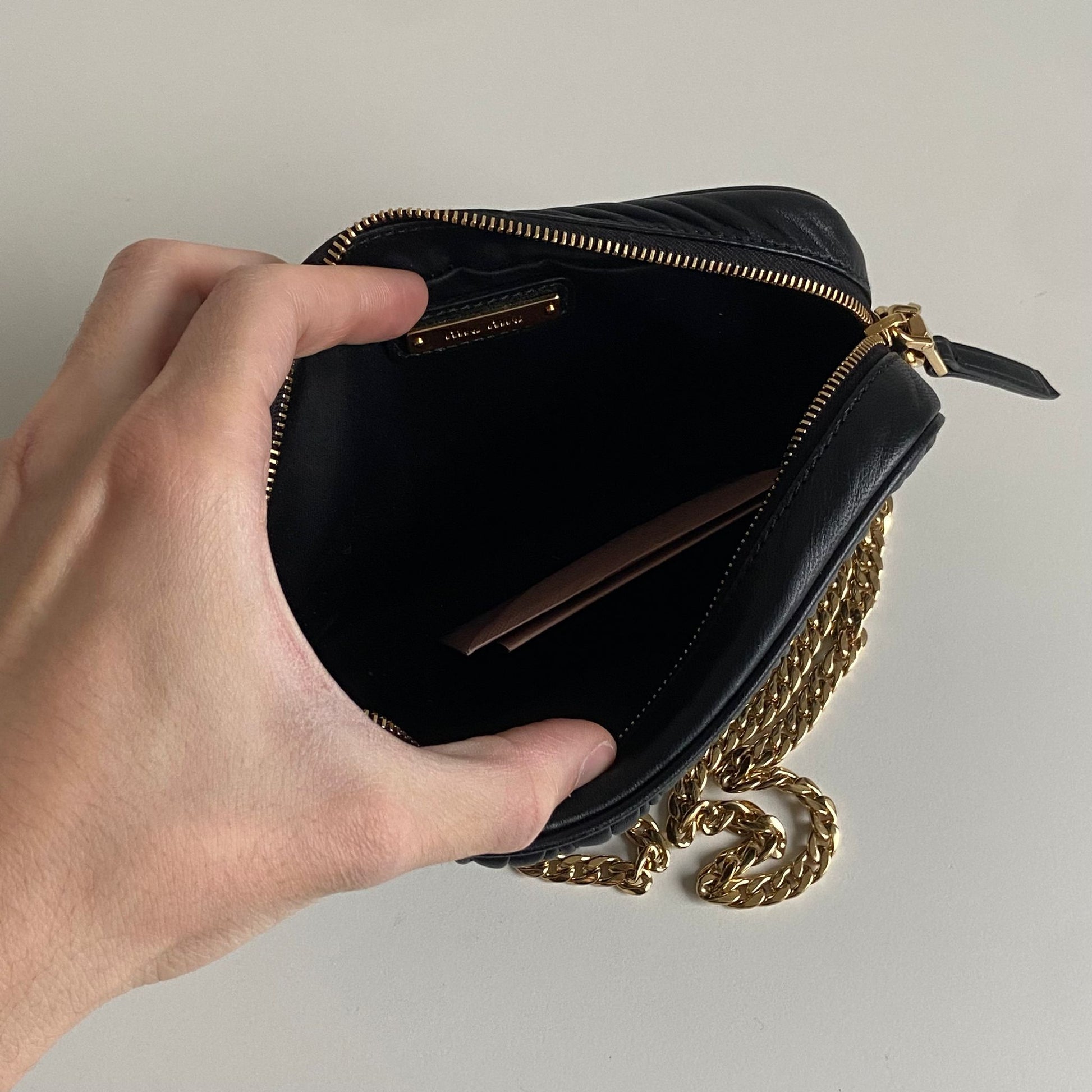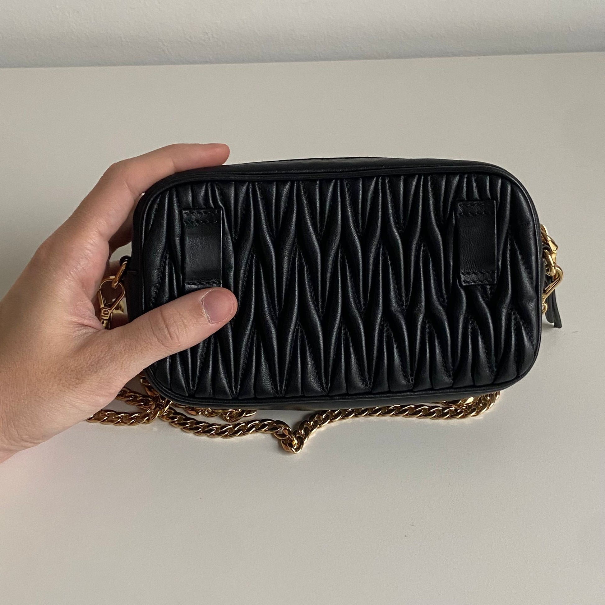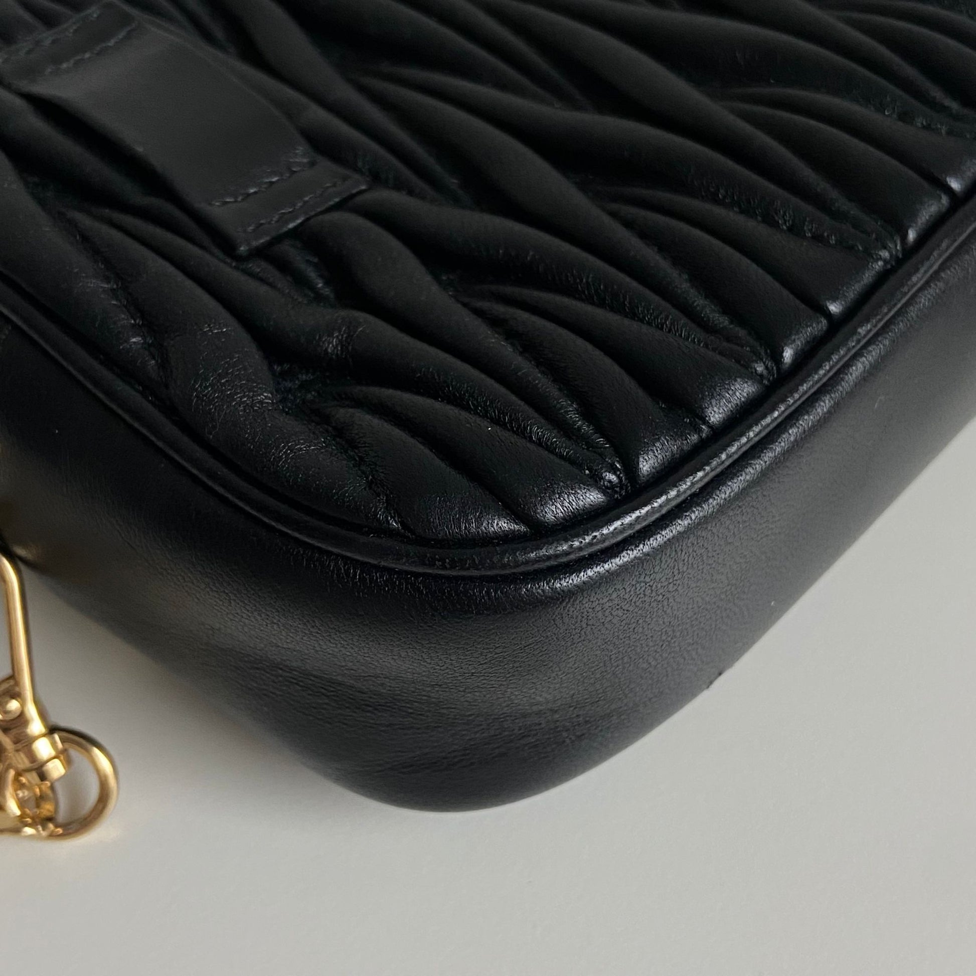 Bellissima pochette Miu Miu in pelle matelassé nera e hardware giro. Si indossa a mano, a tracolla ed eventualmente con una cintura in vita. La catena è rimovibile ma non regolabile.