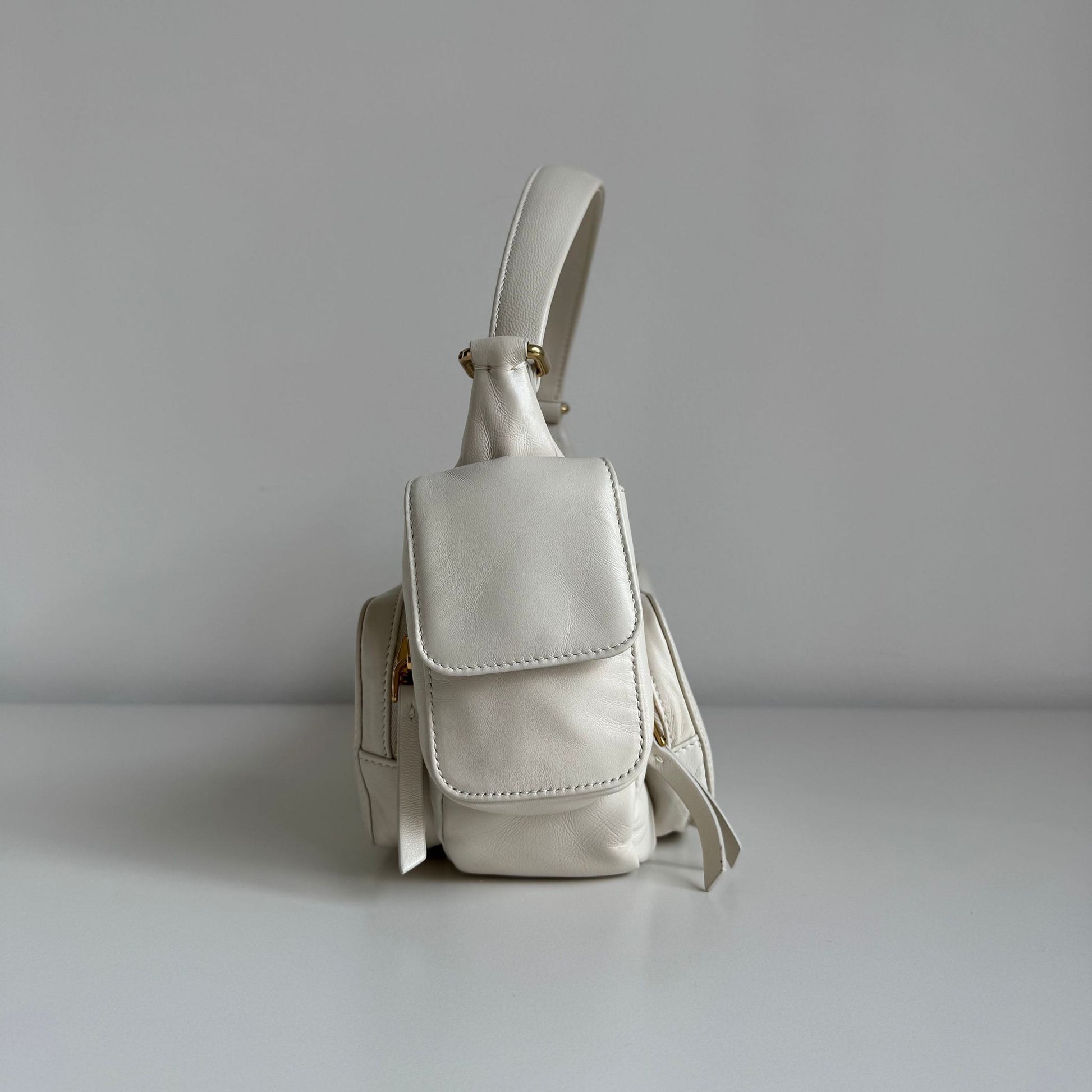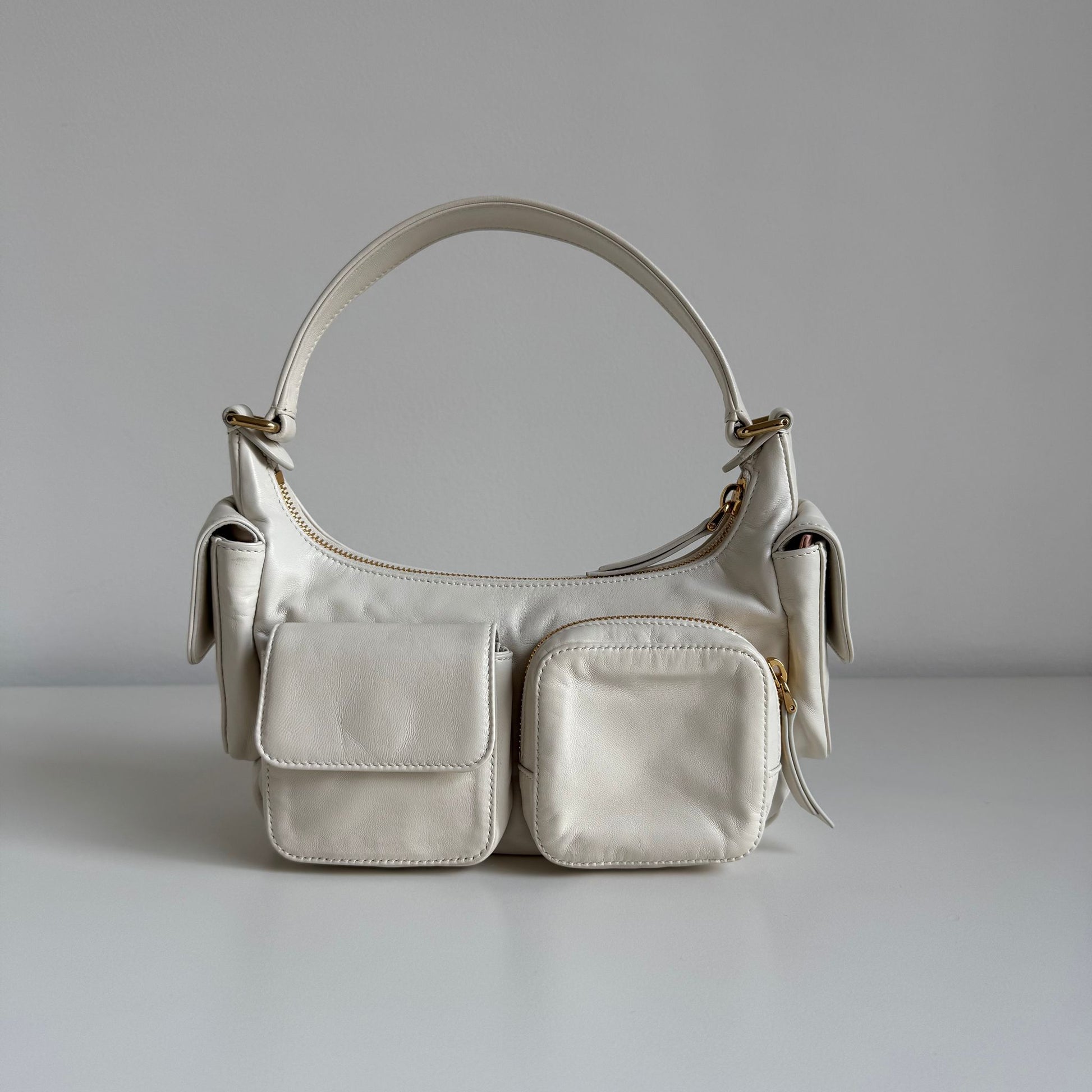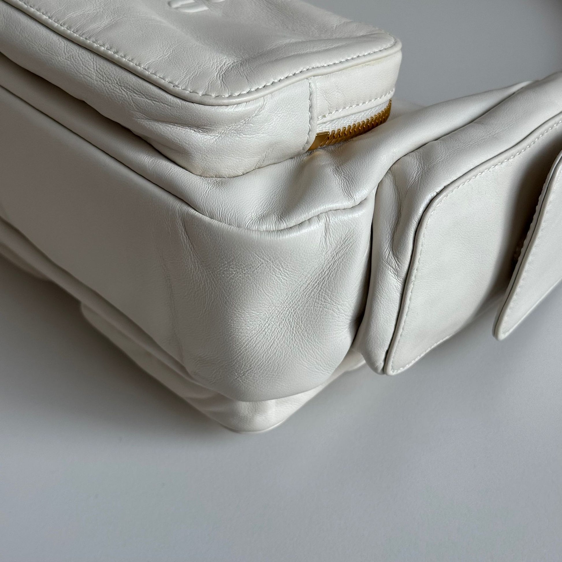 Morbidissima borsa MiuMiu modello Pocket in nappa bianca, arricchita da metalleria dorata, completano il design con tocchi di luce. Da indossare a spalla aggiunge un tocco di eleganza a qualsiasi look.