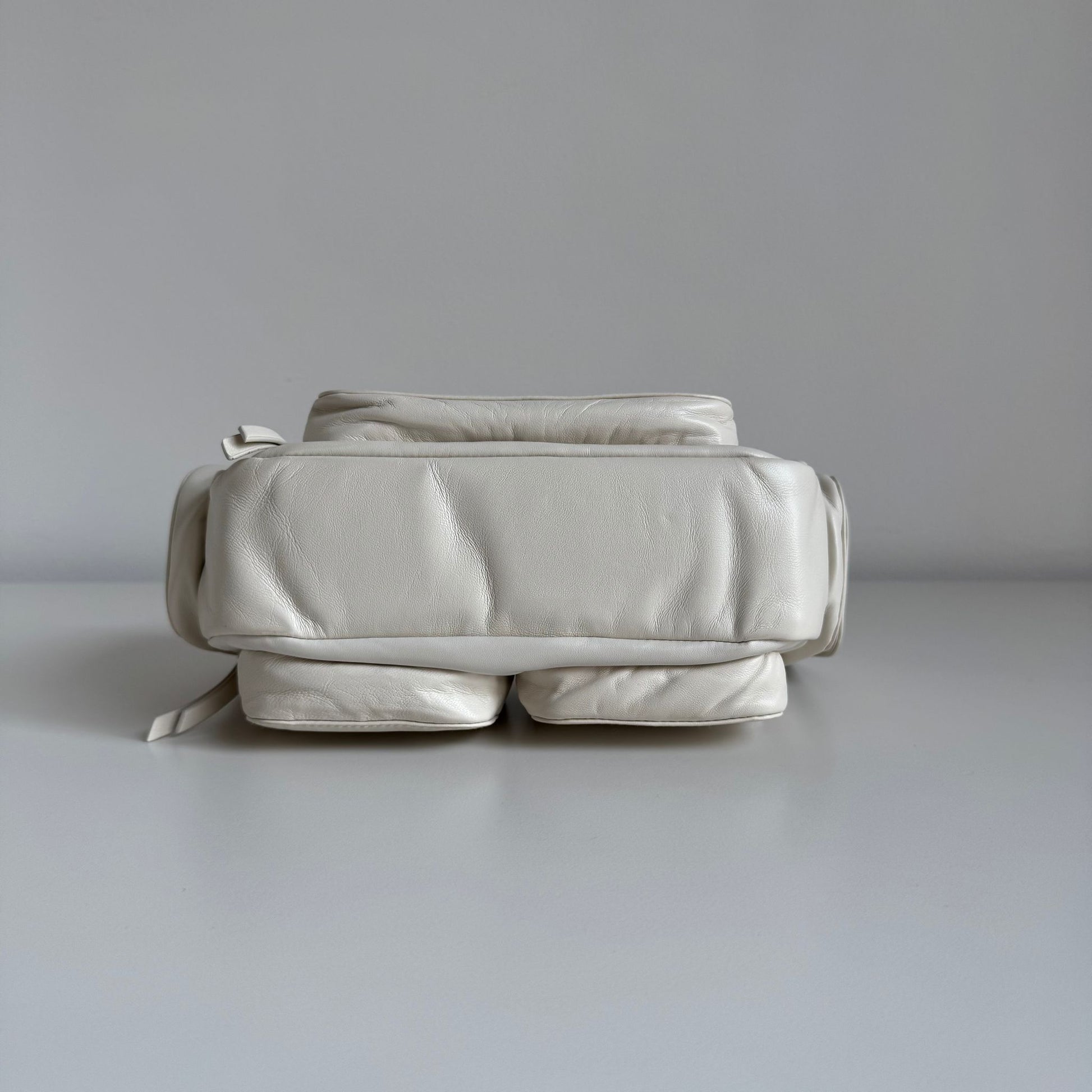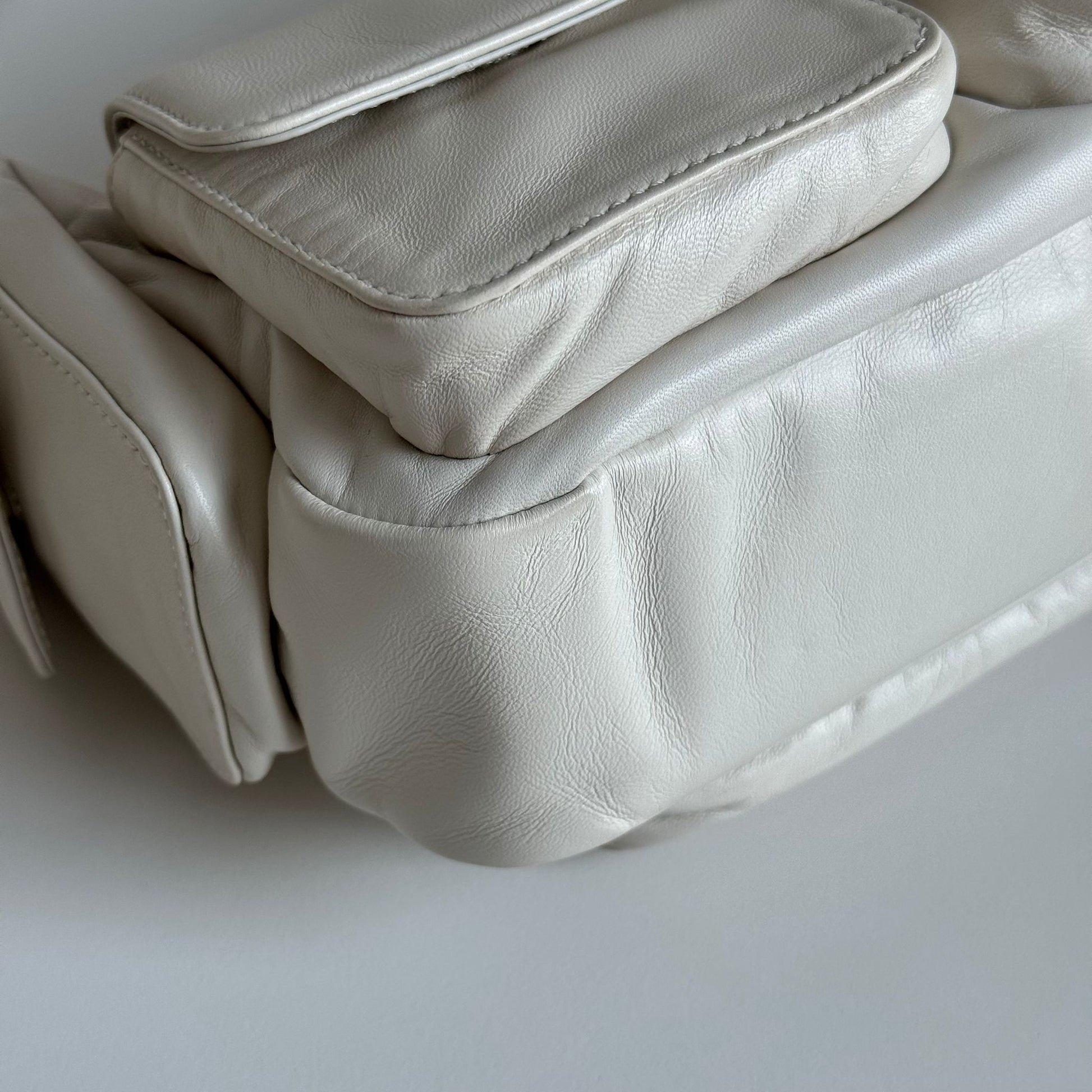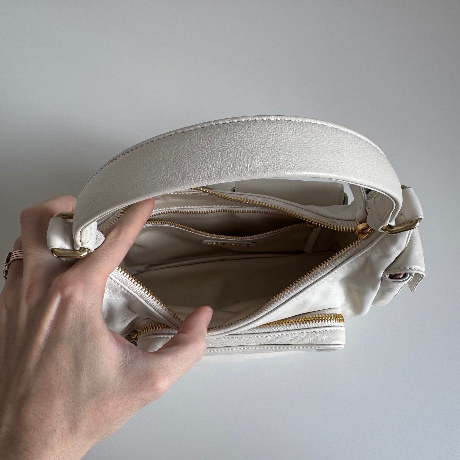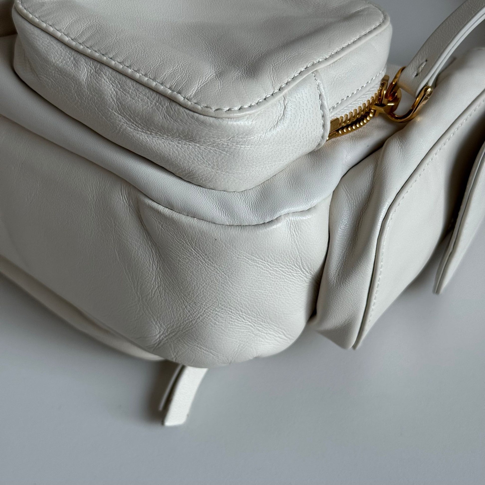Morbidissima borsa MiuMiu modello Pocket in nappa bianca, arricchita da metalleria dorata, completano il design con tocchi di luce. Da indossare a spalla aggiunge un tocco di eleganza a qualsiasi look.