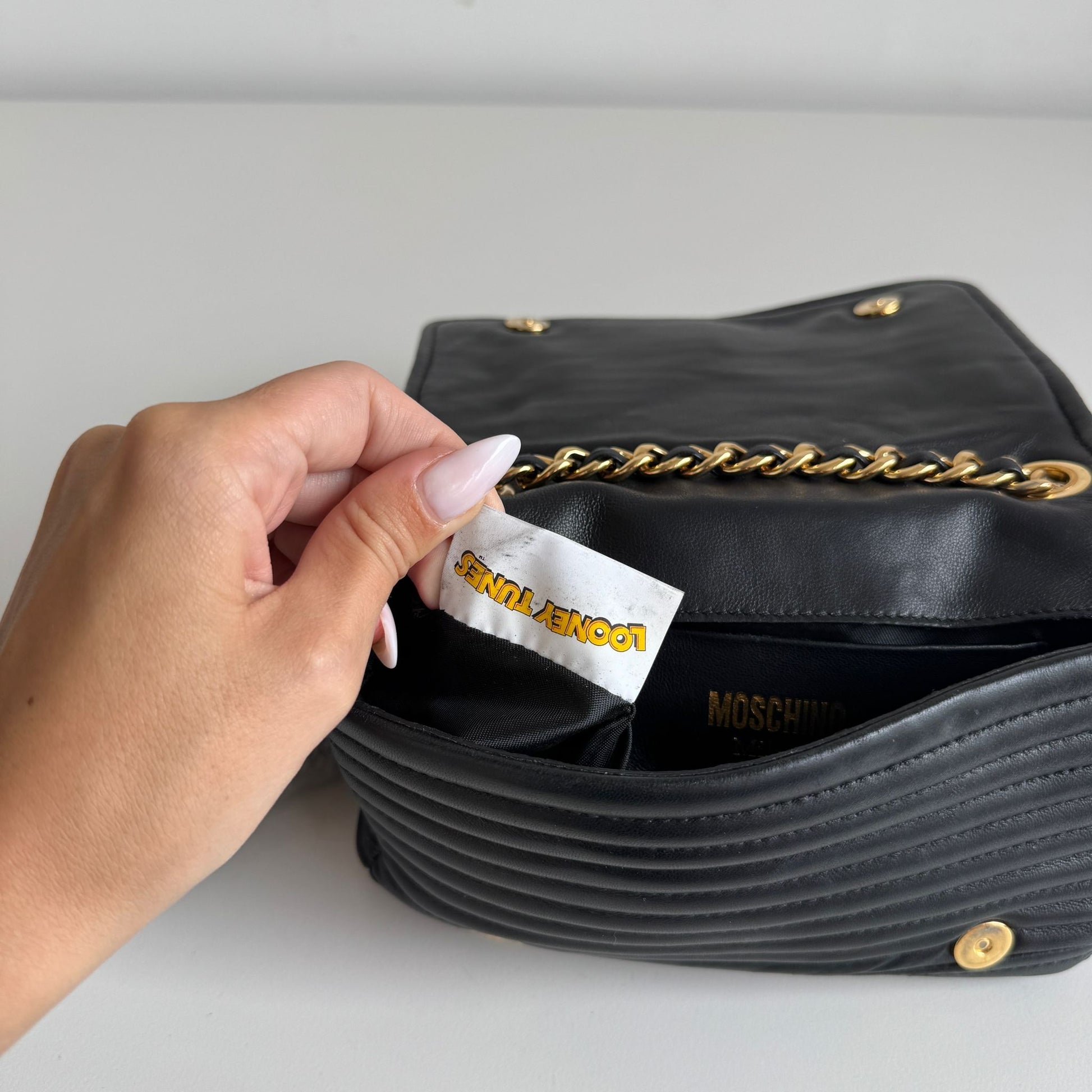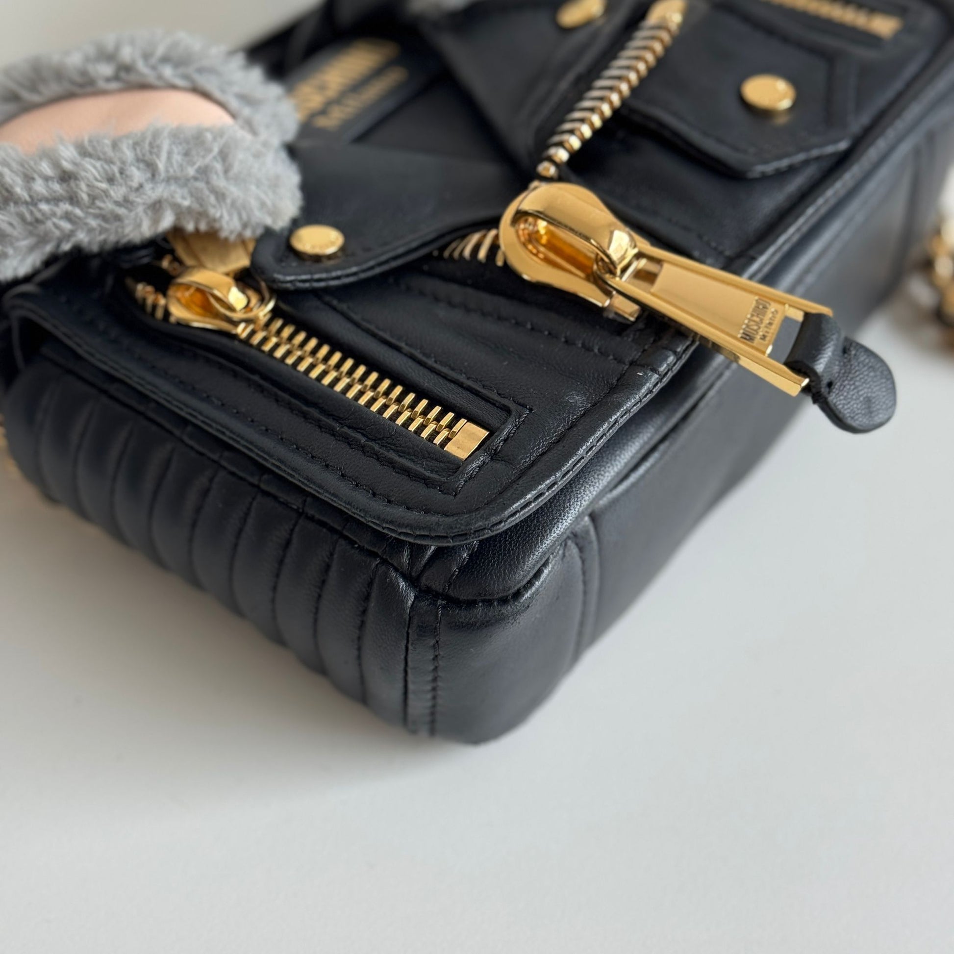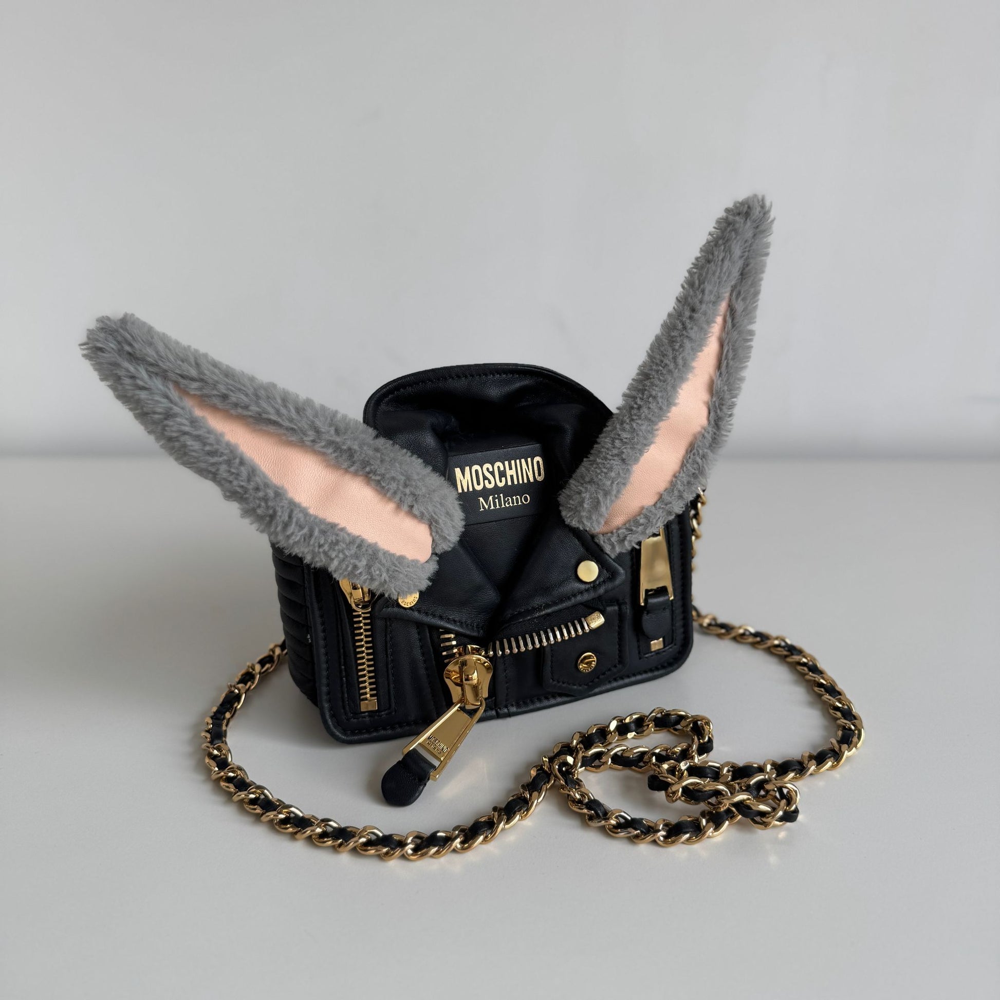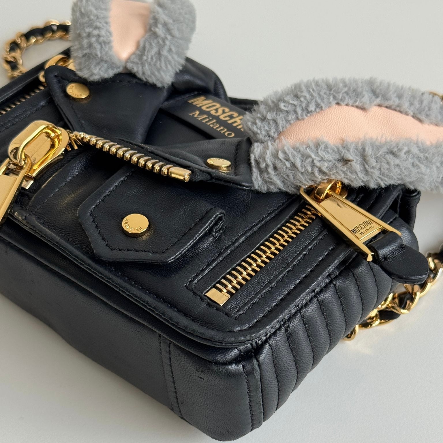Iconica borsa Moschino modello Biker in pelle nera con hardware oro e dettaglio orecchie in eco peliccia rimovibili. Della collezione Looney Tunes del 2023. Si indossa a tracolla e la catena non è rimovibile né regolabile.
