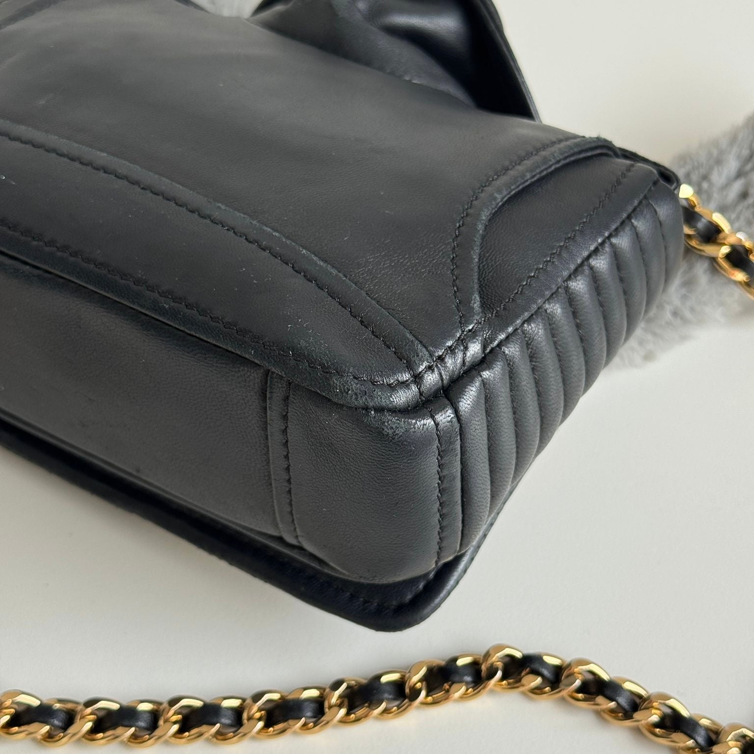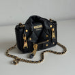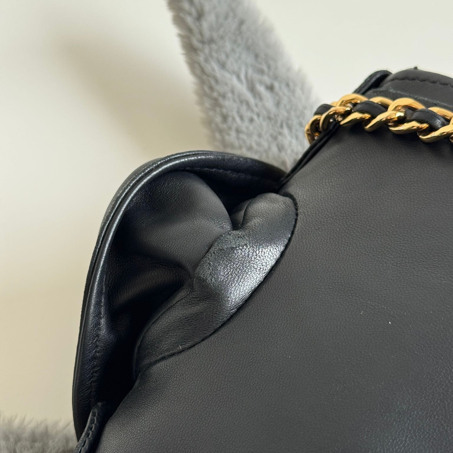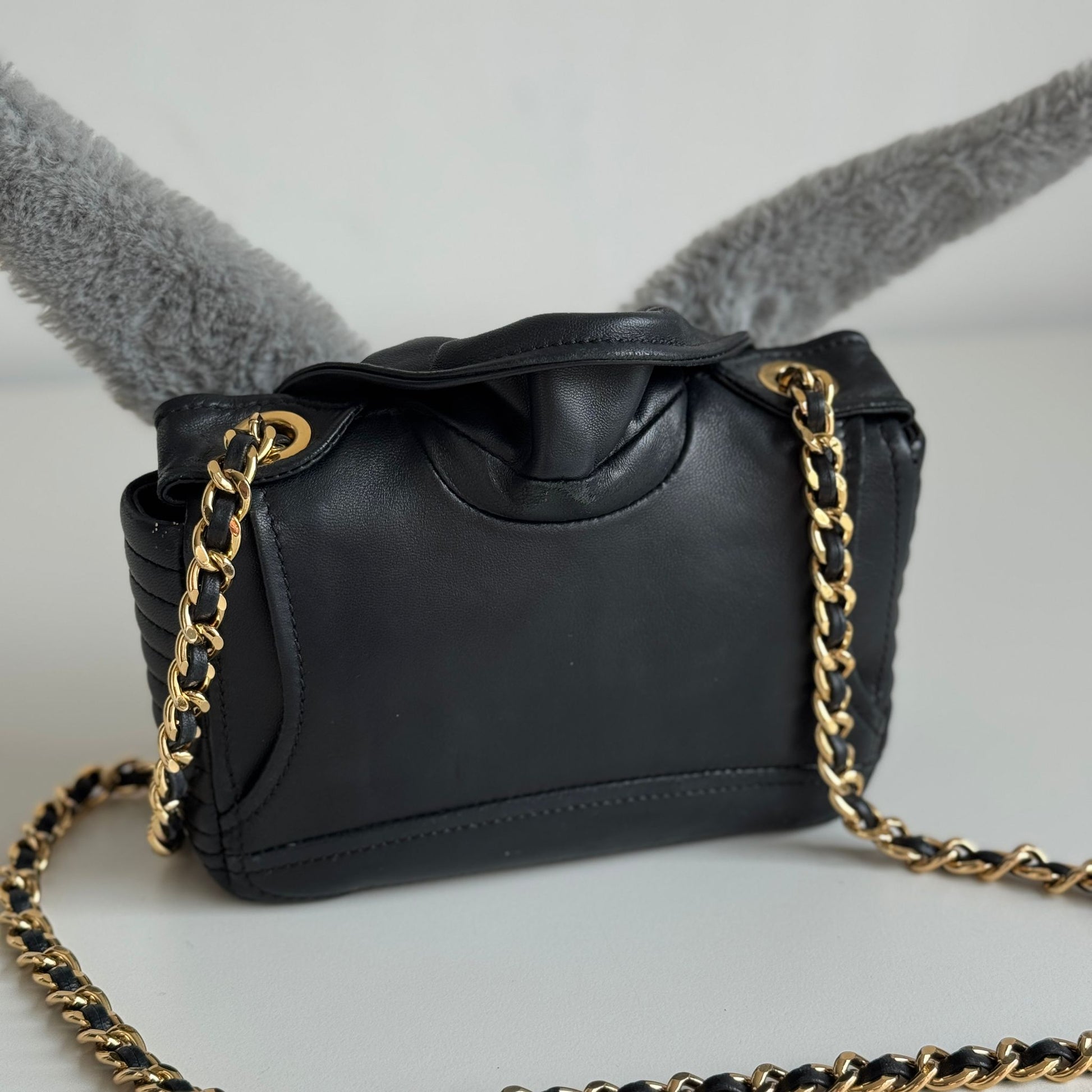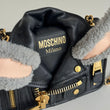 Iconica borsa Moschino modello Biker in pelle nera con hardware oro e dettaglio orecchie in eco peliccia rimovibili. Della collezione Looney Tunes del 2023. Si indossa a tracolla e la catena non è rimovibile né regolabile.