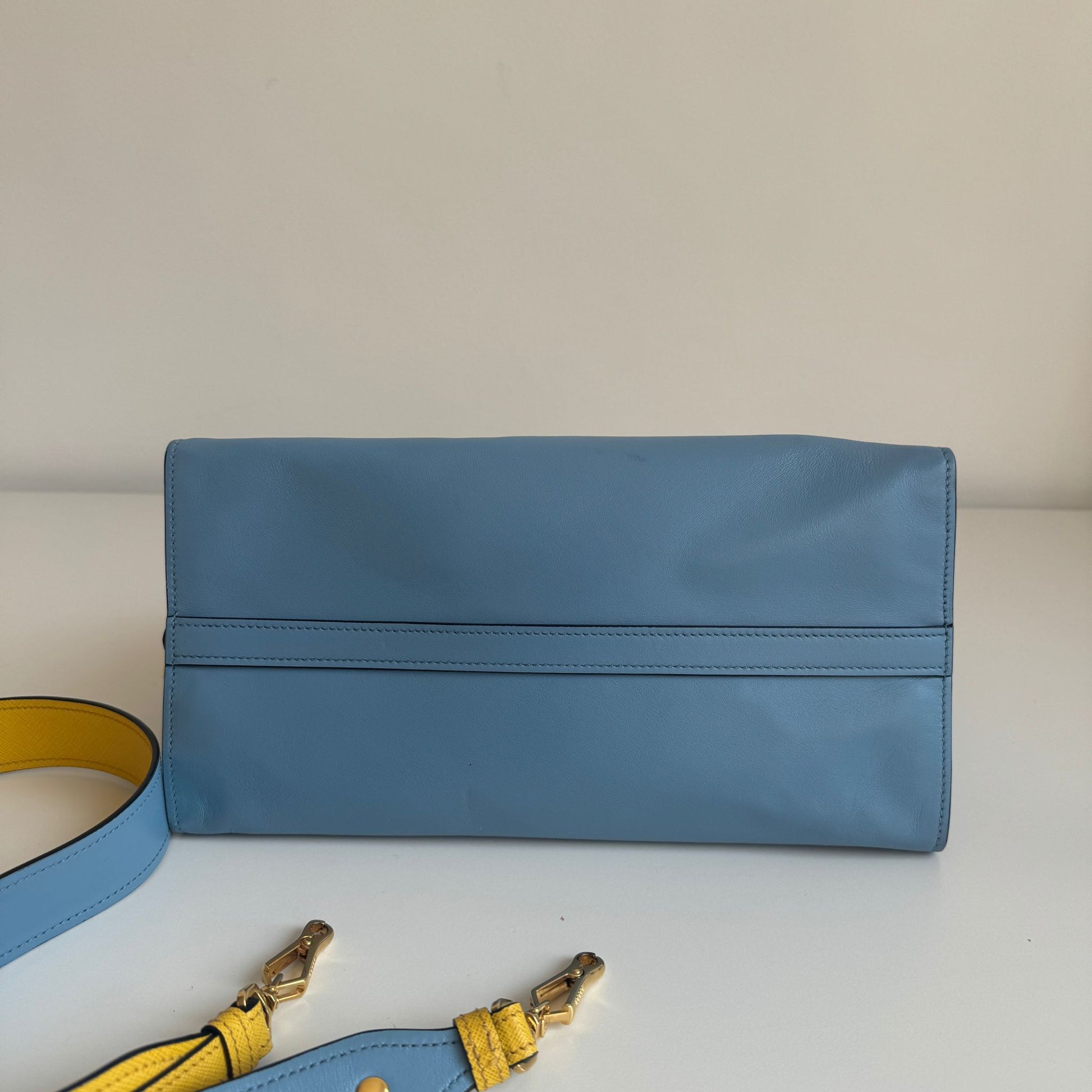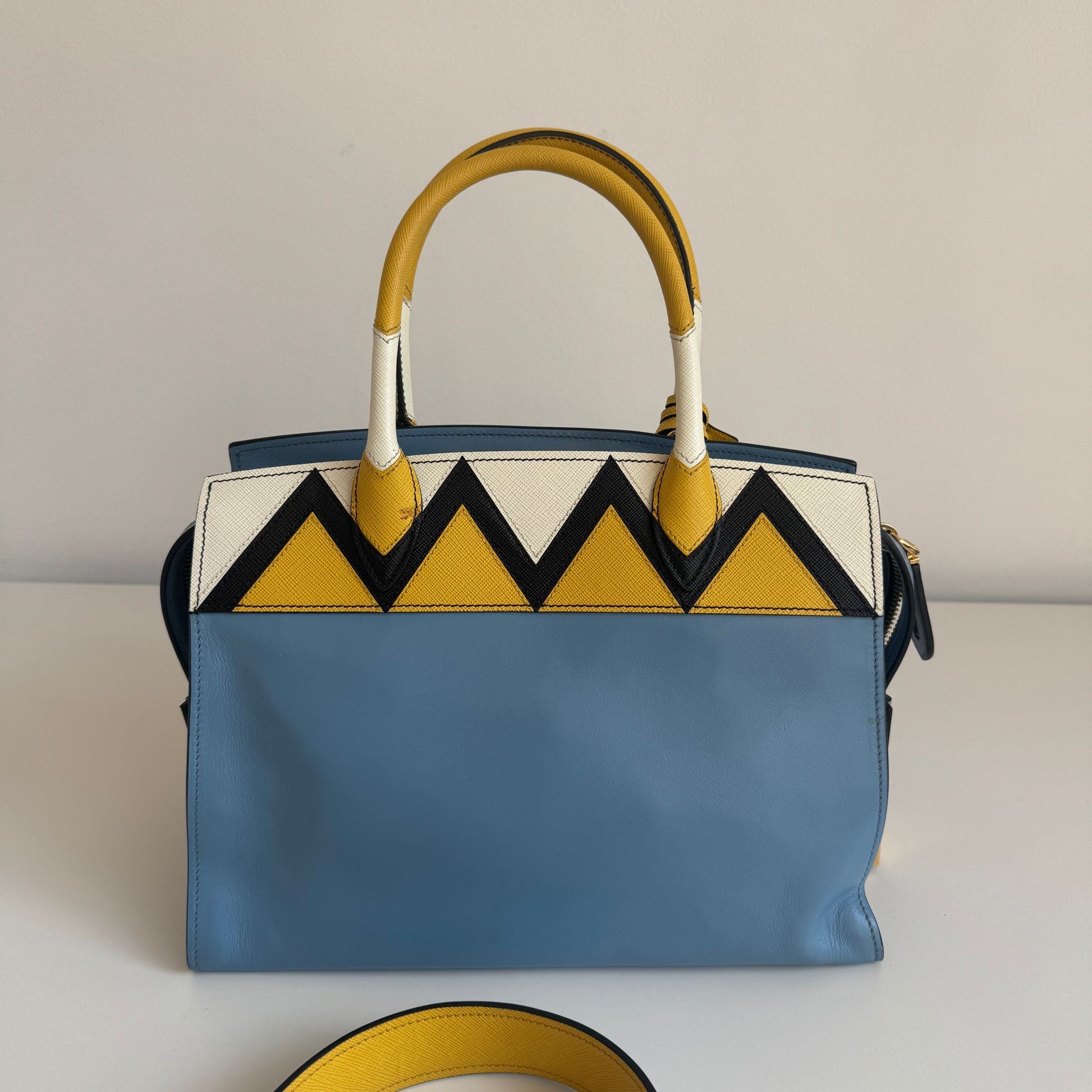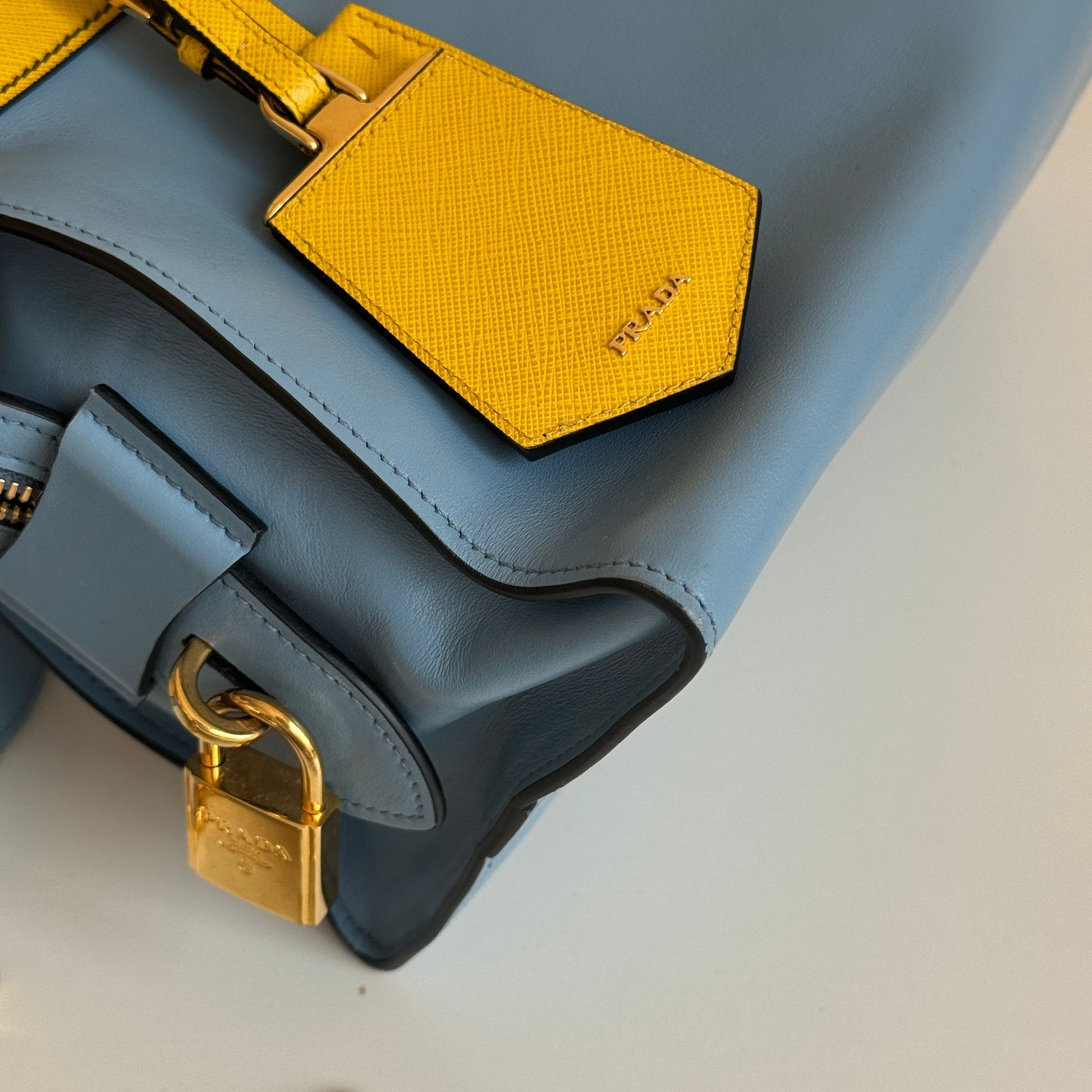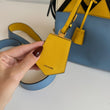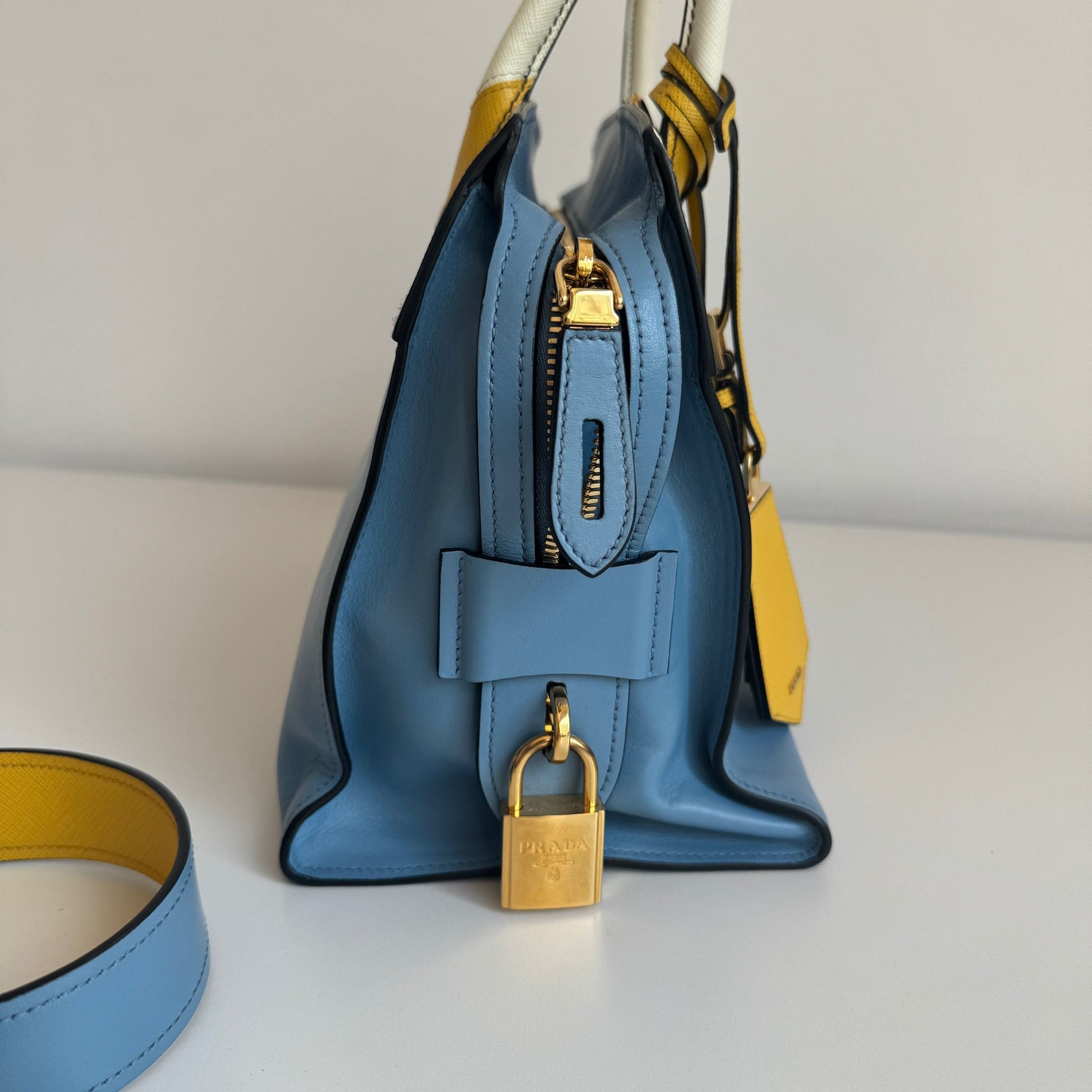 Meravigliosa borsa Prada modello Esplanade in pelle Calf City azzurra con dettagli in pelle Saffiano giallo-bianco-nero e hardware oro. Si indossa a mano o a tracolla, la tracolla è rimovibile ma non regolabile.