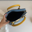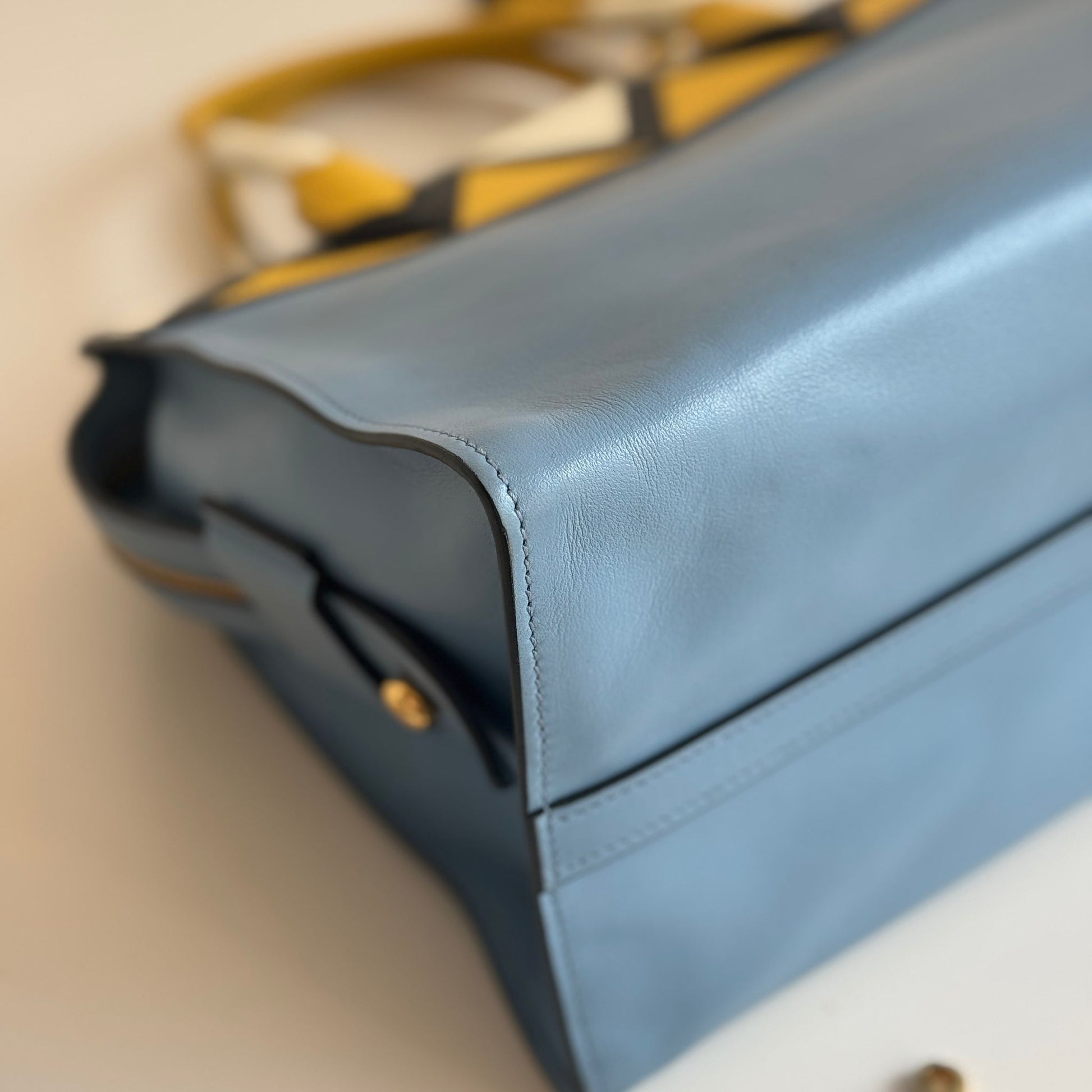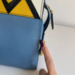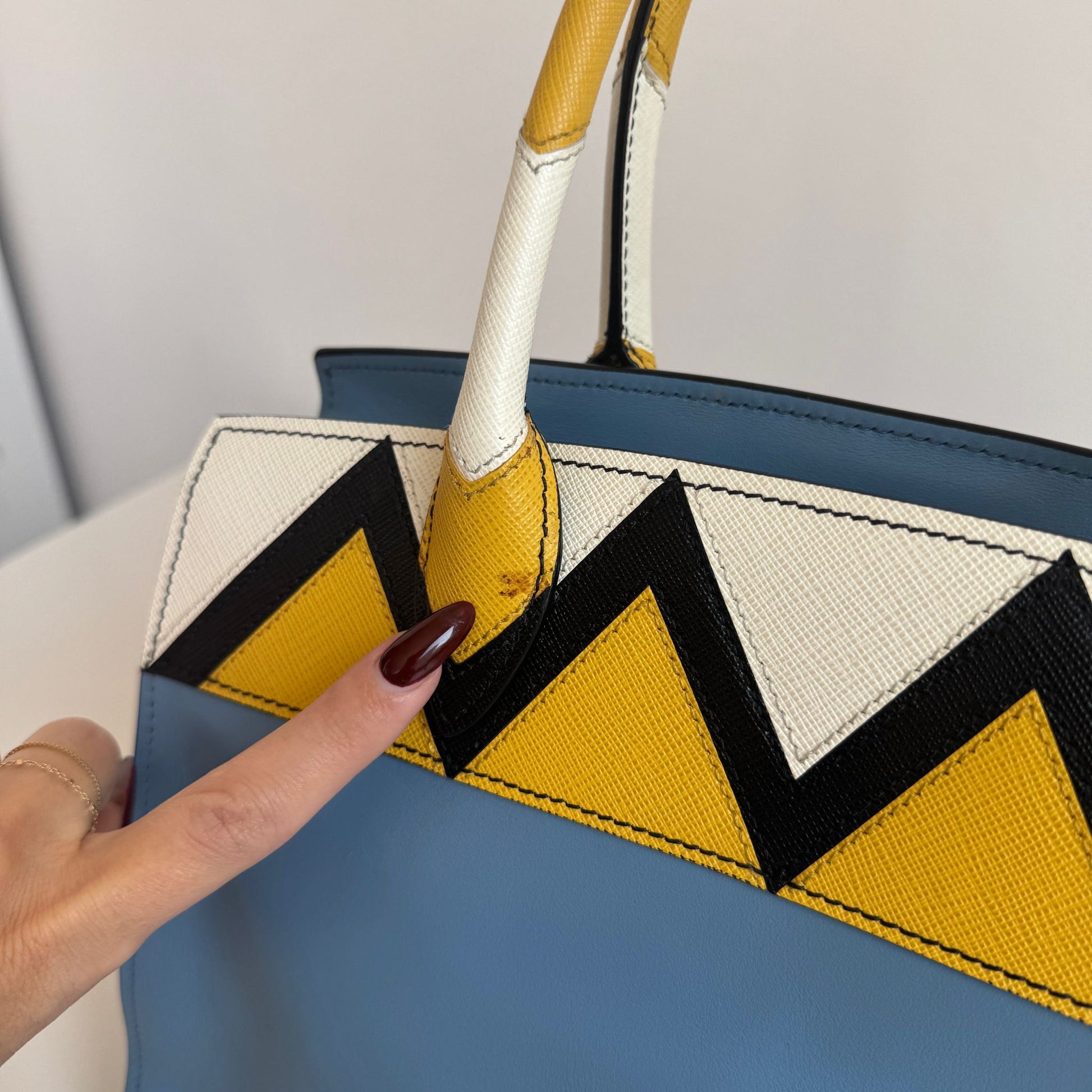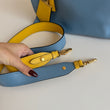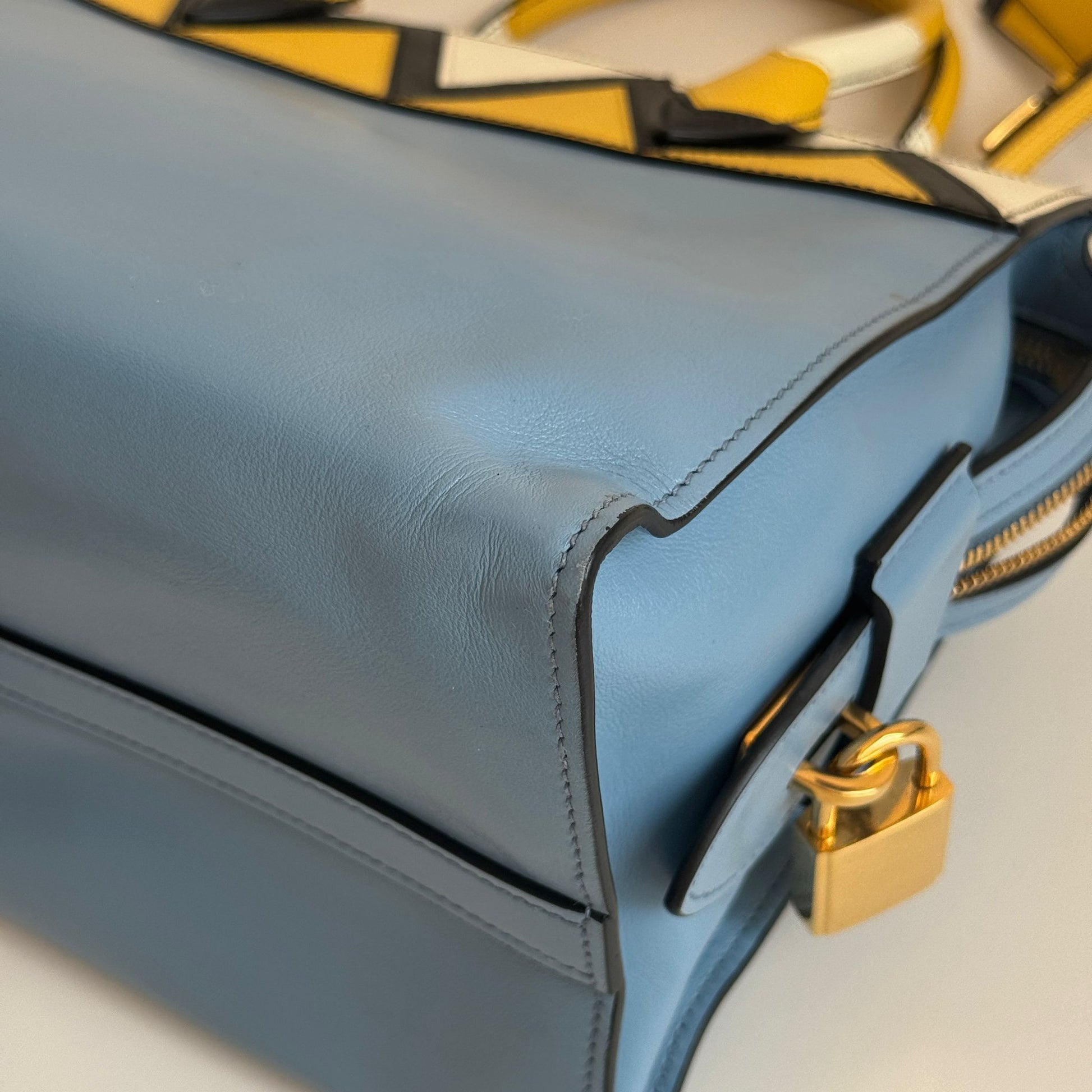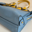 Meravigliosa borsa Prada modello Esplanade in pelle Calf City azzurra con dettagli in pelle Saffiano giallo-bianco-nero e hardware oro. Si indossa a mano o a tracolla, la tracolla è rimovibile ma non regolabile.
