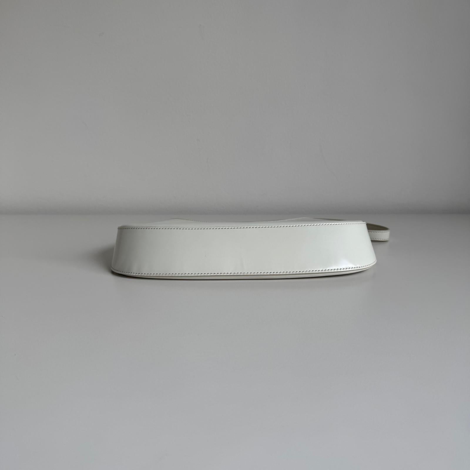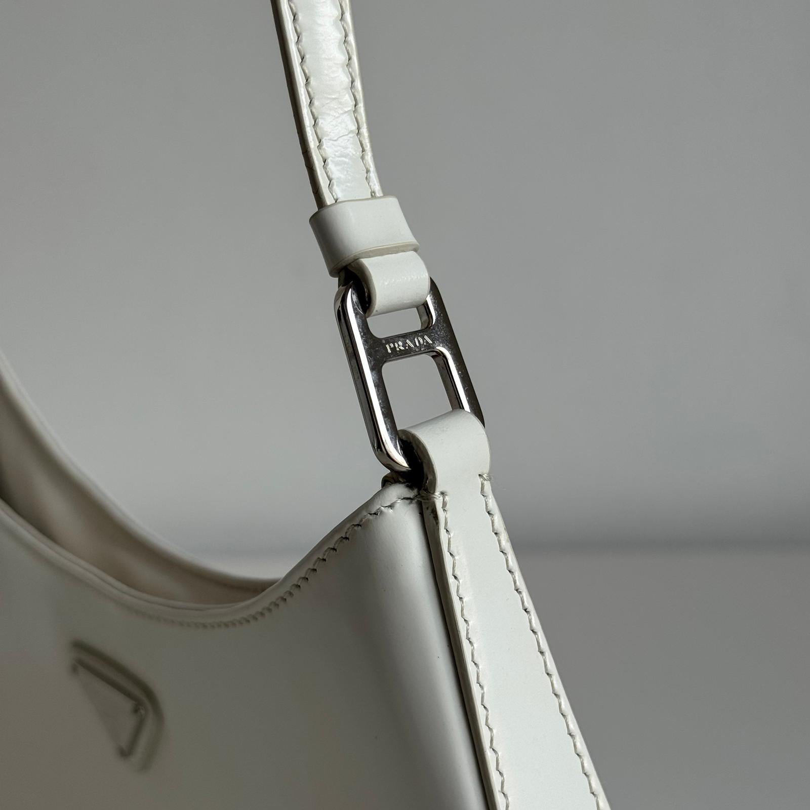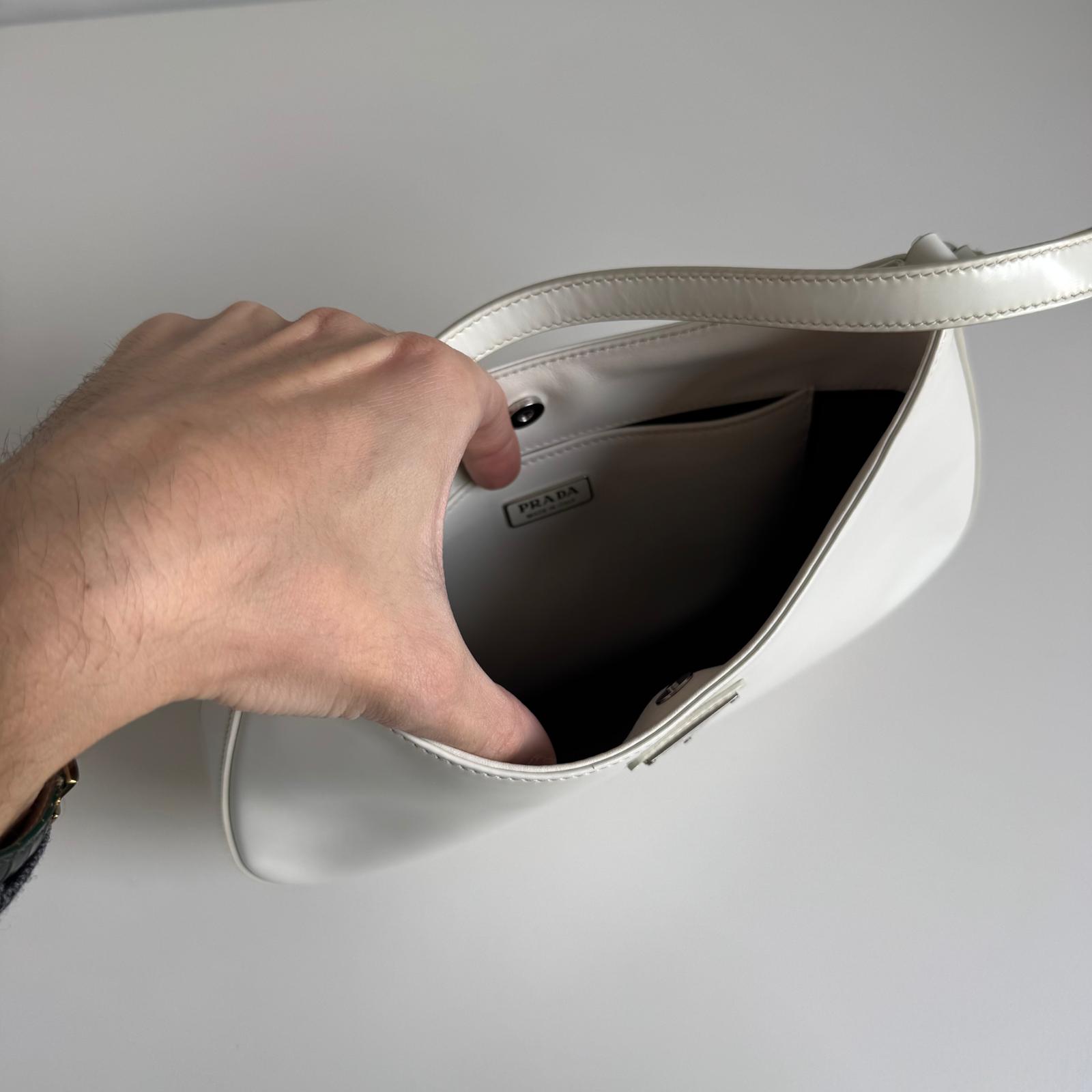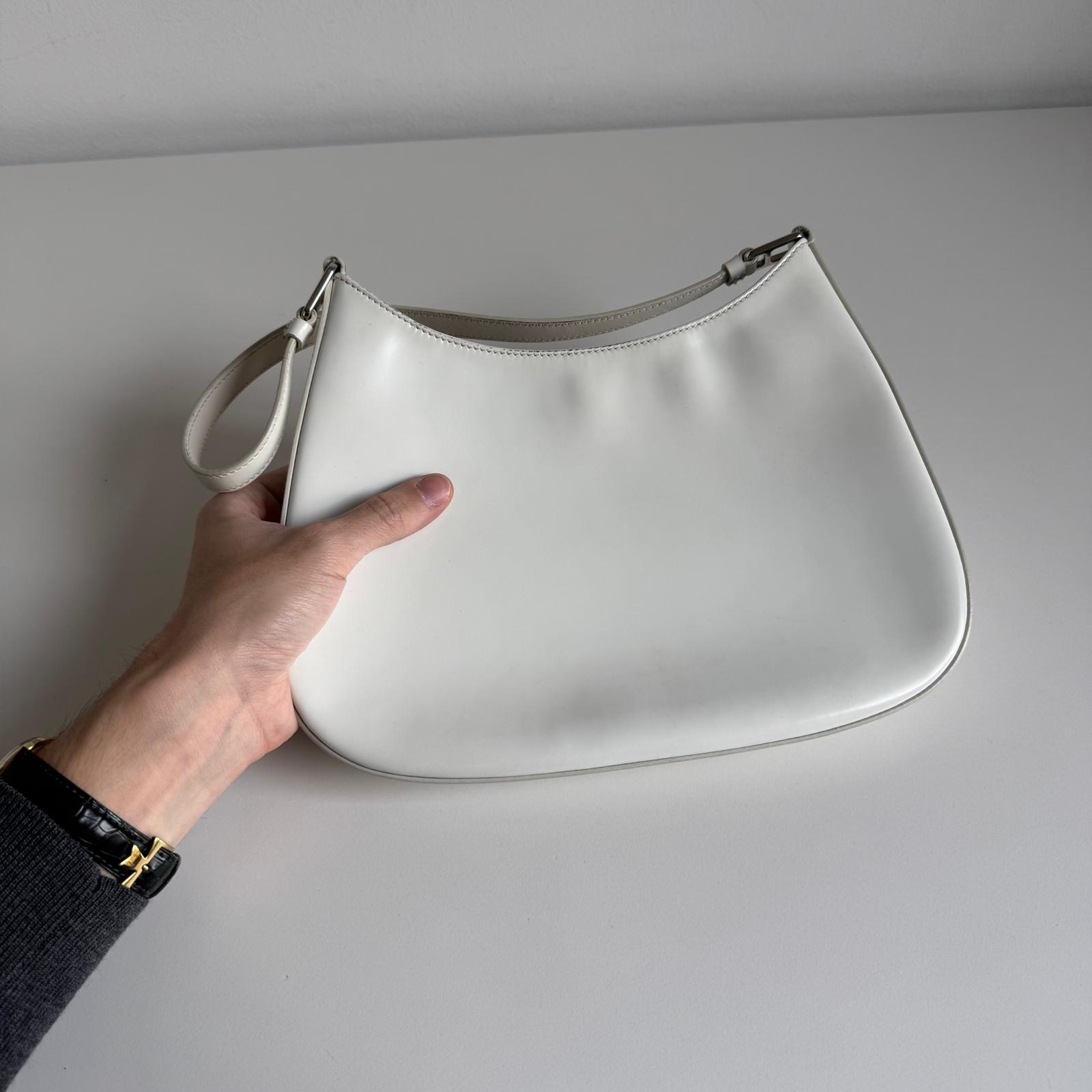Meravigliosa borsa Prada modello Cleo in pelle bianca, spazzolata e hardware argento. Si indossa a spalla.