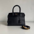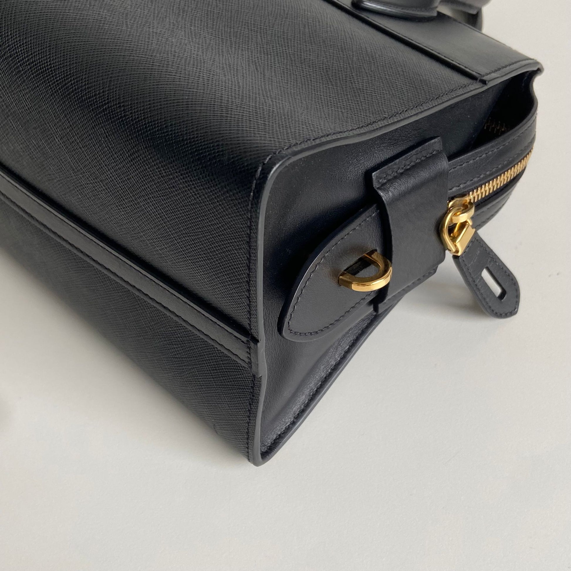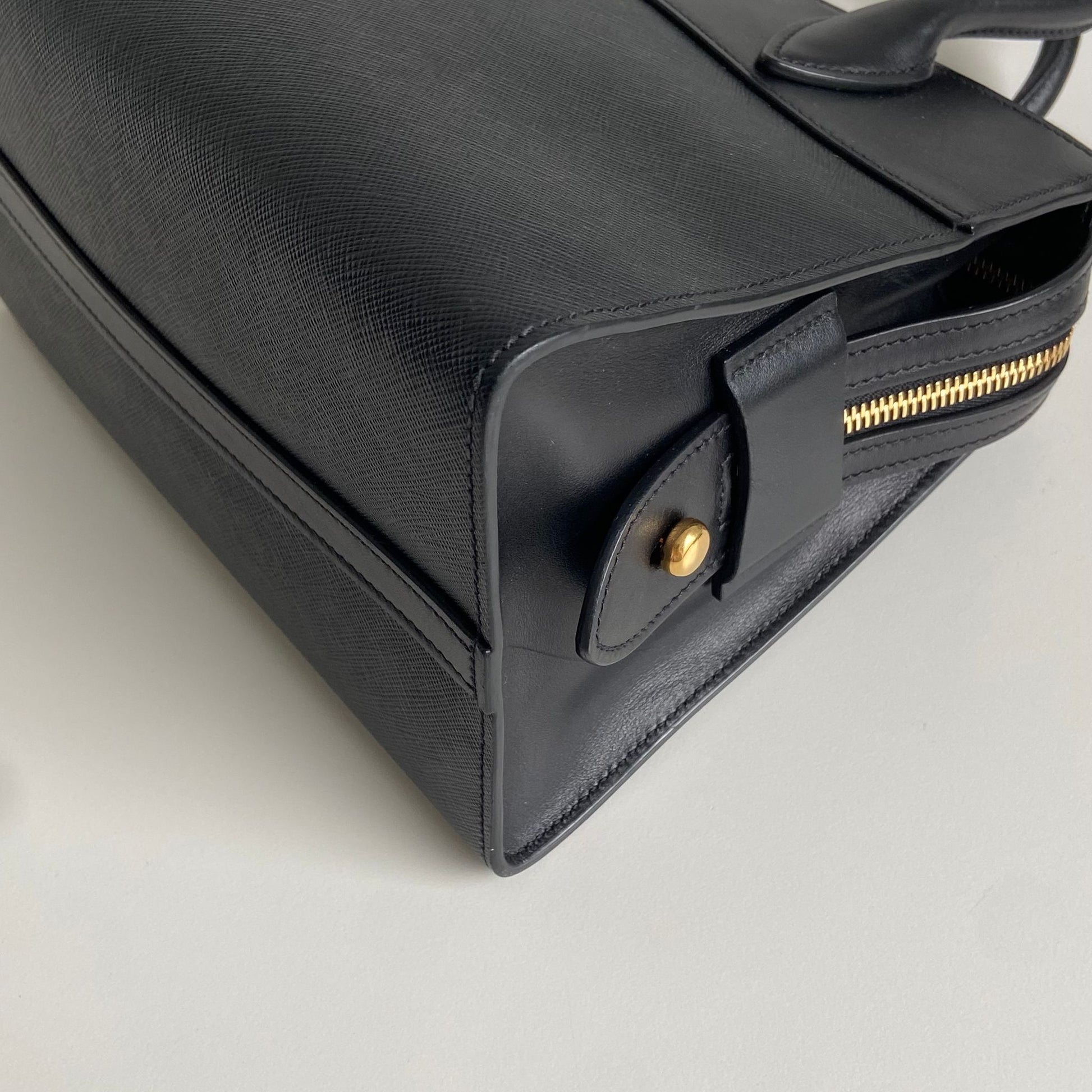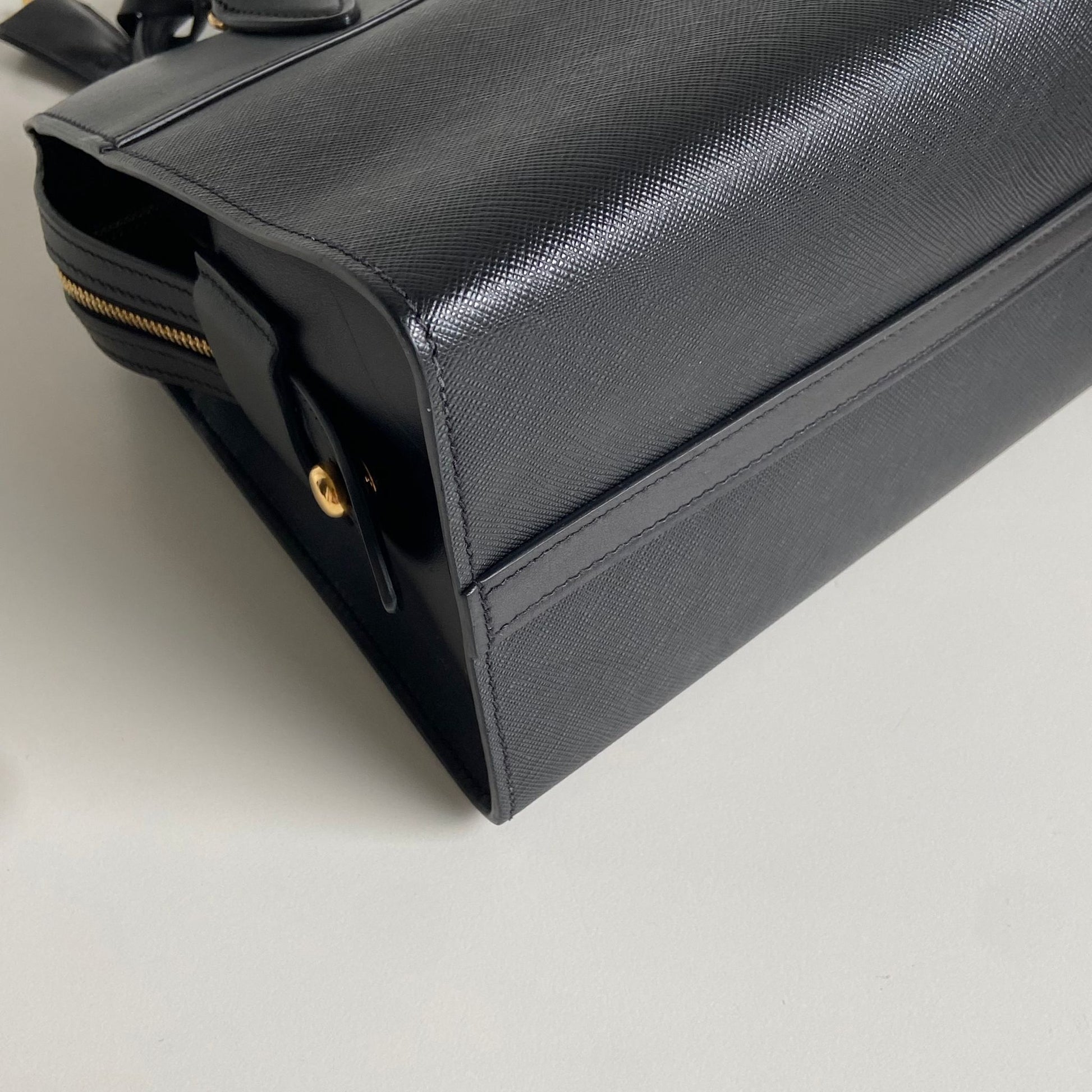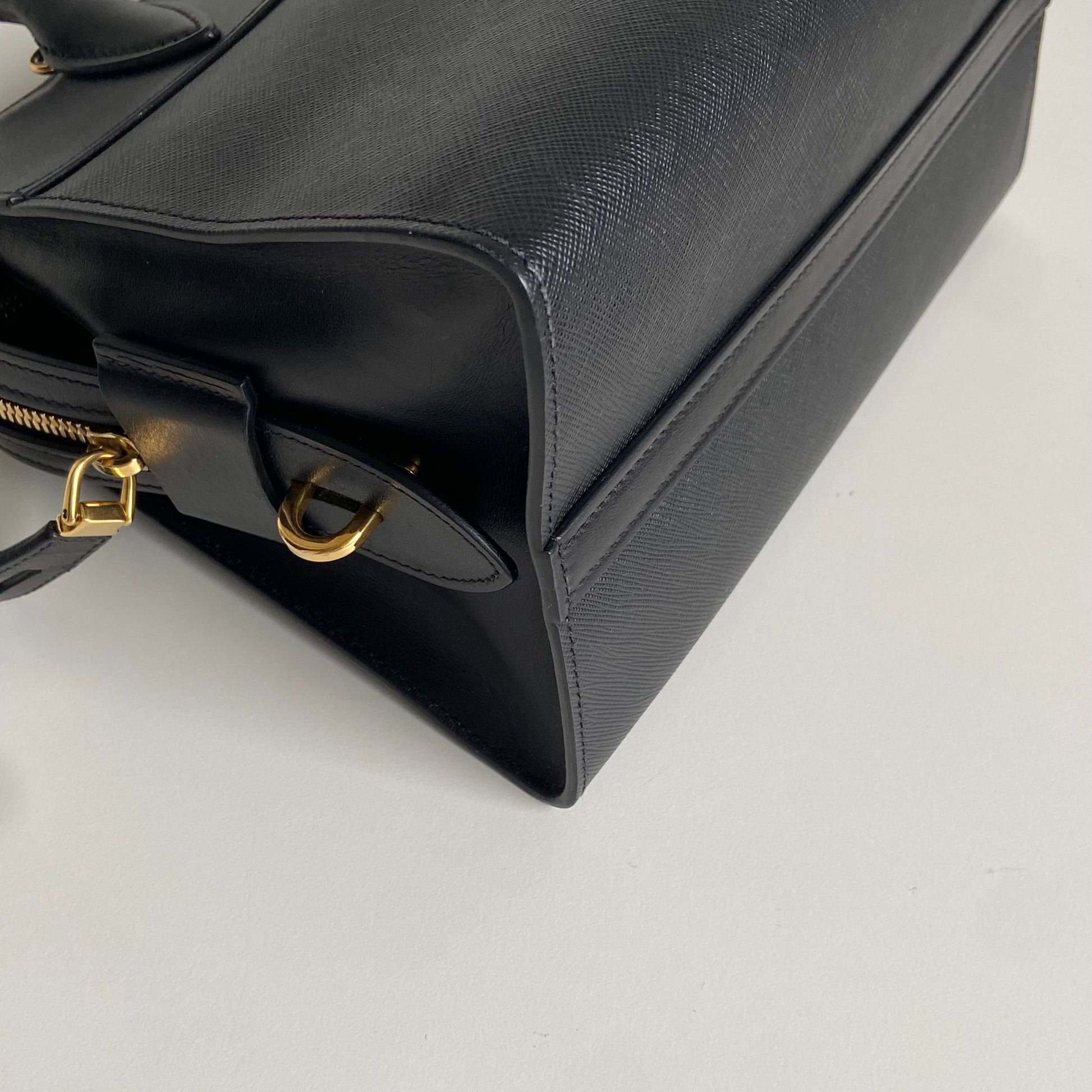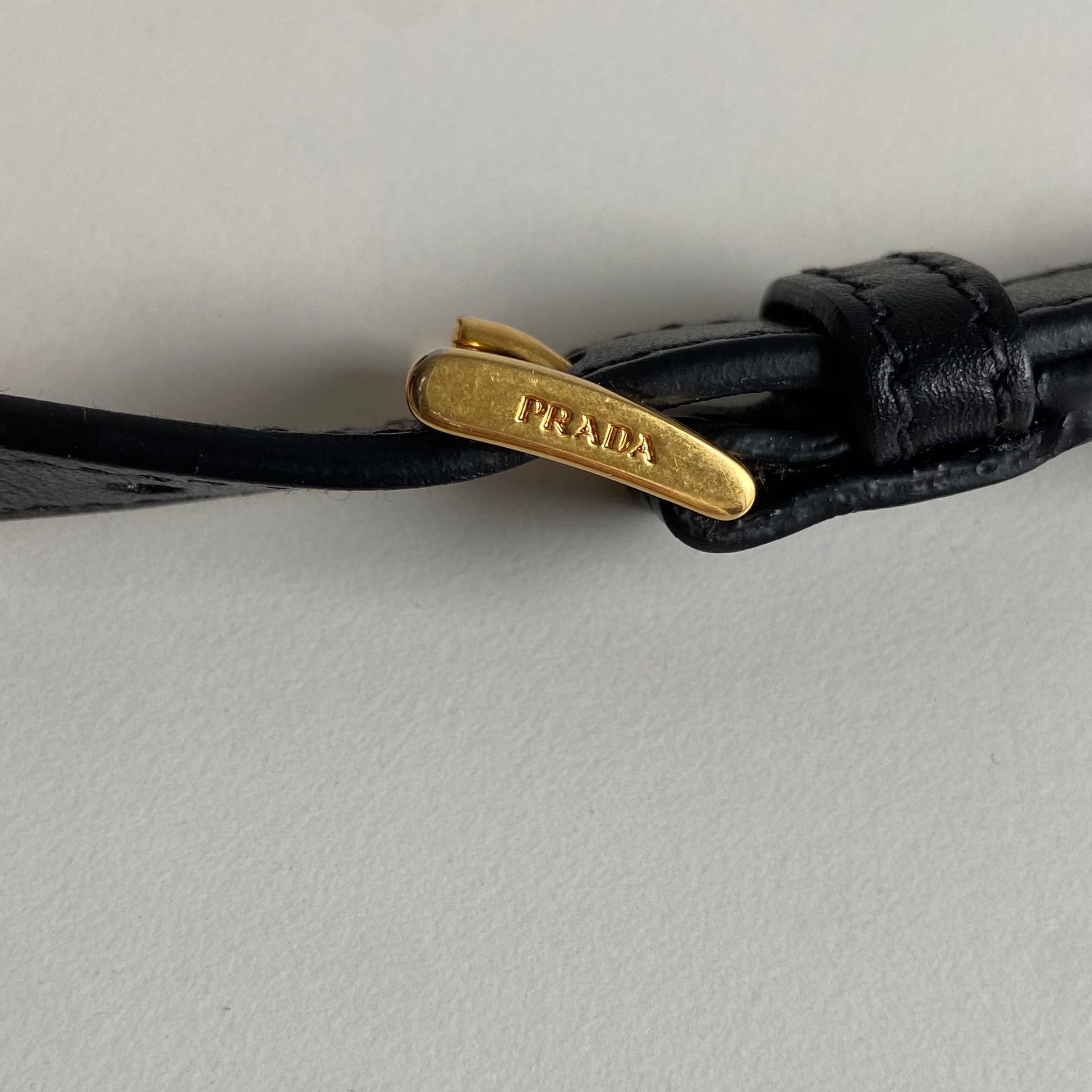 Magnifica borsa Prada modello Esplanade in pelle nera Saffiano e dettagli in pelle liscia con hardware oro. Si indossa a mano o a tracolla, la tracolla è regolabile e rimovibile.
