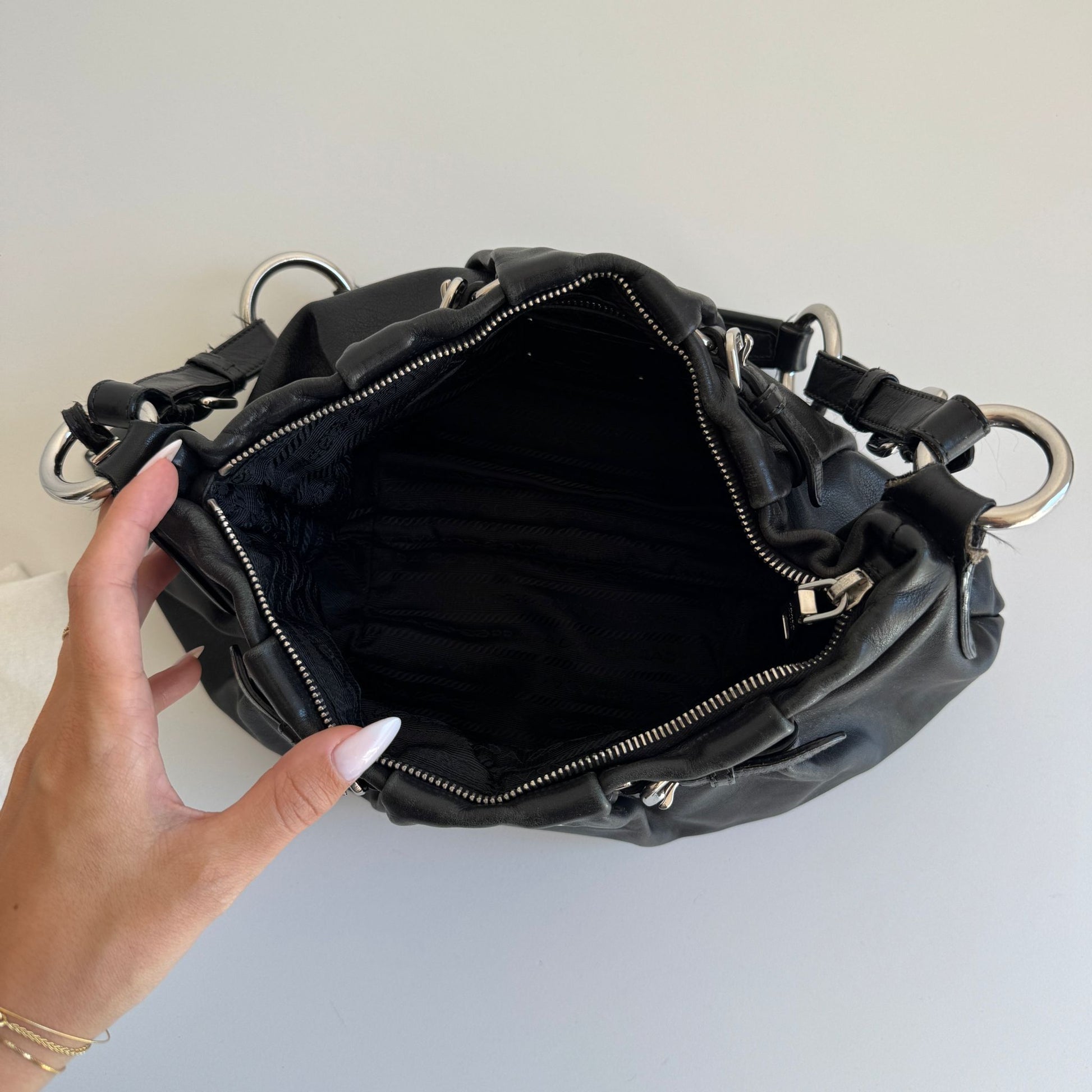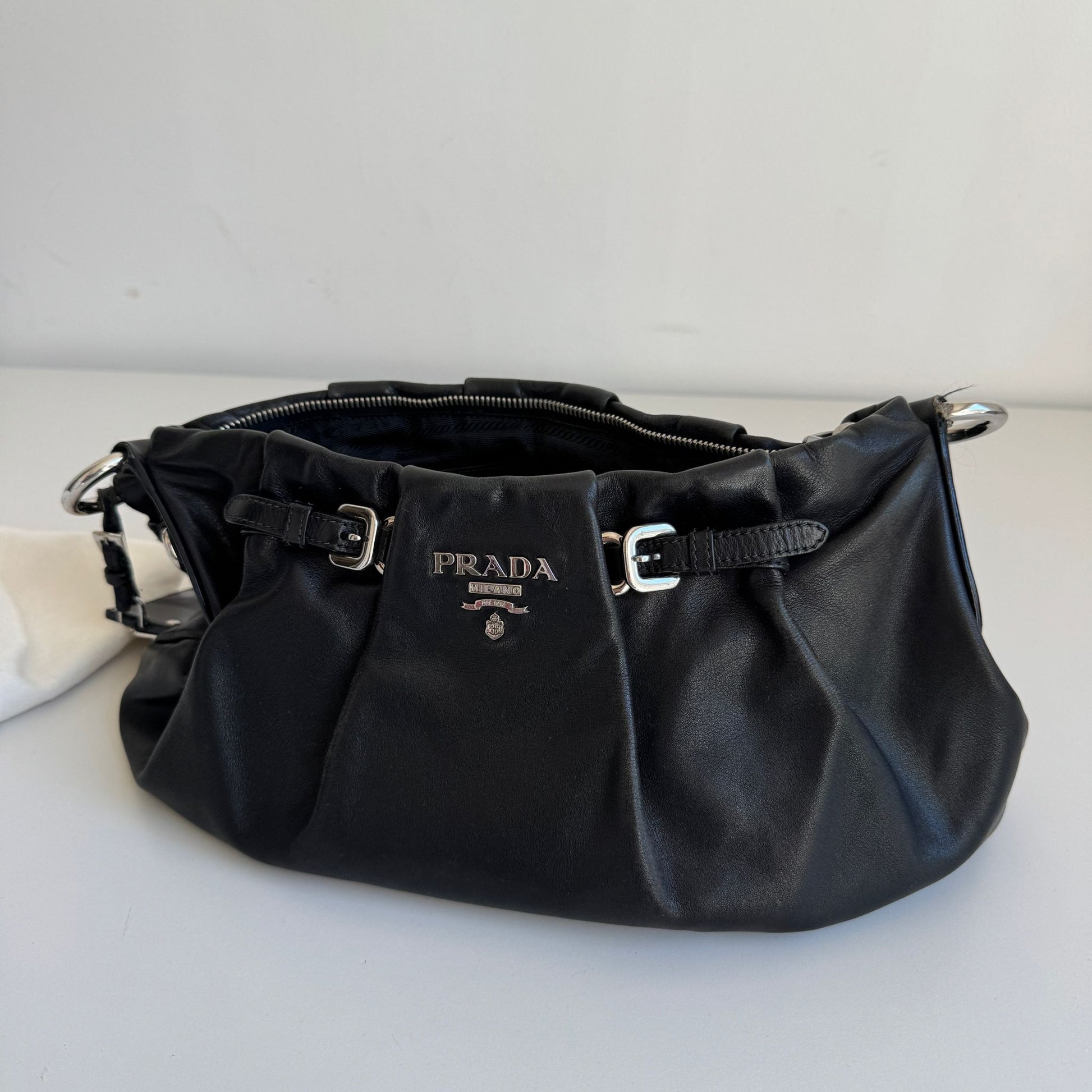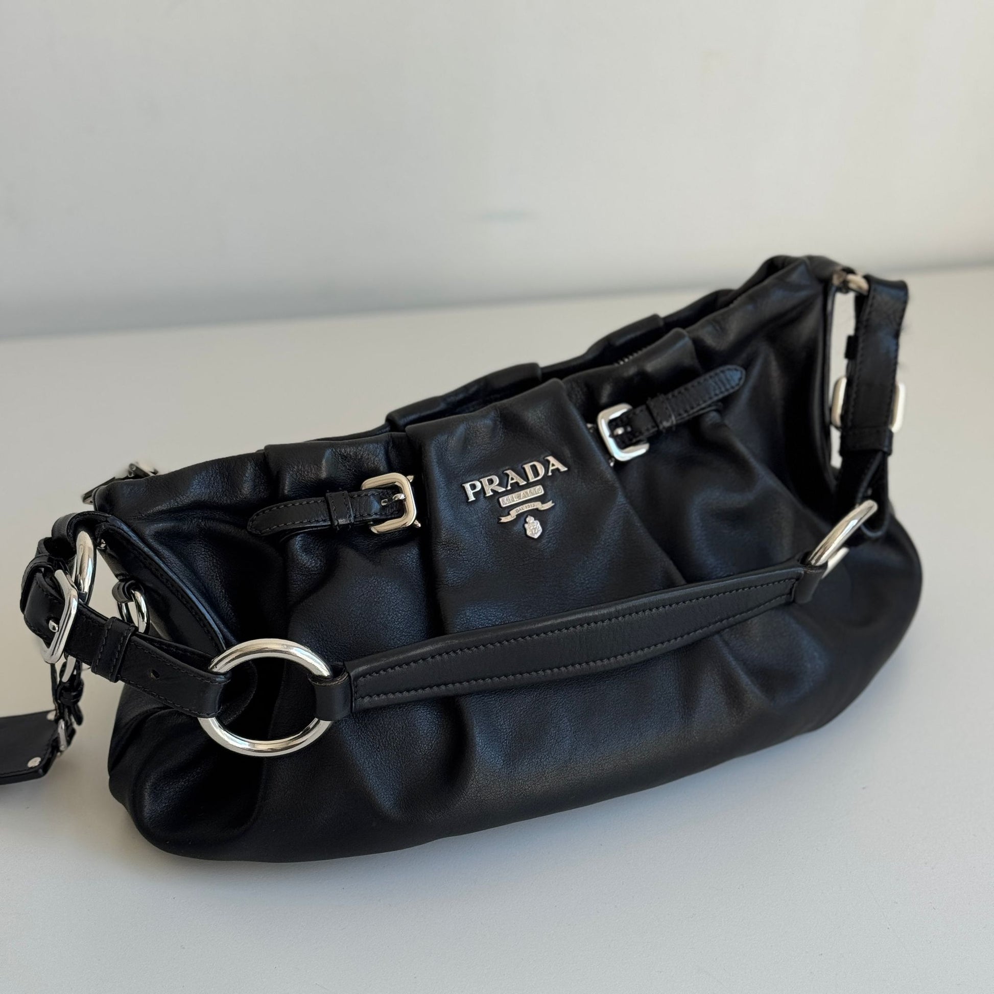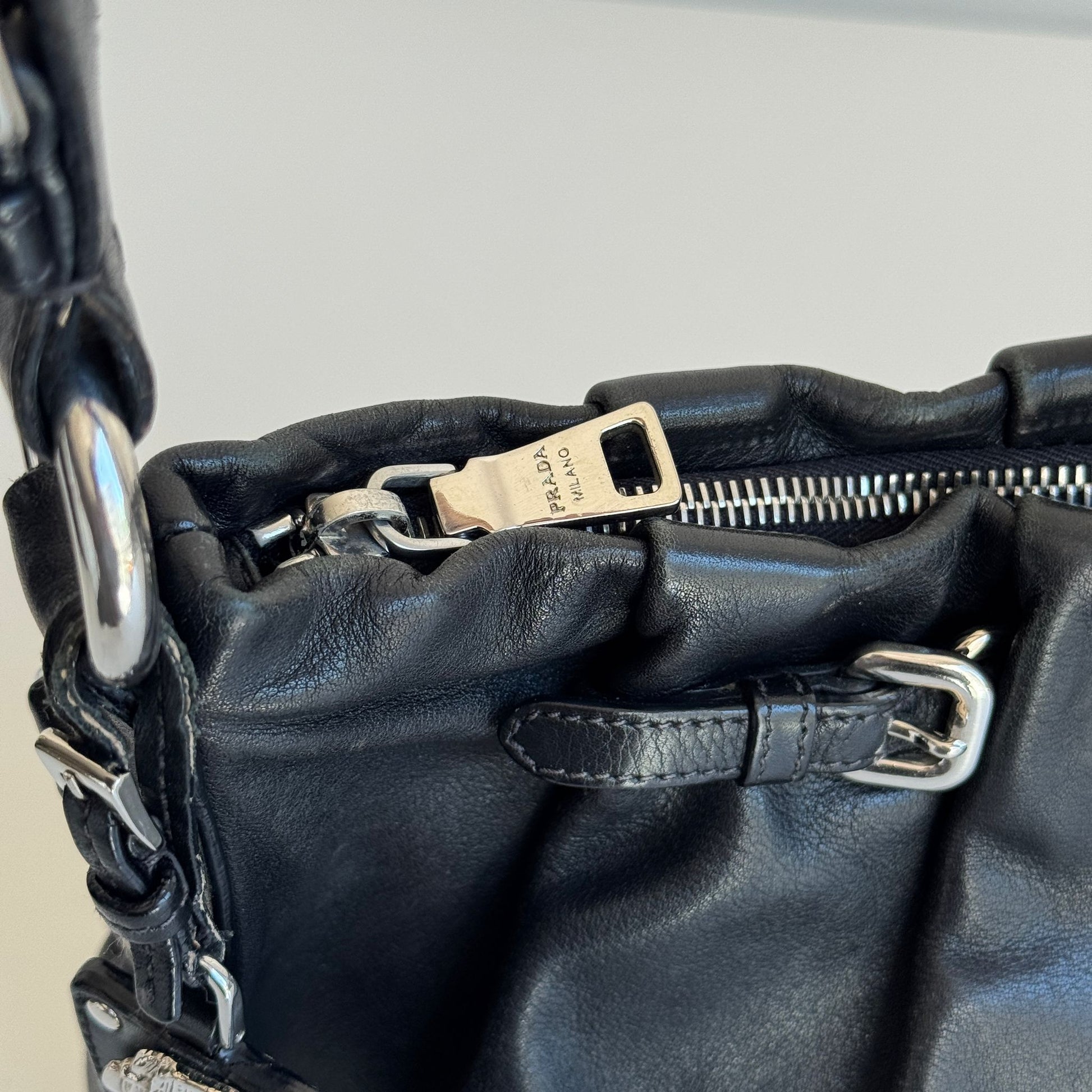 Stupenda borsa Prada in morbida pelle nera con dettagli in metallo argento. Si indossa a spalla e la tracolla è regolabile.