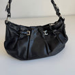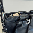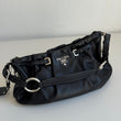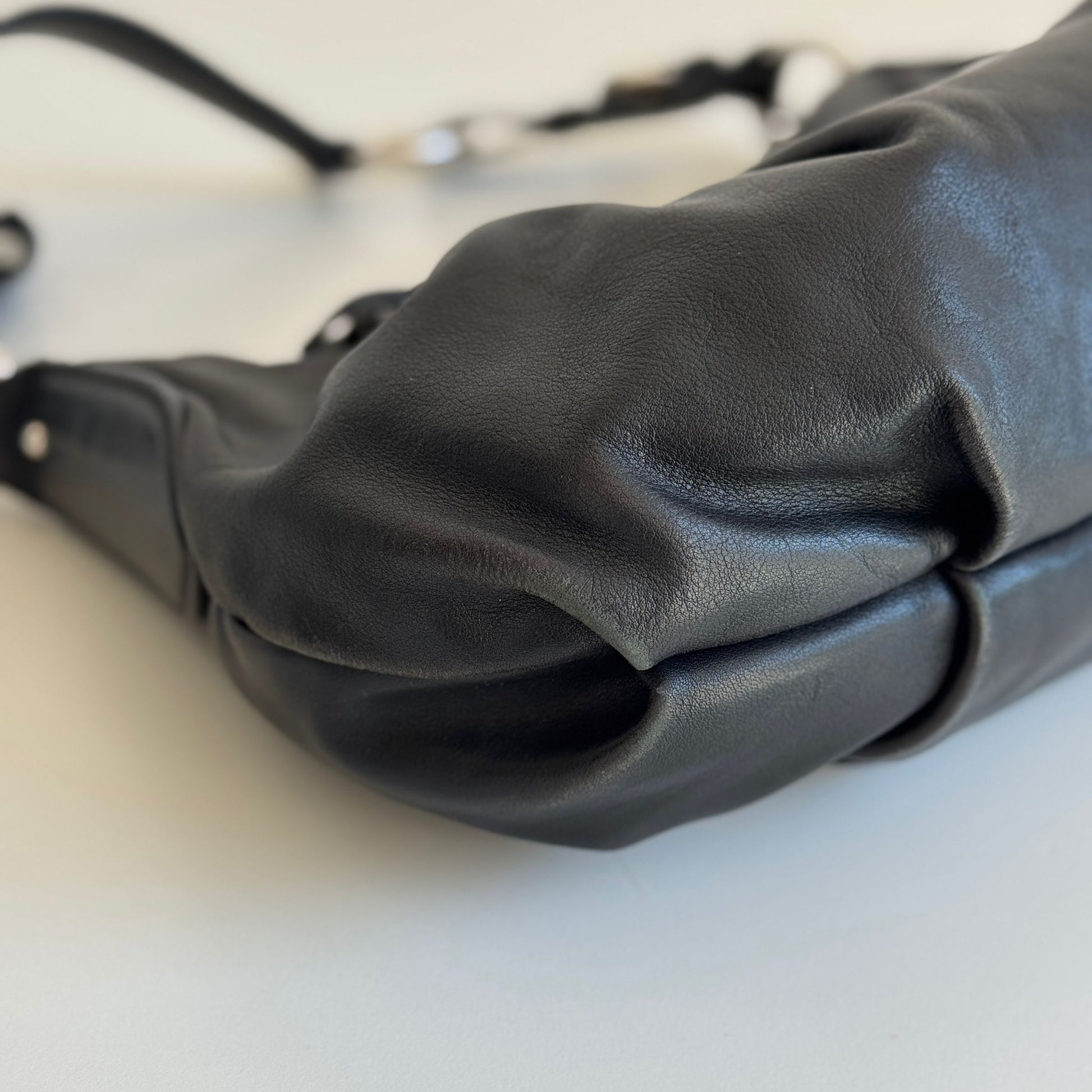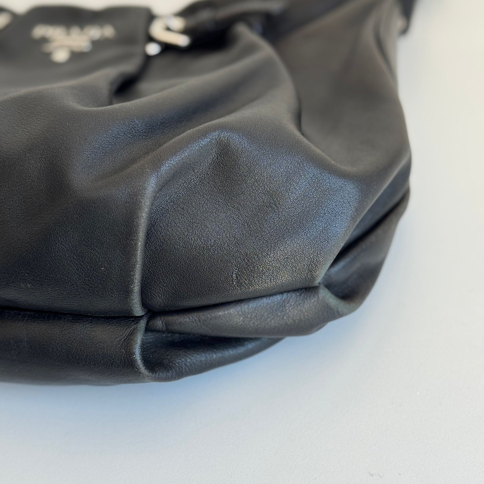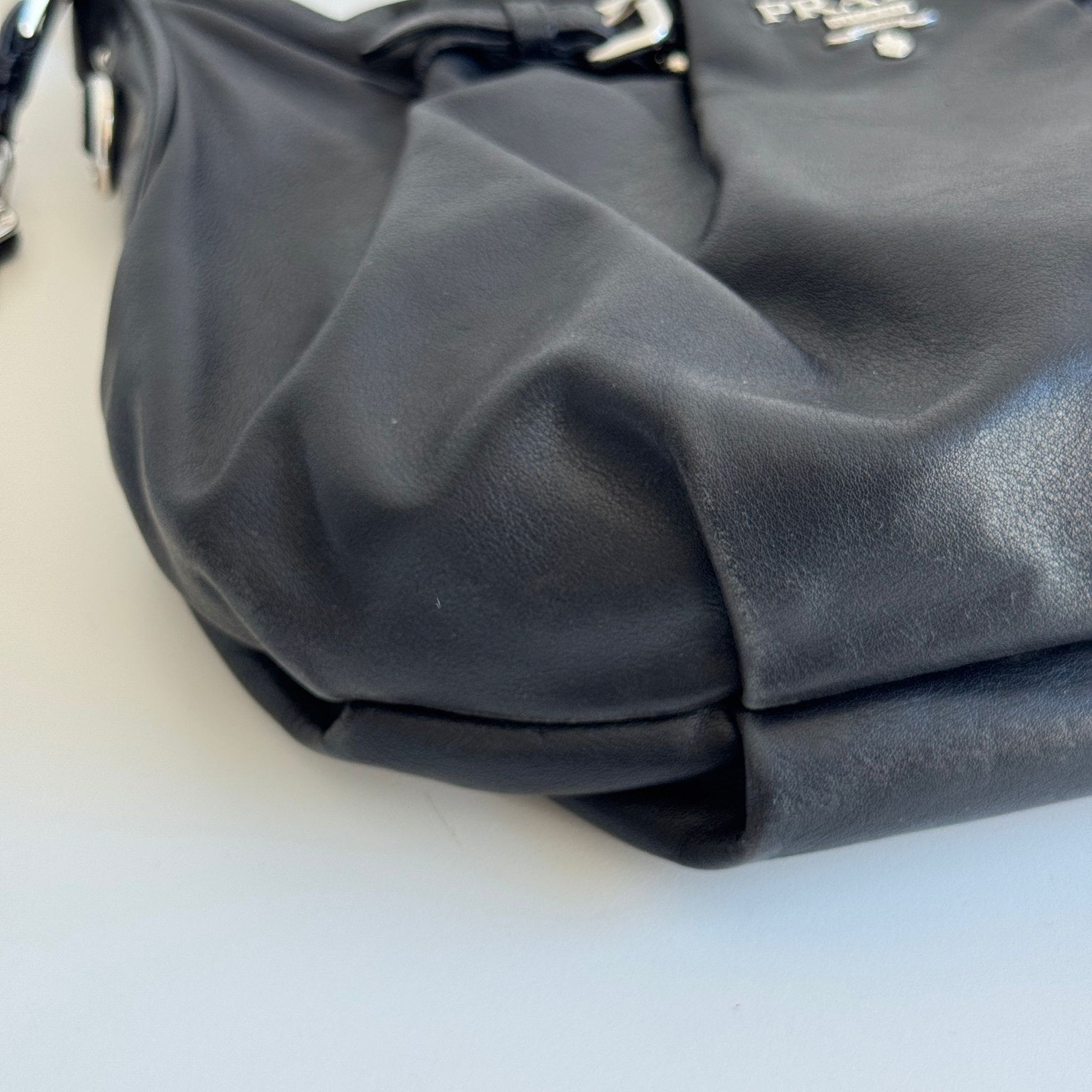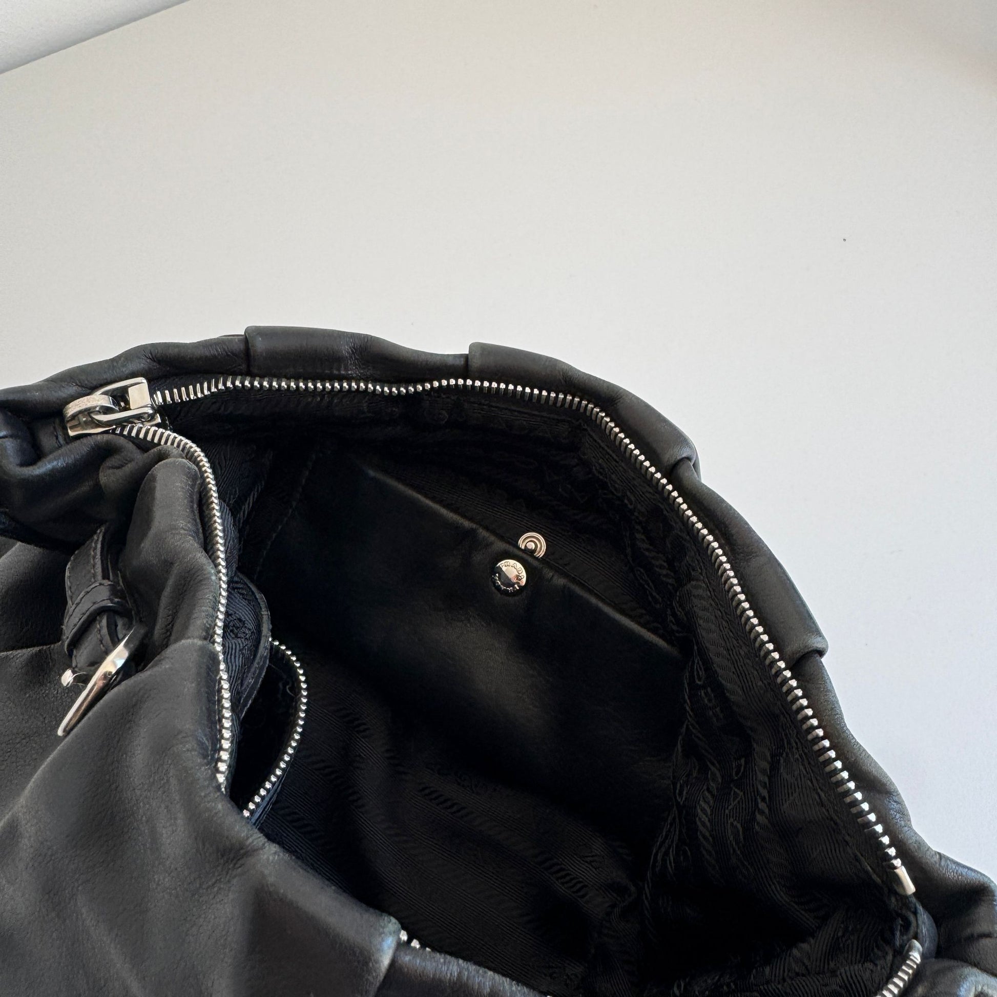 Stupenda borsa Prada in morbida pelle nera con dettagli in metallo argento. Si indossa a spalla e la tracolla è regolabile.