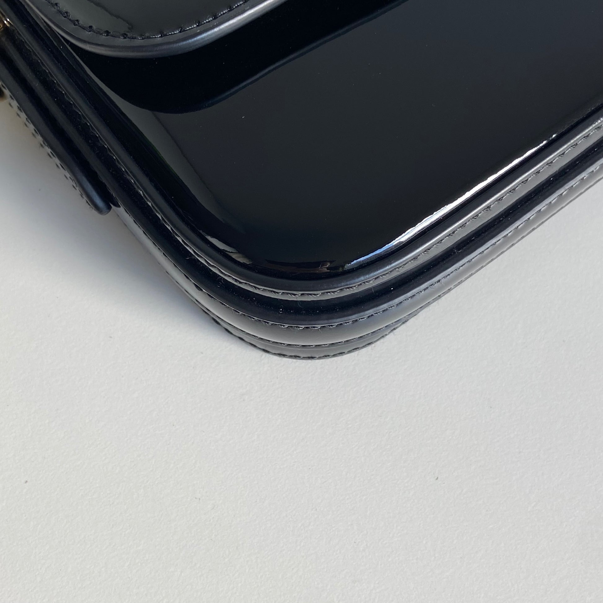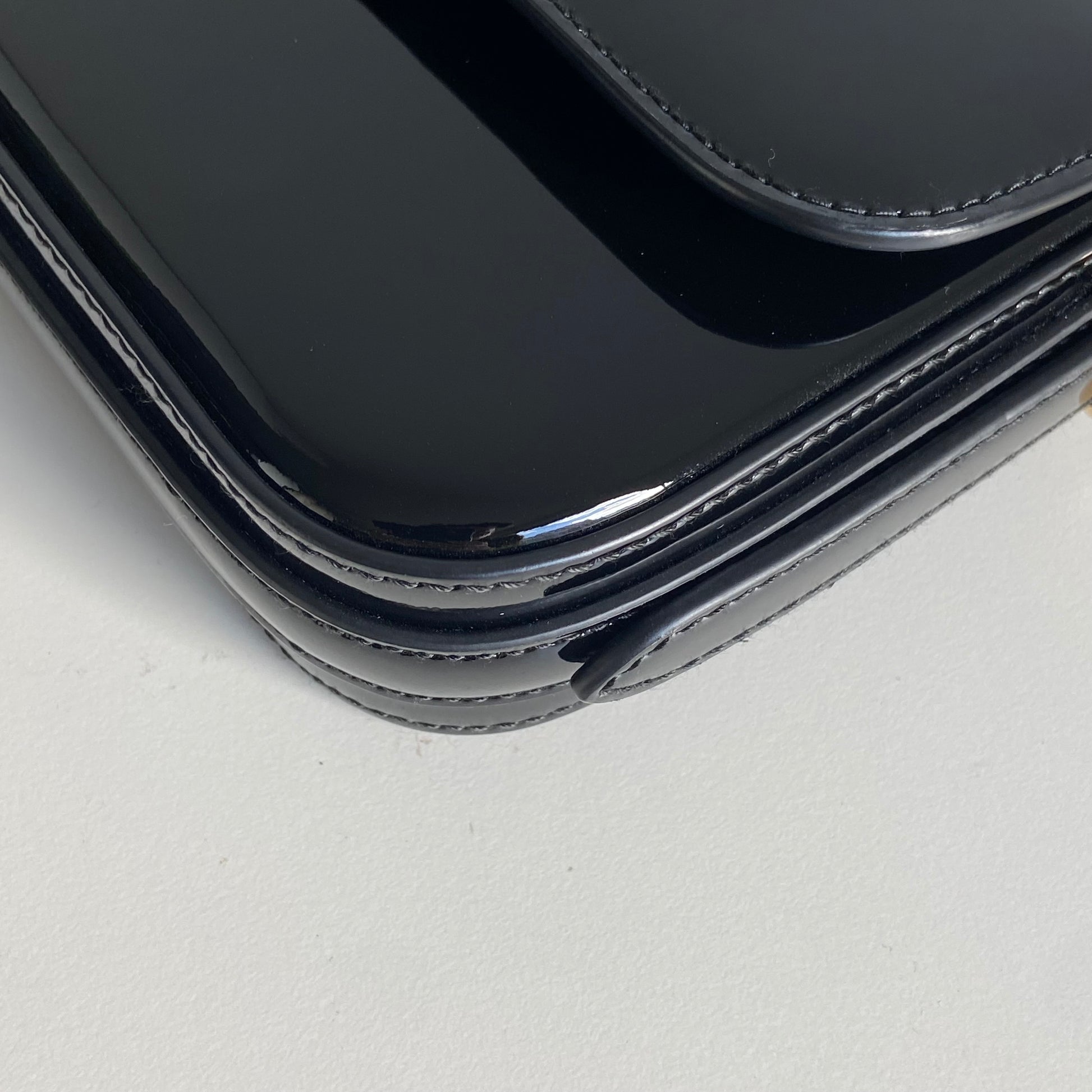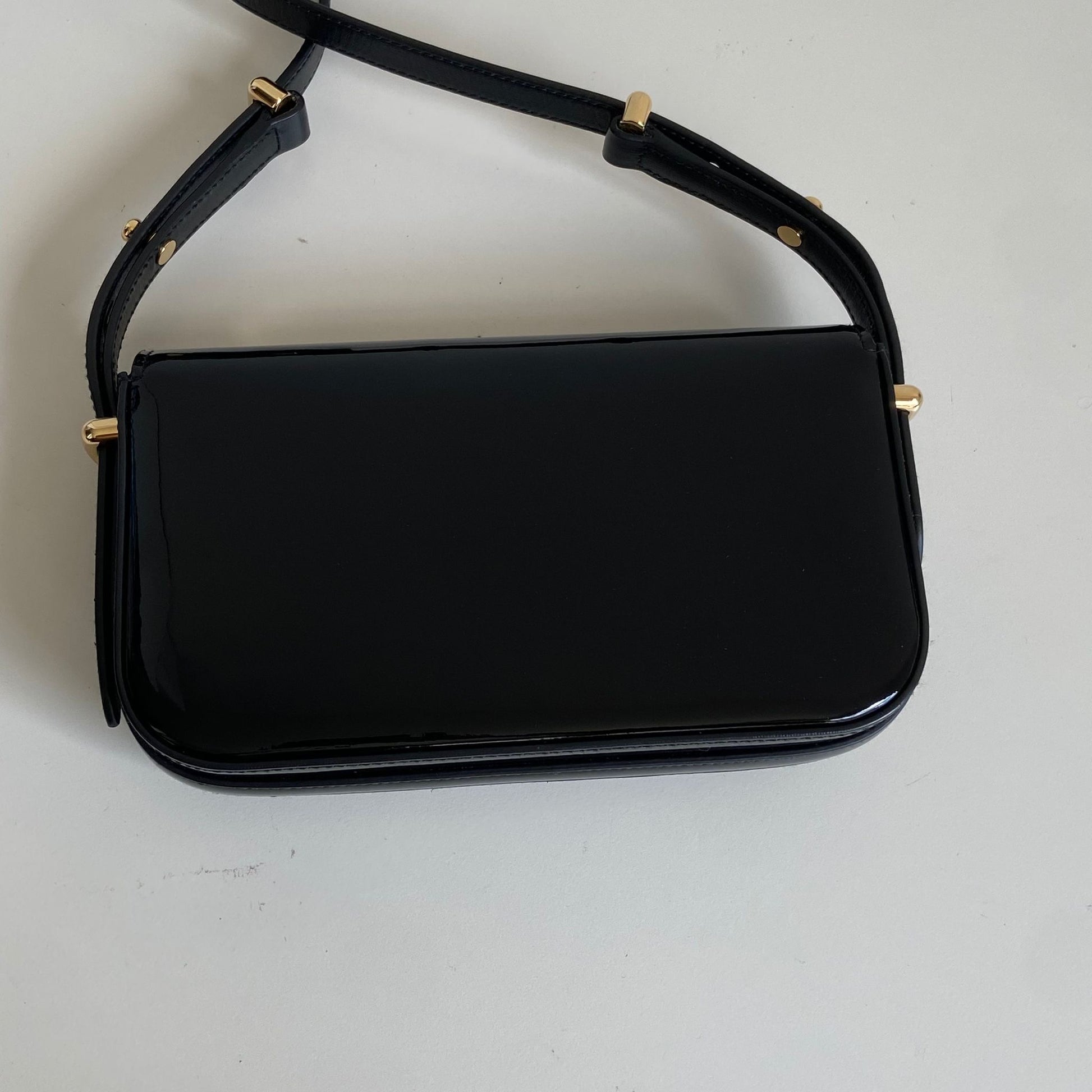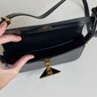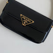 Bellissima borsa Prada modello Pattina in vernice nera e hardware oro. Si indossa a spalla o tracolla e la tracolla è regolabile.