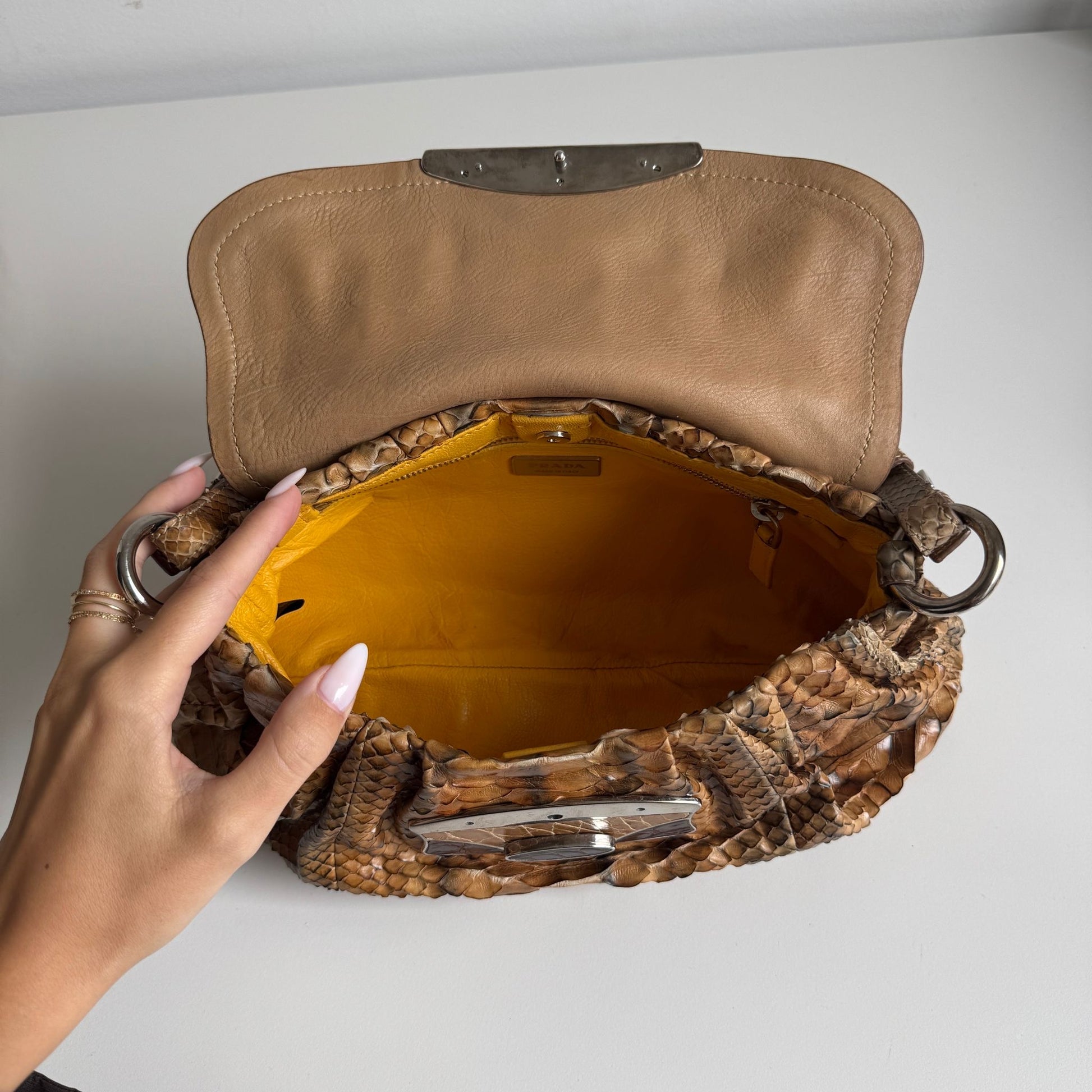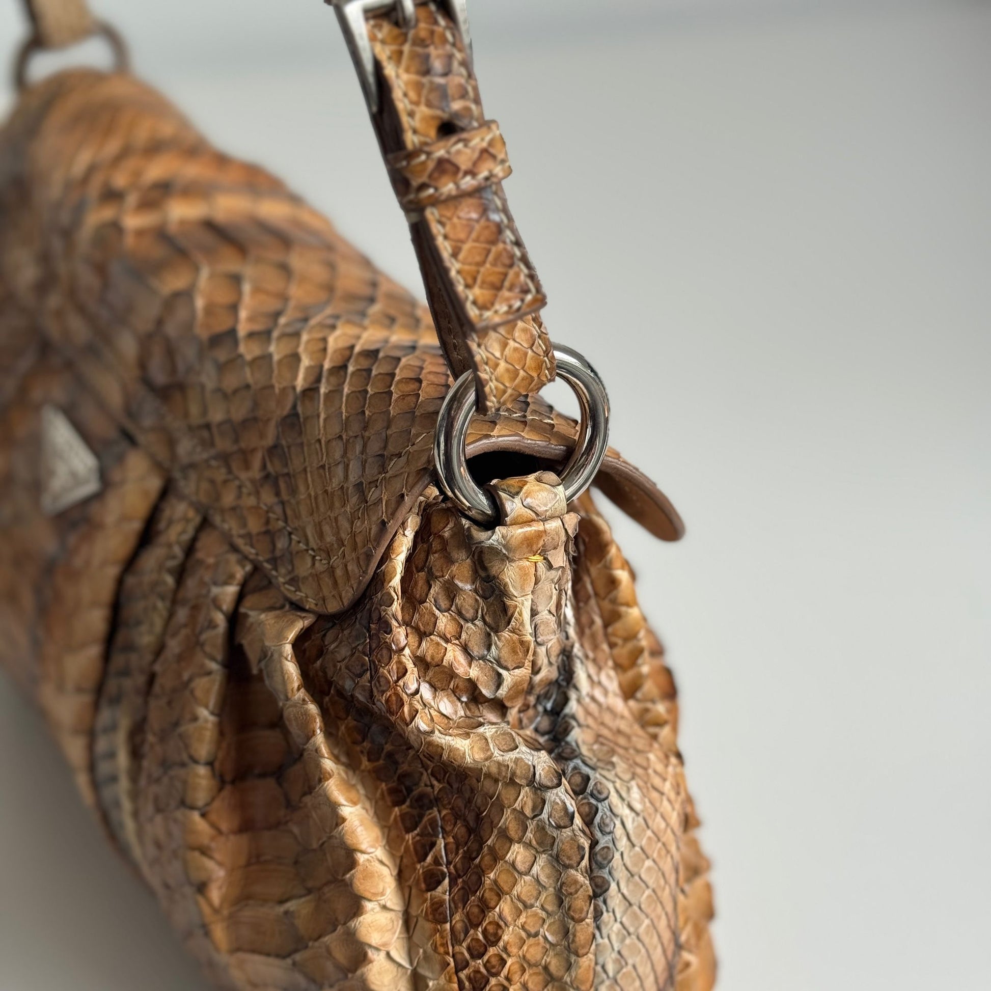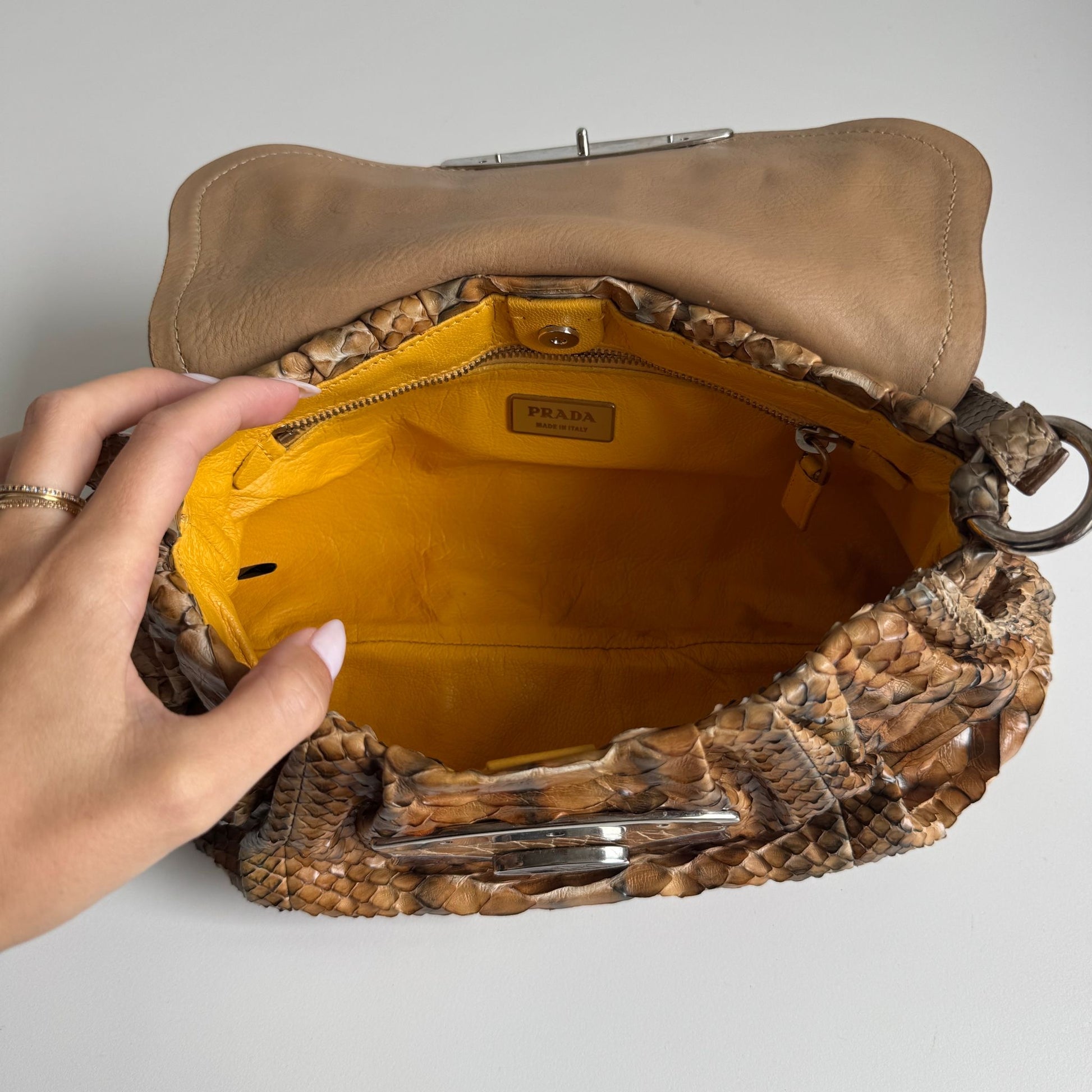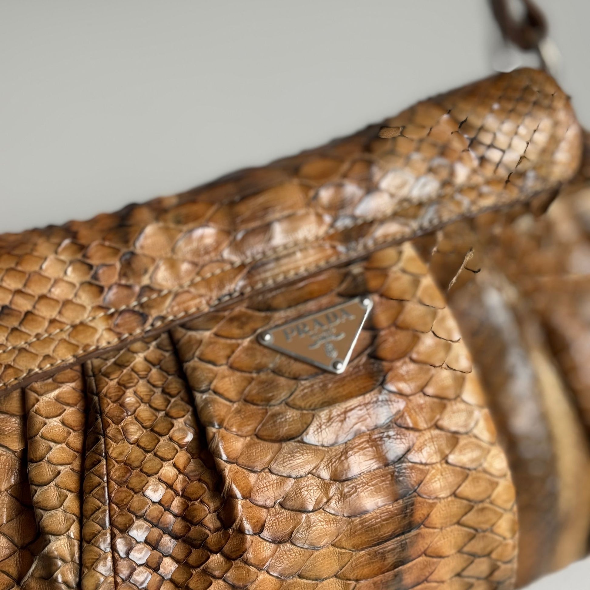 Stupenda borsa Prada modello Pattina in pelle esotica sfumata sui toni del beige-cammello e hardware argento. Si indossa a spalla.