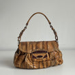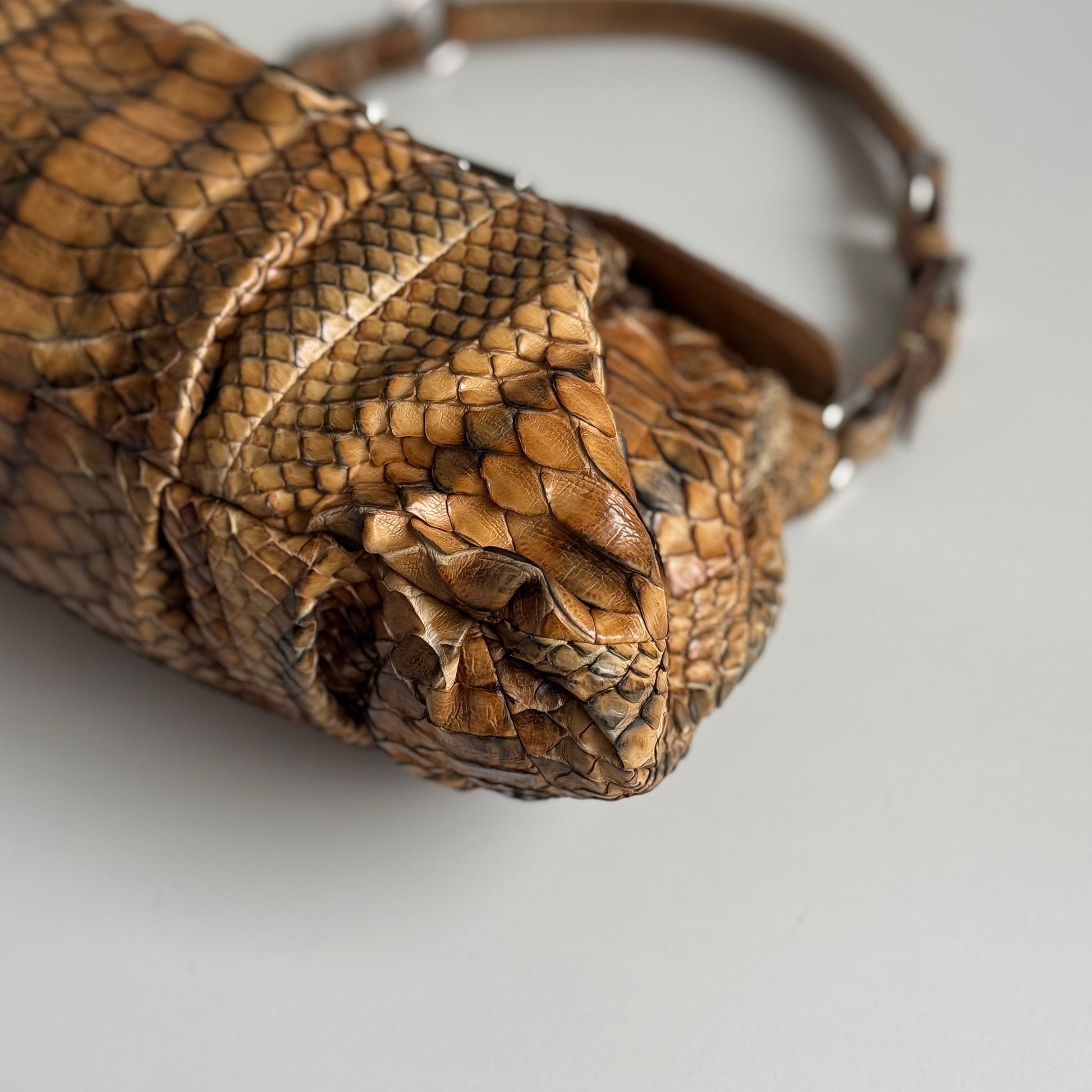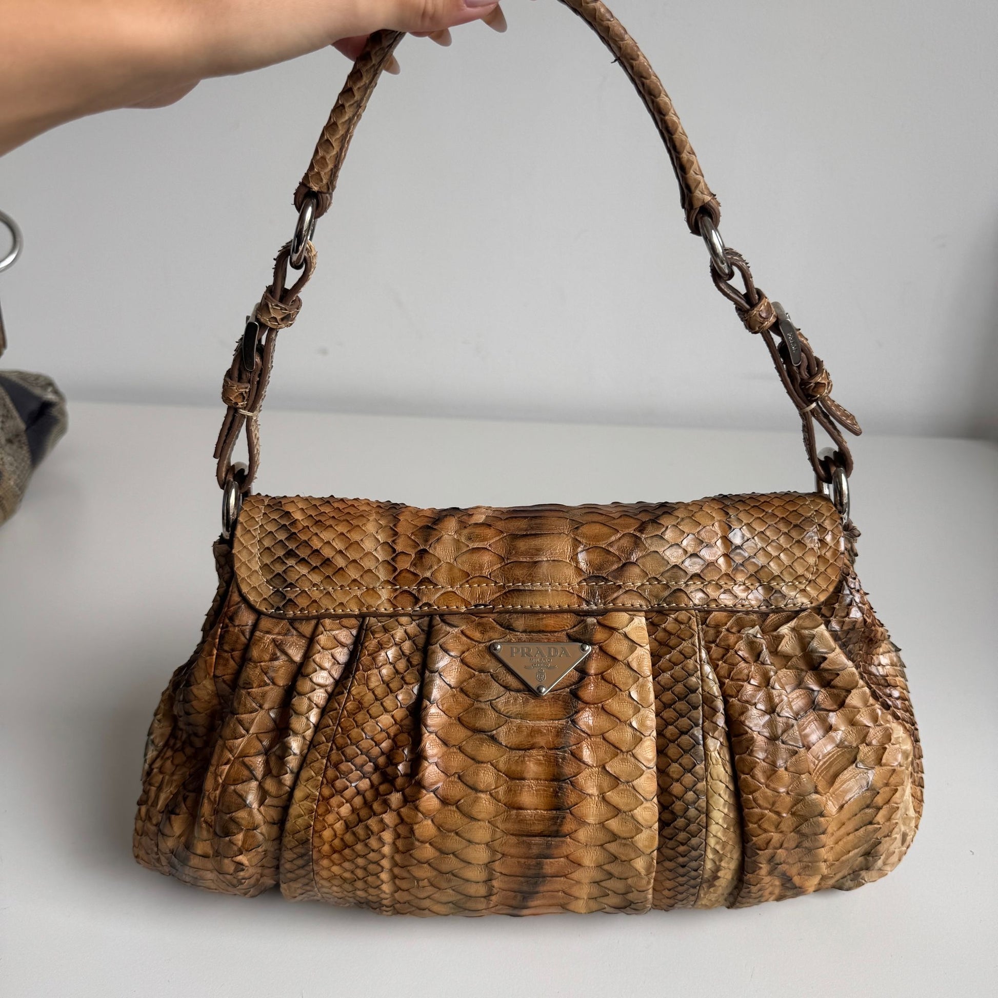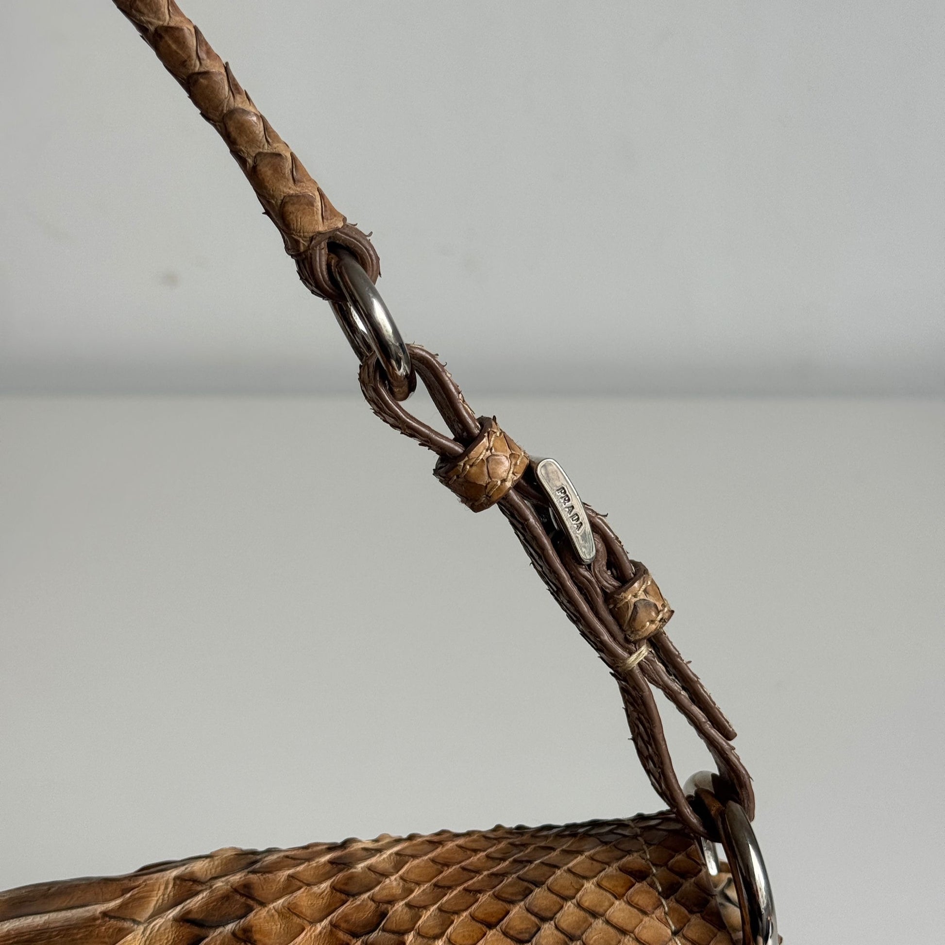 Stupenda borsa Prada modello Pattina in pelle esotica sfumata sui toni del beige-cammello e hardware argento. Si indossa a spalla.