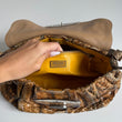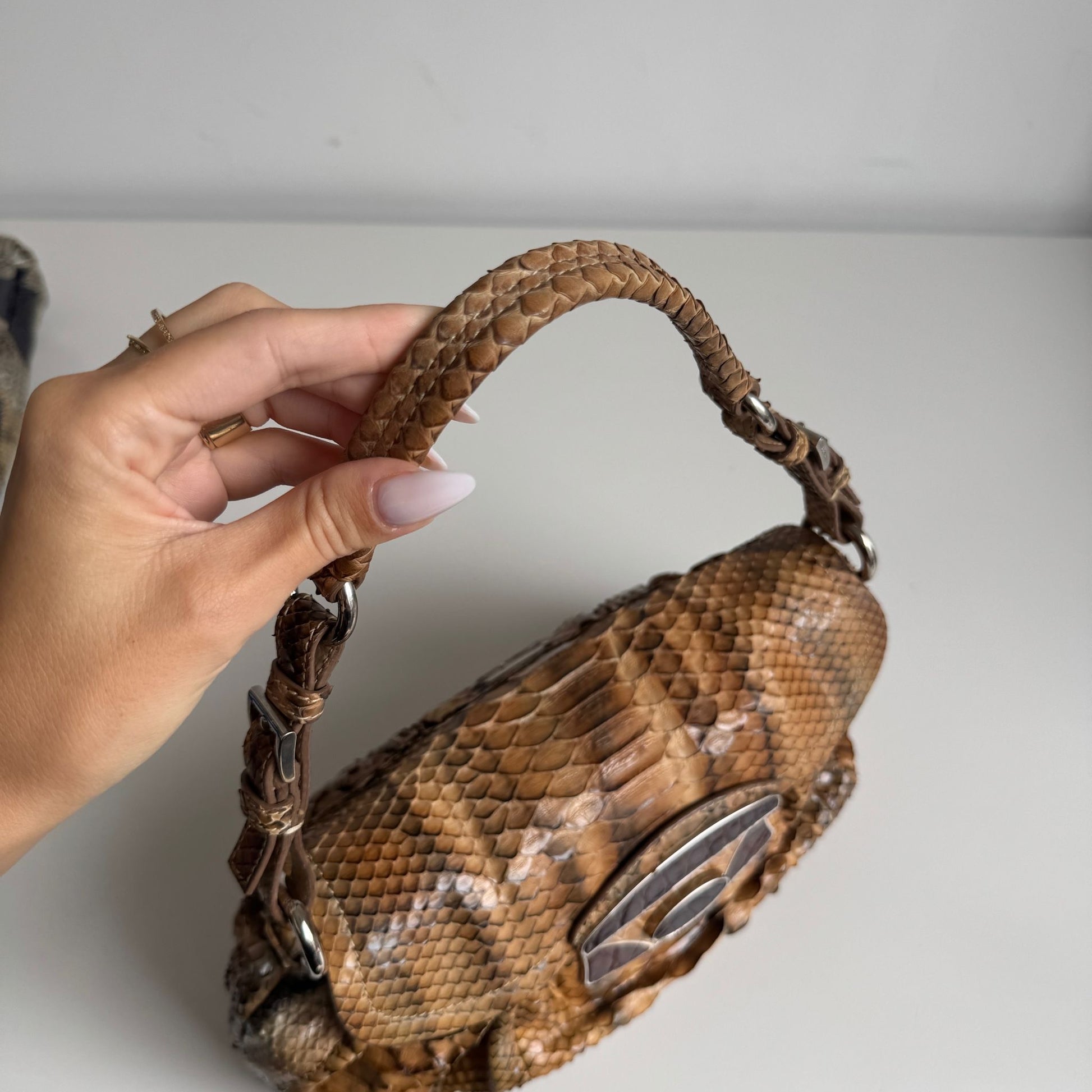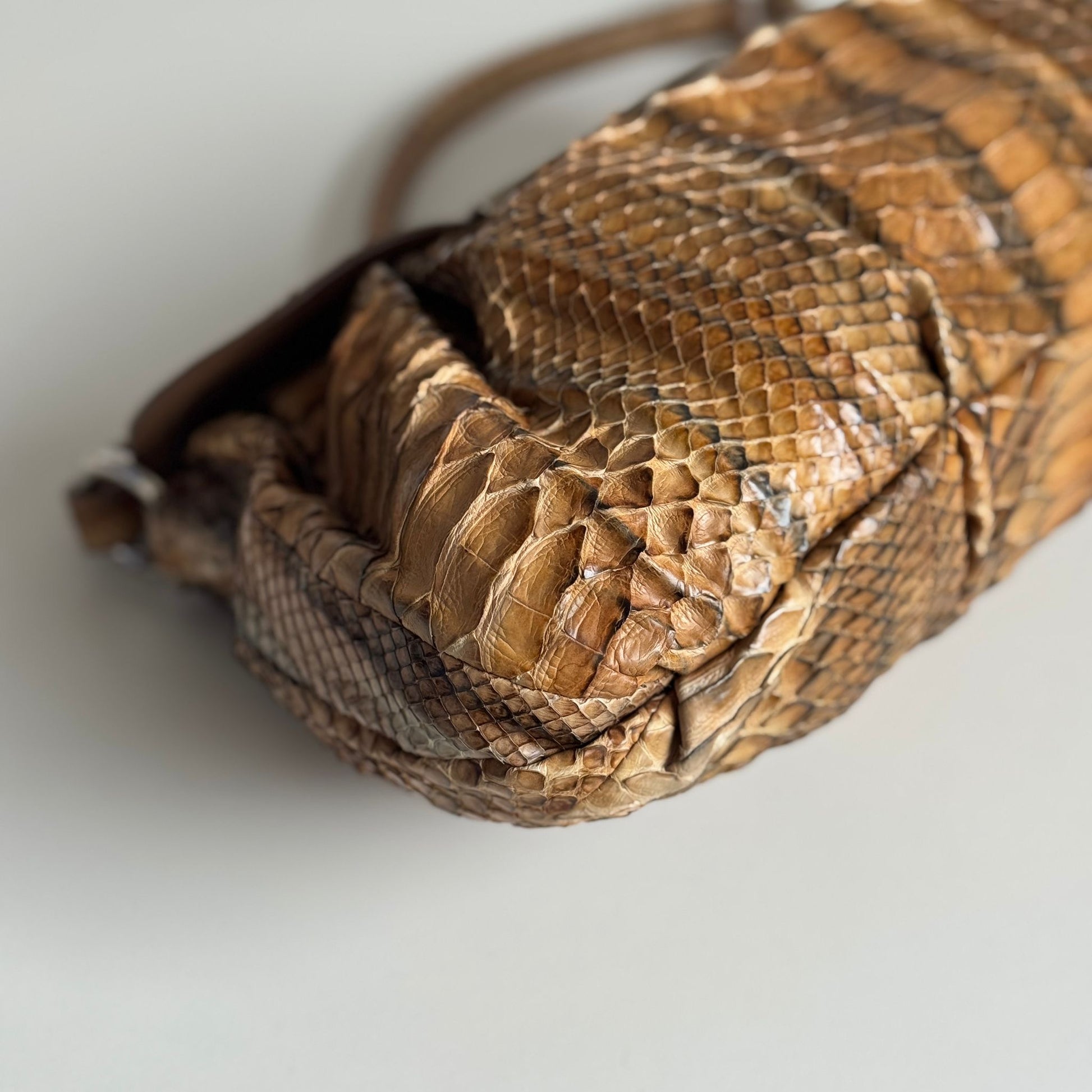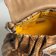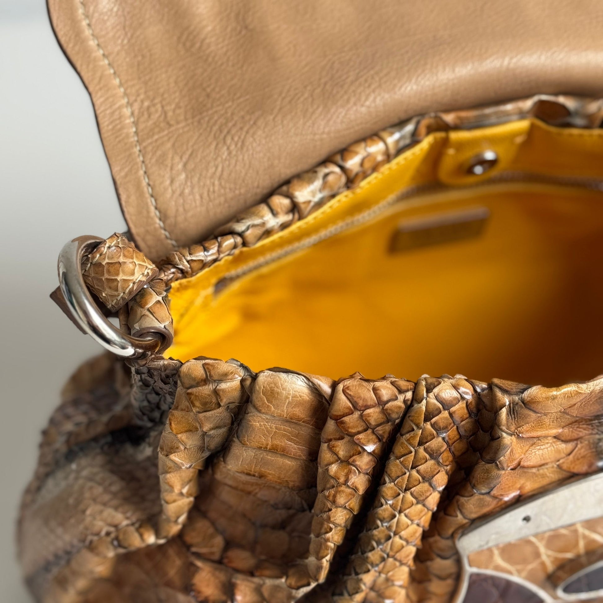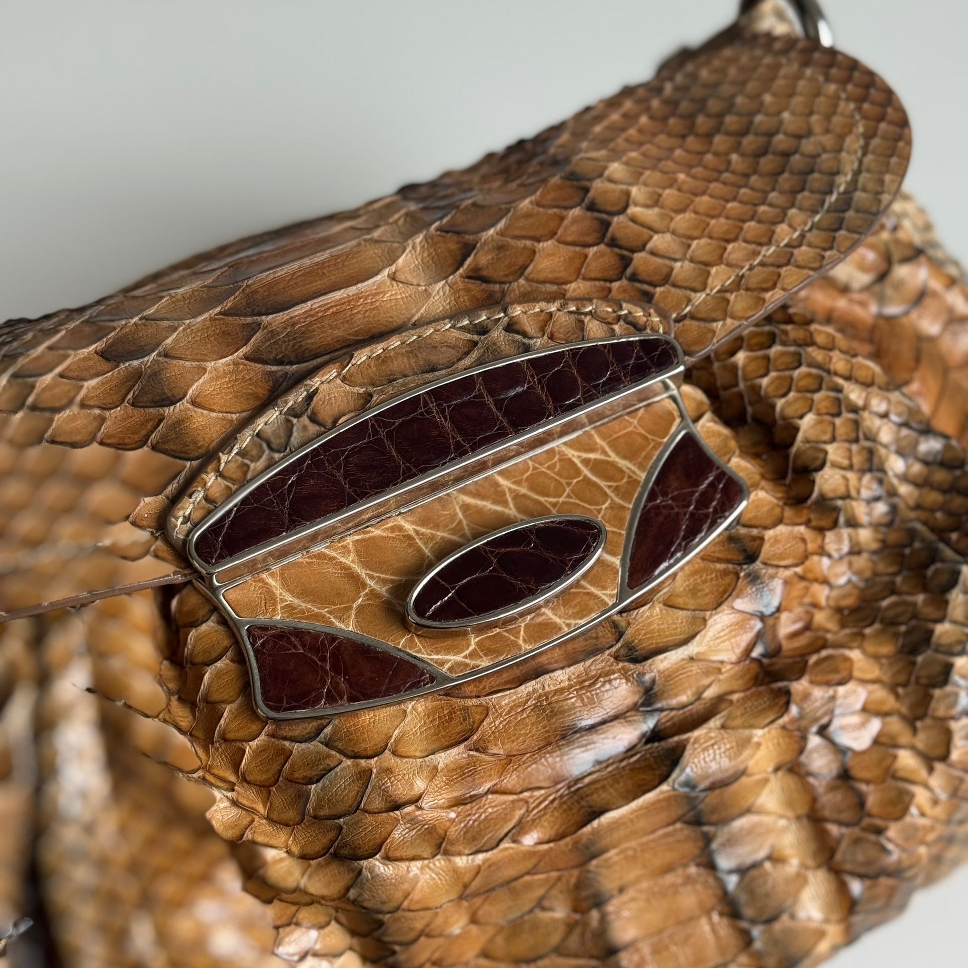 Stupenda borsa Prada modello Pattina in pelle esotica sfumata sui toni del beige-cammello e hardware argento. Si indossa a spalla.
