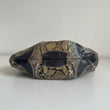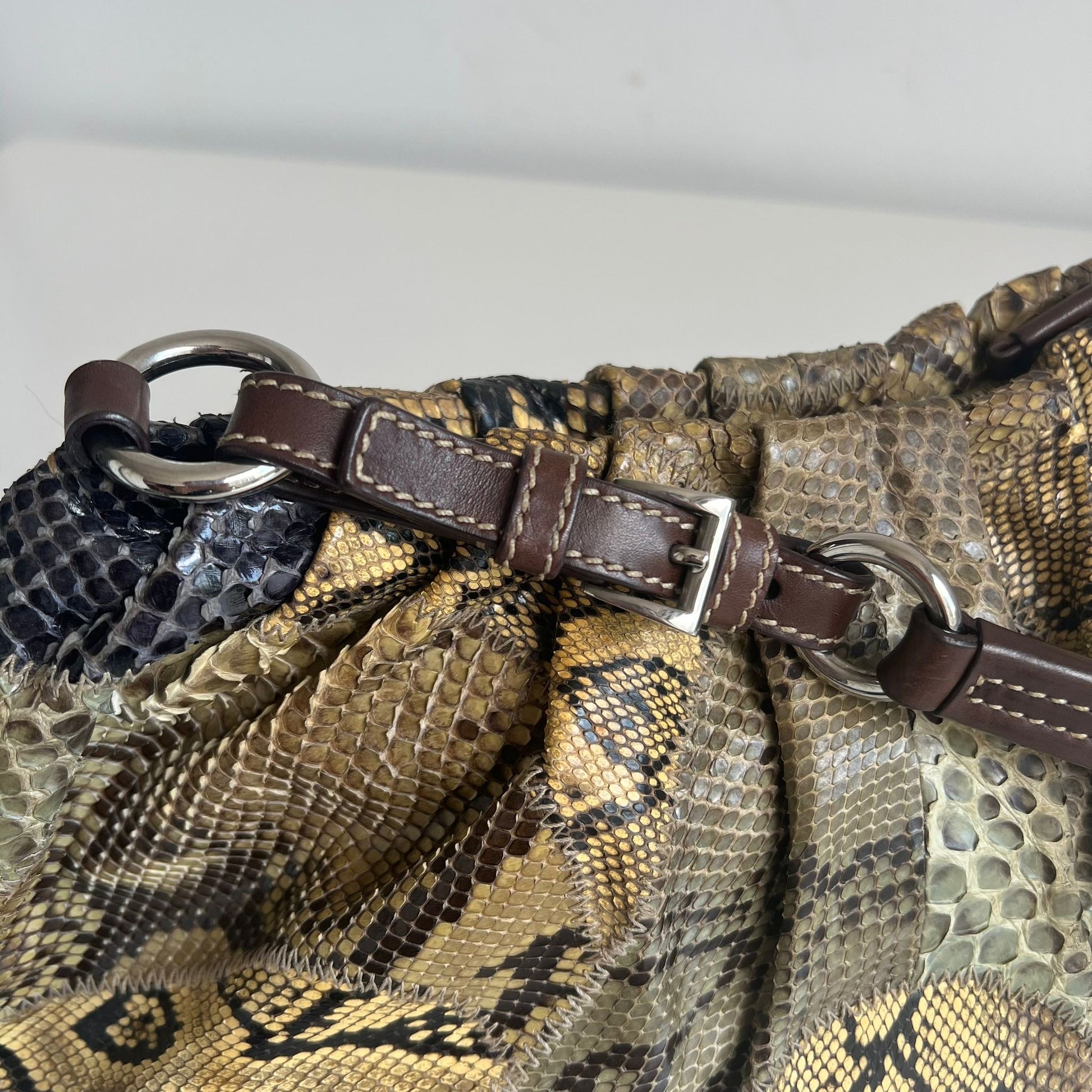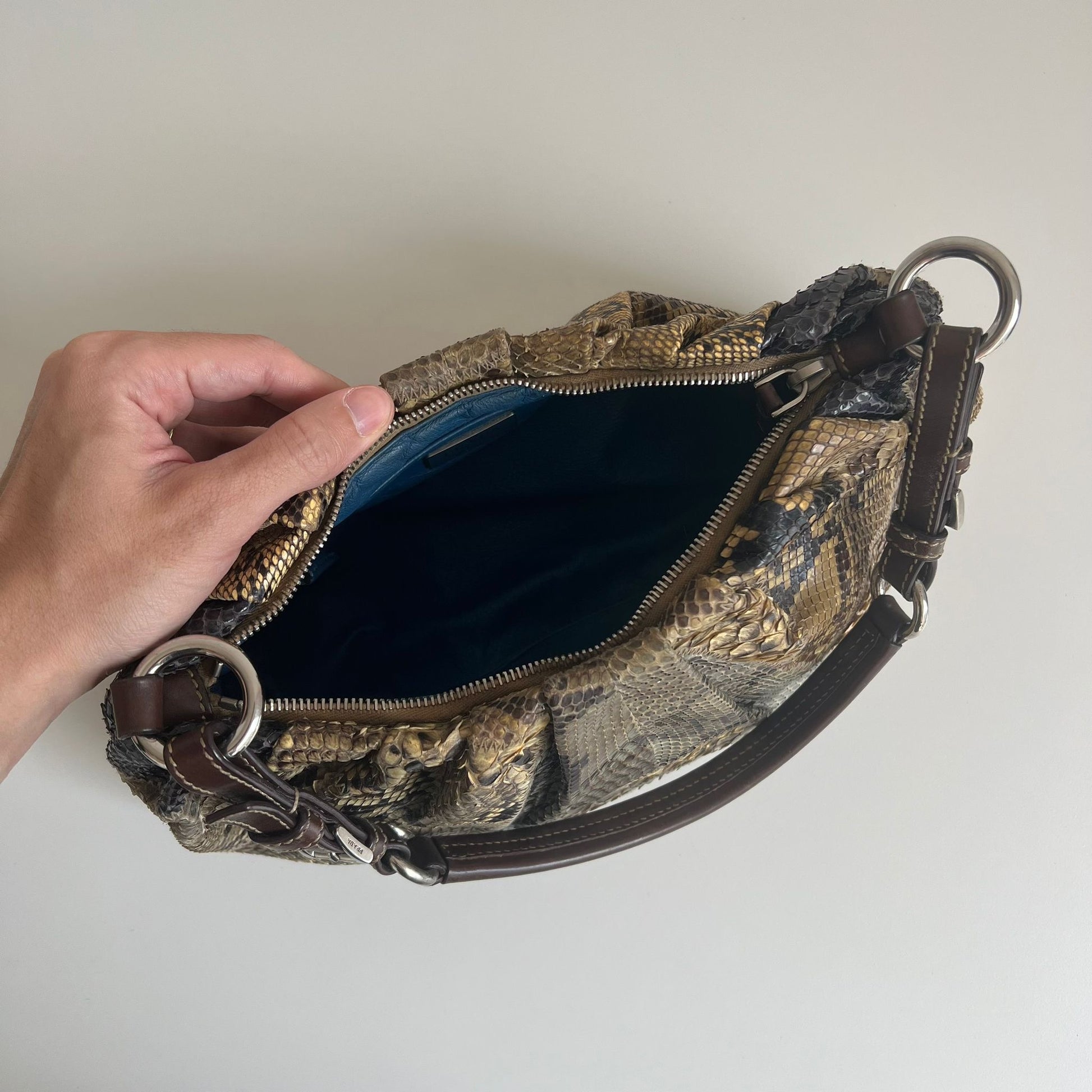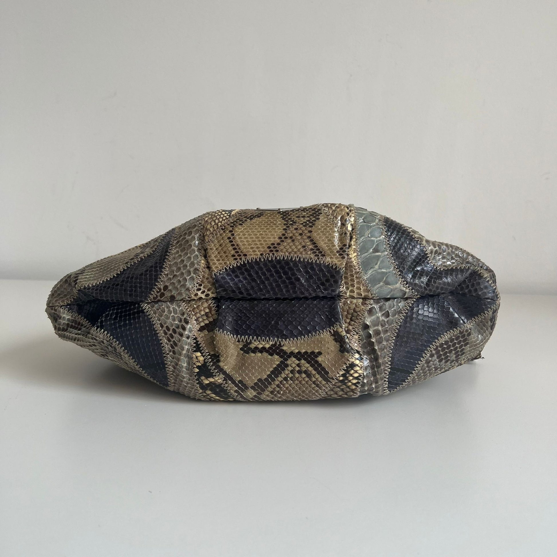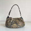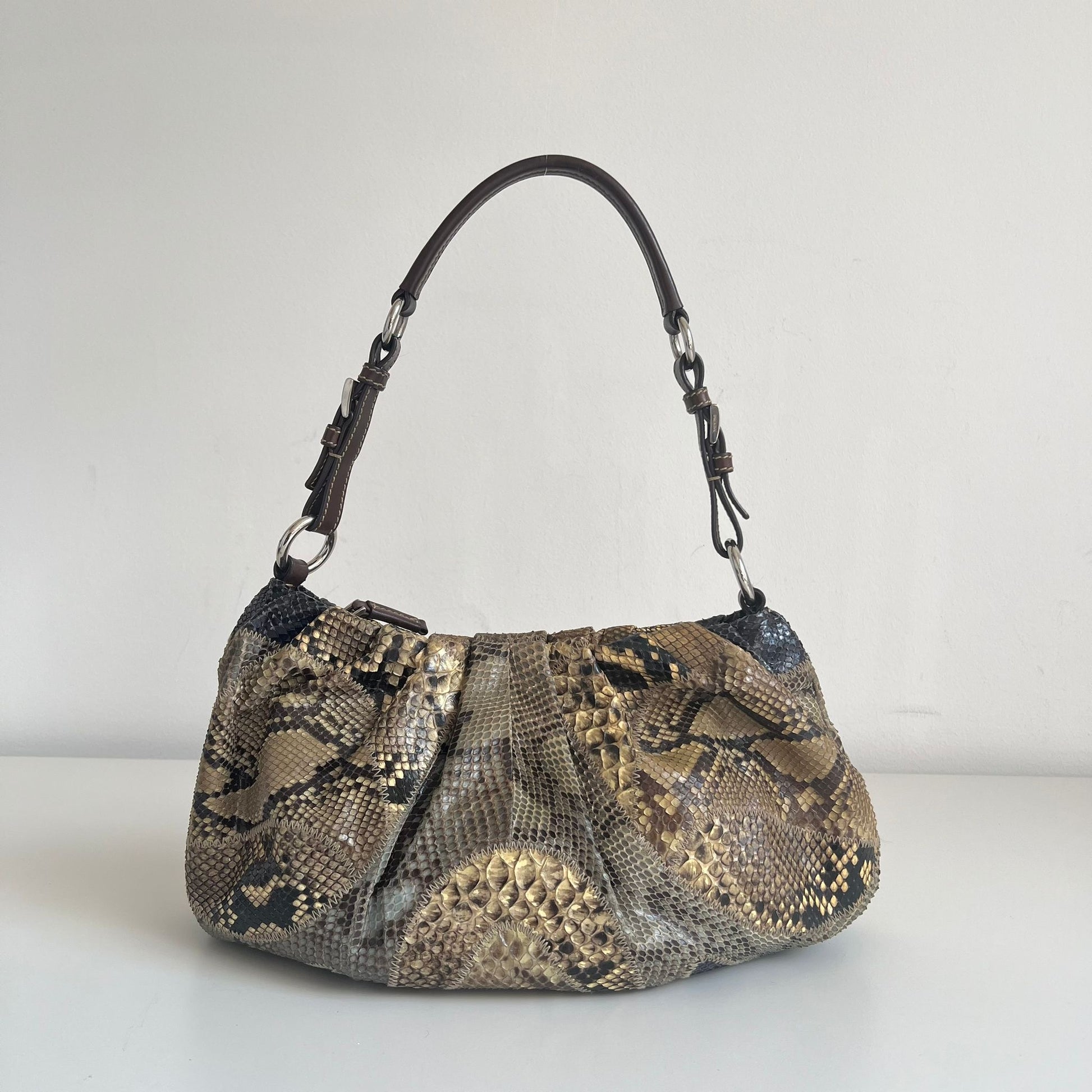 Stupenda borsa Prada della F/W 2003 in pelle esotica patchwork sfumata sui toni del beige-verde-blu con hardware argento e dettagli in pelle marrone. Si indossa a spalla.