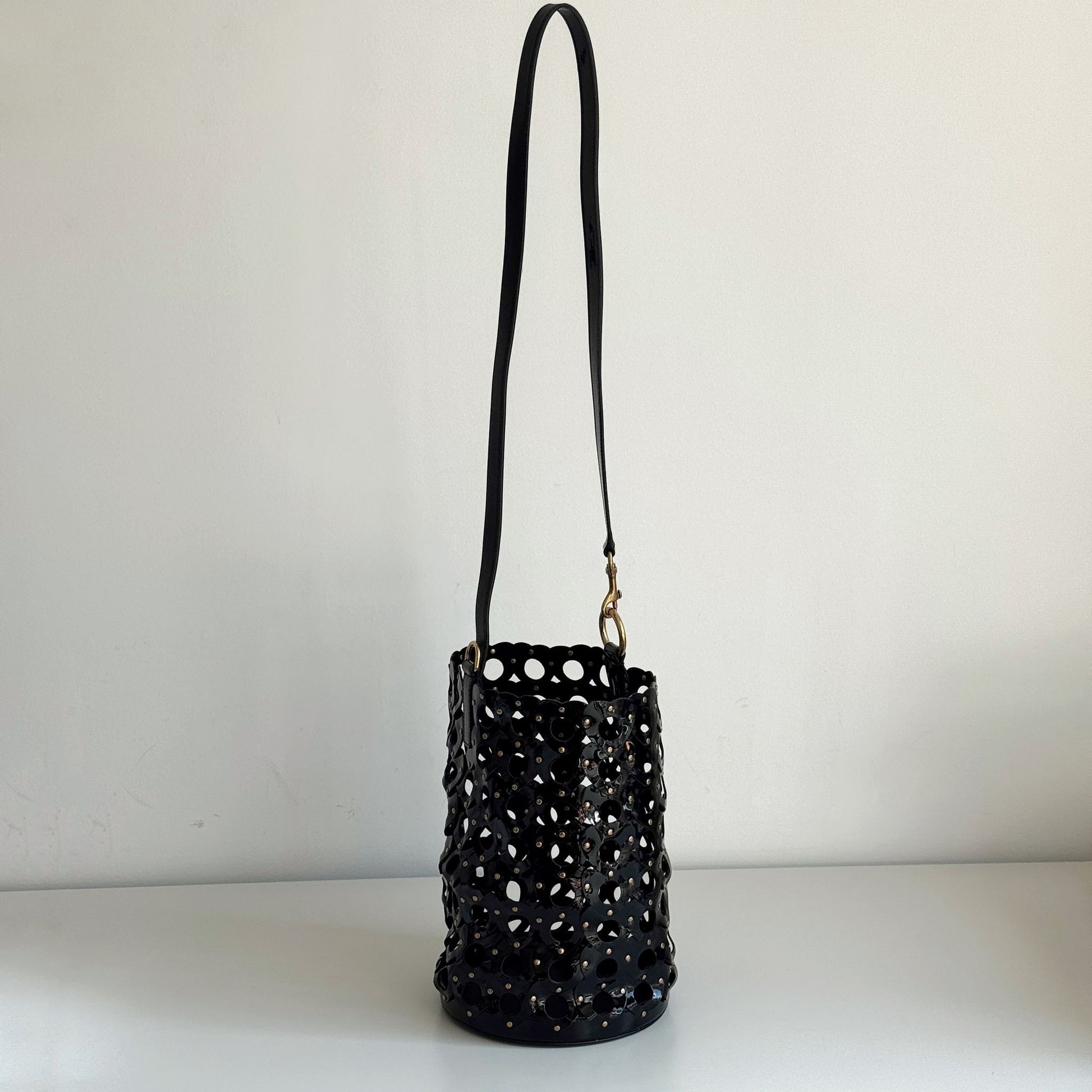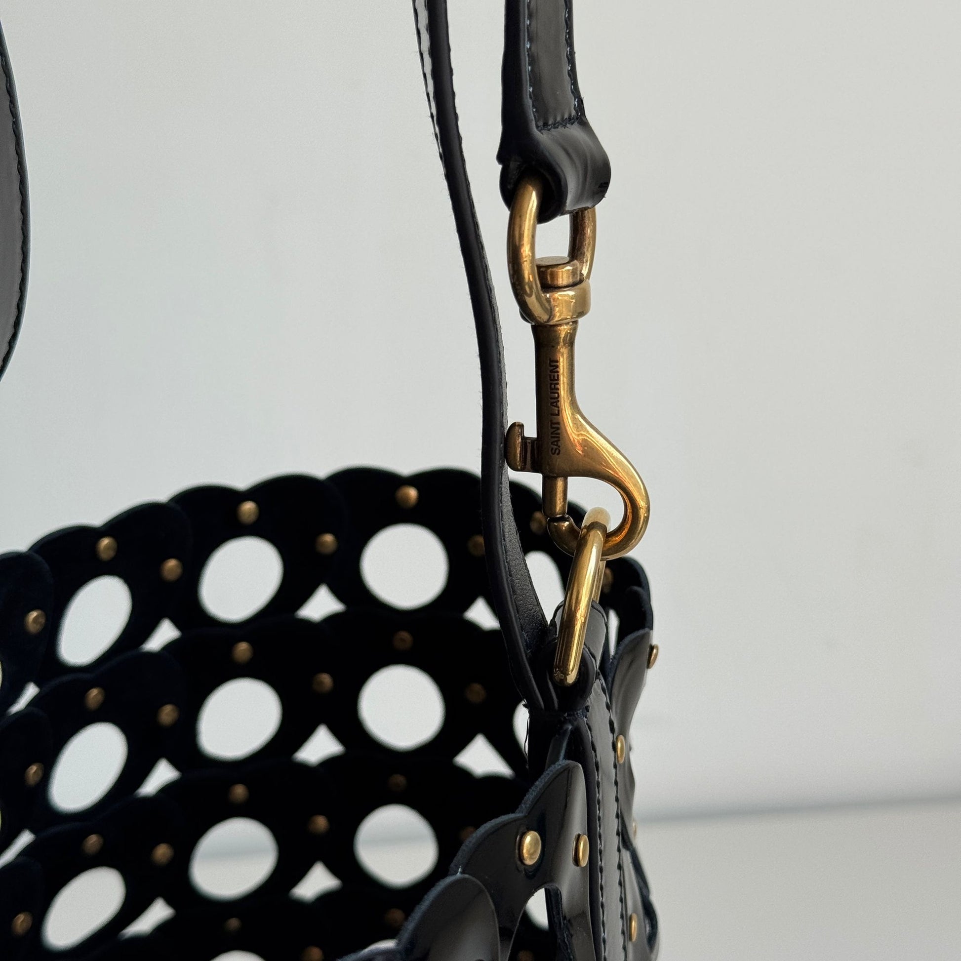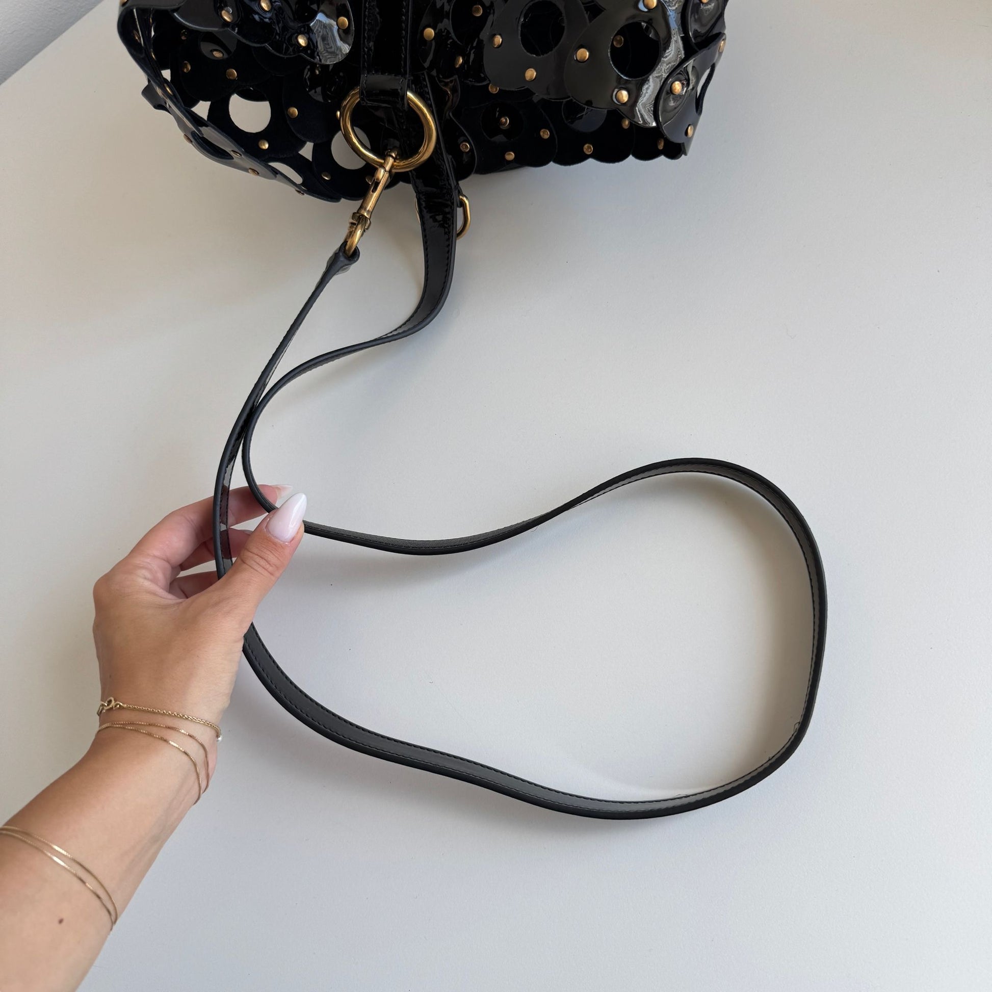 Splendida borsa Saint Laurent modello Seau Coeur in vernice nera con dettagli in metallo oro. Si indossa sia a spalla che a tracolla. La tracolla non è regolabile.