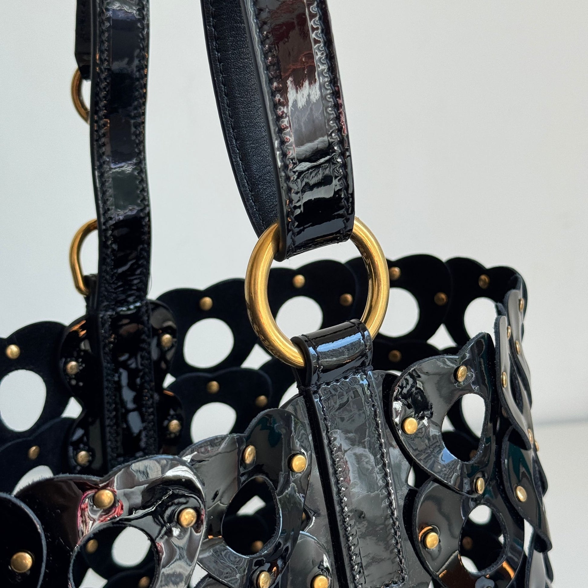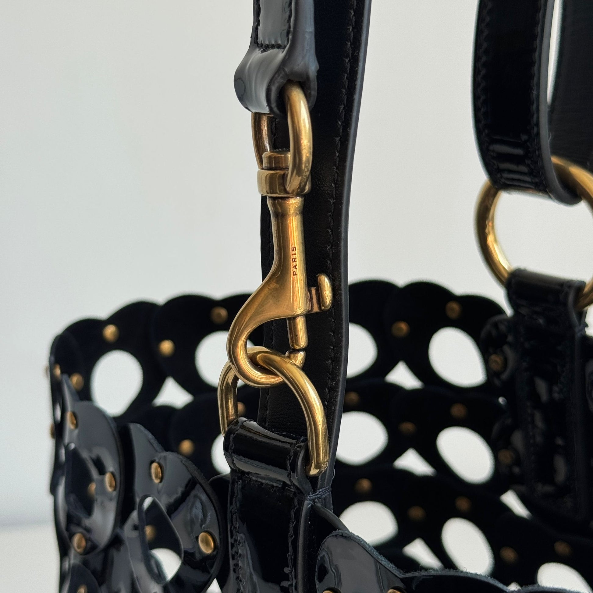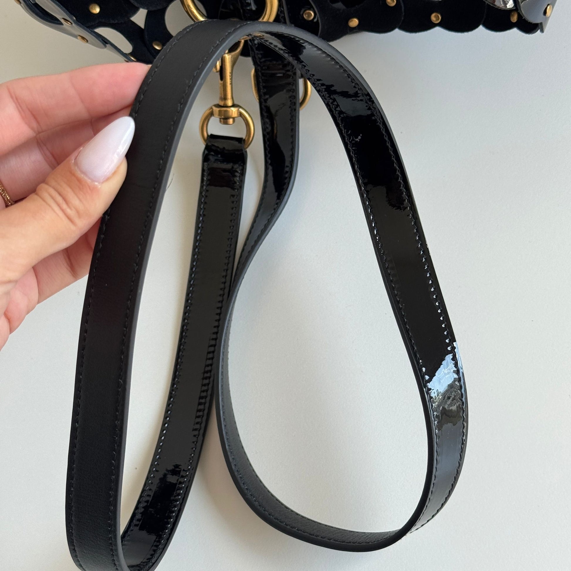 Splendida borsa Saint Laurent modello Seau Coeur in vernice nera con dettagli in metallo oro. Si indossa sia a spalla che a tracolla. La tracolla non è regolabile.